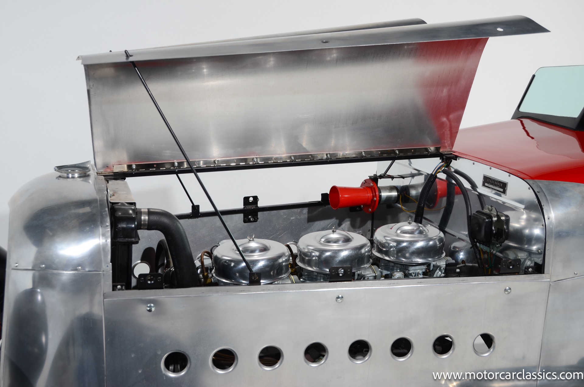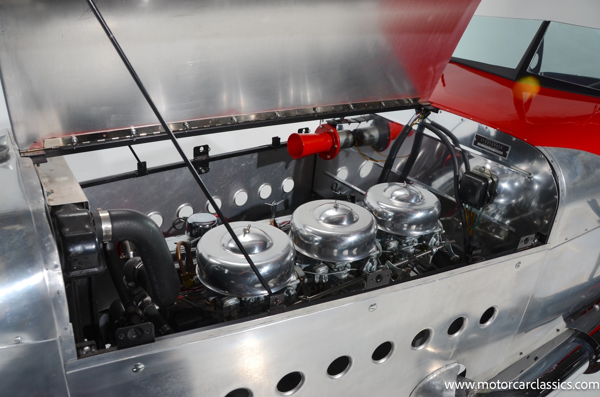 A local enthusiast who was always fascinated by these Studebaker Specials undertook the construction of our one-off tribute car that he conceived of as an attention-getting and great fun road car. He started with a 1952 Ford F1 chassis, rear end, front axle, with rebuilt steering box & power disc brakes. The engine is a Chevy 292 CI. straight 6 with HEI Distributor, Clifford Manifold, and triple Carter one barrel carbs with custom exhaust. The engine is mated to a GM Turbo 350 automatic transmission for easy driving. The body is hand-formed aluminum and steel over a wood frame, just as cars were originally built in the period.