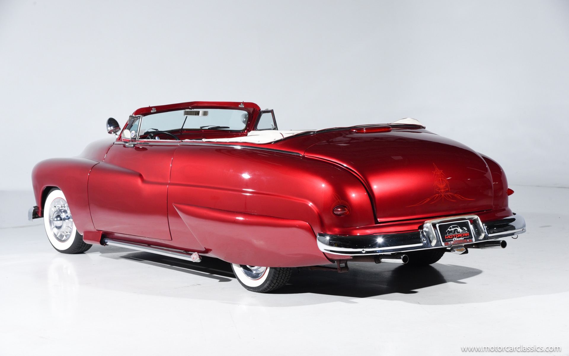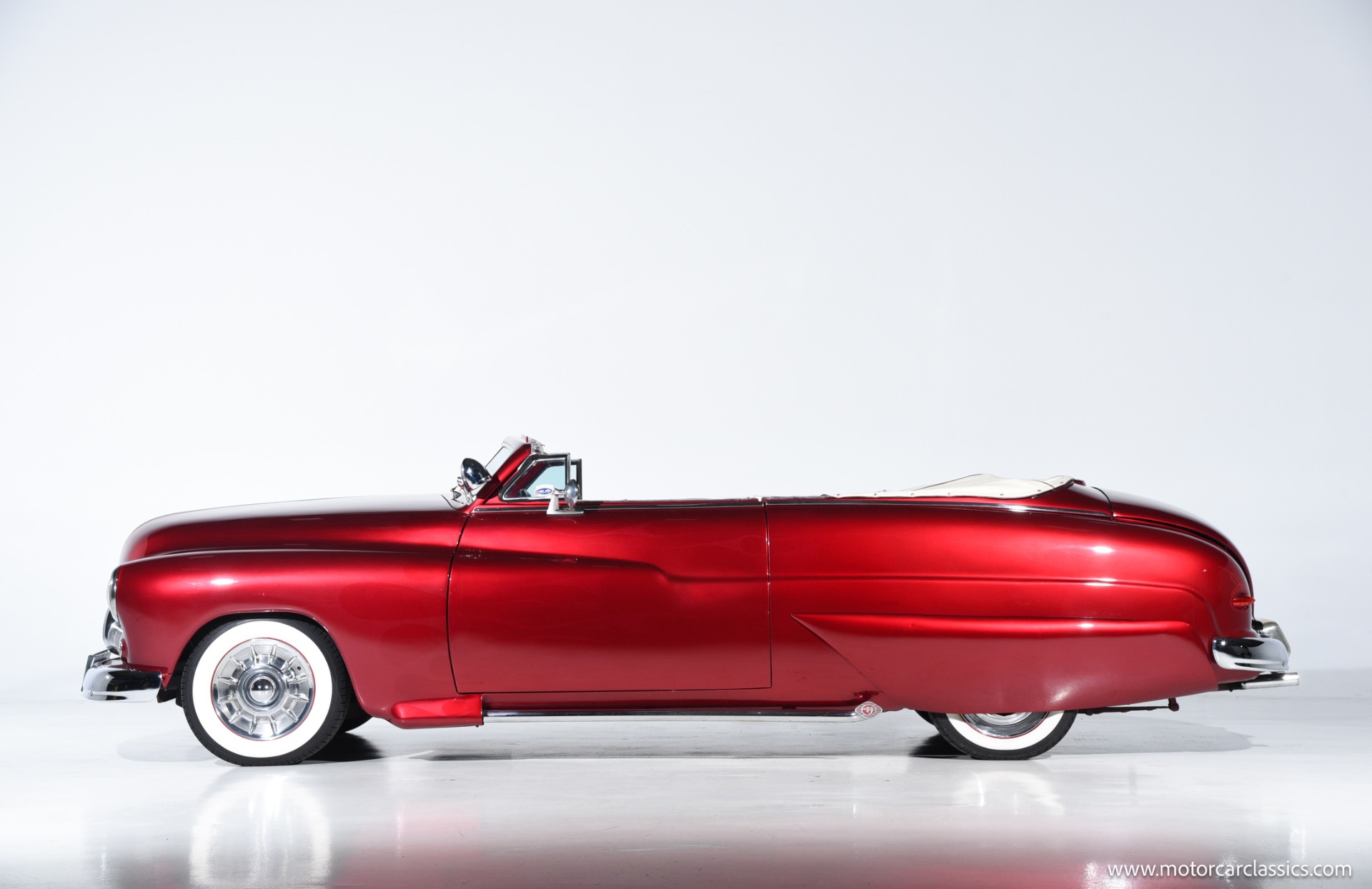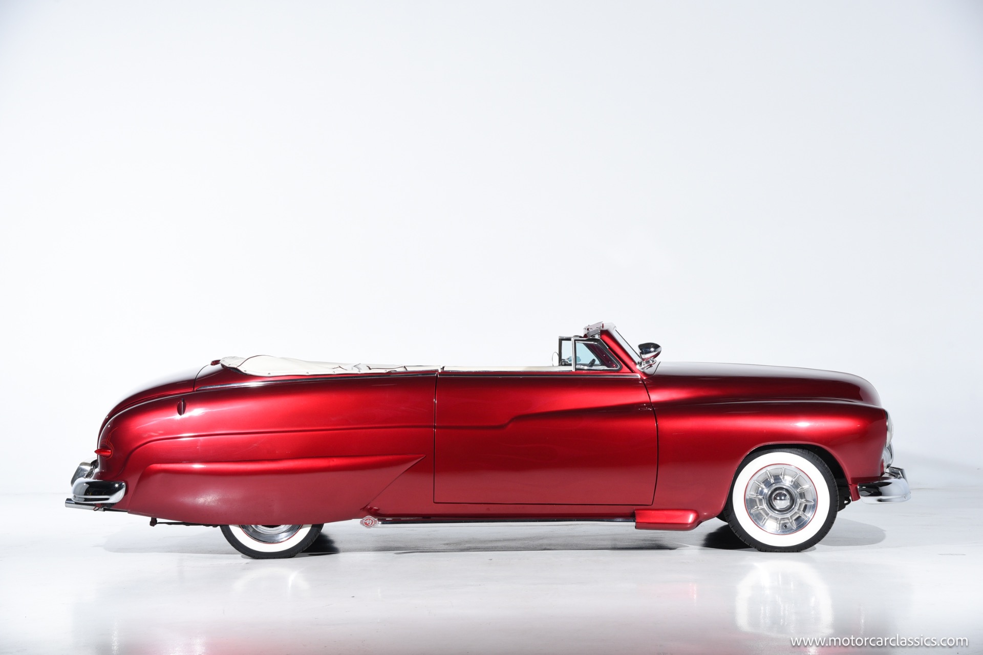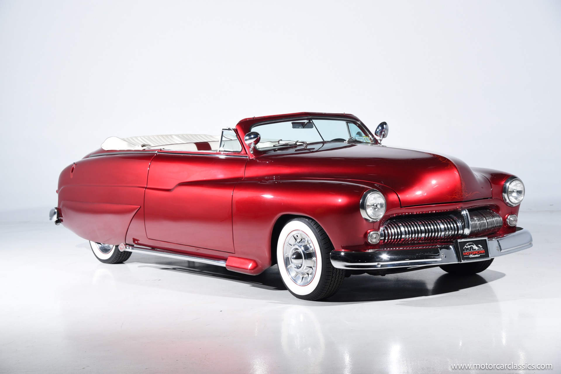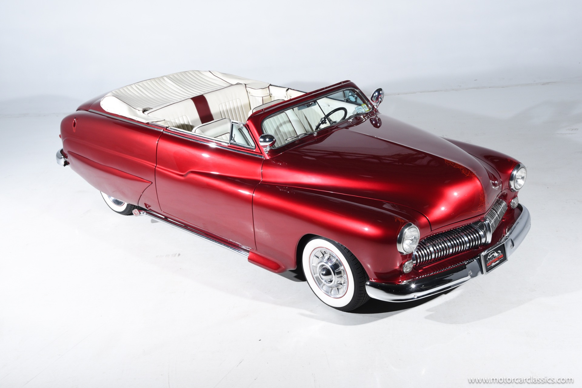 1950 chopped Mercury Convertible for sale! Motorcar Classics is pleased to offer this 1950 Mercury presented in Cadi Crimson Red with GHOST FLAMES and custom black convertible top. This Merc is equipped with a Chevy 350 engine and upgraded Edelbrock Carburetor with a Turbo 400 transmission. Additional options include air ride rear suspension, power brakes and steering, no power windows, no AC but has heat, Monti Carlo front clip, Chevy 3.55 rear, digital dash, Disk player and more. The odometer reads 20 miles, however the true mileage is unknown. This unique Mercury started out as a coupe with many modifications done by previous owners, the build started in 1980 and then was rebuilt again in 1991 with some more recent paint and work done in 2004. The car was chopped 4 inches and has been with its current owner's family for over 25 years. The car is represented as a nice driver and is ready for its next ownership.