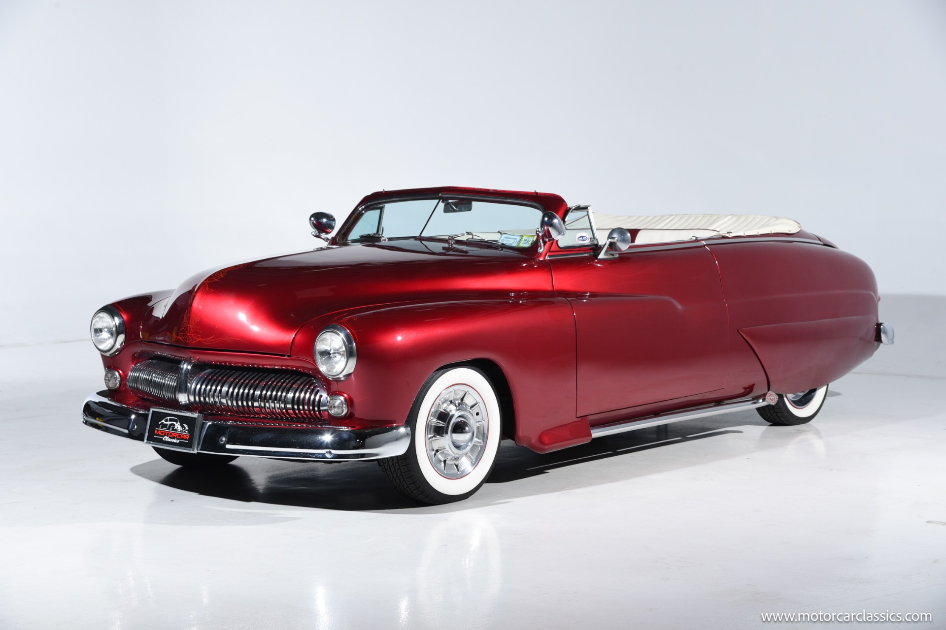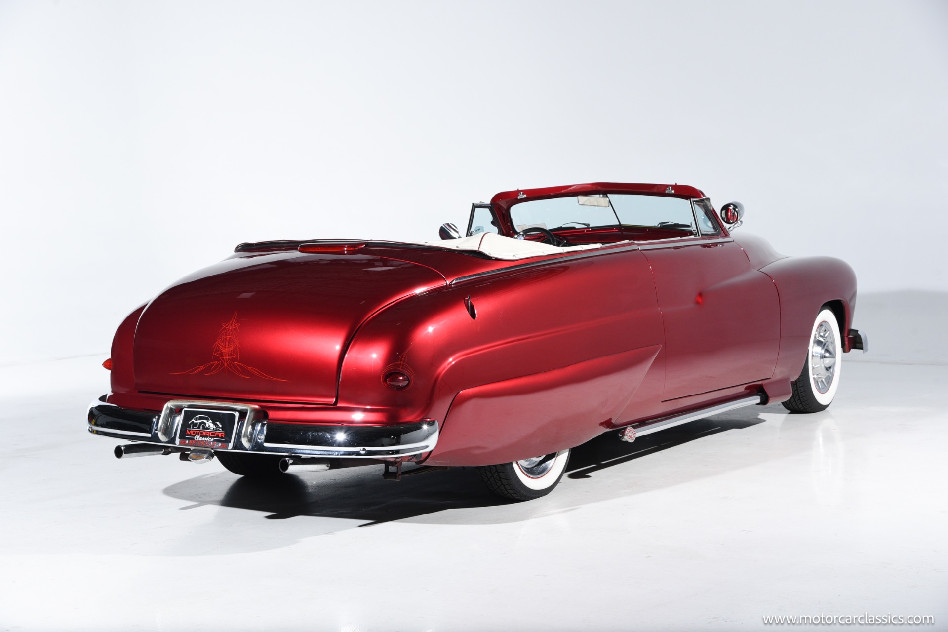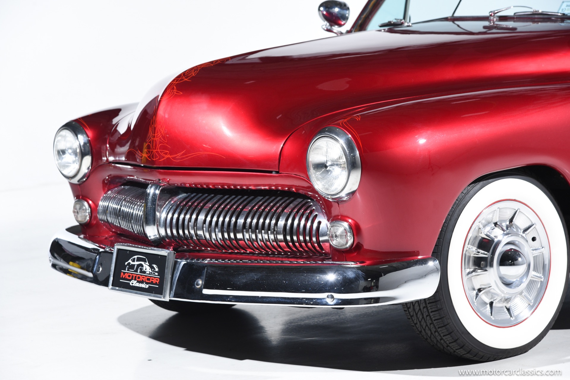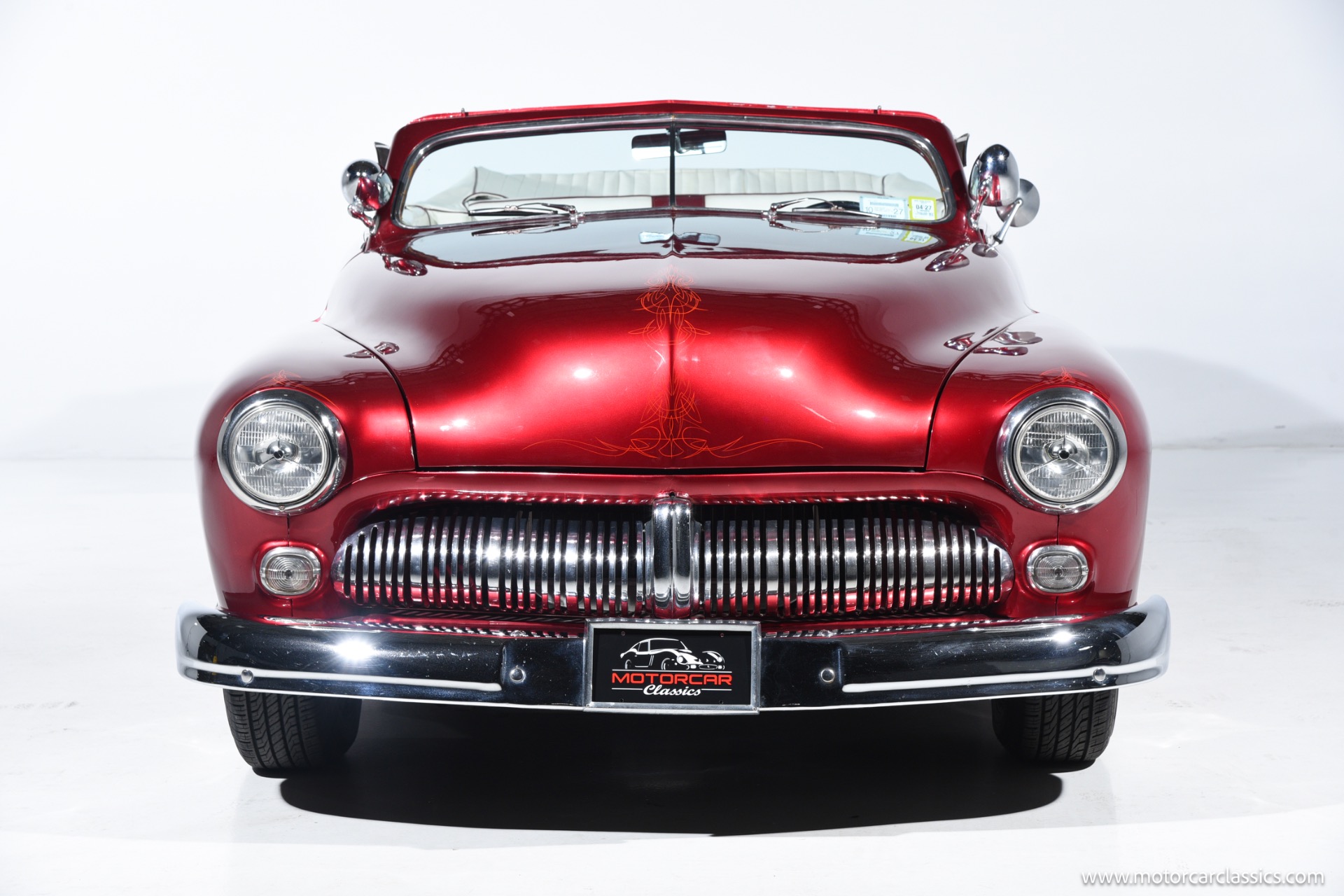 1950 chopped Mercury Convertible for sale! Motorcar Classics is pleased to offer this 1950 Mercury presented in Cadi Crimson Red with GHOST FLAMES and custom black convertible top. This Merc is equipped with a Chevy 350 engine and upgraded Edelbrock Carburetor with a Turbo 400 transmission. Additional options include air ride rear suspension, power brakes and steering, no power windows, no AC but has heat, Monti Carlo front clip, Chevy 3.55 rear, digital dash, Disk player and more. The odometer reads 20 miles, however the true mileage is unknown. This unique Mercury started out as a coupe with many modifications done by previous owners, the build started in 1980 and then was rebuilt again in 1991 with some more recent paint and work done in 2004. The car was chopped 4 inches and has been with its current owner's family for over 25 years. The car is represented as a nice driver and is ready for its next ownership.
