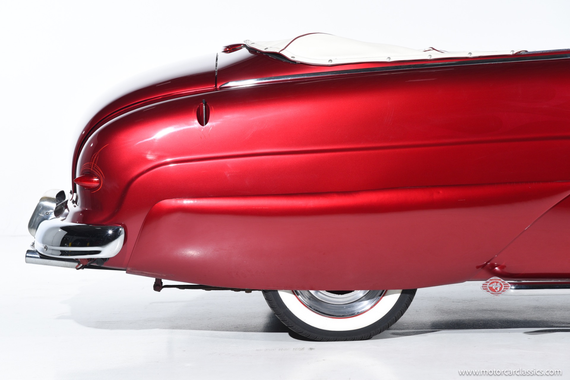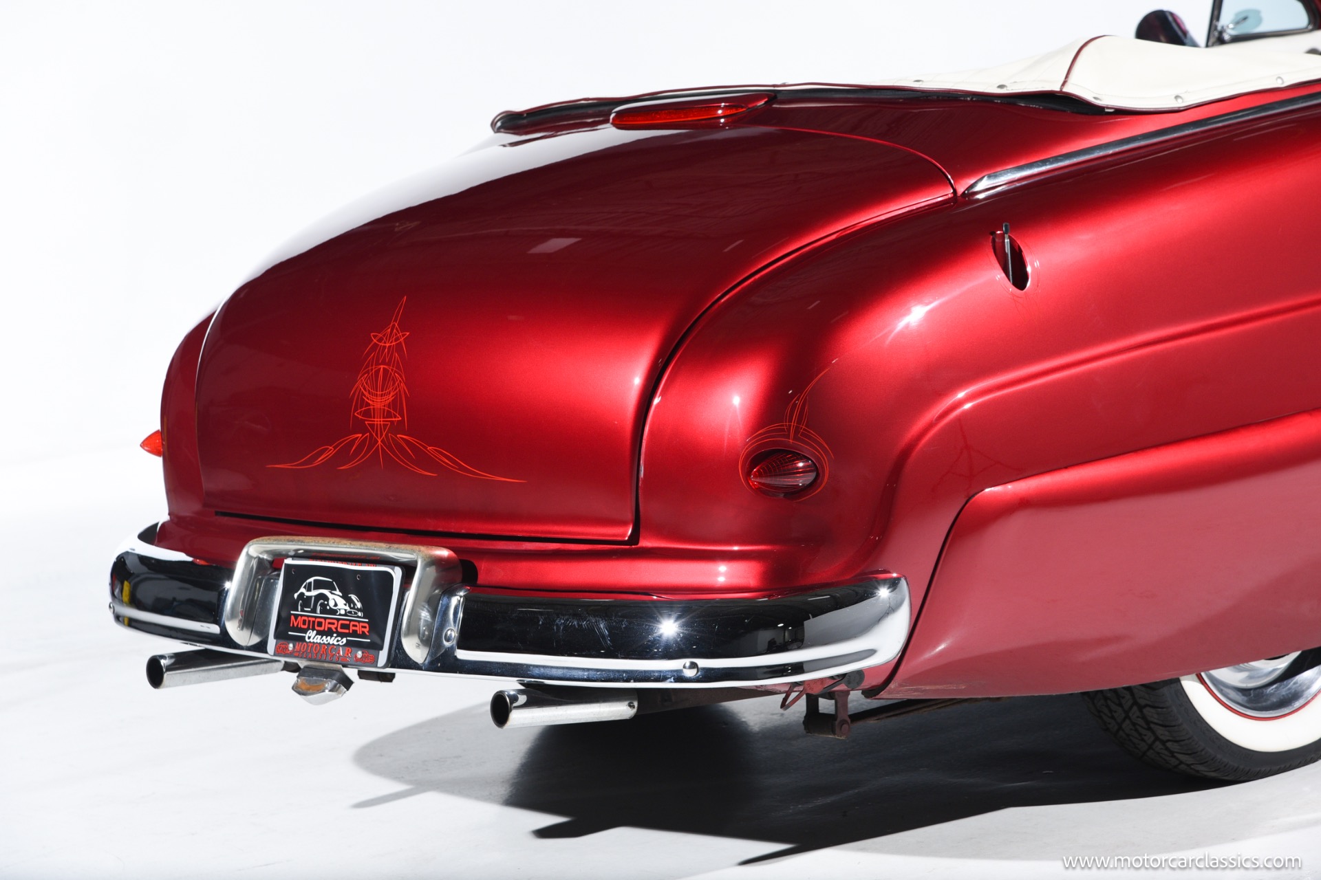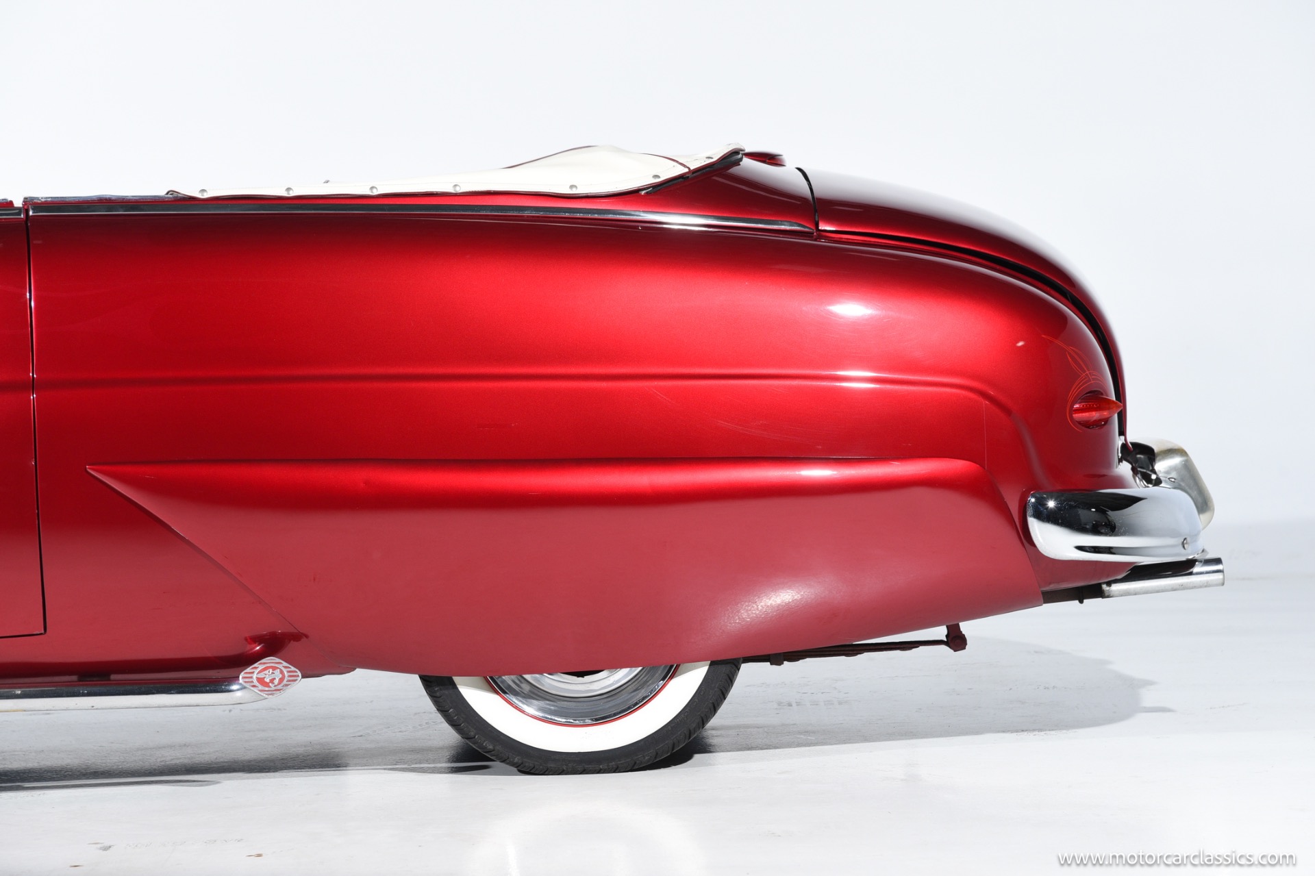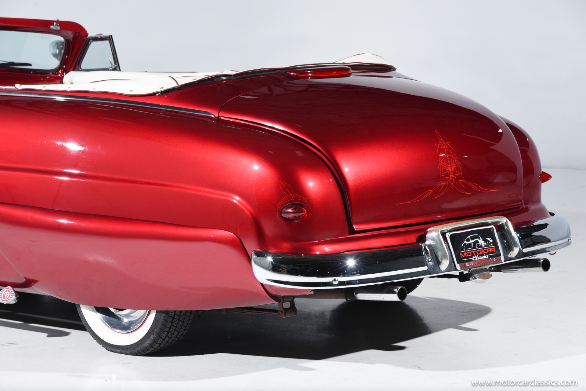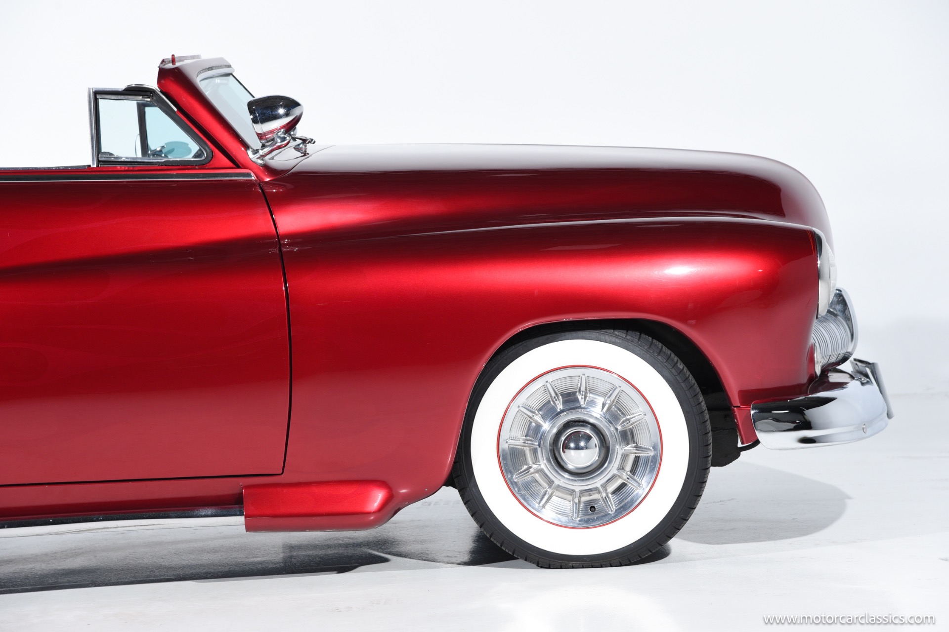 1950 chopped Mercury Convertible for sale! Motorcar Classics is pleased to offer this 1950 Mercury presented in Cadi Crimson Red with GHOST FLAMES and custom black convertible top. This Merc is equipped with a Chevy 350 engine and upgraded Edelbrock Carburetor with a Turbo 400 transmission. Additional options include air ride rear suspension, power brakes and steering, no power windows, no AC but has heat, Monti Carlo front clip, Chevy 3.55 rear, digital dash, Disk player and more. The odometer reads 20 miles, however the true mileage is unknown. This unique Mercury started out as a coupe with many modifications done by previous owners, the build started in 1980 and then was rebuilt again in 1991 with some more recent paint and work done in 2004. The car was chopped 4 inches and has been with its current owner's family for over 25 years. The car is represented as a nice driver and is ready for its next ownership.