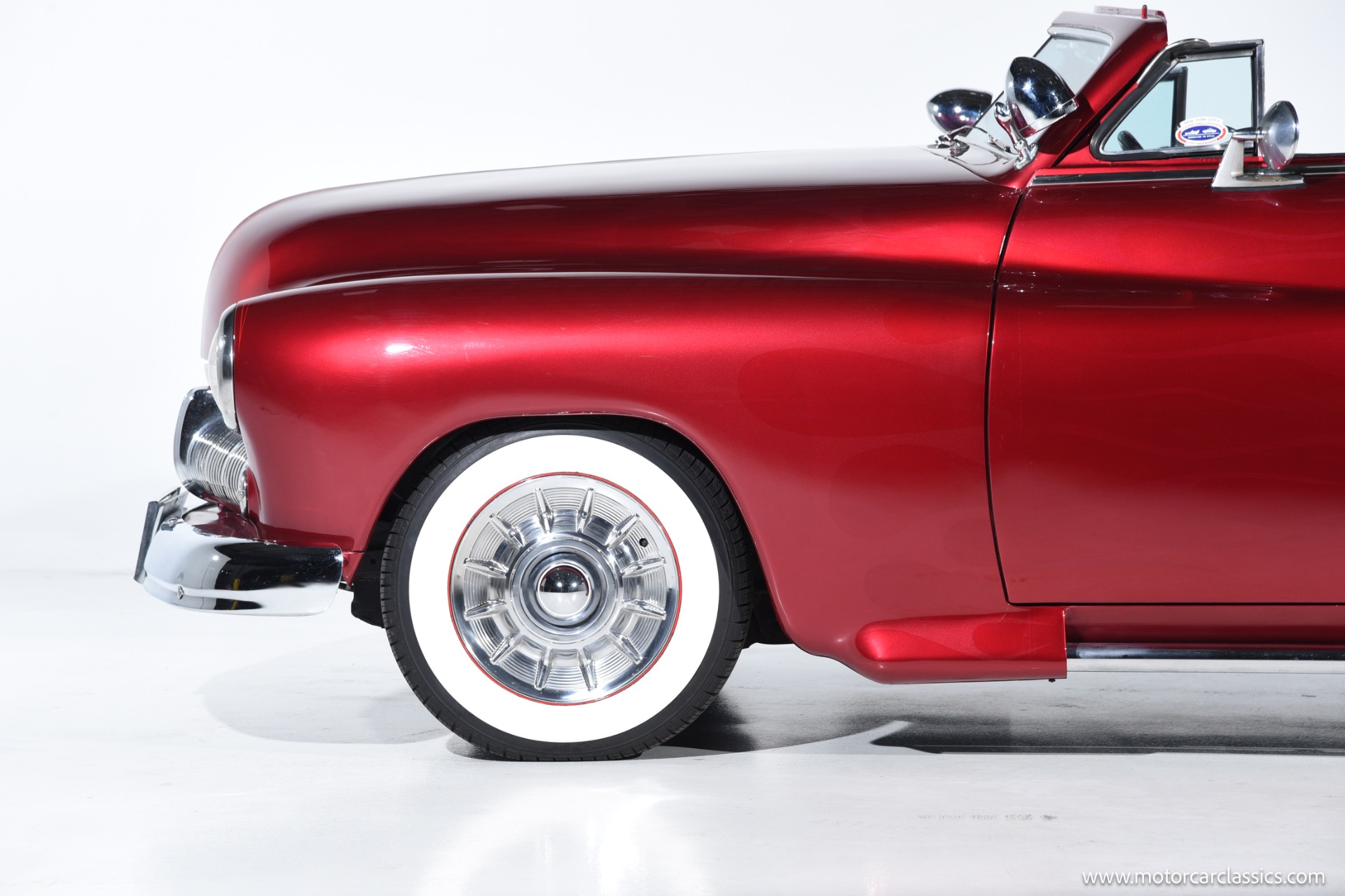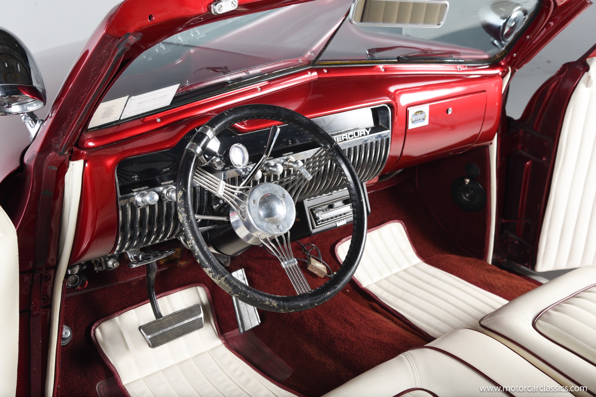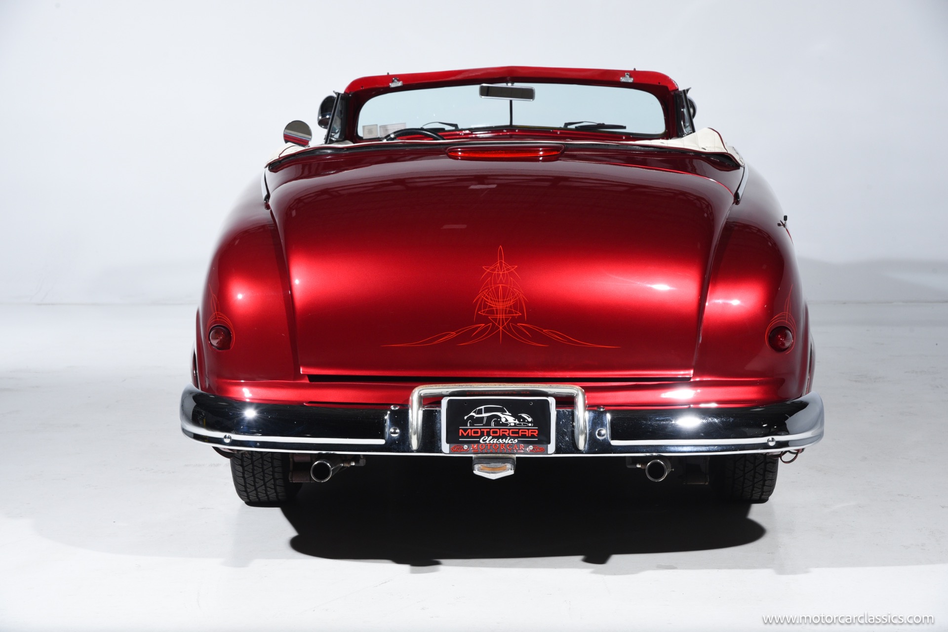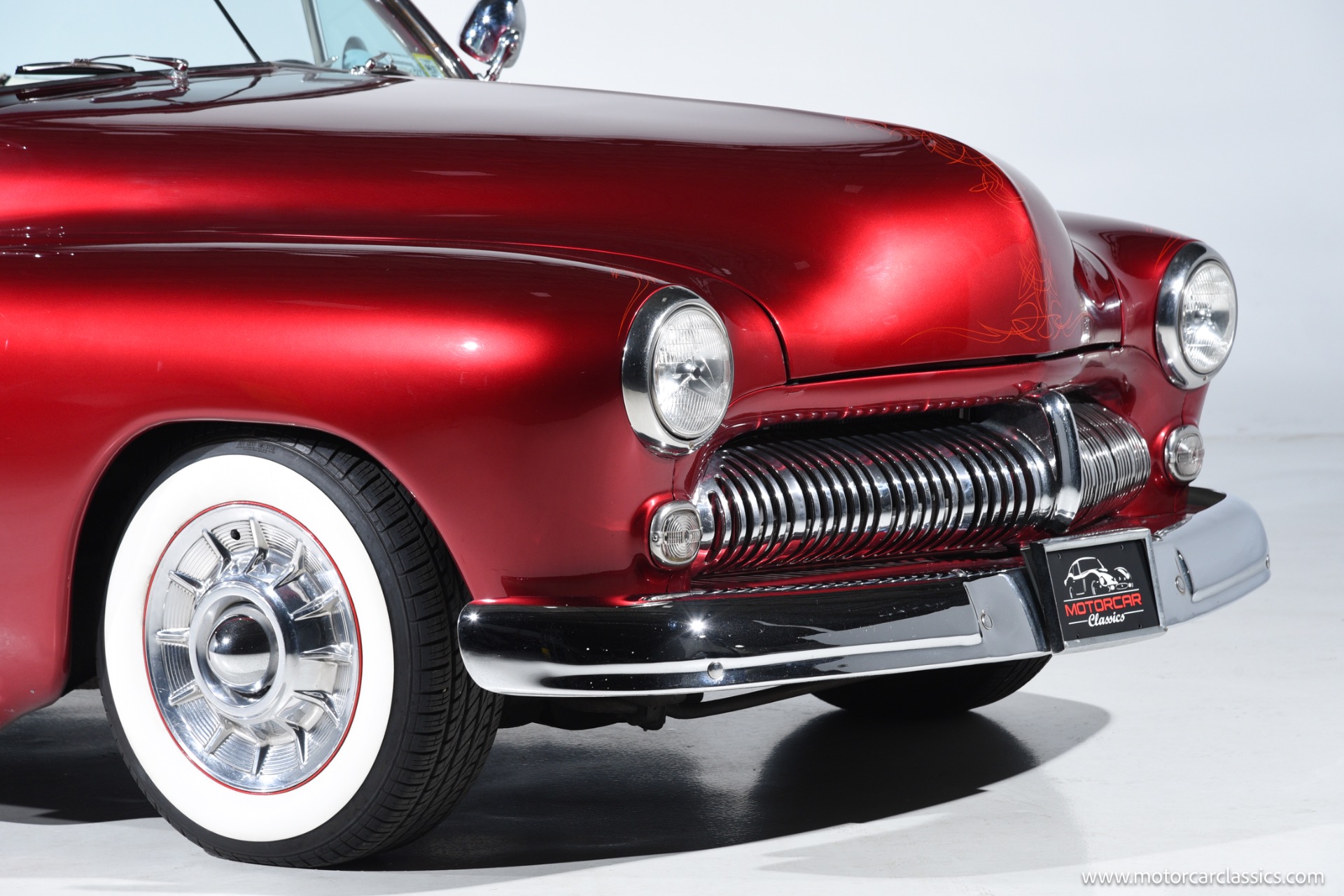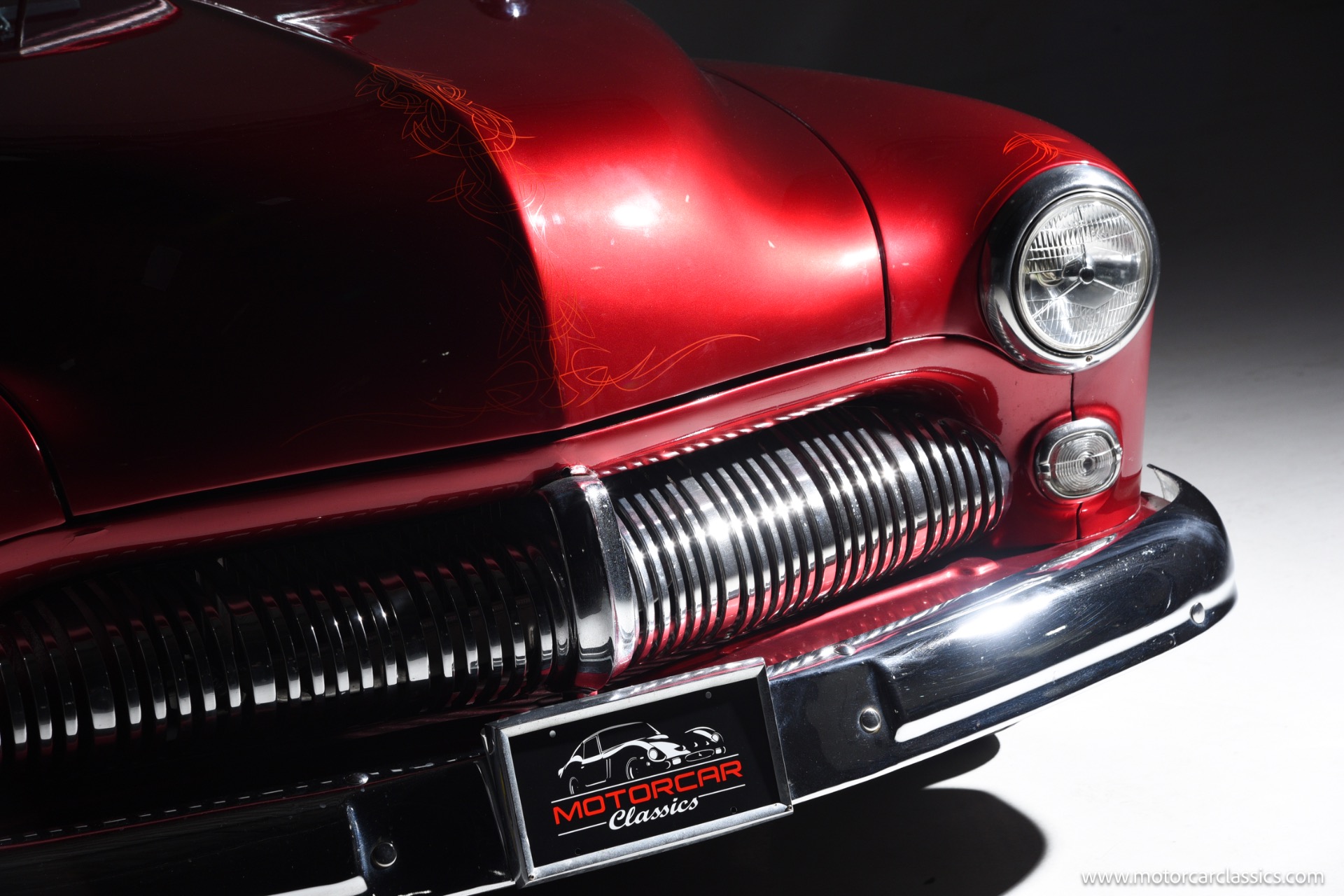 1950 chopped Mercury Convertible for sale! Motorcar Classics is pleased to offer this 1950 Mercury presented in Cadi Crimson Red with GHOST FLAMES and custom black convertible top. This Merc is equipped with a Chevy 350 engine and upgraded Edelbrock Carburetor with a Turbo 400 transmission. Additional options include air ride rear suspension, power brakes and steering, no power windows, no AC but has heat, Monti Carlo front clip, Chevy 3.55 rear, digital dash, Disk player and more. The odometer reads 20 miles, however the true mileage is unknown. This unique Mercury started out as a coupe with many modifications done by previous owners, the build started in 1980 and then was rebuilt again in 1991 with some more recent paint and work done in 2004. The car was chopped 4 inches and has been with its current owner's family for over 25 years. The car is represented as a nice driver and is ready for its next ownership.