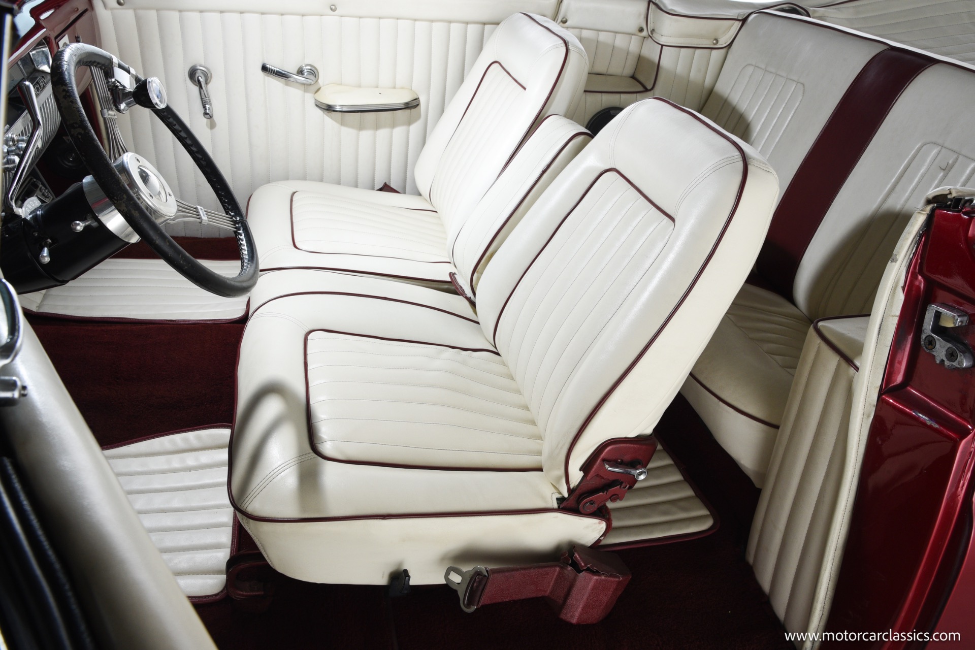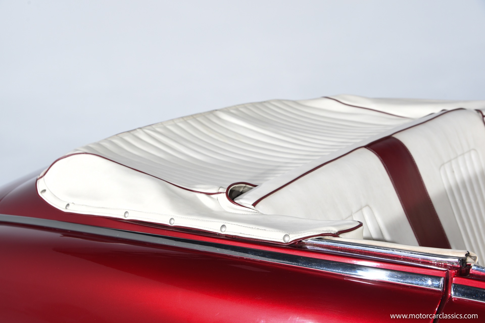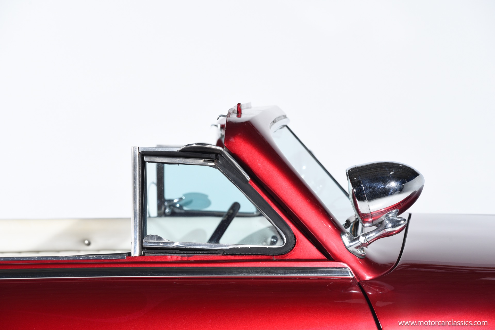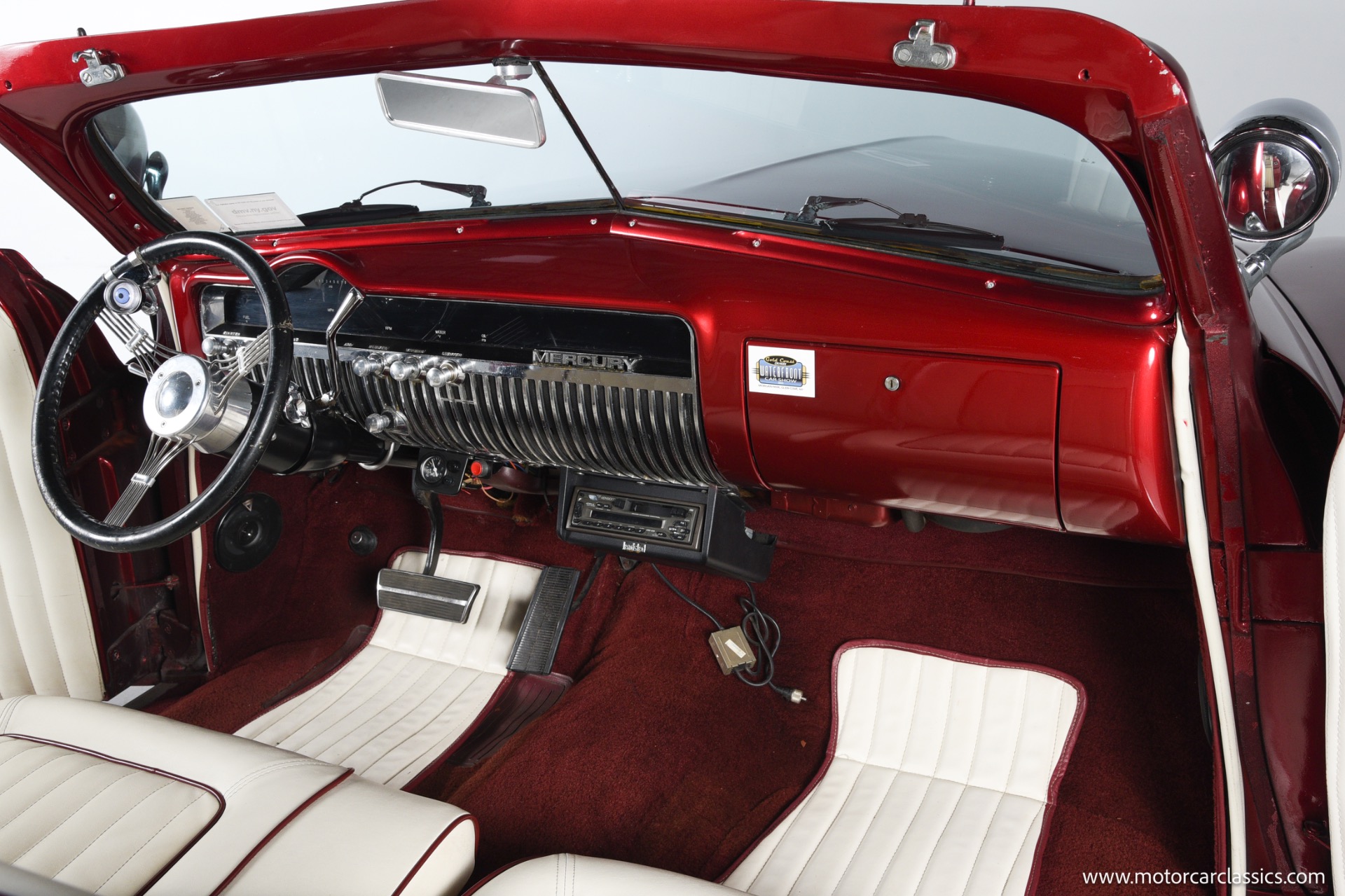 1950 chopped Mercury Convertible for sale! Motorcar Classics is pleased to offer this 1950 Mercury presented in Cadi Crimson Red with GHOST FLAMES and custom black convertible top. This Merc is equipped with a Chevy 350 engine and upgraded Edelbrock Carburetor with a Turbo 400 transmission. Additional options include air ride rear suspension, power brakes and steering, no power windows, no AC but has heat, Monti Carlo front clip, Chevy 3.55 rear, digital dash, Disk player and more. The odometer reads 20 miles, however the true mileage is unknown. This unique Mercury started out as a coupe with many modifications done by previous owners, the build started in 1980 and then was rebuilt again in 1991 with some more recent paint and work done in 2004. The car was chopped 4 inches and has been with its current owner's family for over 25 years. The car is represented as a nice driver and is ready for its next ownership.
