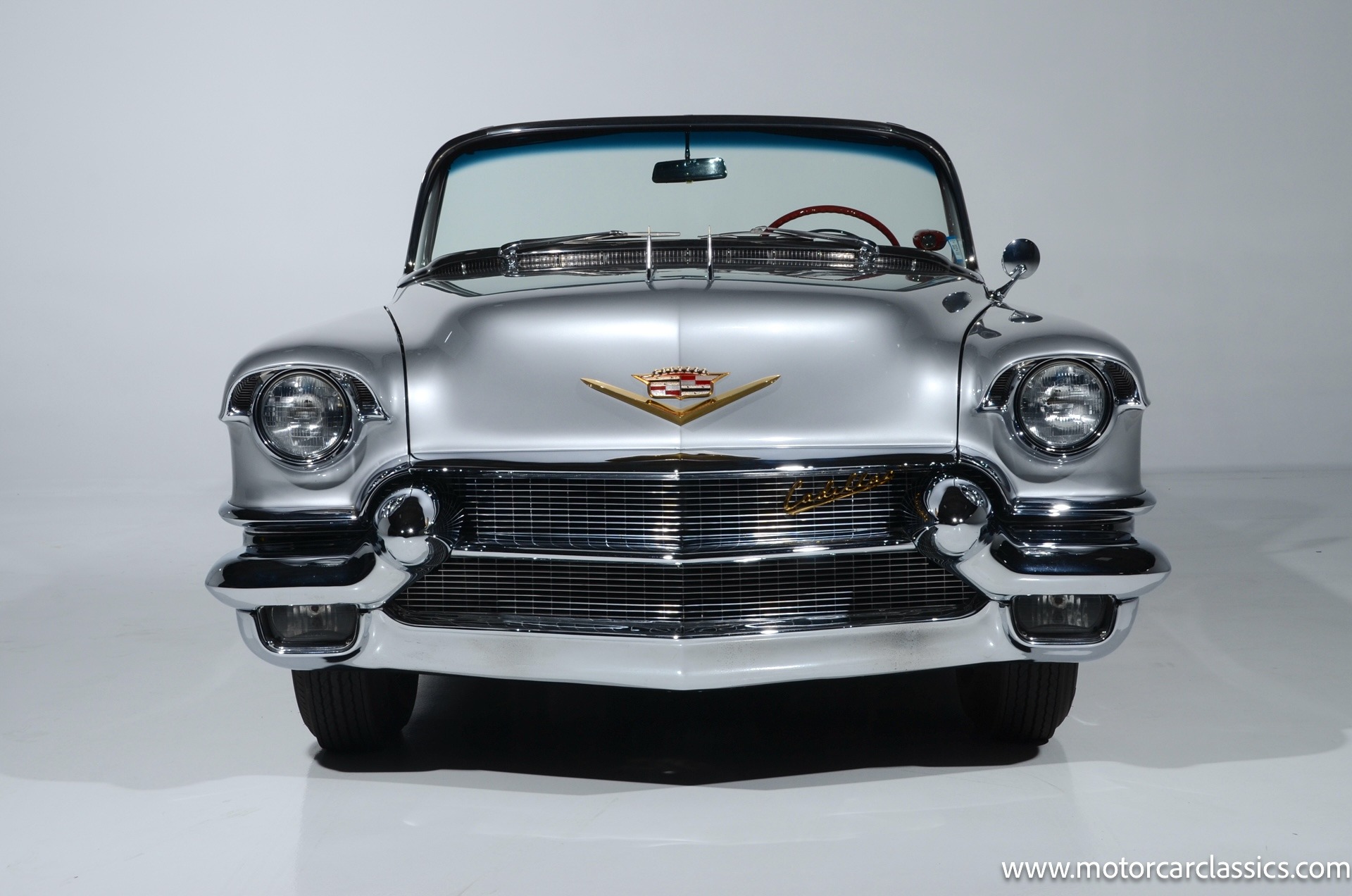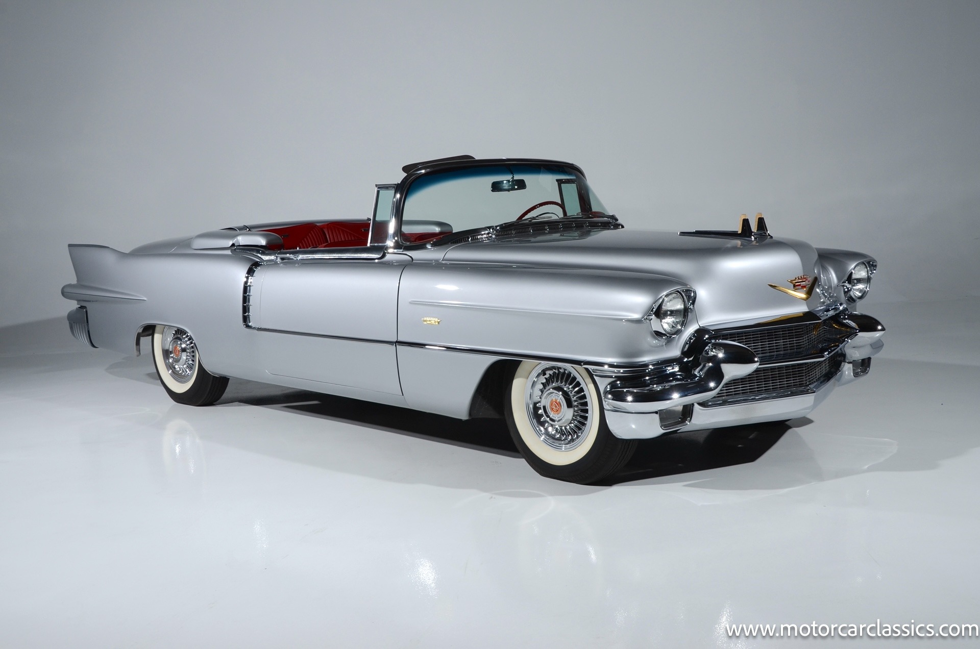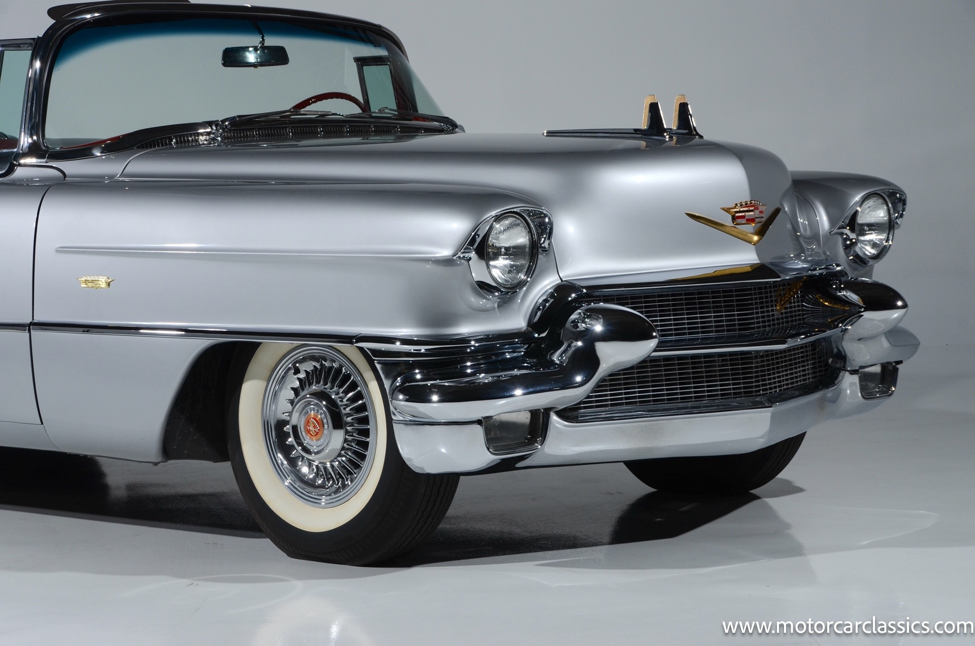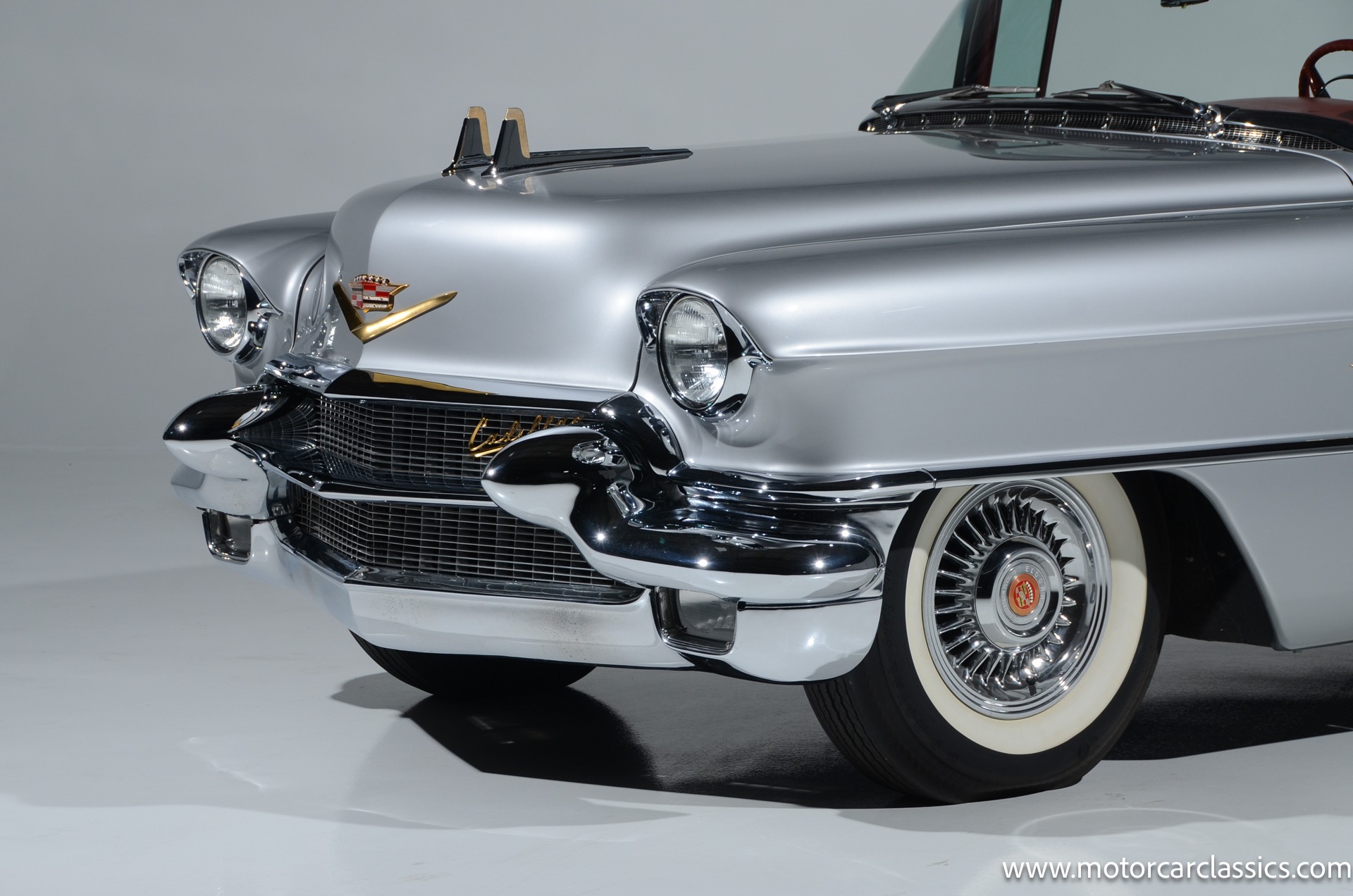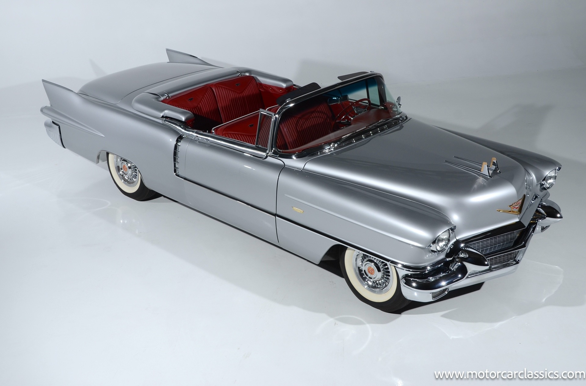 1956 Cadillac Eldorado for sale! Motorcar Classics is proud to present this beautiful 1956 Cadillac Eldorado Convertible, a distinguished example of mid-century American automotive luxury. This vehicle, part of the second generation of Eldorados introduced in 1954, represents Cadillac's commitment to combining performance, style, and innovation. It is presented in meticulously restored condition in metallic silver with red leather interior and black convertible top and original fiberglass Eldorado hard parade boot. The car features a robust 365 CID V8, with dual 4-bbl carburettors and correct Gold Batwing air cleaner producing over 305 HP, paired with a smooth Hydra-Matic automatic transmission, delivering the powerful yet smooth performance characteristic of Cadillac's luxury vehicles of this era. Luxury features include original power steering, power brakes, power windows, power top, power electric antenna, and Wonderbar Radio.