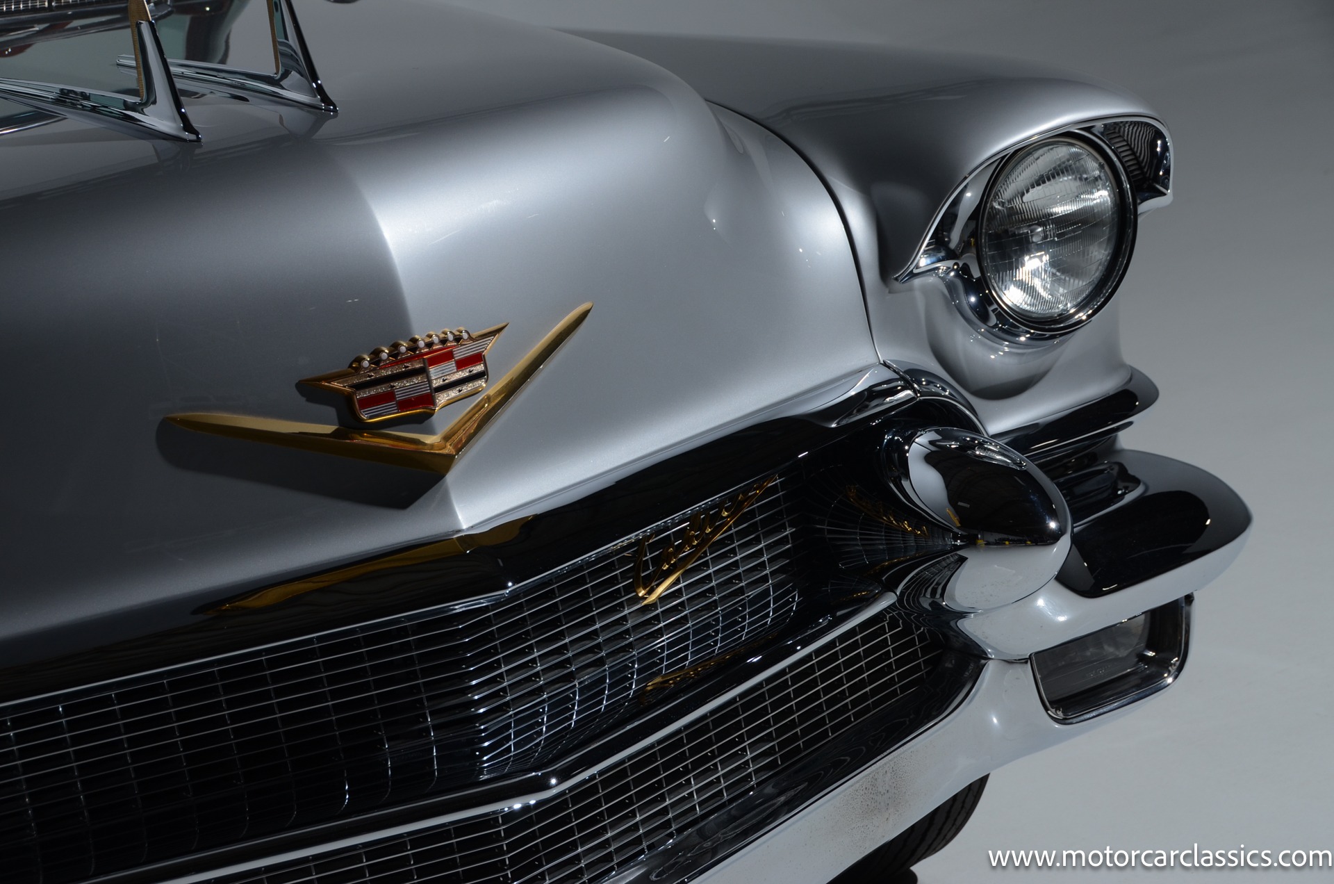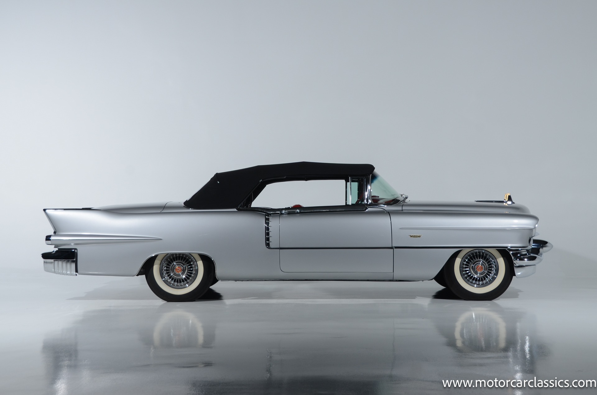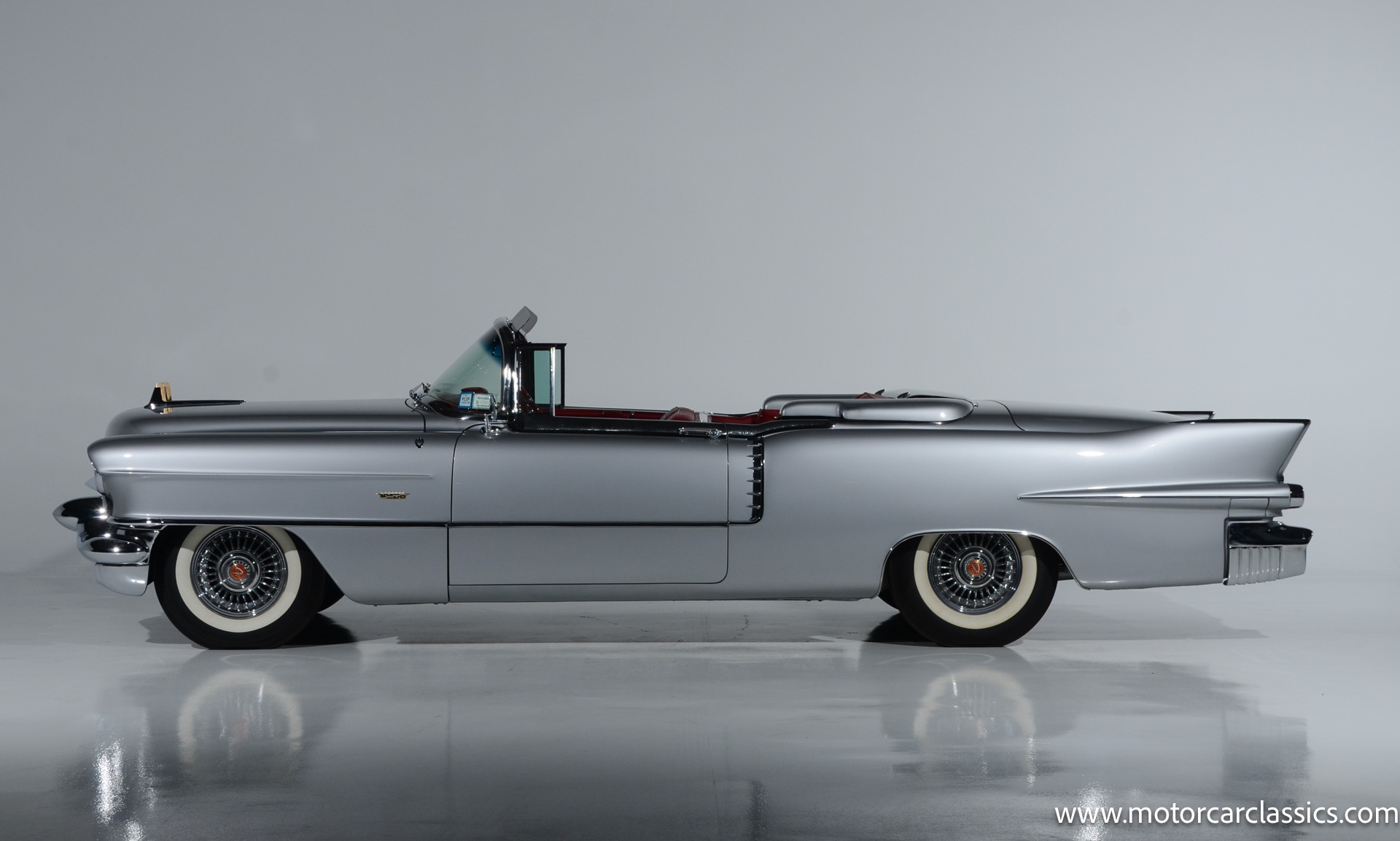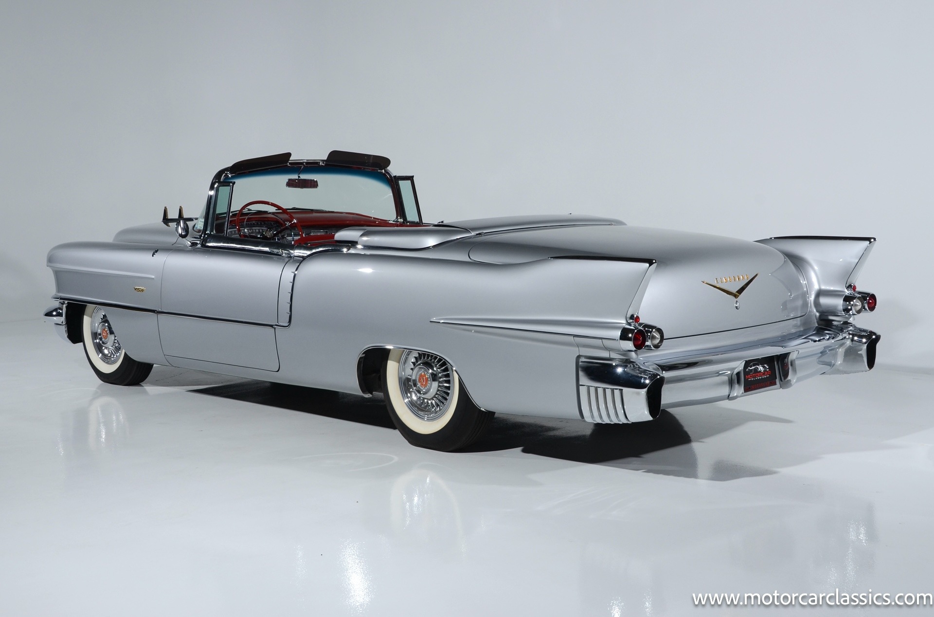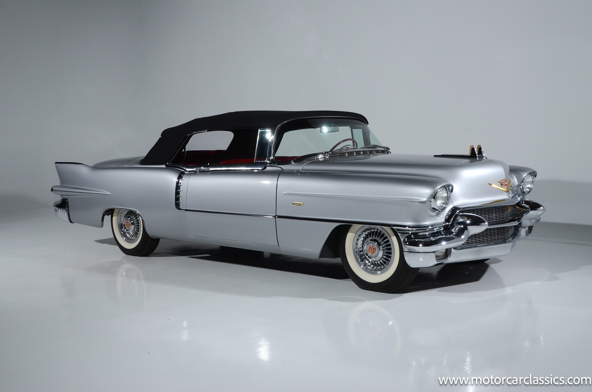 1956 Cadillac Eldorado for sale! Motorcar Classics is proud to present this beautiful 1956 Cadillac Eldorado Convertible, a distinguished example of mid-century American automotive luxury. This vehicle, part of the second generation of Eldorados introduced in 1954, represents Cadillac's commitment to combining performance, style, and innovation. It is presented in meticulously restored condition in metallic silver with red leather interior and black convertible top and original fiberglass Eldorado hard parade boot. The car features a robust 365 CID V8, with dual 4-bbl carburettors and correct Gold Batwing air cleaner producing over 305 HP, paired with a smooth Hydra-Matic automatic transmission, delivering the powerful yet smooth performance characteristic of Cadillac's luxury vehicles of this era. Luxury features include original power steering, power brakes, power windows, power top, power electric antenna, and Wonderbar Radio.