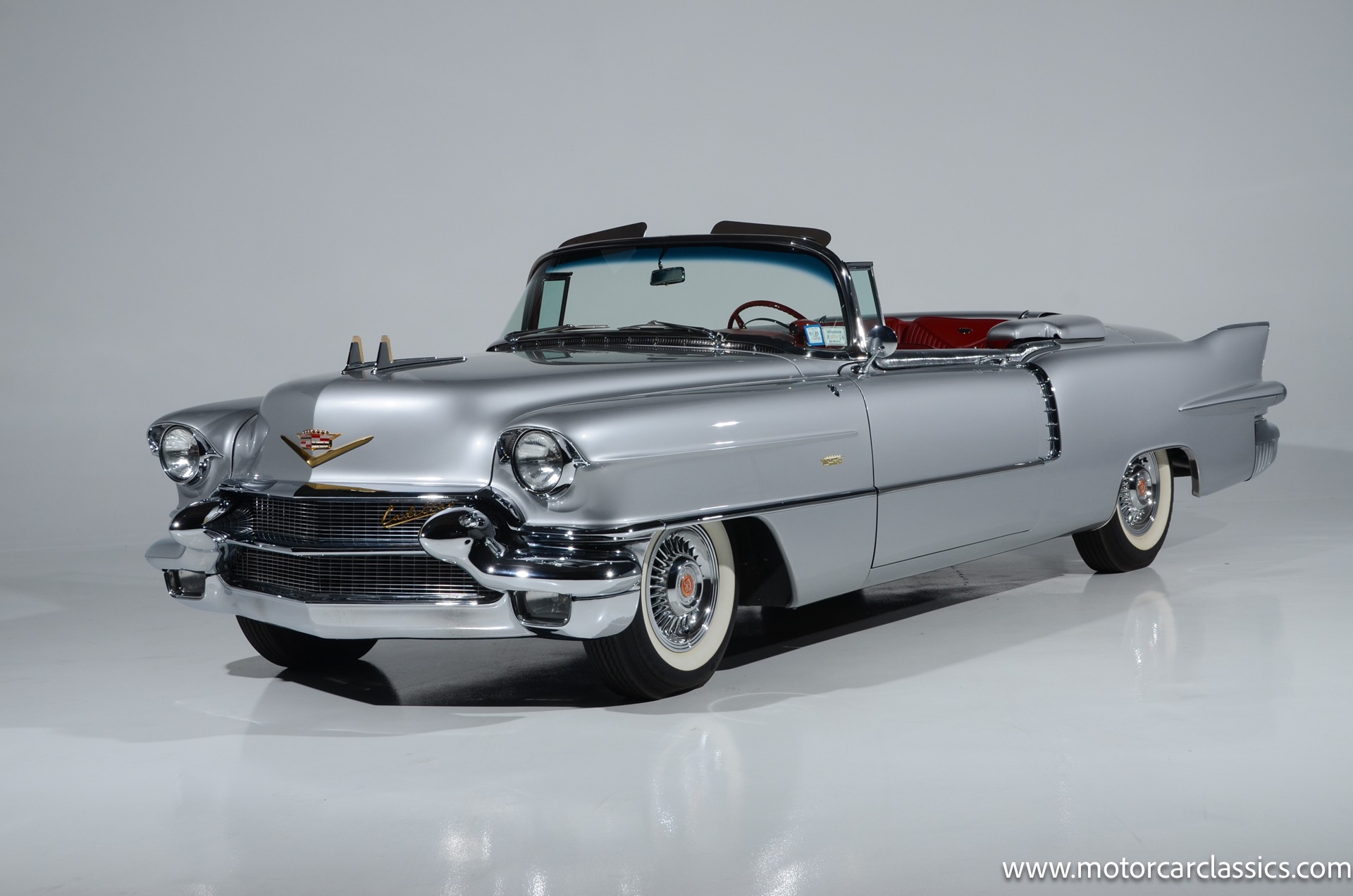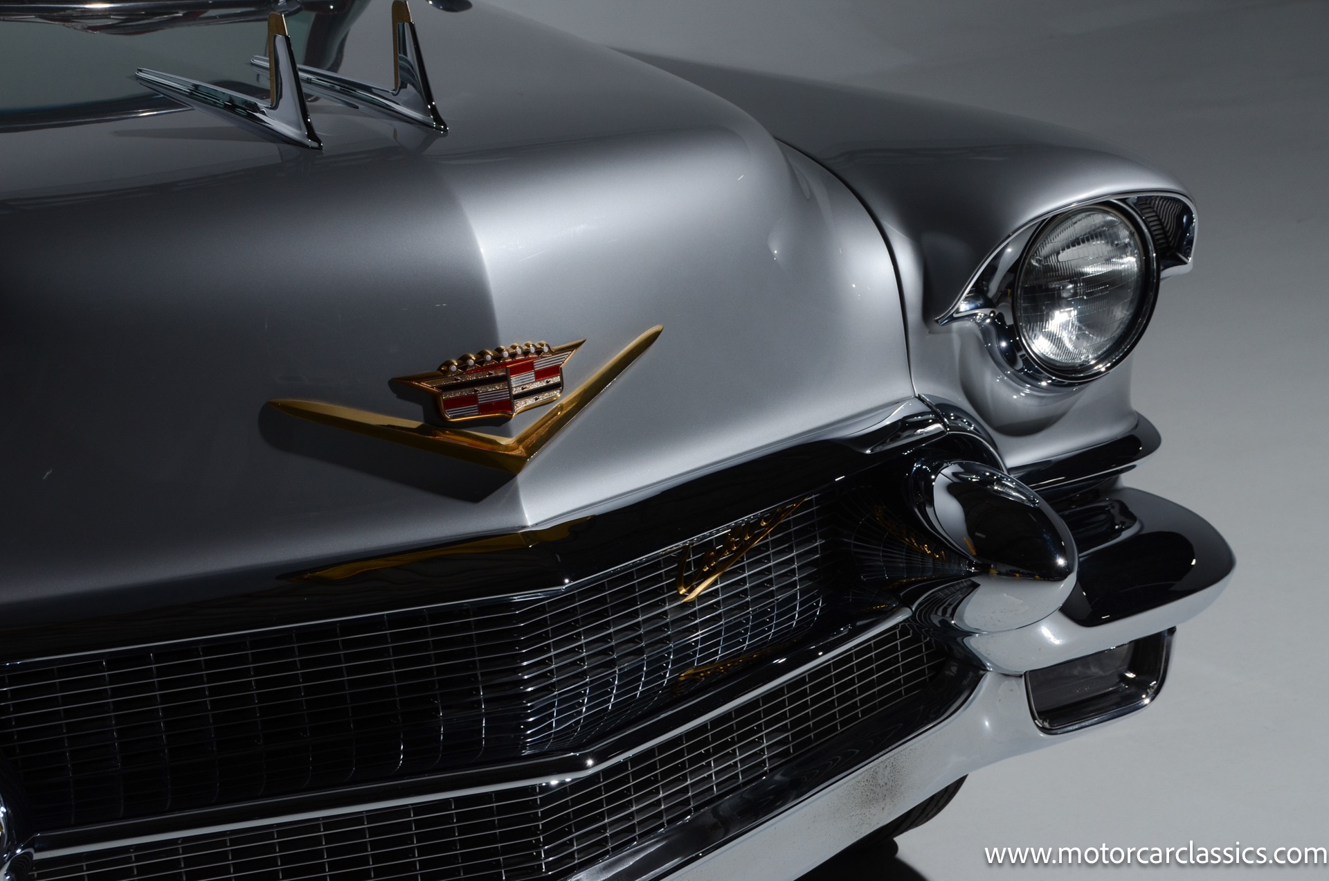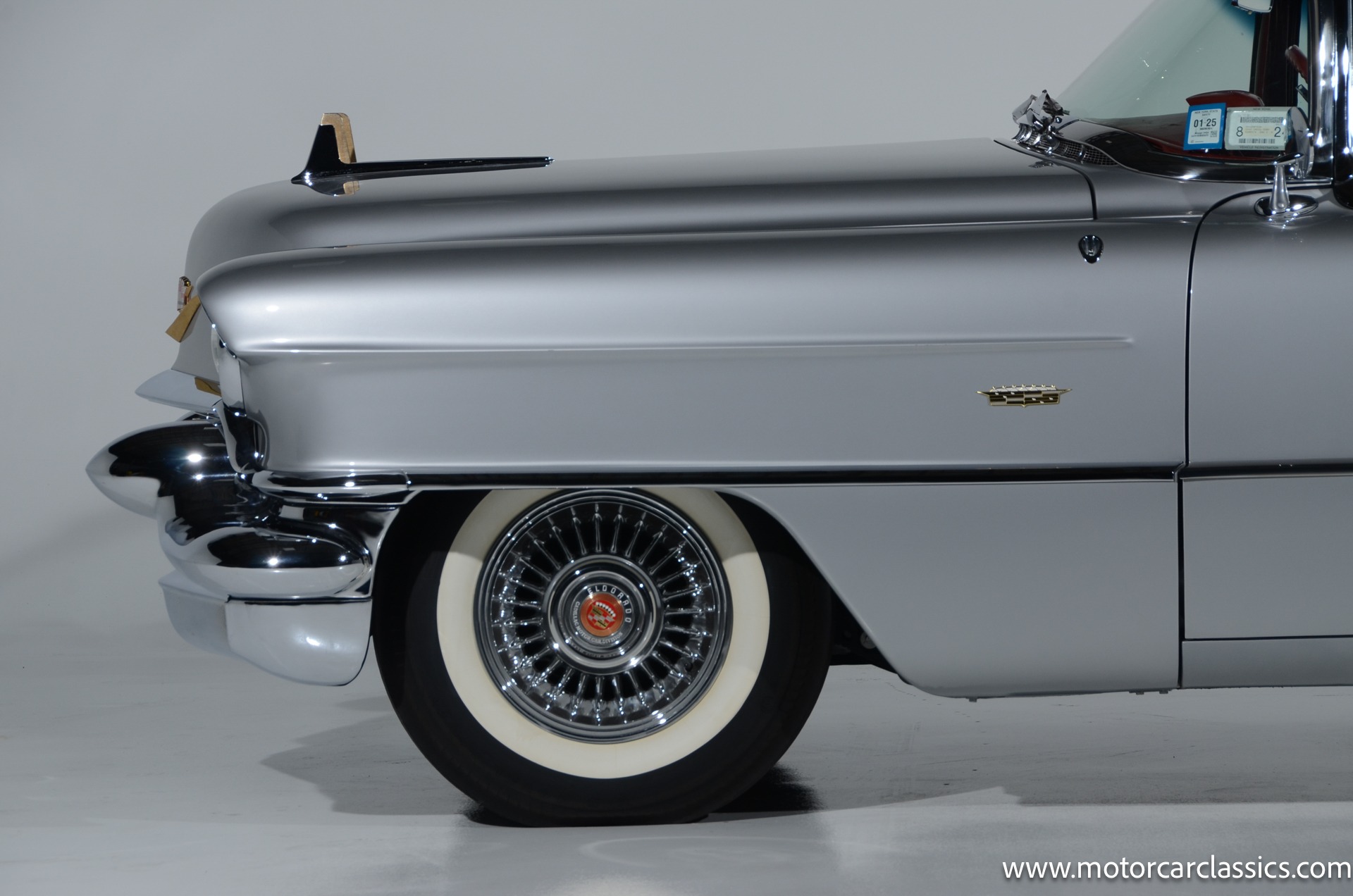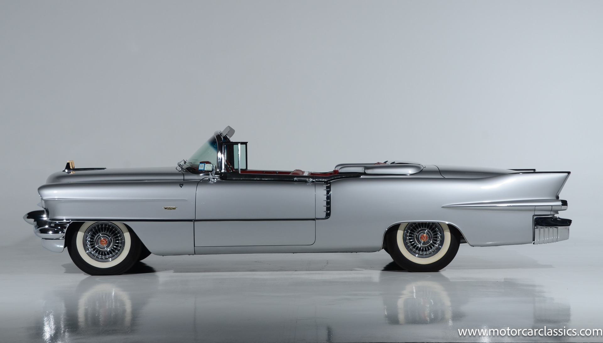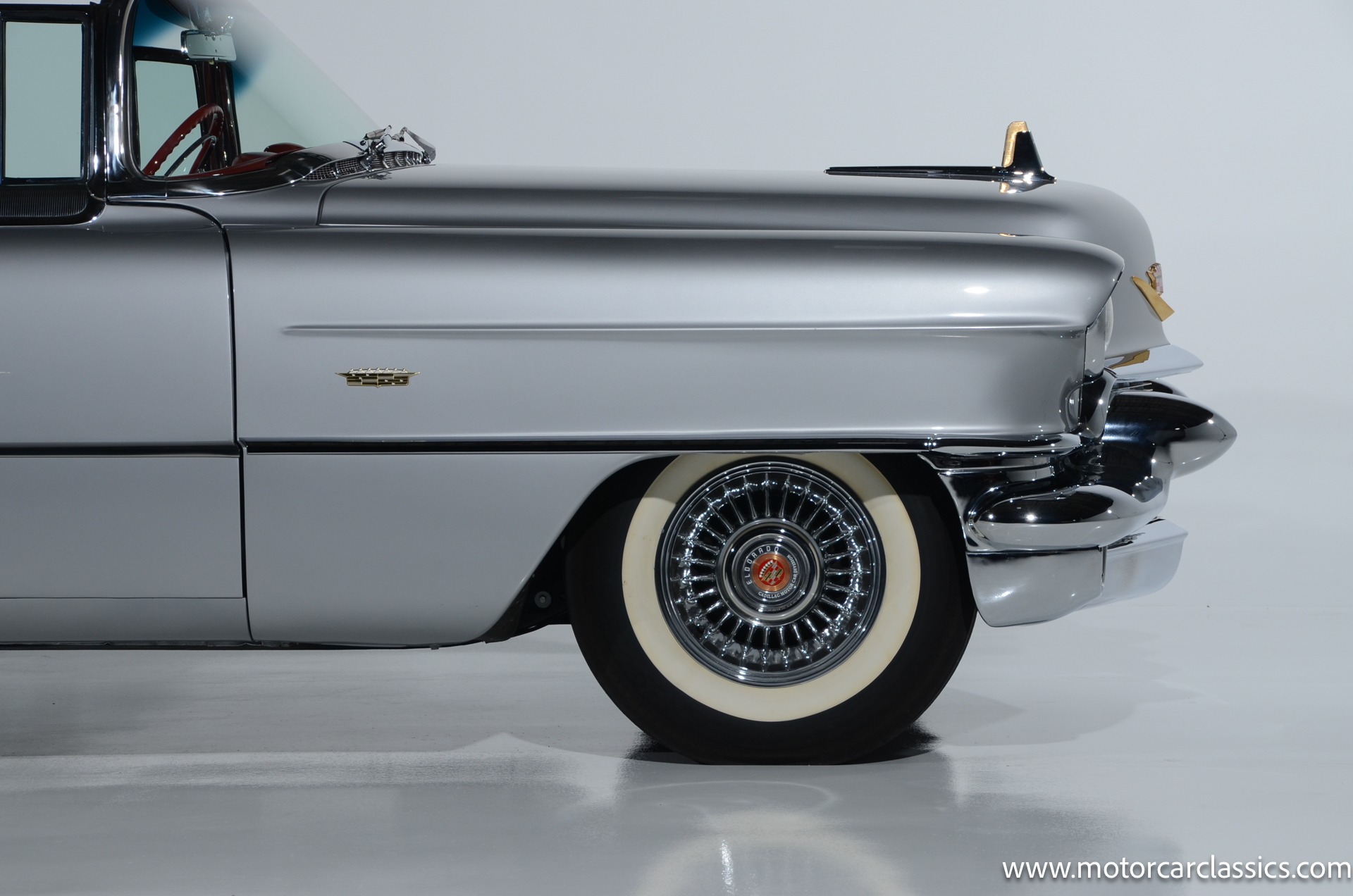 1956 Cadillac Eldorado for sale! Motorcar Classics is proud to present this beautiful 1956 Cadillac Eldorado Convertible, a distinguished example of mid-century American automotive luxury. This vehicle, part of the second generation of Eldorados introduced in 1954, represents Cadillac's commitment to combining performance, style, and innovation. It is presented in meticulously restored condition in metallic silver with red leather interior and black convertible top and original fiberglass Eldorado hard parade boot. The car features a robust 365 CID V8, with dual 4-bbl carburettors and correct Gold Batwing air cleaner producing over 305 HP, paired with a smooth Hydra-Matic automatic transmission, delivering the powerful yet smooth performance characteristic of Cadillac's luxury vehicles of this era. Luxury features include original power steering, power brakes, power windows, power top, power electric antenna, and Wonderbar Radio.