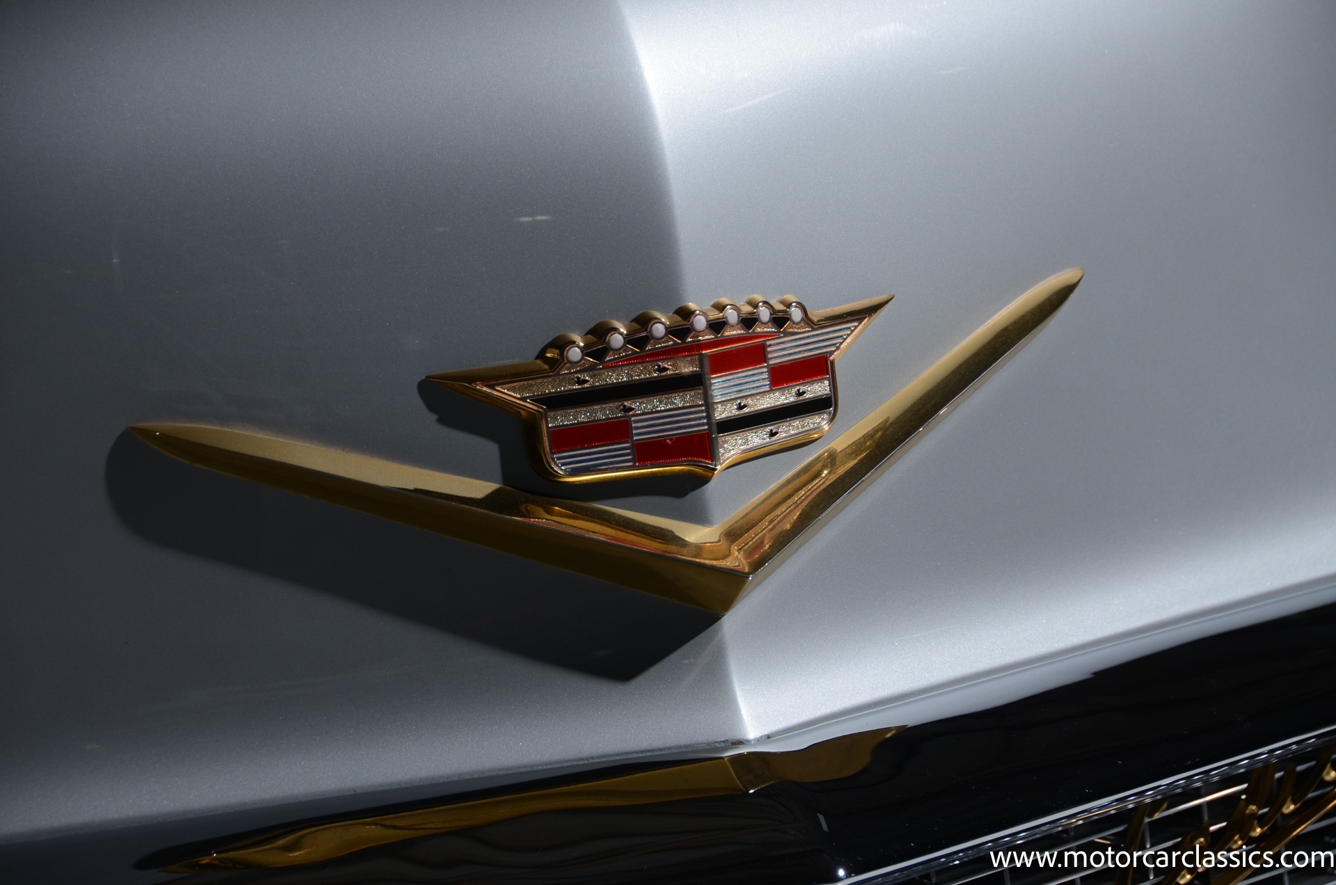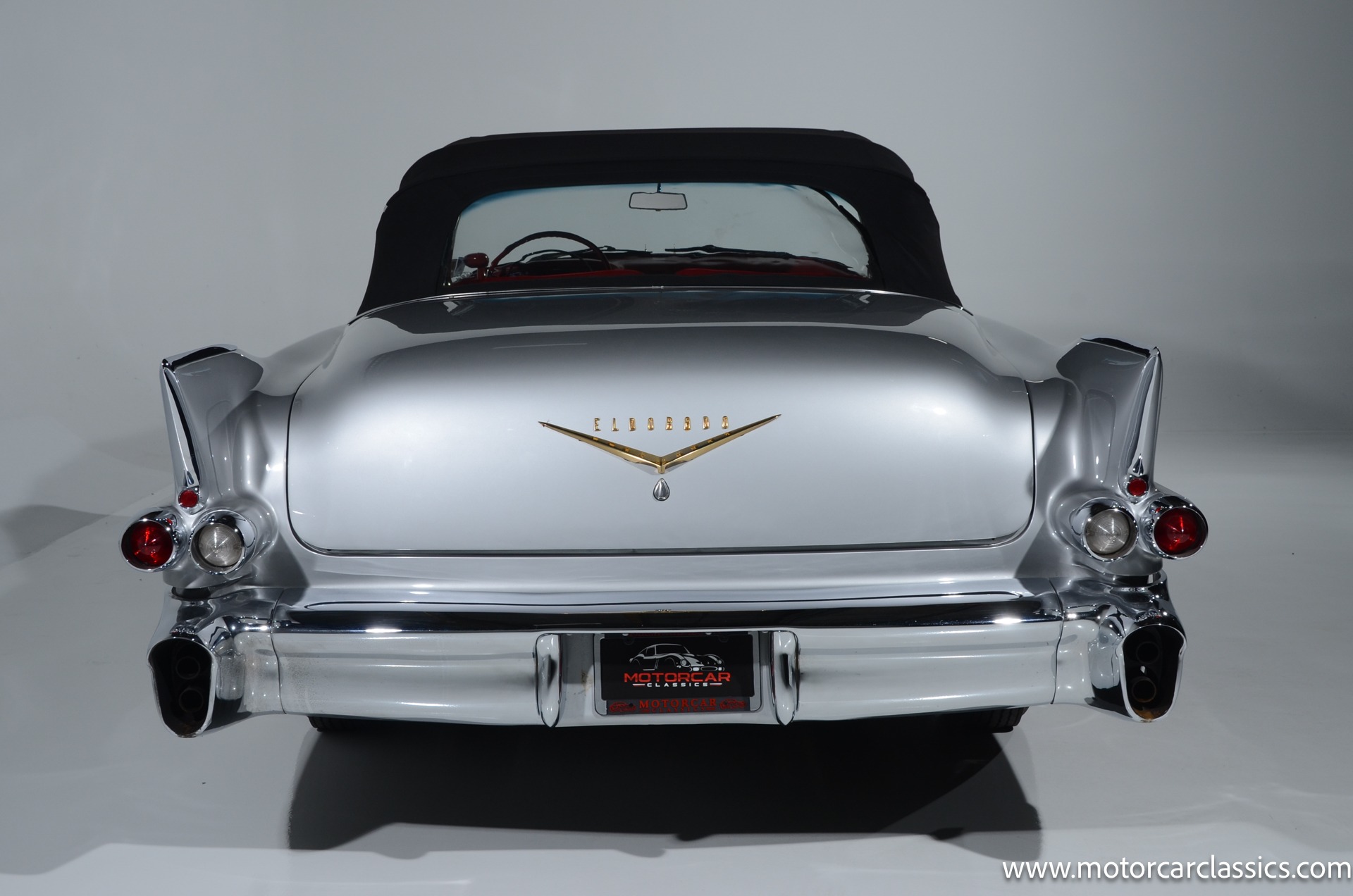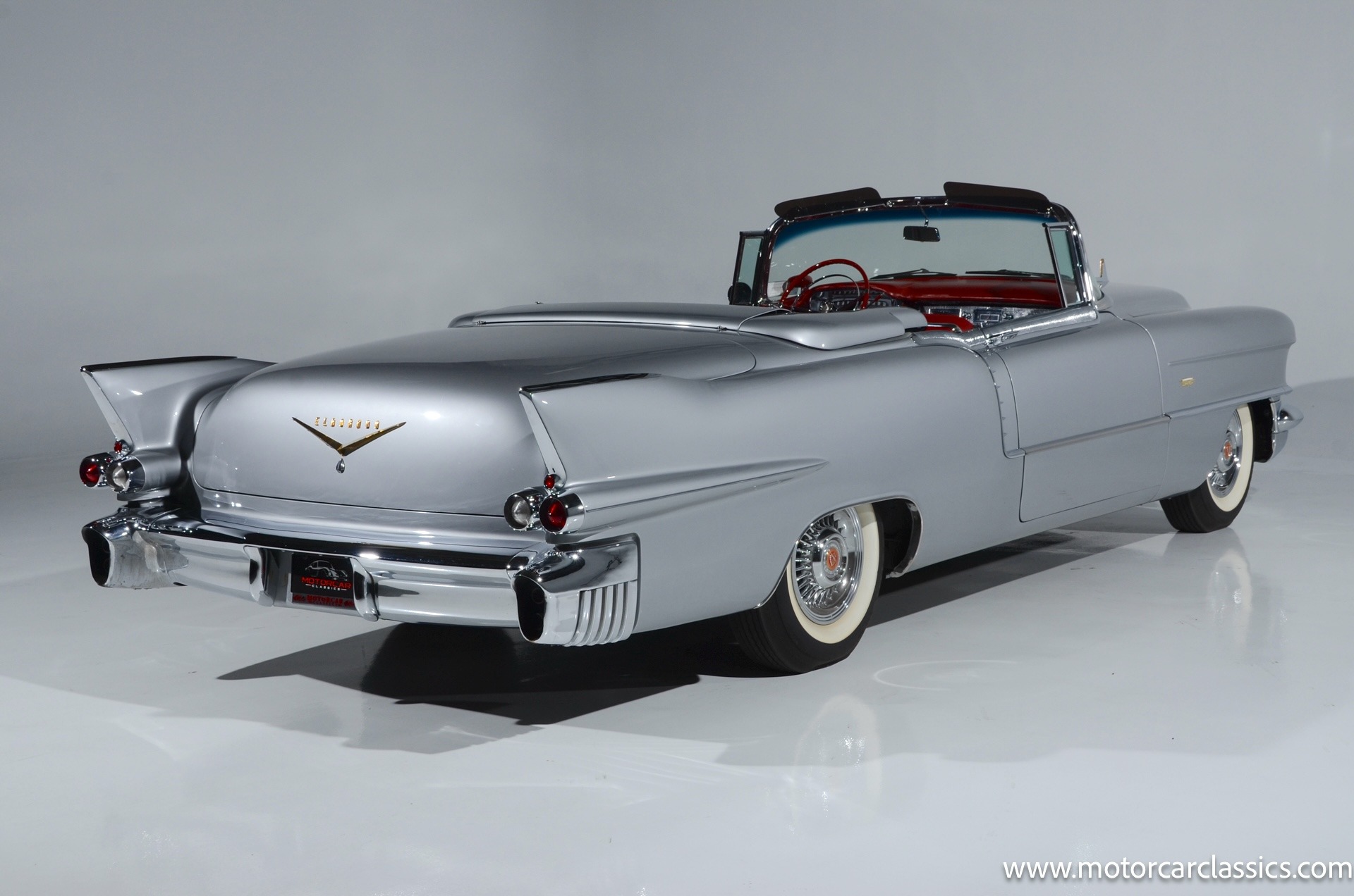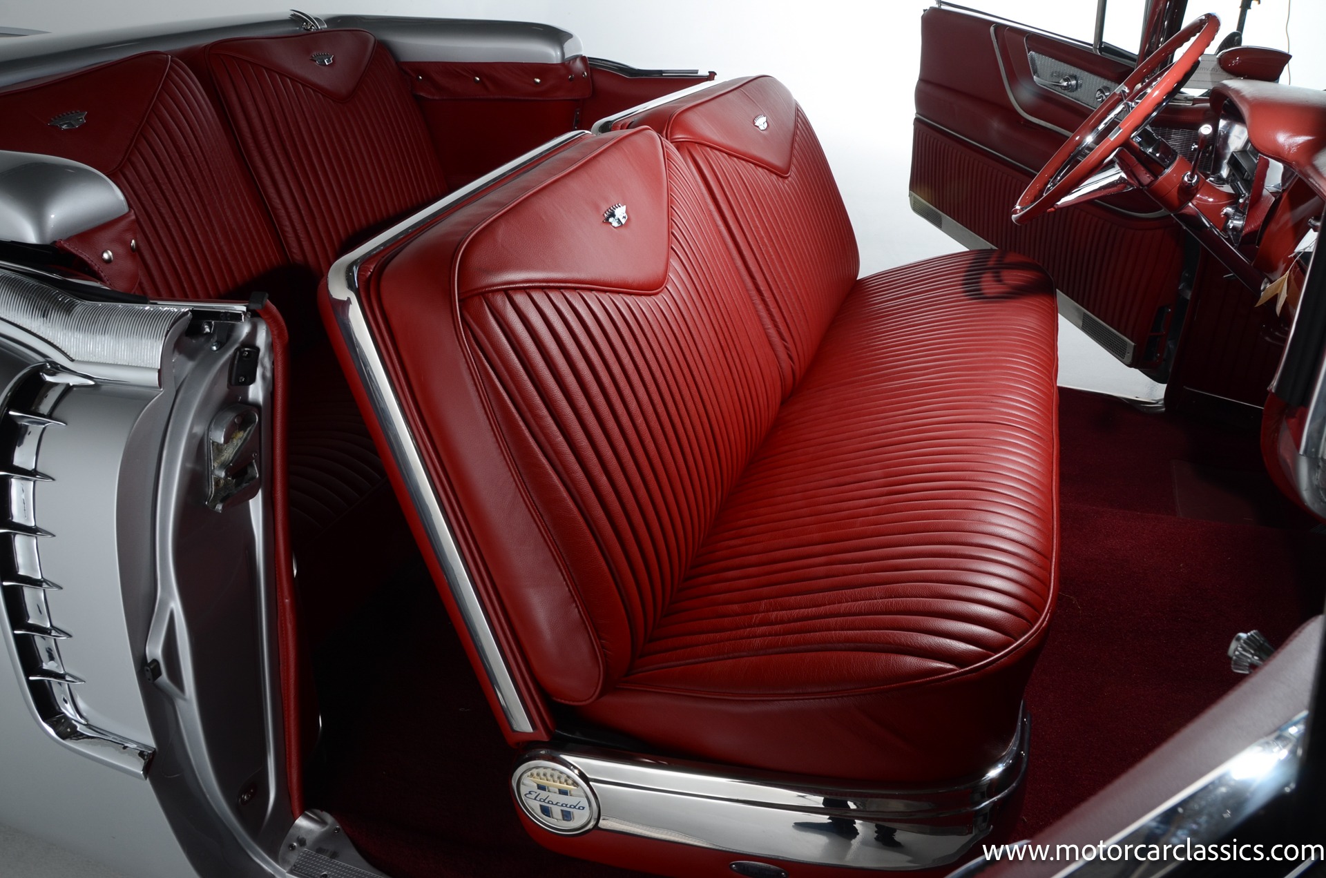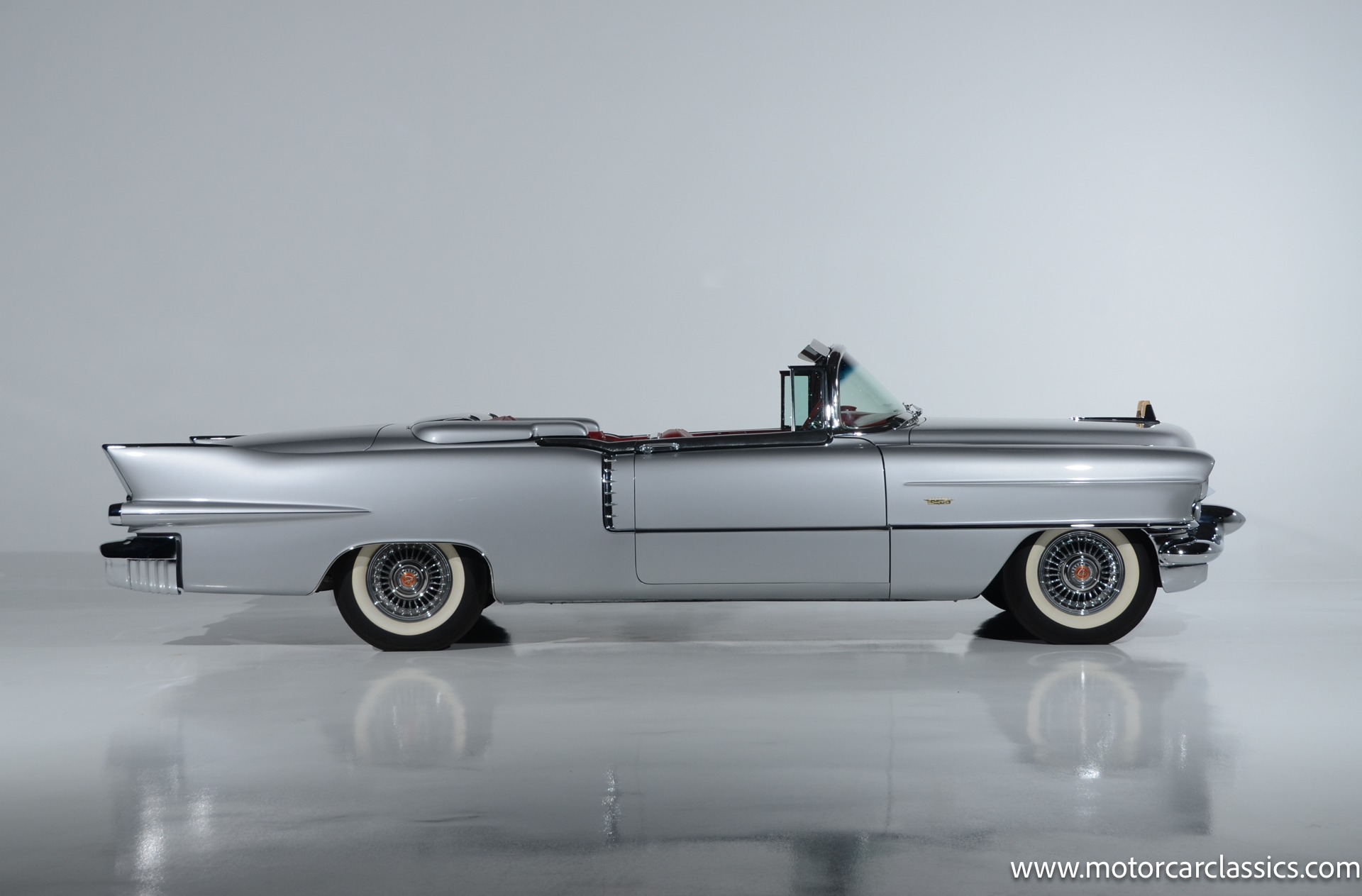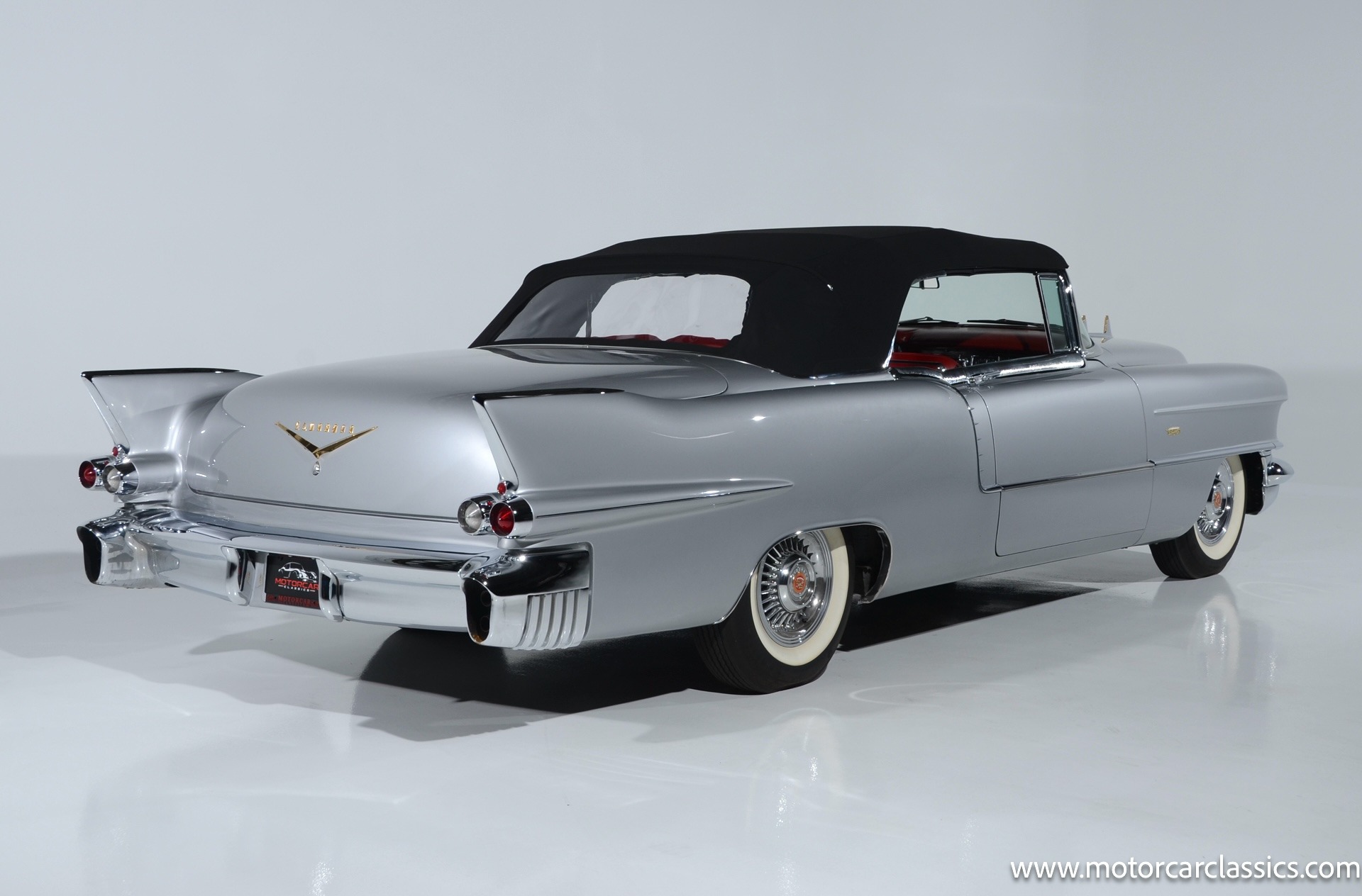 1956 Cadillac Eldorado for sale! Motorcar Classics is proud to present this beautiful 1956 Cadillac Eldorado Convertible, a distinguished example of mid-century American automotive luxury. This vehicle, part of the second generation of Eldorados introduced in 1954, represents Cadillac's commitment to combining performance, style, and innovation. It is presented in meticulously restored condition in metallic silver with red leather interior and black convertible top and original fiberglass Eldorado hard parade boot. The car features a robust 365 CID V8, with dual 4-bbl carburettors and correct Gold Batwing air cleaner producing over 305 HP, paired with a smooth Hydra-Matic automatic transmission, delivering the powerful yet smooth performance characteristic of Cadillac's luxury vehicles of this era. Luxury features include original power steering, power brakes, power windows, power top, power electric antenna, and Wonderbar Radio.
