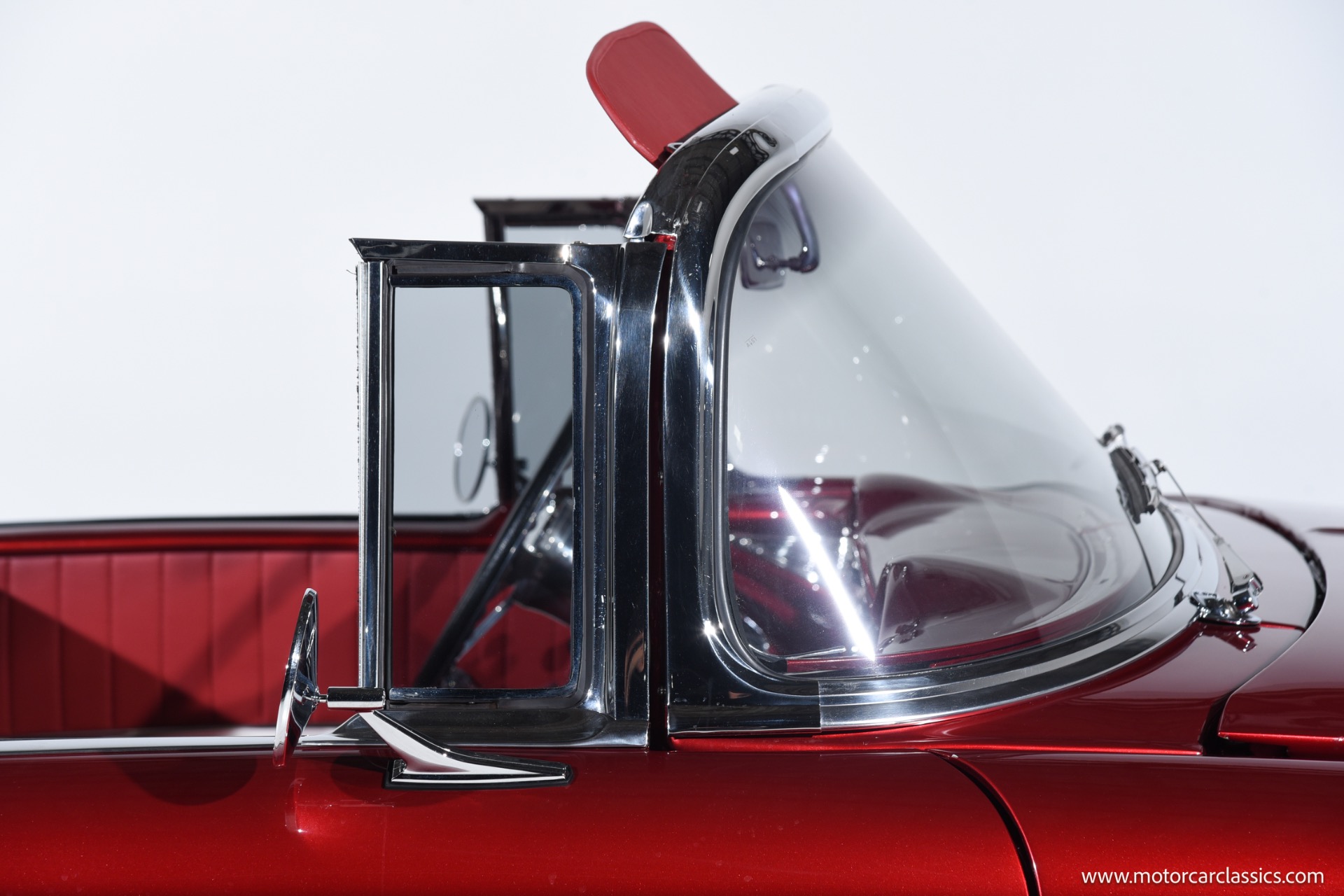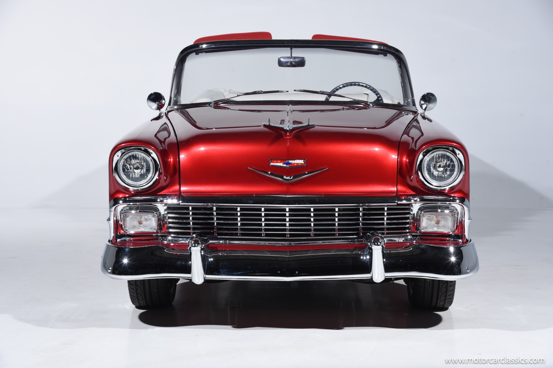 The exterior on this Bel Air is a beautiful two-tone custom paint job. Ford Tri-coat Ruby Red (PPG 931662) with Ice White (WA703S - PPG 923680) Brand new glass, frames. Chrome body moldings were sourced either used OEM or new from Danchuk. Custom Black Cloth power convertible top. Foose chrome rims and Hankook tires. New emblems and ornaments. New chrome bumpers. New custom headlights and rear lights.