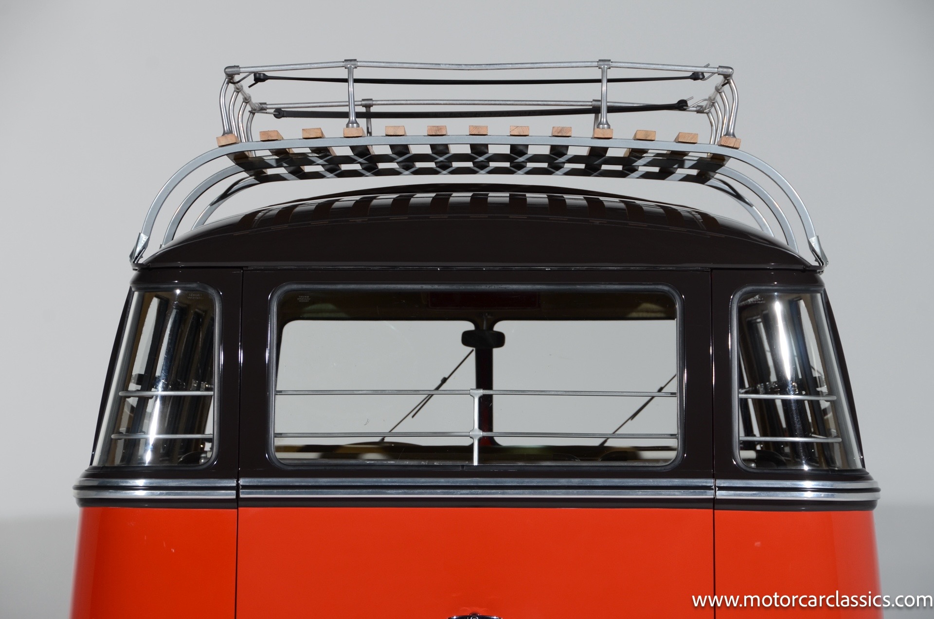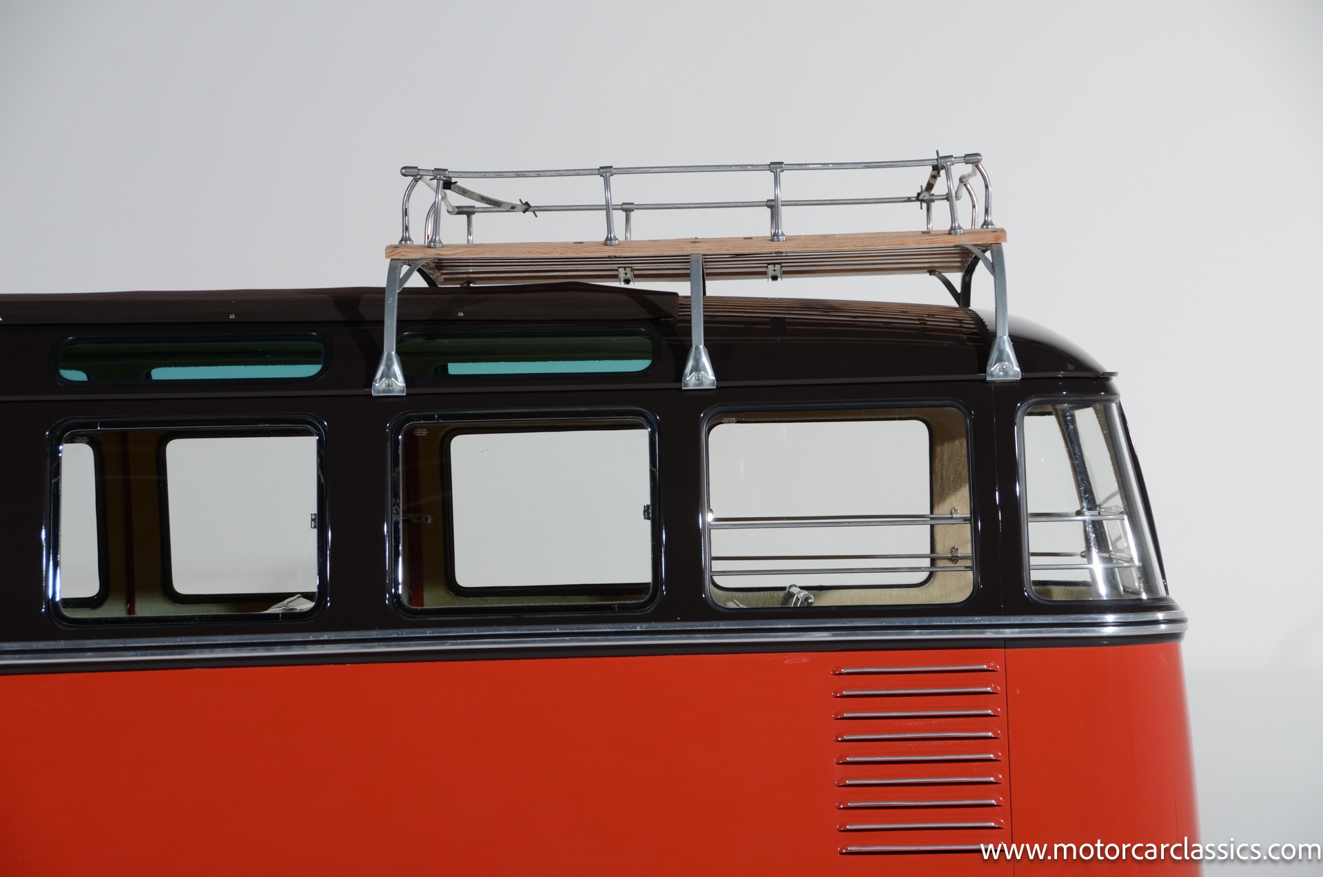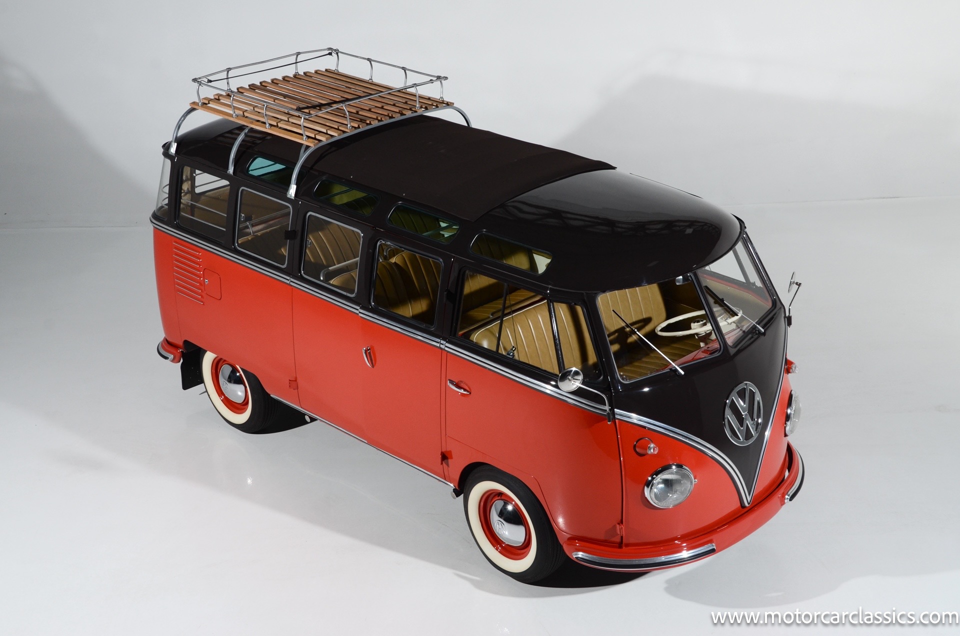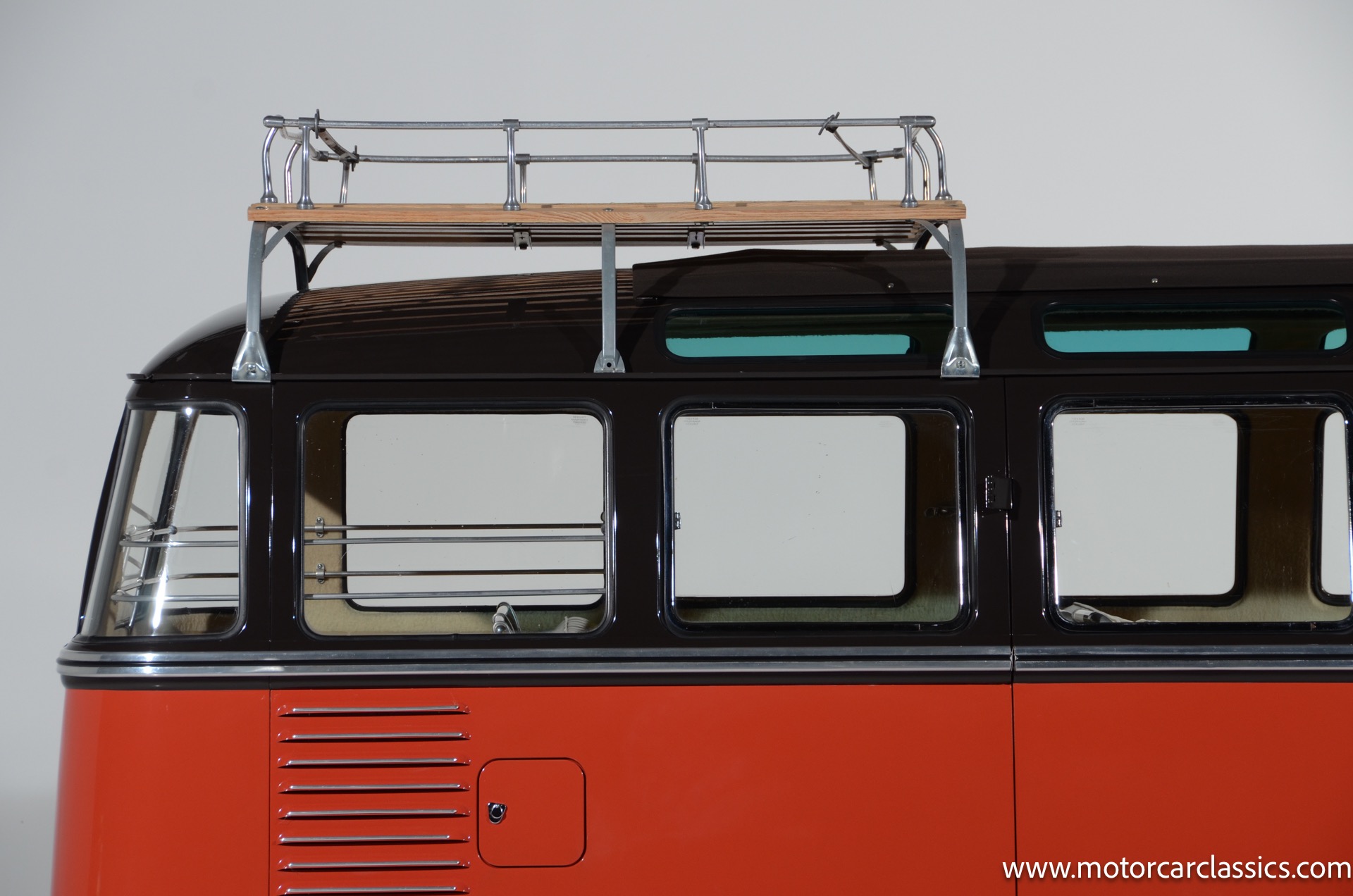 1956 Volkswagen Bus for sale! Motorcar Classics is proud to present this 1956 Volkswagen Type 2 23-Window Transporter, a rare piece of Volkswagen's history. As one of the last hand-built transporters to roll out of the Wolfsburg plant before production transitioned to another automated assembly plant at Johannesburg, Bavaria, this bus holds a special place in Volkswagen's legacy. Imported to Texas in April 1956, it boasts a unique rear transmission mount crossmember that distinguishes it from the later automated assembly transporters, a telltale sign of its hand-crafted origins and collectibility. This dry-state vehicle has spent its entire life in the arid climates of Texas, New Mexico, and Arizona, resulting in a completely rust-free body - a true rarity for a VW of this vintage. Still bearing its Arizona title, this meticulously preserved and beautifully restored Type 2 offers collectors and enthusiasts alike the opportunity to own a piece of Volkswagen's storied past. With its 23 windows providing ample natural light and panoramic views, along with a full sunroof, this Transporter embodies the spirit of adventure and freedom that made these vehicles iconic. Featured in black over red with beige interior, this is arguably the most desirable color combination. A period-correct rooftop luggage rack, and wide whitewall tires complete the classic look. For improved performance, and safety, the bus is upgraded with a circa 1970 VW 1,600 cc motor. Don't miss this chance to acquire a pristine, hand-built example of one of the most beloved and recognizable vehicles in automotive history.