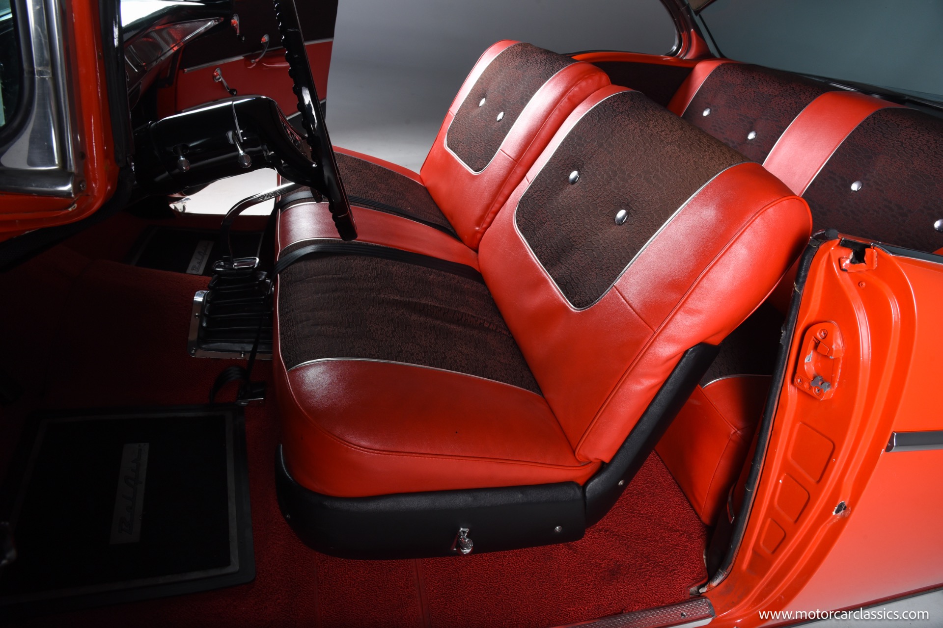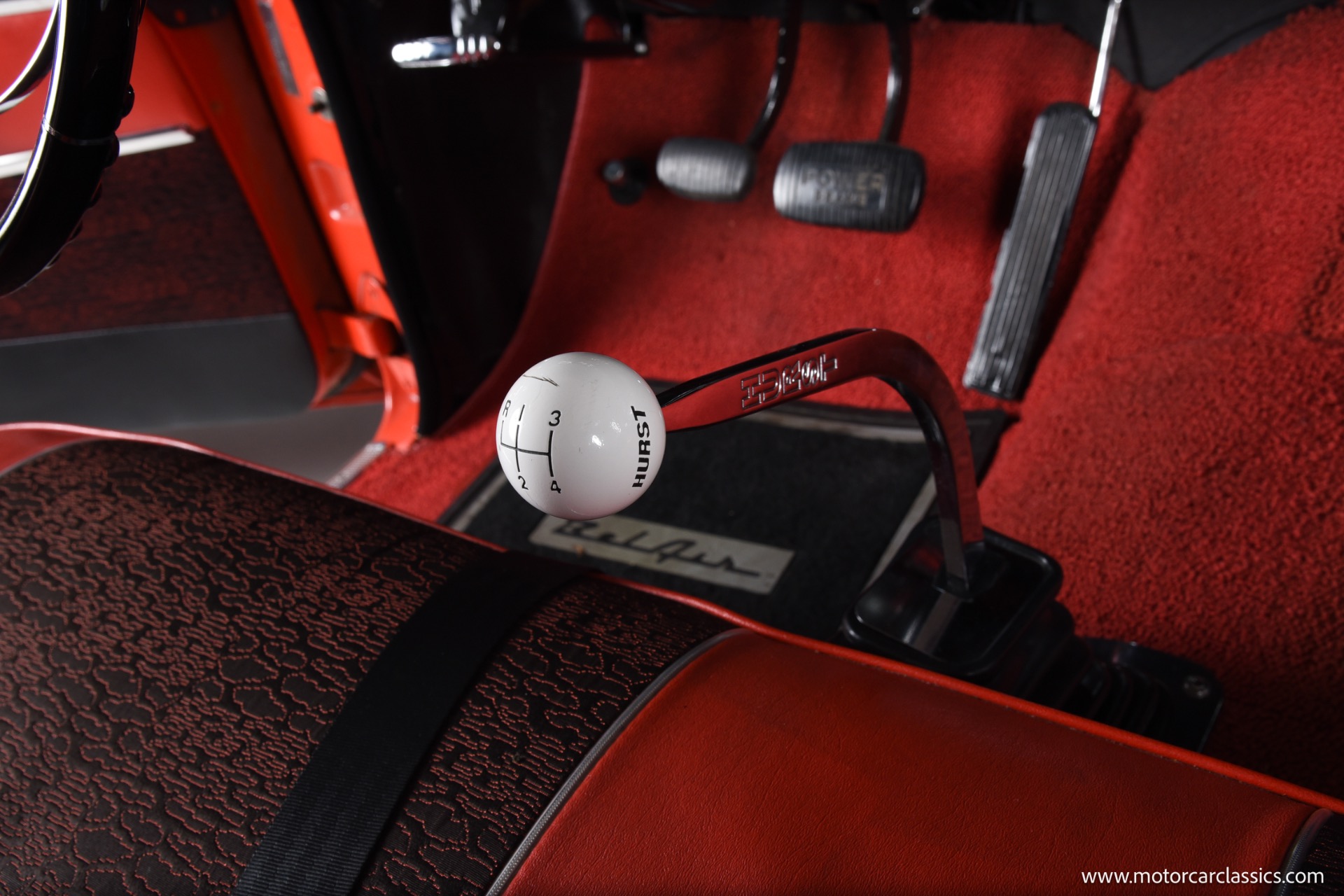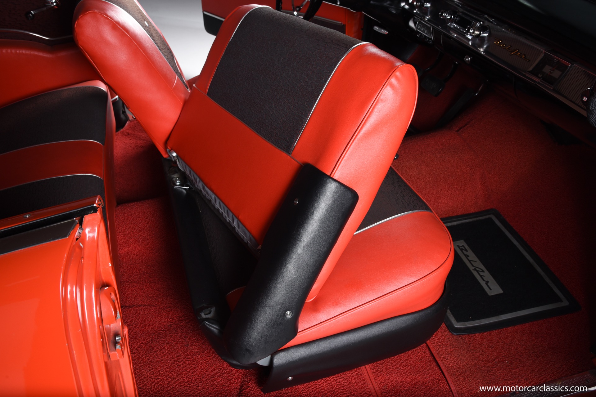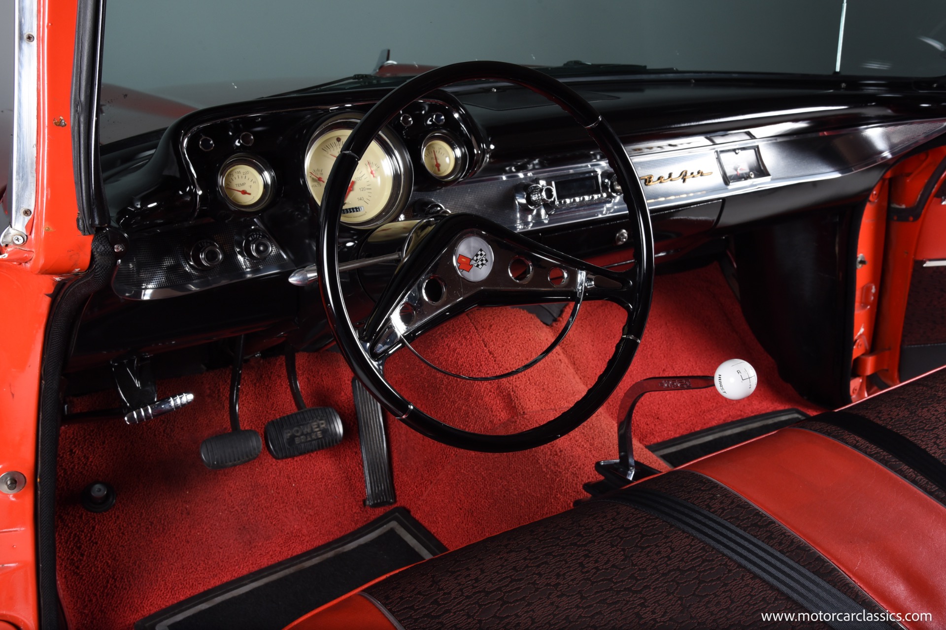 Inside, the Bel Air boasts a striking red and black interior that complements its red and white exterior. Classic instrument gauges keep you informed, while new wiring throughout ensures reliability. Enjoy your favorite tunes with the RetroSound Bluetooth stereo, and benefit from LED courtesy lighting for a touch of modern convenience.