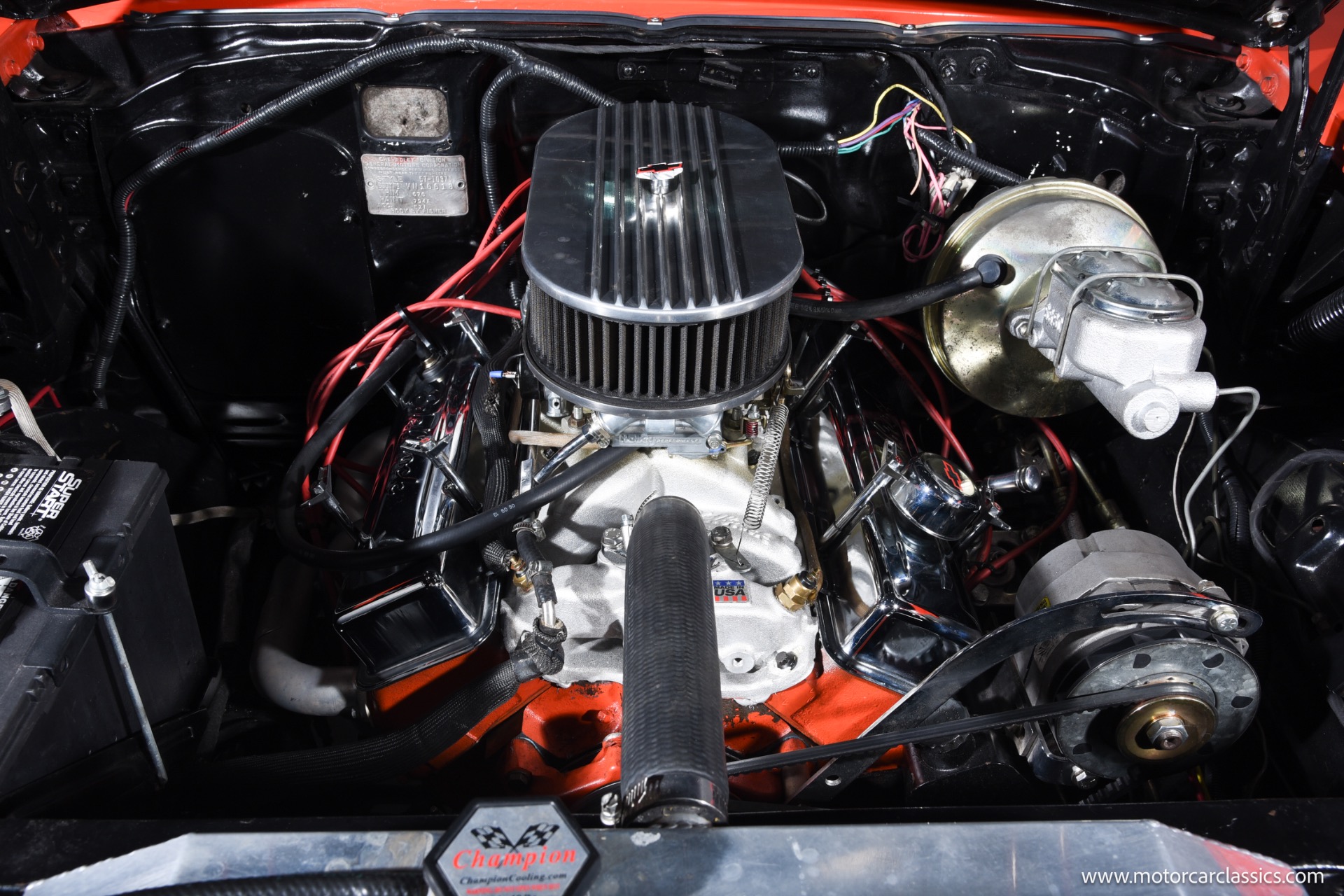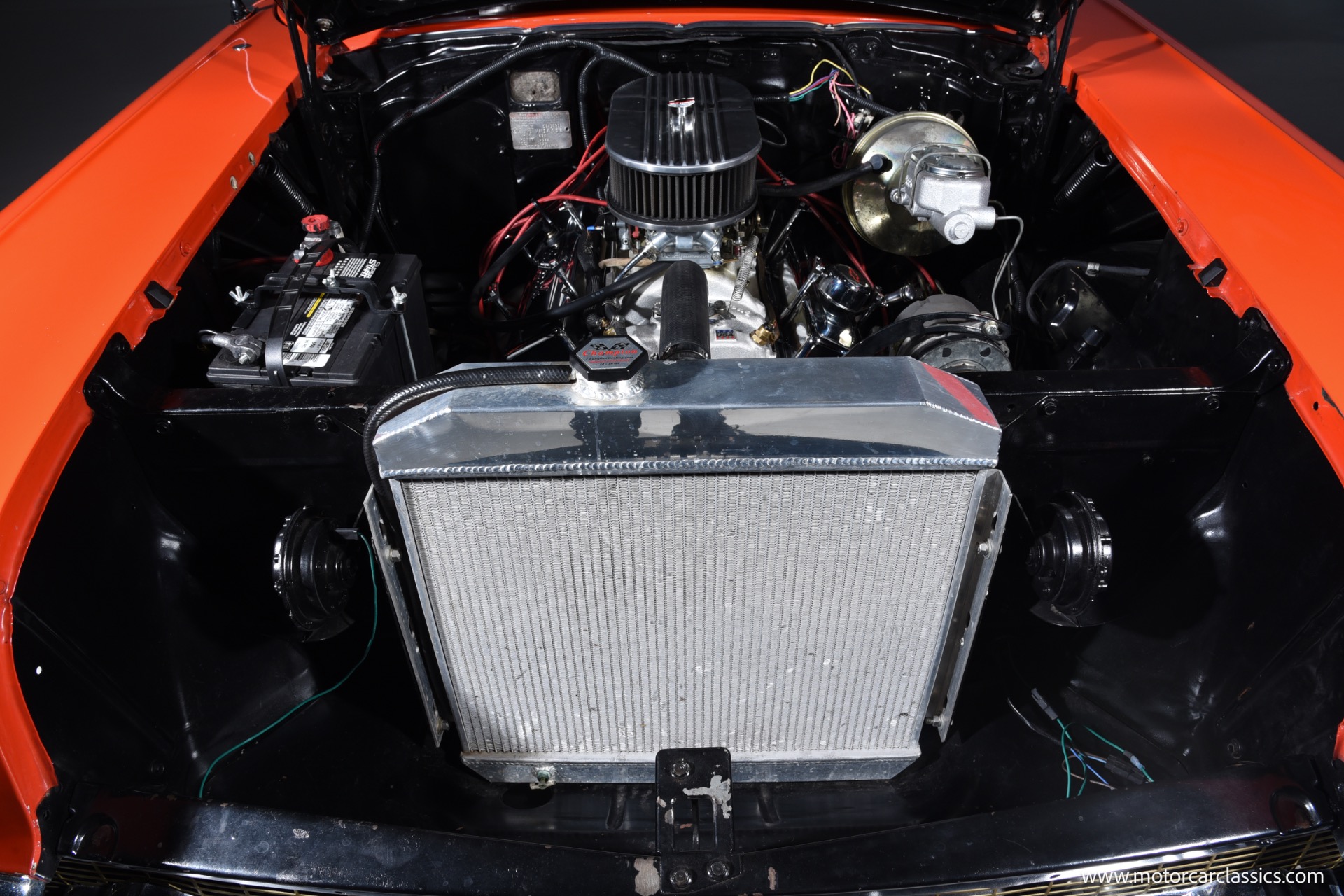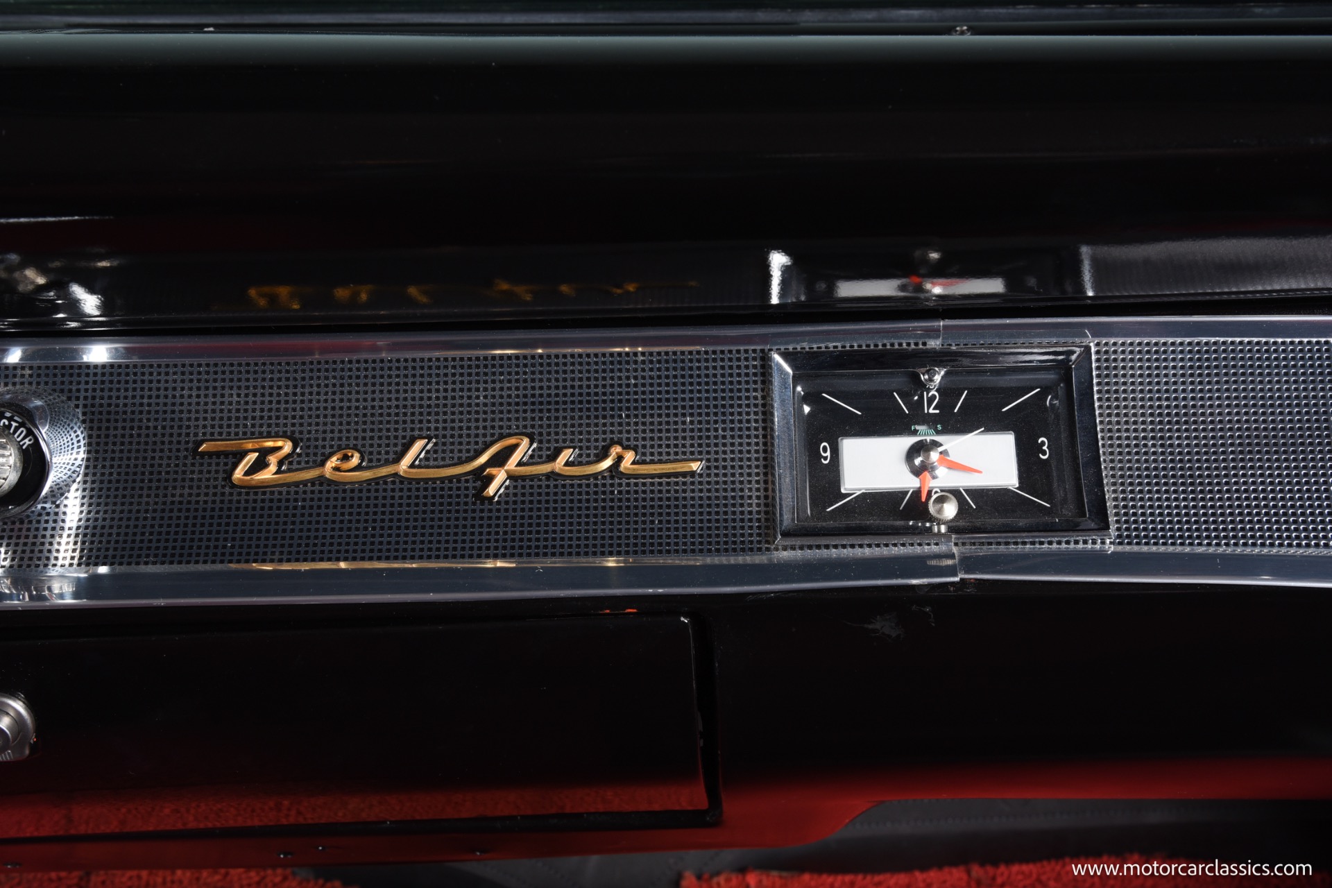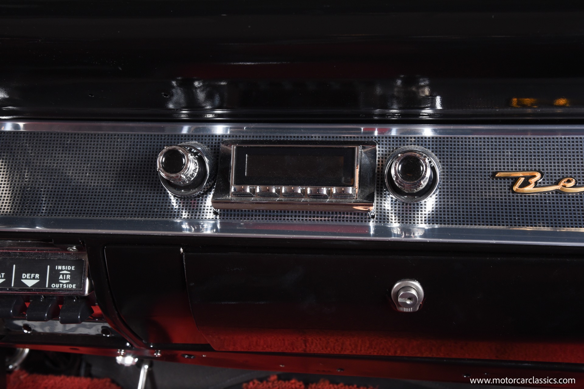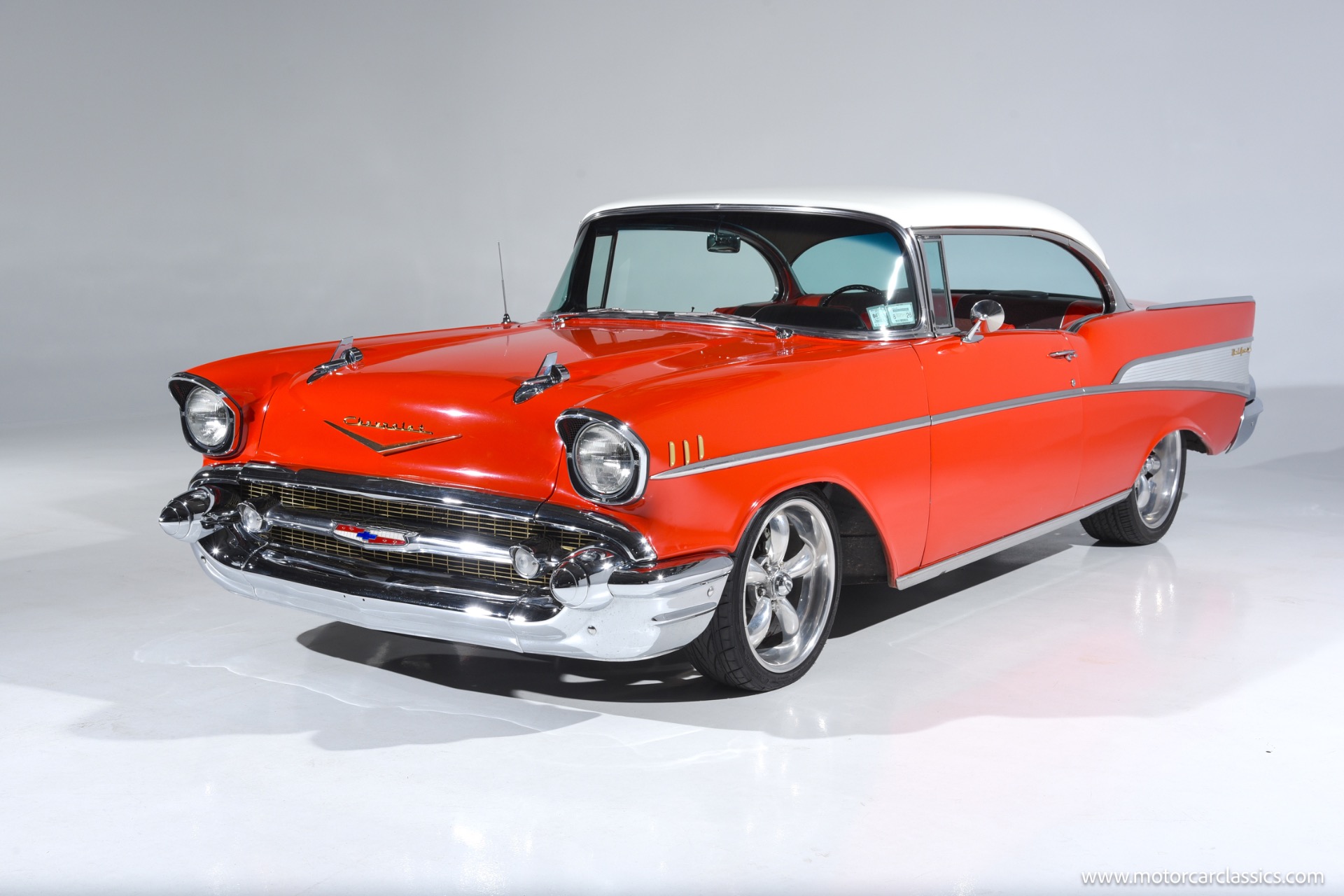 Inside, the Bel Air boasts a striking red and black interior that complements its red and white exterior. Classic instrument gauges keep you informed, while new wiring throughout ensures reliability. Enjoy your favorite tunes with the RetroSound Bluetooth stereo, and benefit from LED courtesy lighting for a touch of modern convenience.