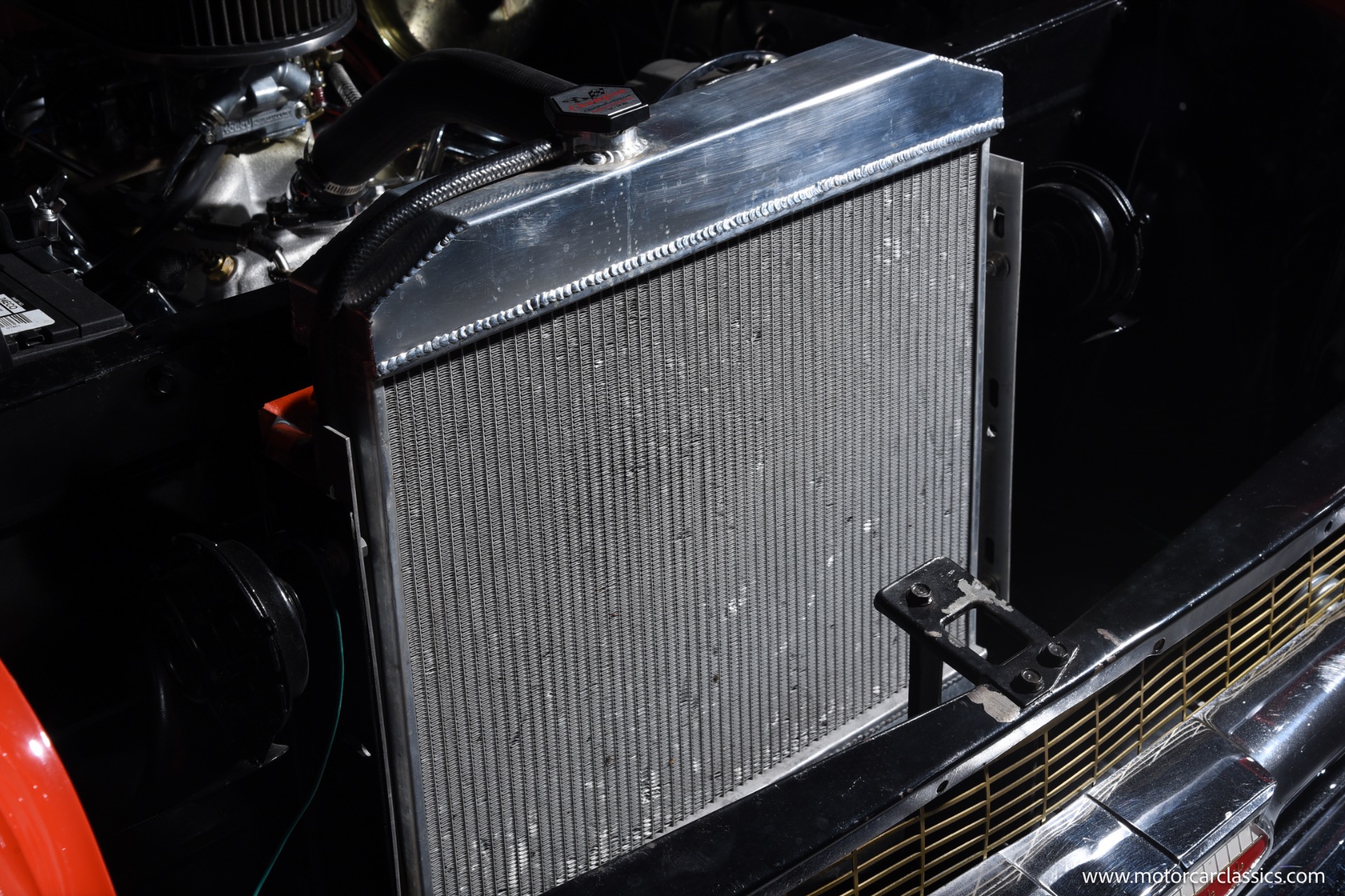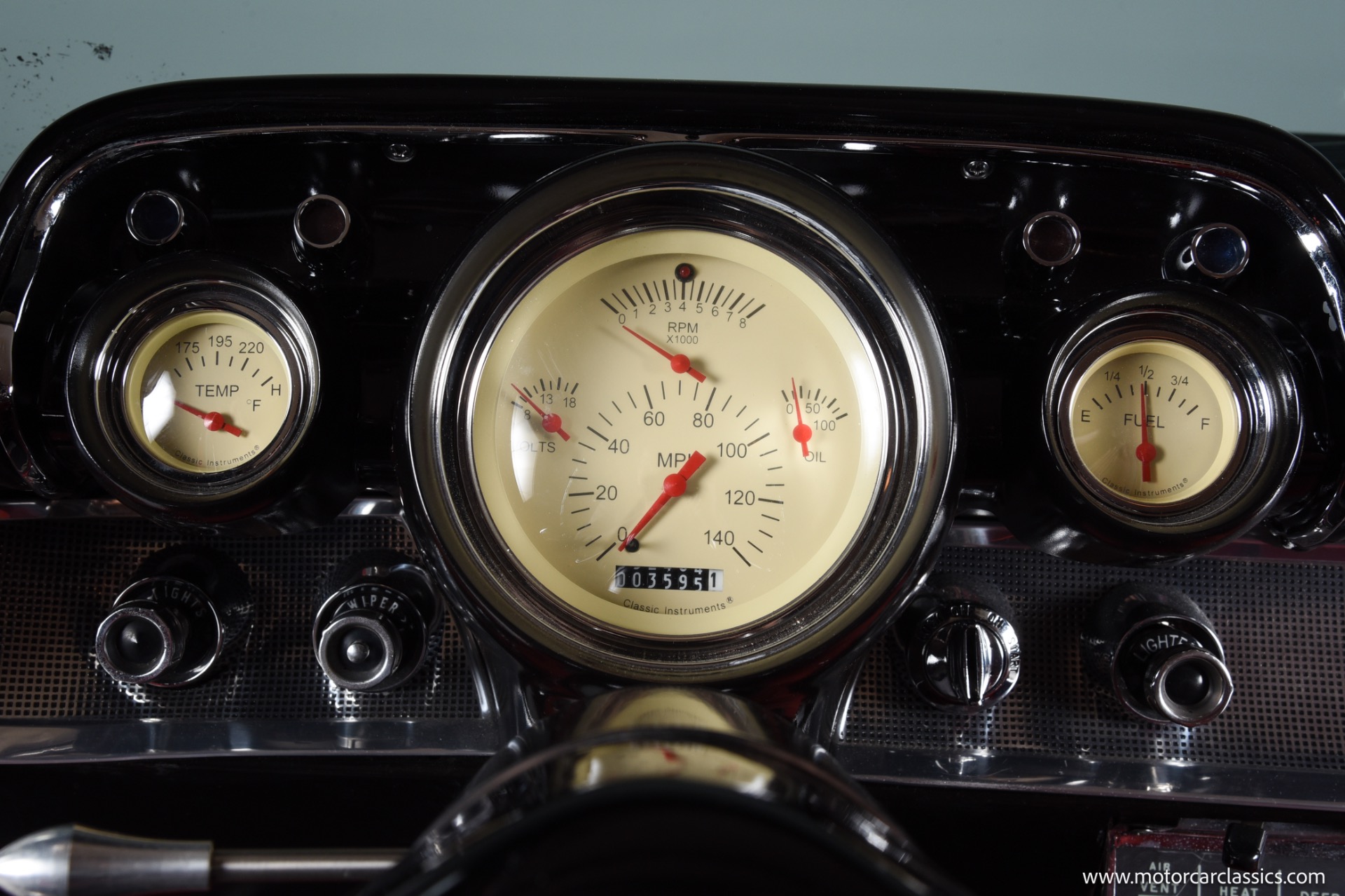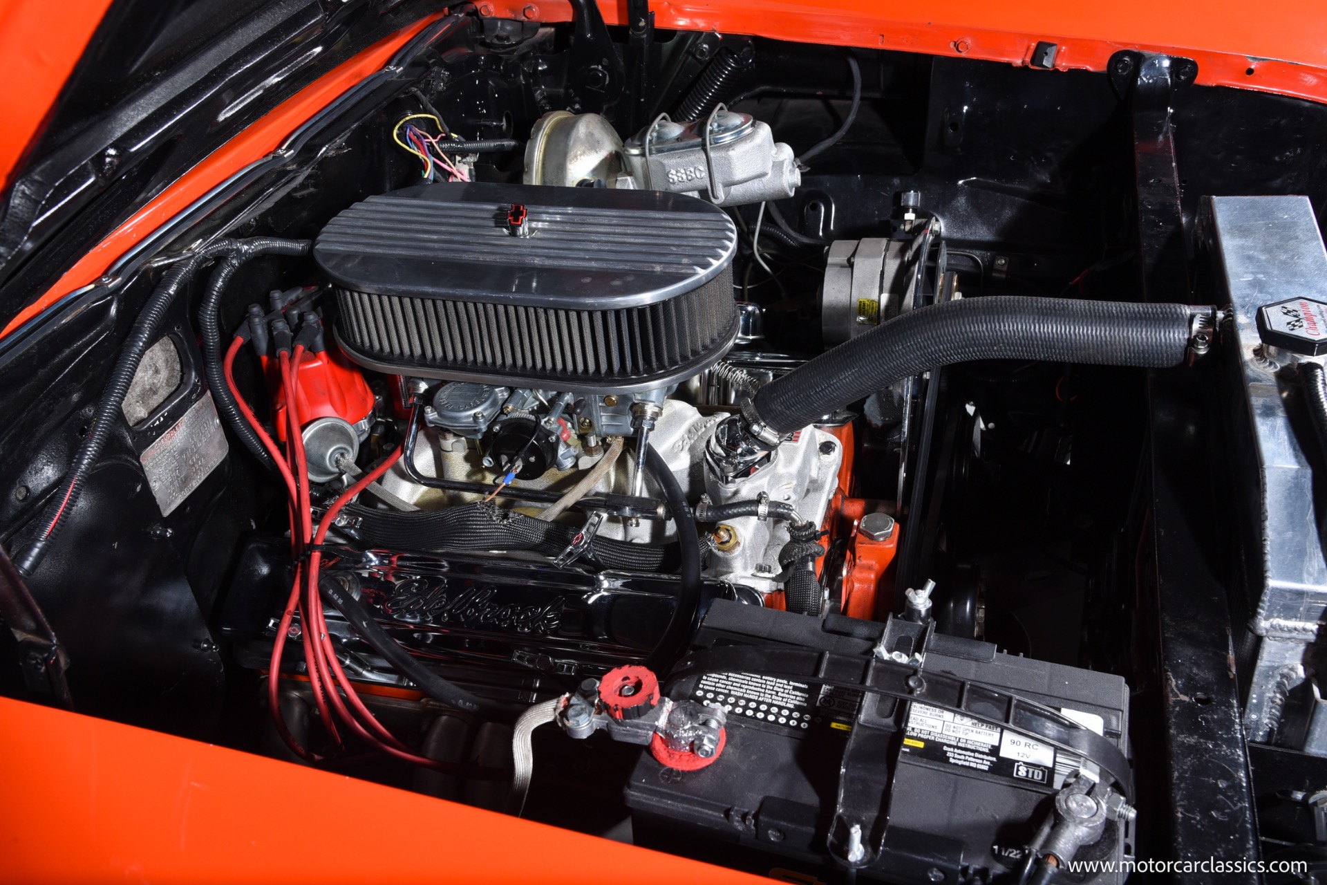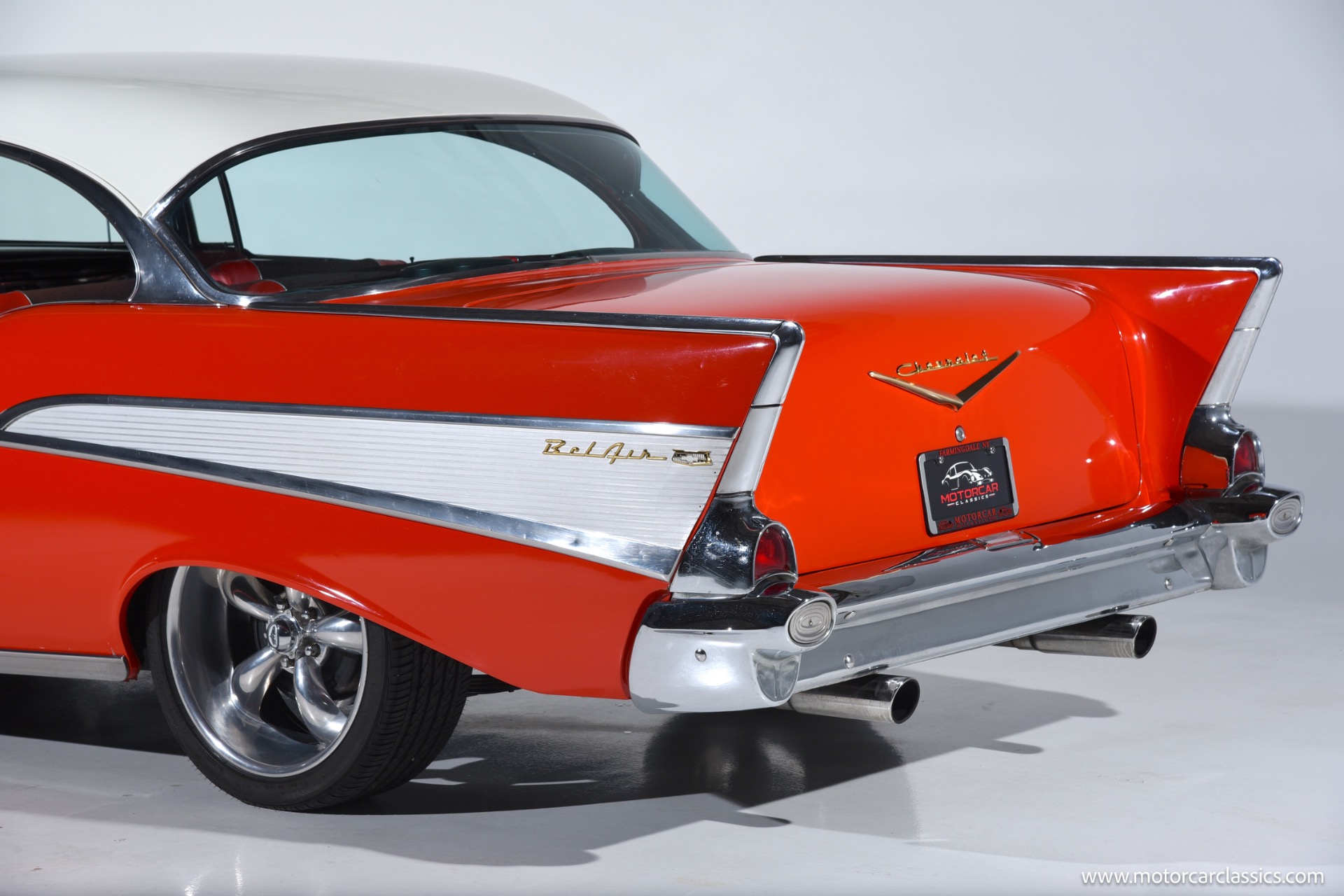 Inside, the Bel Air boasts a striking red and black interior that complements its red and white exterior. Classic instrument gauges keep you informed, while new wiring throughout ensures reliability. Enjoy your favorite tunes with the RetroSound Bluetooth stereo, and benefit from LED courtesy lighting for a touch of modern convenience.