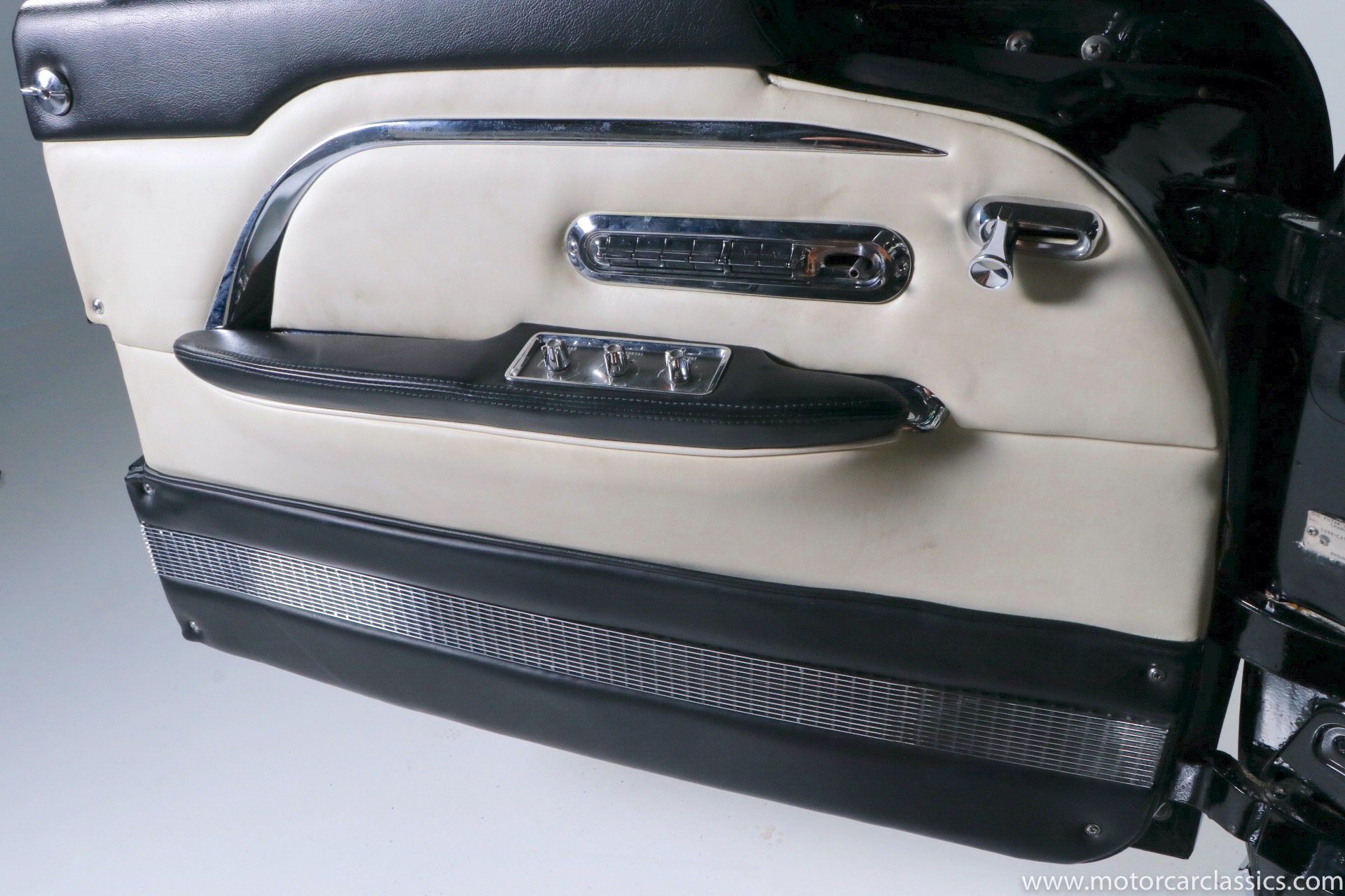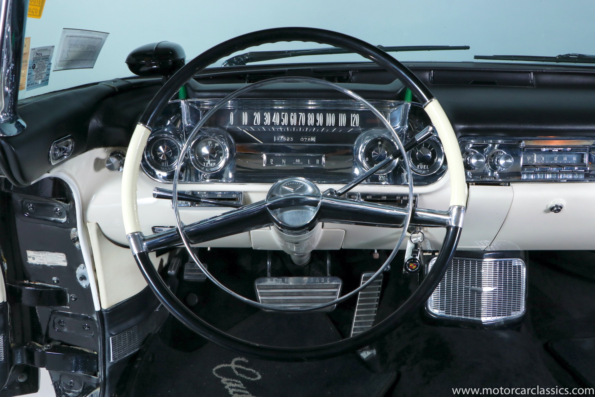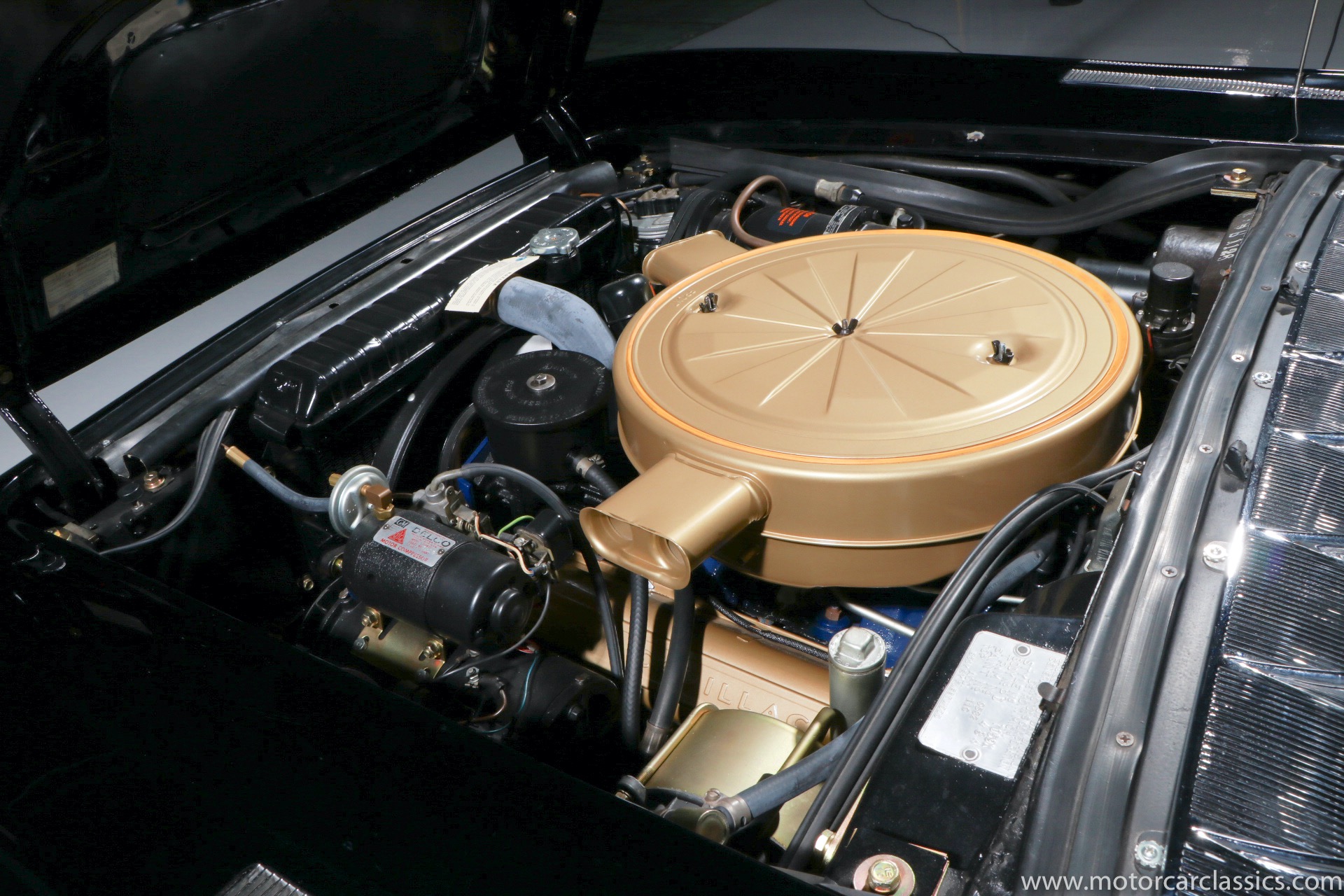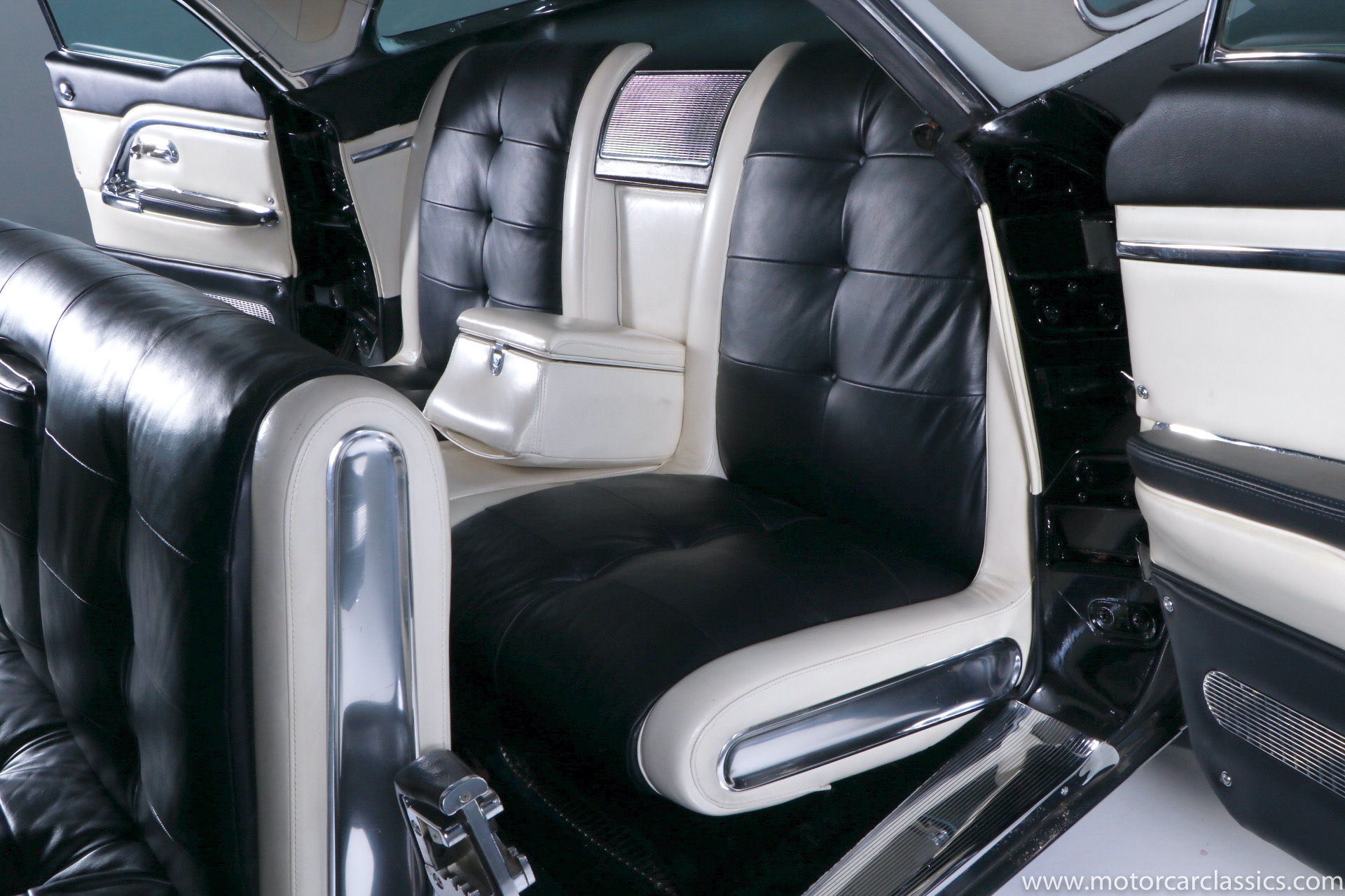 Although its early history is unknown, this Eldorado was once part of the famed John O'Quinn Collection. It is finished in Black over a white leather interior accented by black buttons, matching the original Cadillac build records from the GM Archives. It was restored in the late 1990s and the original air springs changed to conventional coil springs for reliability. Body contours and panel fit are very good, with the paint and brightwork free from flaws. The engine compartment is clean and appropriately detailed. The select items from the coveted vanity set include tumblers, acrylic cigarette case, perfume bottle, notepad, and vanity case. The car has been an important part of serious collections, and it is still capable of turning heads on prestigious concur lawns.