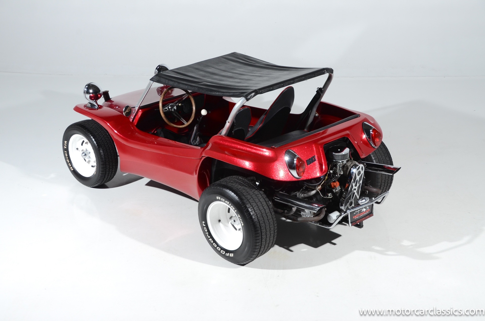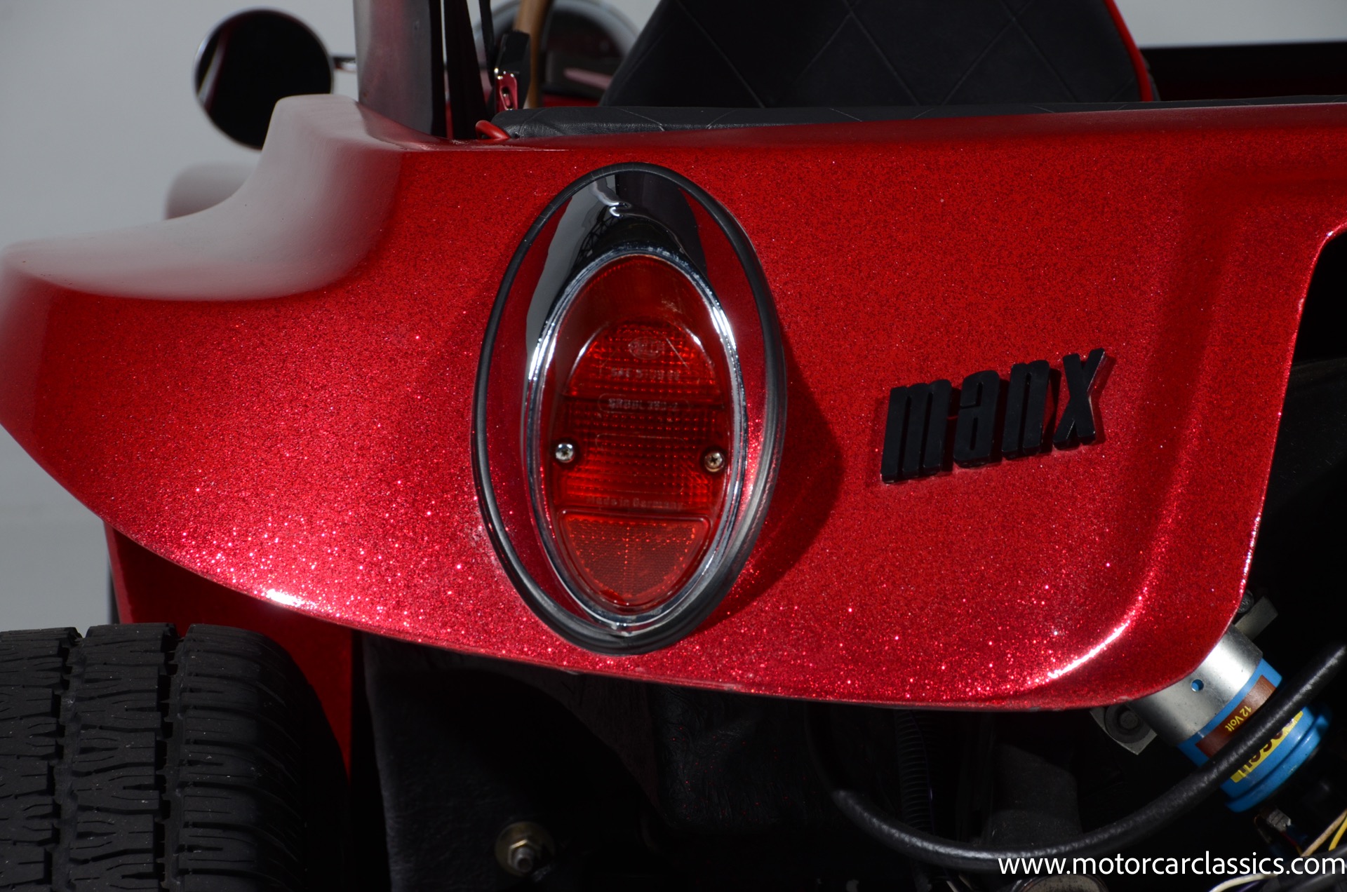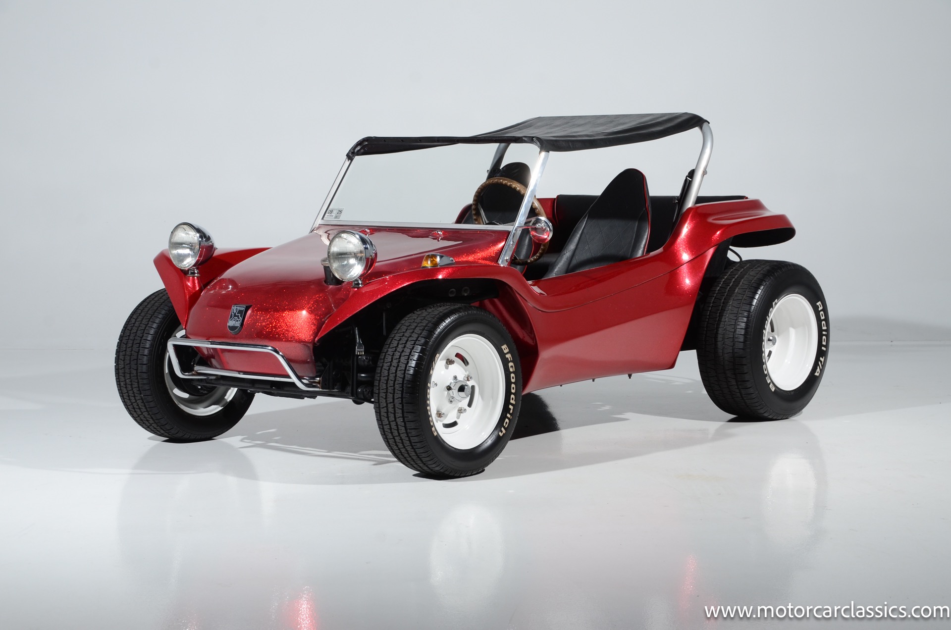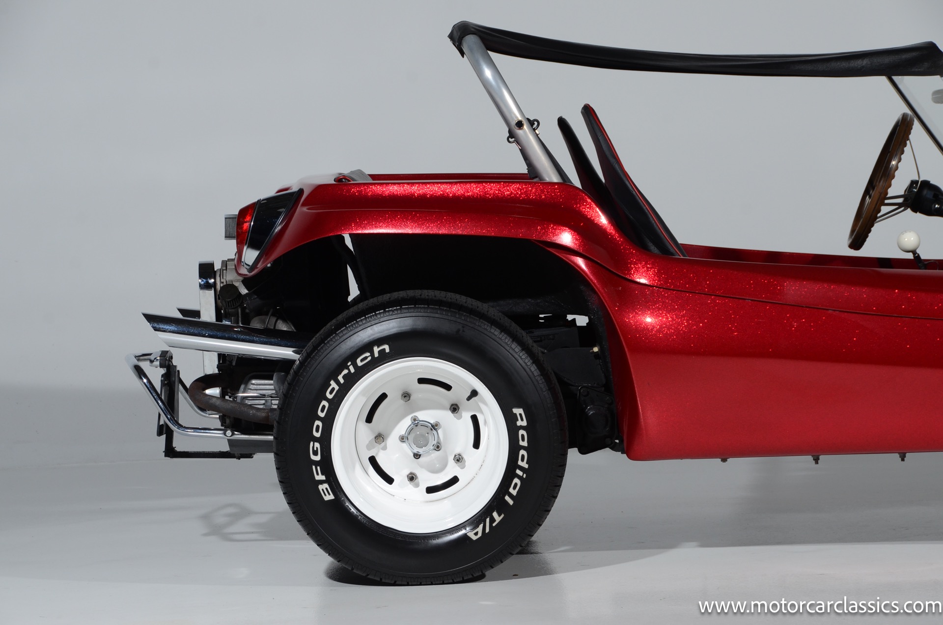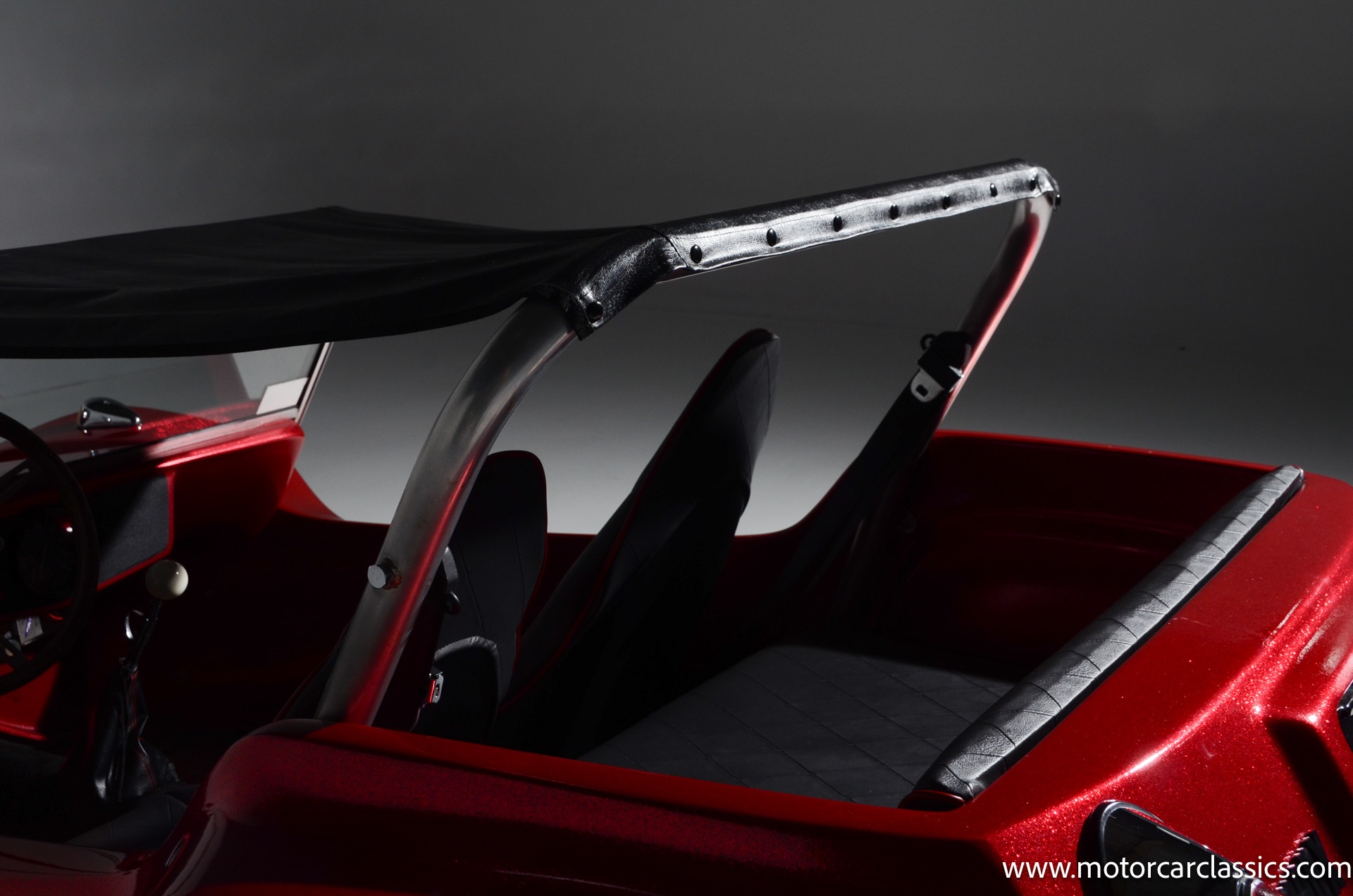 1959 Meyers Manx Dune Buggy for sale! Motorcar Classics is proud to present this genuine 1959 Meyers Manx Dune Buggy. Legendary Bruce Meyers started a legend and an industry when he introduced his Manx Dune Buggy. Our Manx has a Certificate of Authenticity from Bruce Meyers that this is #0088 of his production. This buggy was built circa 1970 on a shortened 1959 VW Type I floorpan and it has been upgraded with a 1,600 cc dual-port engine mated to a 4-speed manual gearbox. It has all the original tags and plates. The rare side pods give our Manx the classic dune buggy look with fully finished and enclosed sides. The car is finished in metal flake red with period-correct white steel rims, chrome headlamps, period-correct interior, surrey top, wood-rim steering wheel, engine dress-up kit, and bamboo floor mats. The car is reported to have had a light restoration in 2013 and it is in excellent condition to show and drive with pride. These genuine Meyers Manx buggies are very collectible, a parade of them opened the track with a parade this year each day of the Goodwood Revival. This is a very groovy and investment-grade Manx that is more fun that you can imagine!