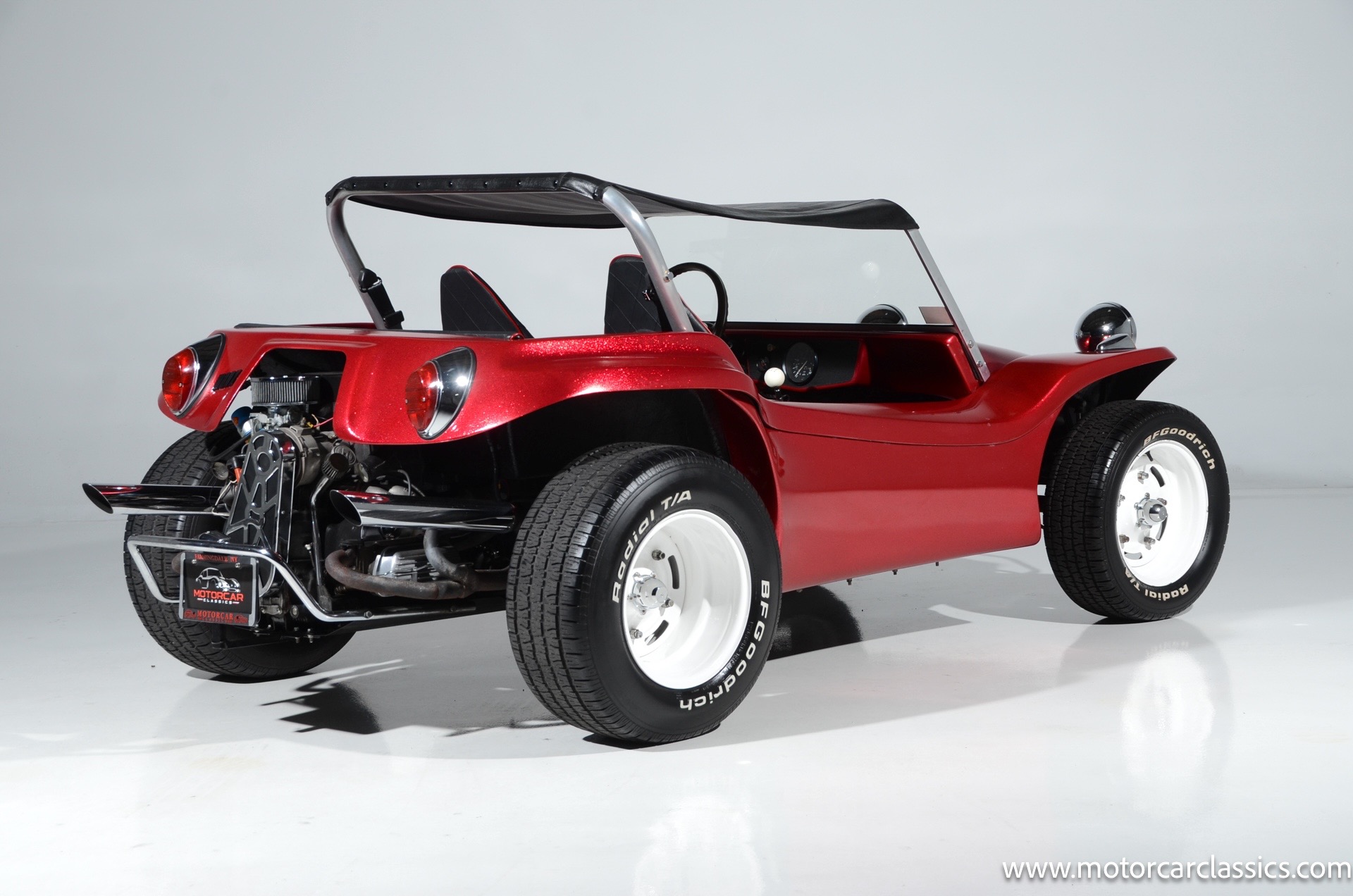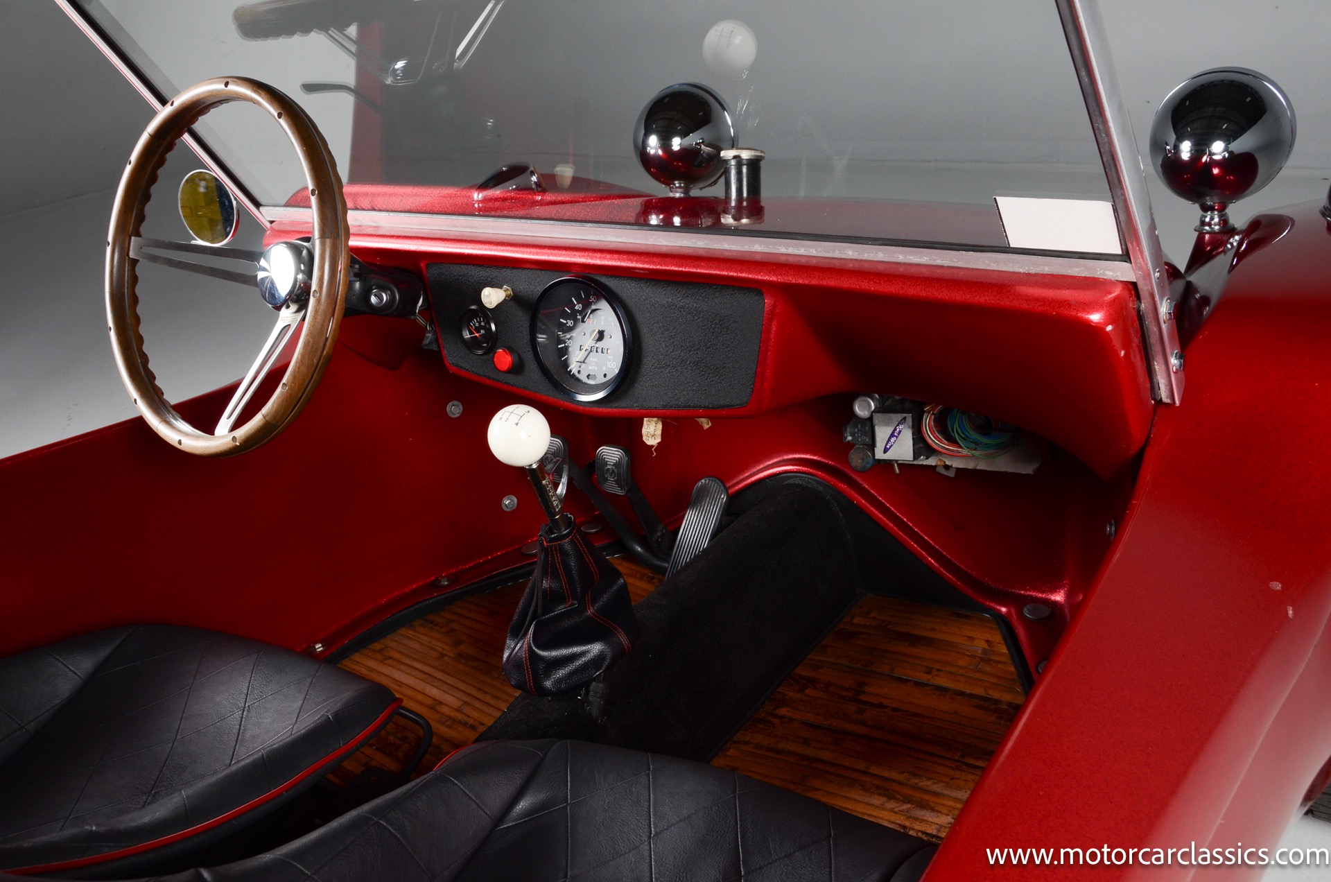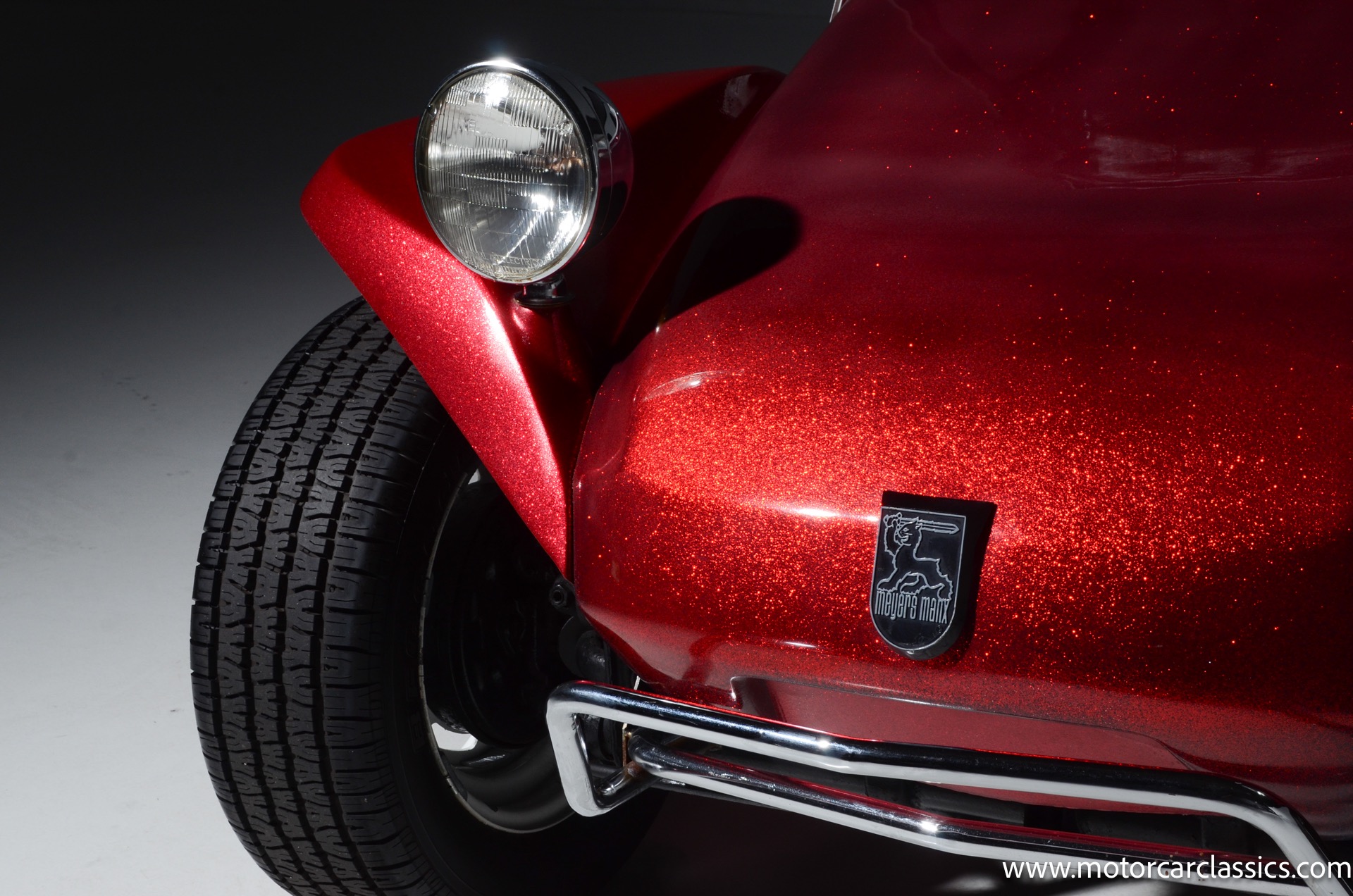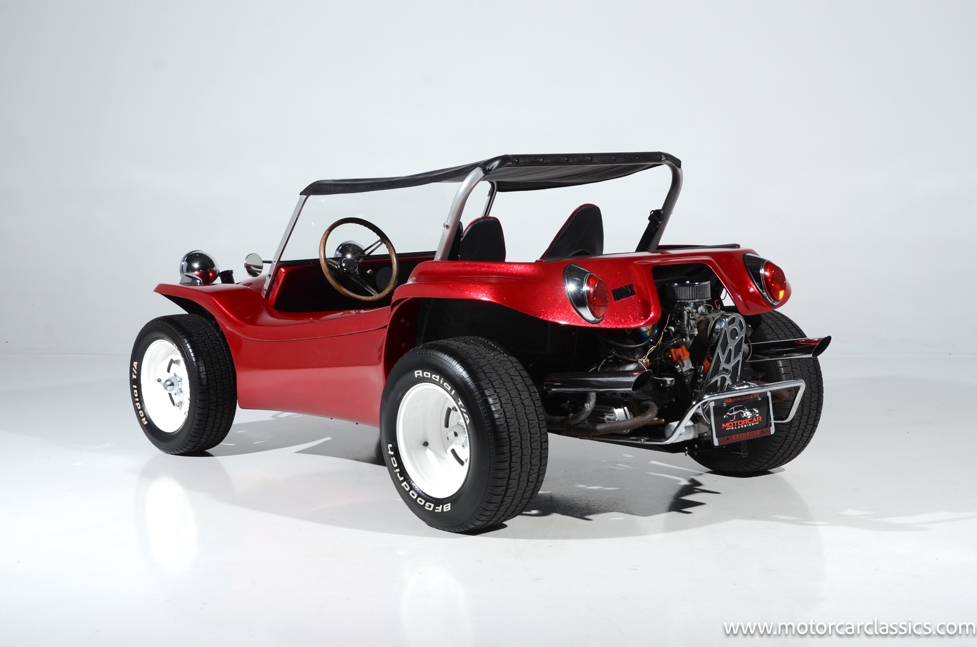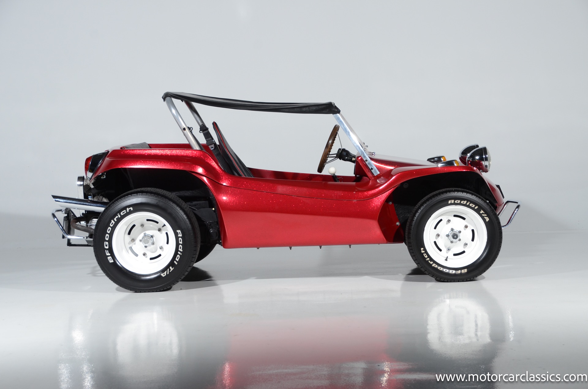 1959 Meyers Manx Dune Buggy for sale! Motorcar Classics is proud to present this genuine 1959 Meyers Manx Dune Buggy. Legendary Bruce Meyers started a legend and an industry when he introduced his Manx Dune Buggy. Our Manx has a Certificate of Authenticity from Bruce Meyers that this is #0088 of his production. This buggy was built circa 1970 on a shortened 1959 VW Type I floorpan and it has been upgraded with a 1,600 cc dual-port engine mated to a 4-speed manual gearbox. It has all the original tags and plates. The rare side pods give our Manx the classic dune buggy look with fully finished and enclosed sides. The car is finished in metal flake red with period-correct white steel rims, chrome headlamps, period-correct interior, surrey top, wood-rim steering wheel, engine dress-up kit, and bamboo floor mats. The car is reported to have had a light restoration in 2013 and it is in excellent condition to show and drive with pride. These genuine Meyers Manx buggies are very collectible, a parade of them opened the track with a parade this year each day of the Goodwood Revival. This is a very groovy and investment-grade Manx that is more fun that you can imagine!