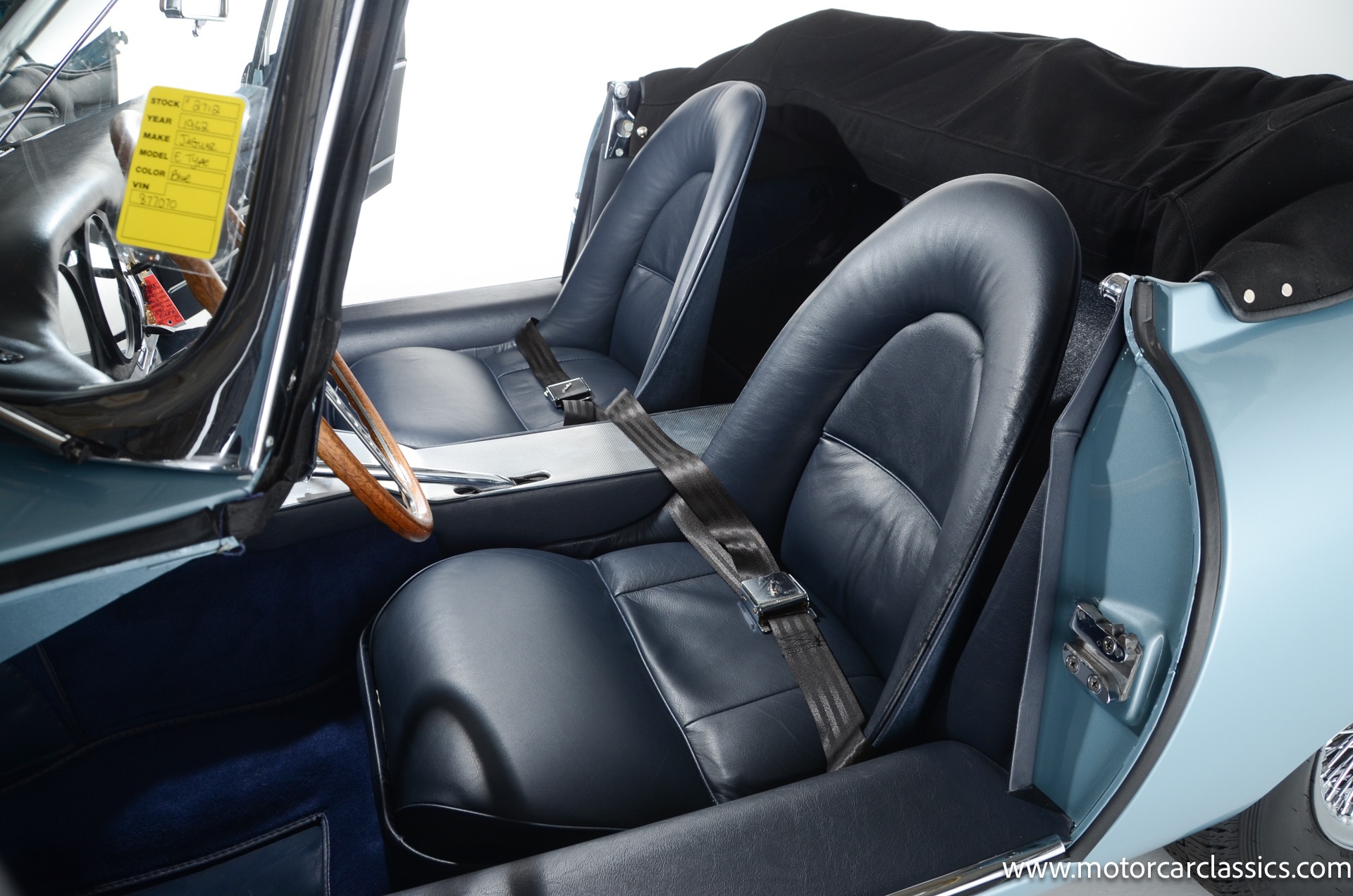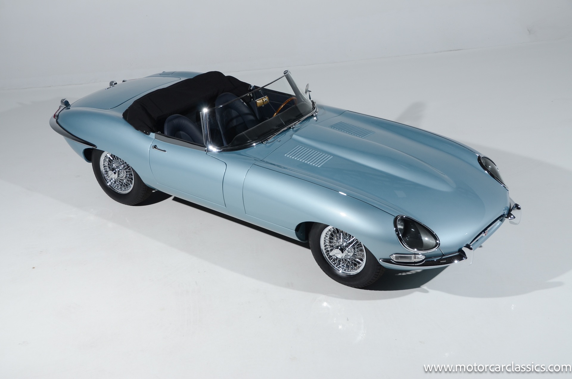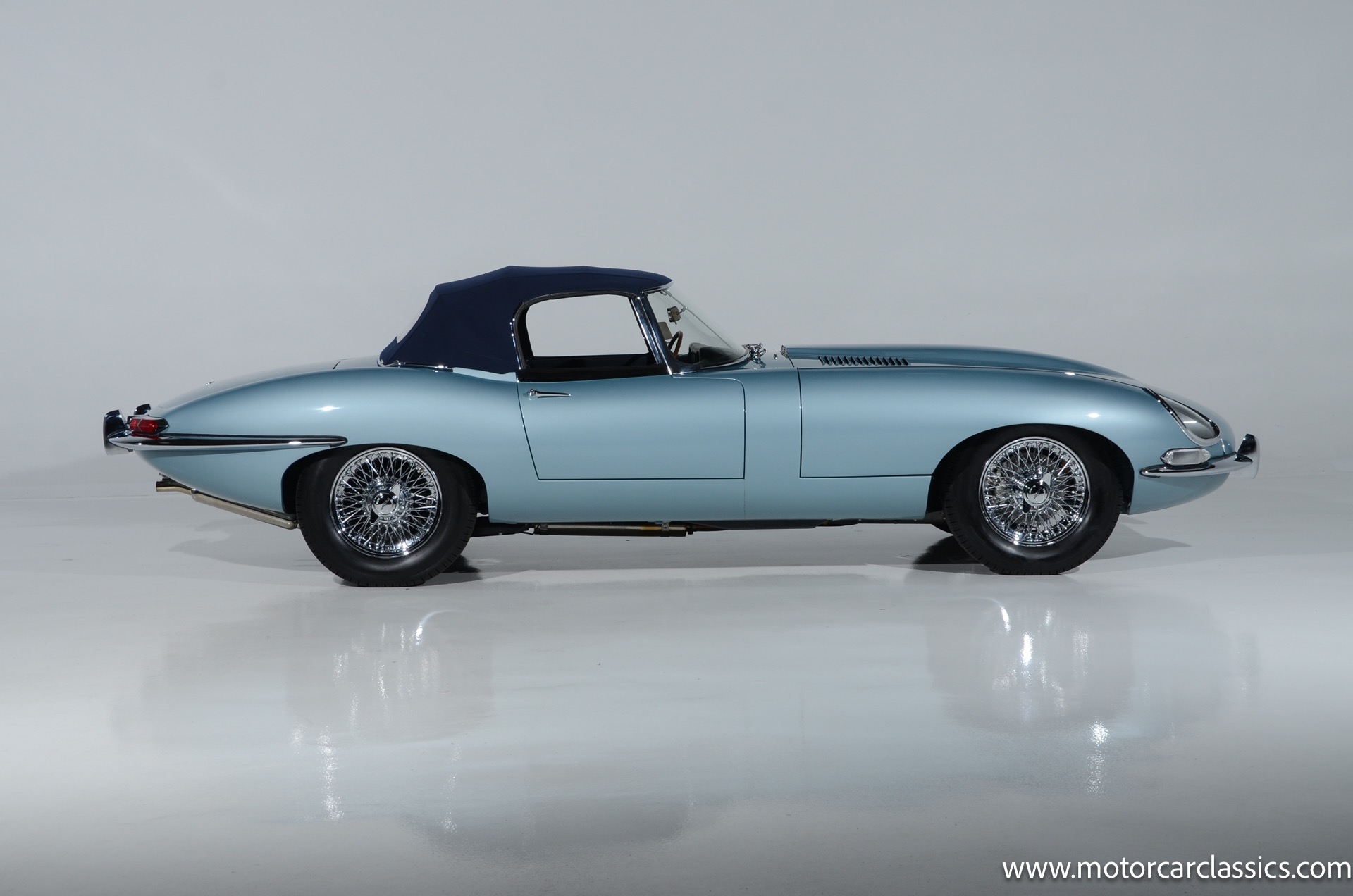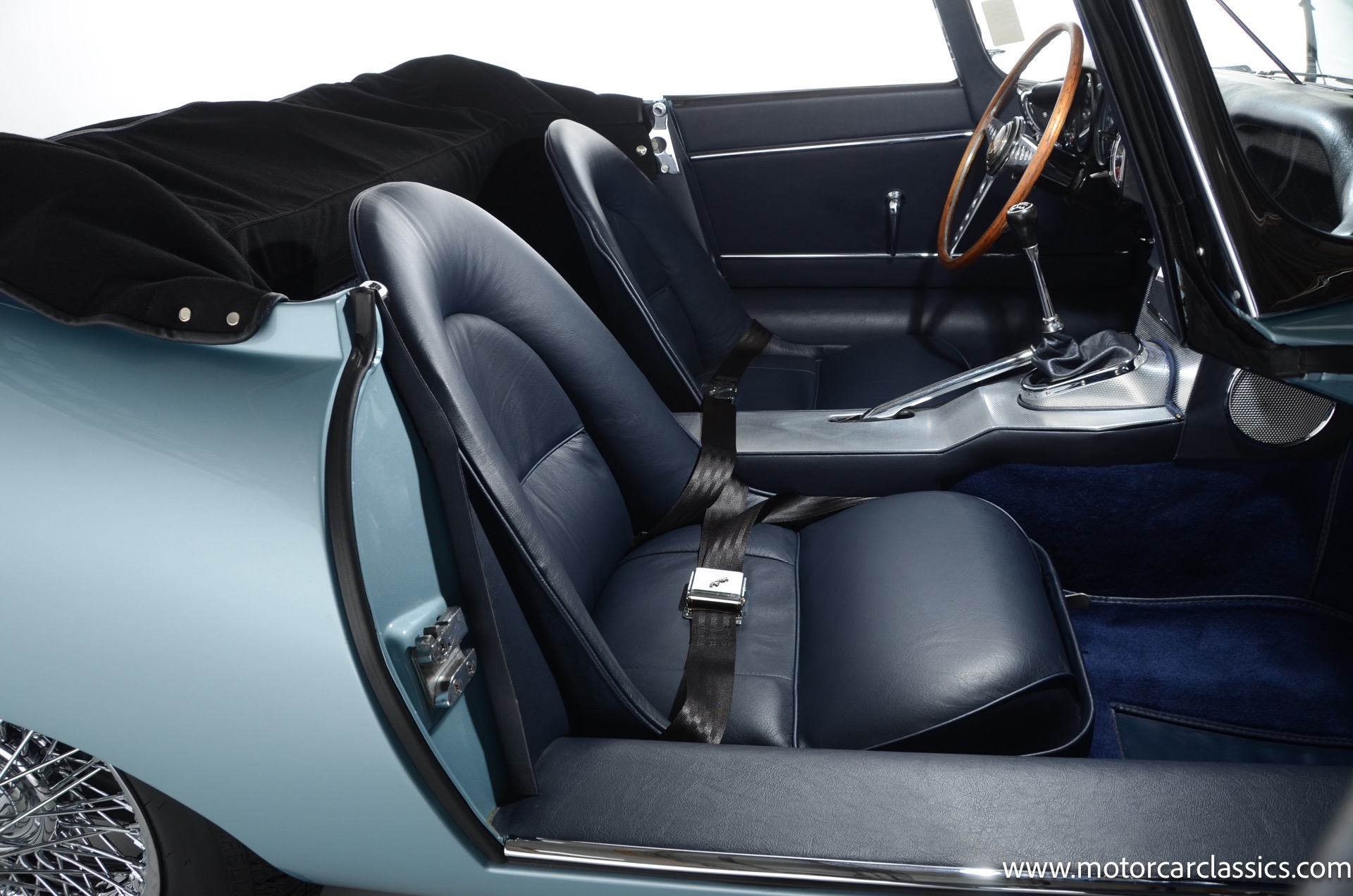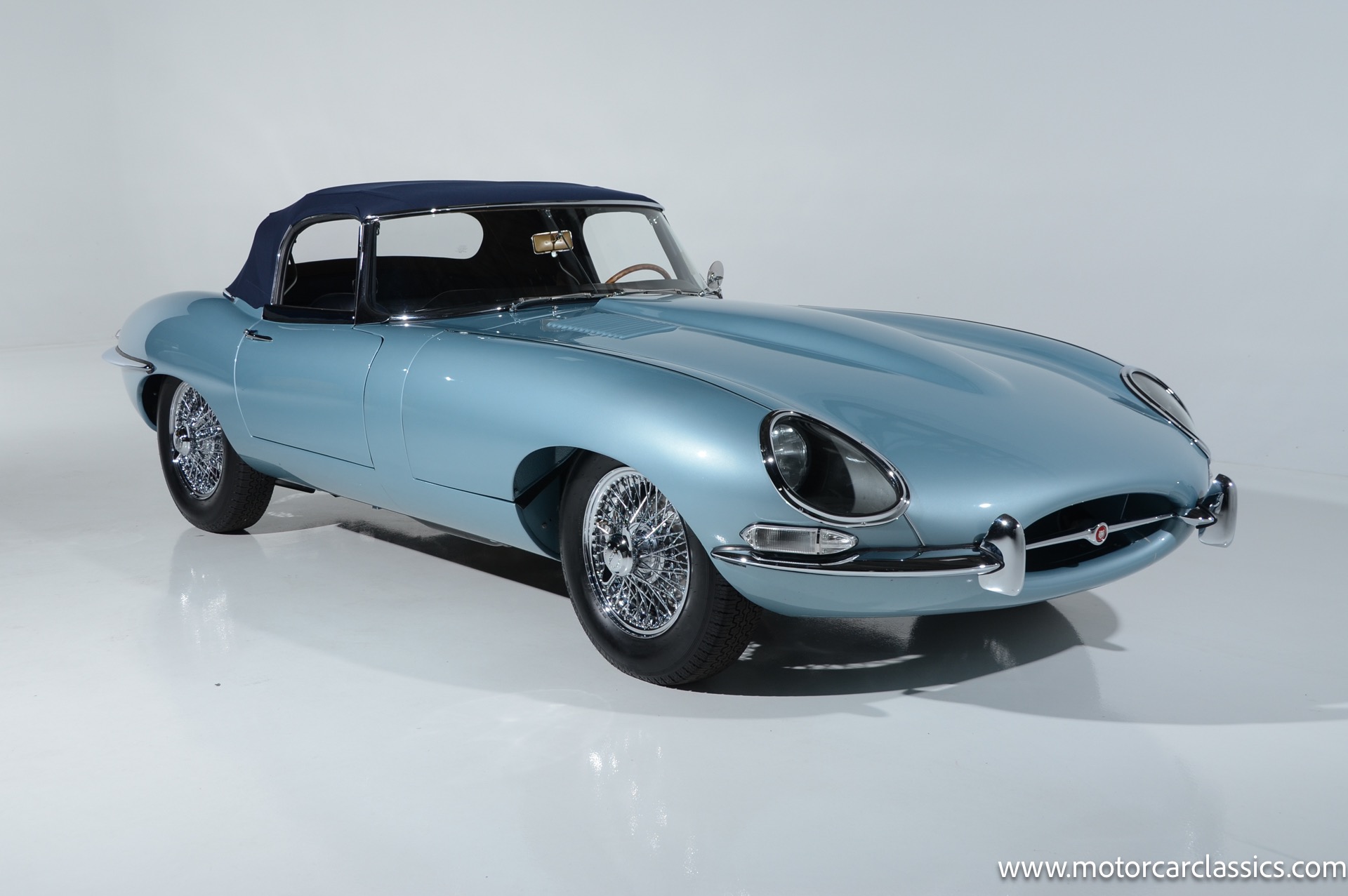 1962 Jaguar E-Type XKE for sale! 1962 Jaguar E Type for sale. Motorcar Classics is proud to present this world of classic elegance with this stunning 1962 Jaguar E-Type Roadster, presented in the exquisite hue of opalescent silver blue. This iconic sports car is not just a vehicle; it's a statement of style and performance, perfectly blending beauty with engineering excellence. The opalescent silver blue finish shimmers in the sunlight, showcasing the timeless design that has captivated car enthusiasts for decades. The sleek lines and aerodynamic shape are complemented by a dark blue interior, offering a luxurious and inviting atmosphere. The matching blue soft top adds a touch of sophistication while providing the option for open-air driving, making every journey a memorable experience.
