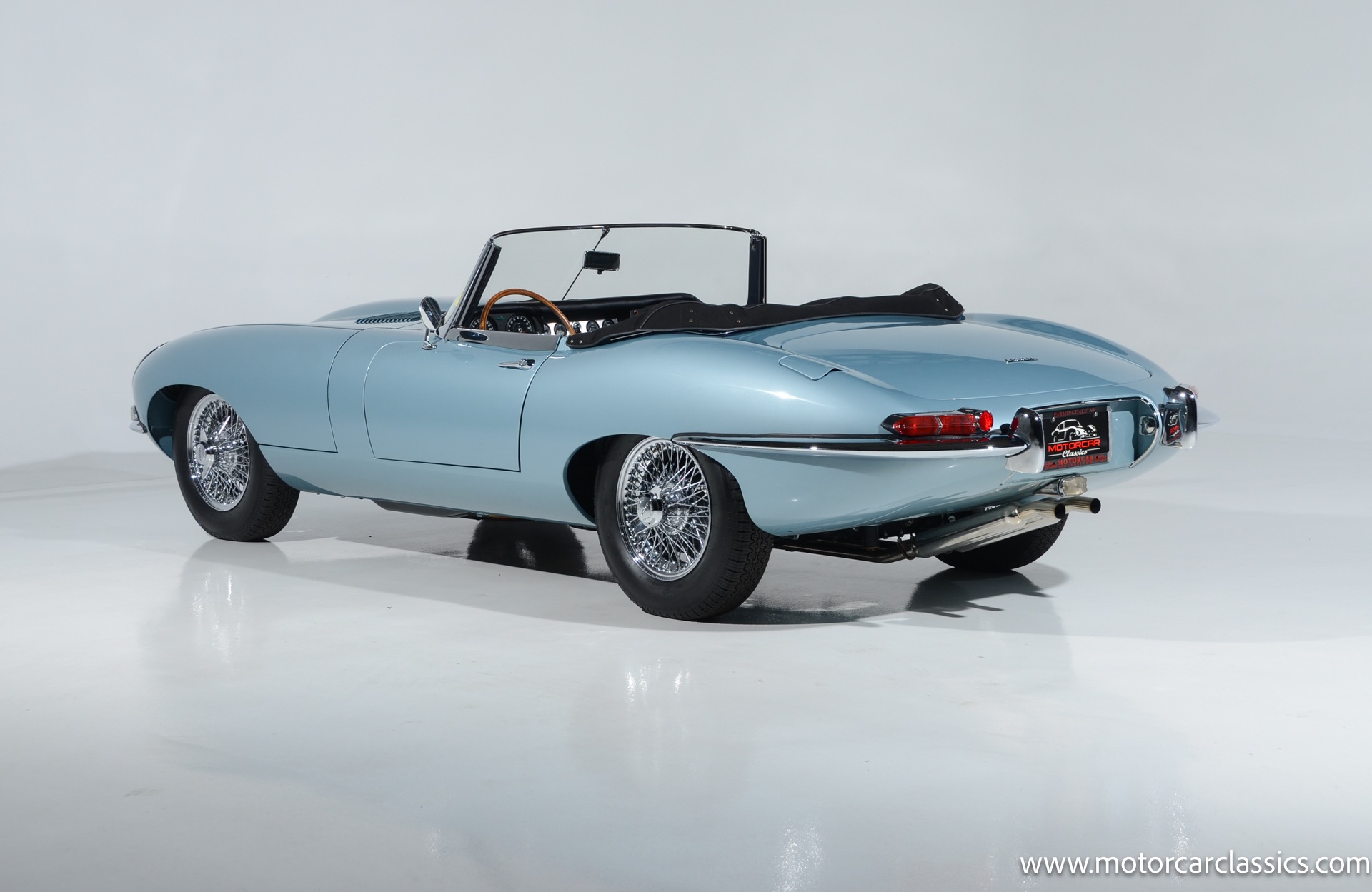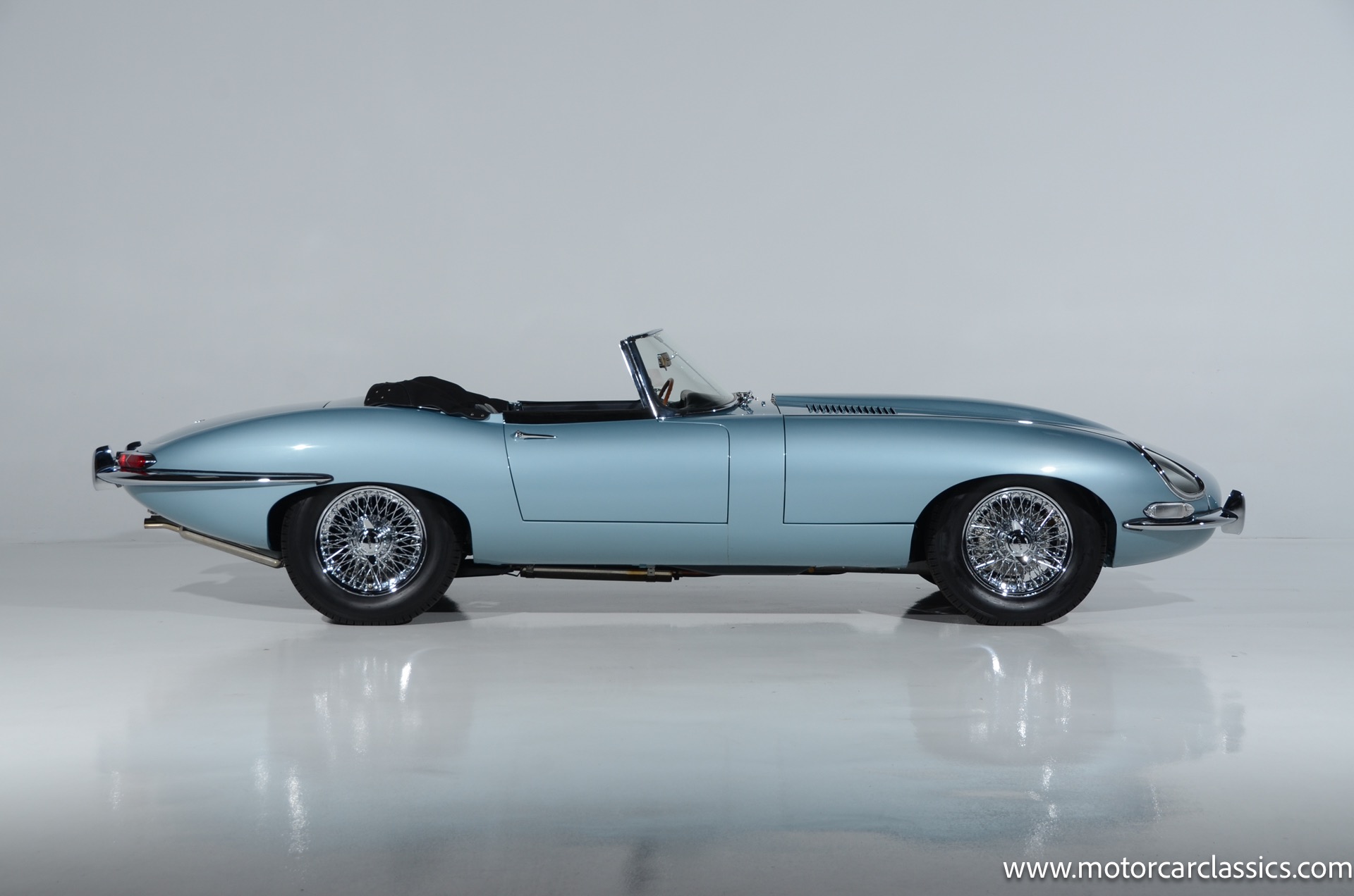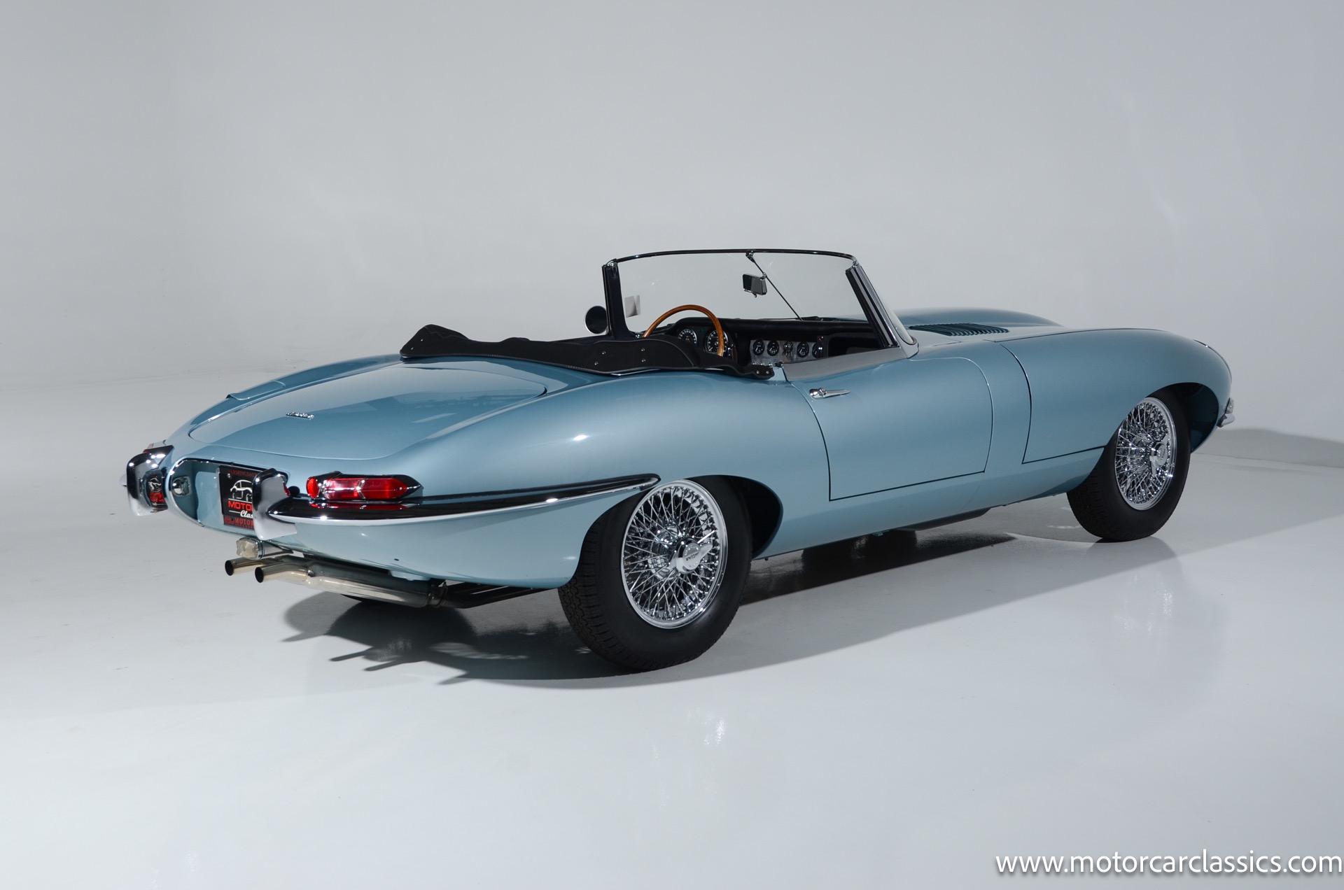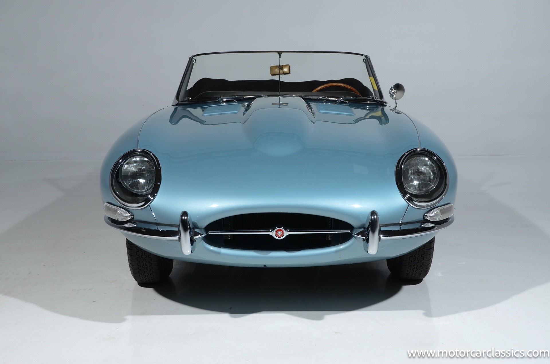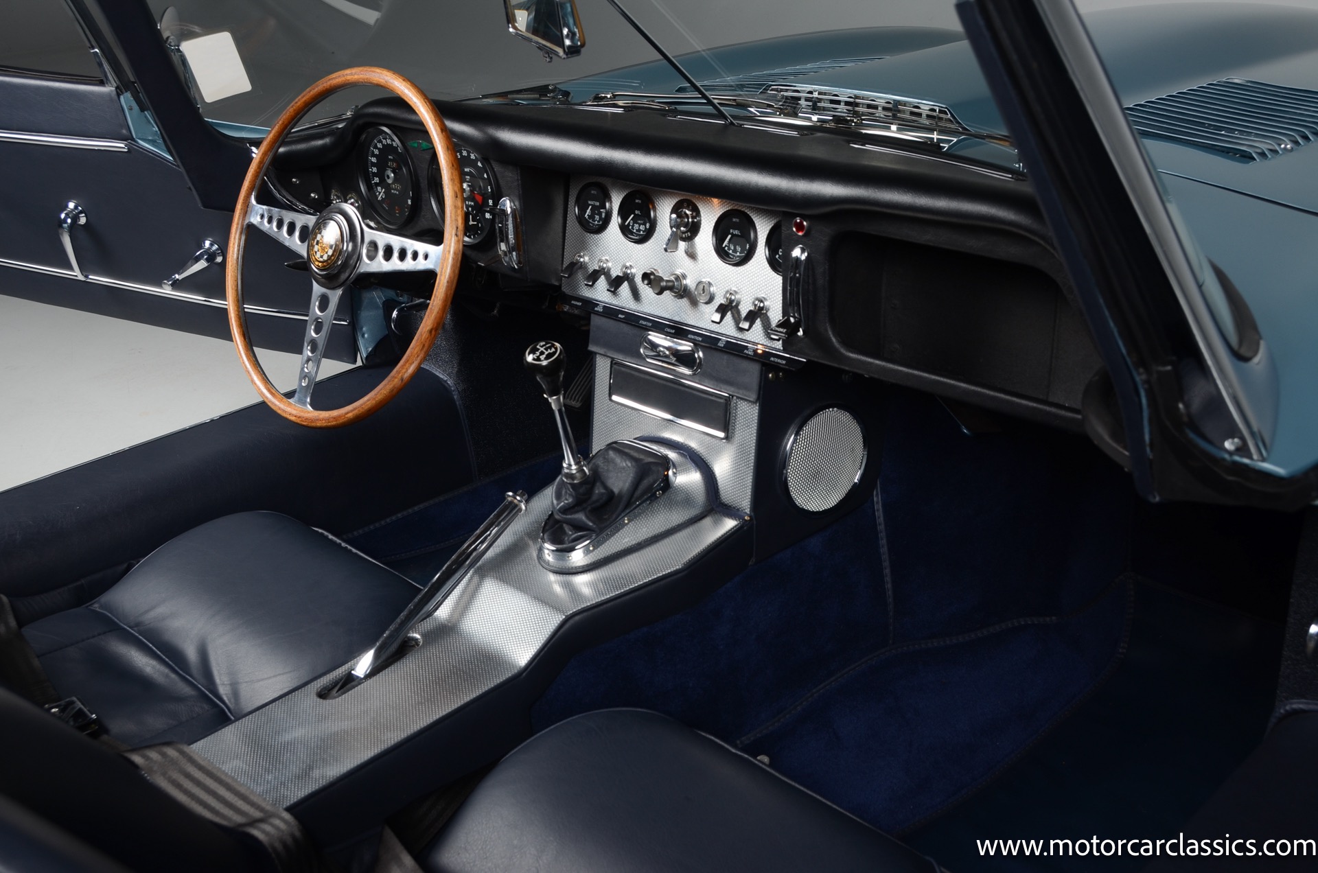 1962 Jaguar E-Type XKE for sale! 1962 Jaguar E Type for sale. Motorcar Classics is proud to present this world of classic elegance with this stunning 1962 Jaguar E-Type Roadster, presented in the exquisite hue of opalescent silver blue. This iconic sports car is not just a vehicle; it's a statement of style and performance, perfectly blending beauty with engineering excellence. The opalescent silver blue finish shimmers in the sunlight, showcasing the timeless design that has captivated car enthusiasts for decades. The sleek lines and aerodynamic shape are complemented by a dark blue interior, offering a luxurious and inviting atmosphere. The matching blue soft top adds a touch of sophistication while providing the option for open-air driving, making every journey a memorable experience.