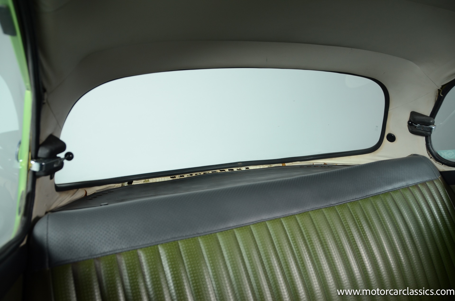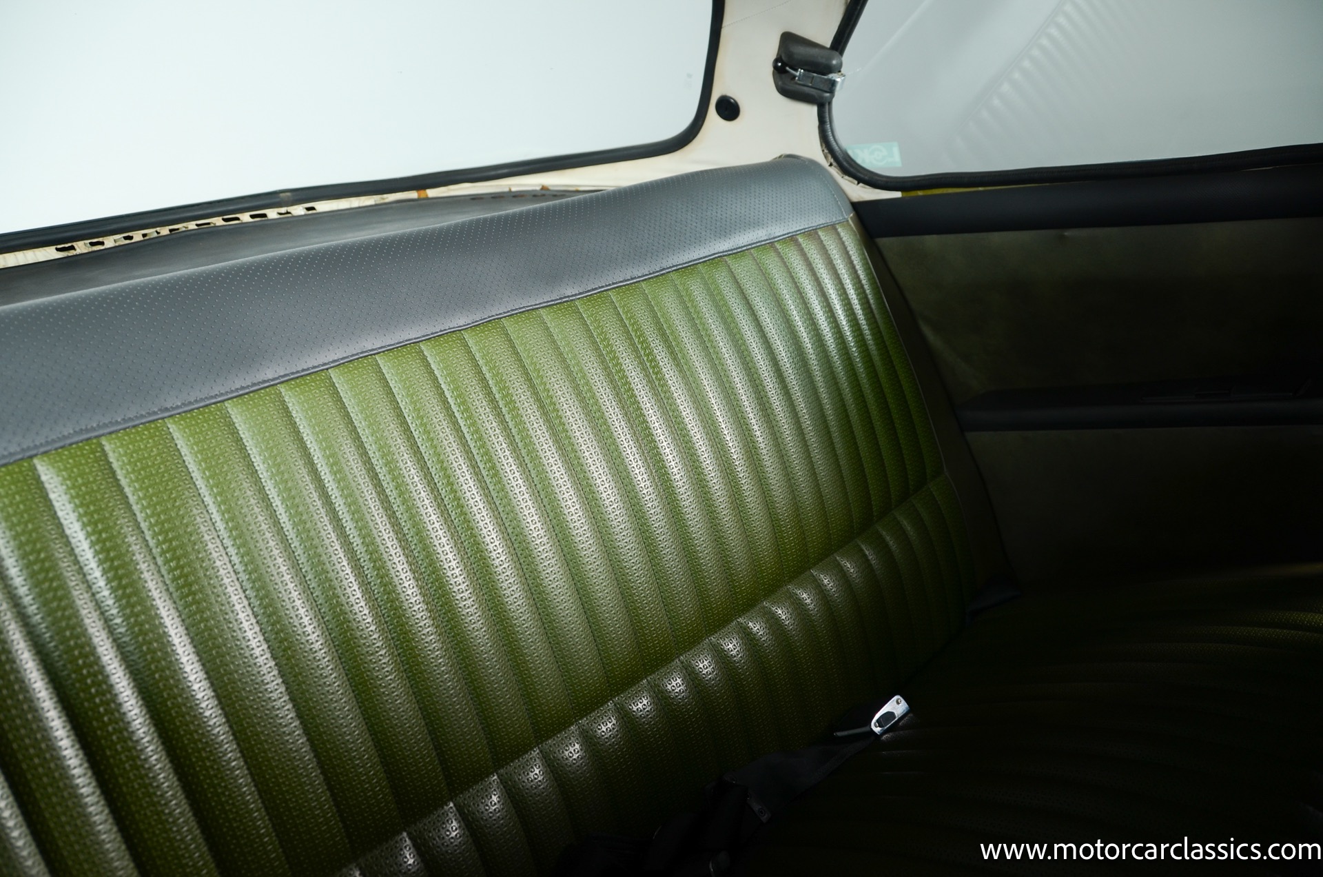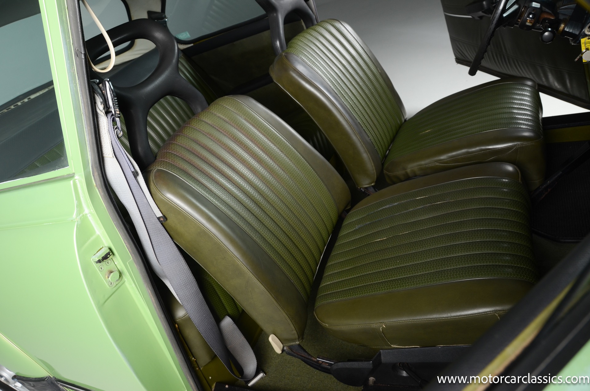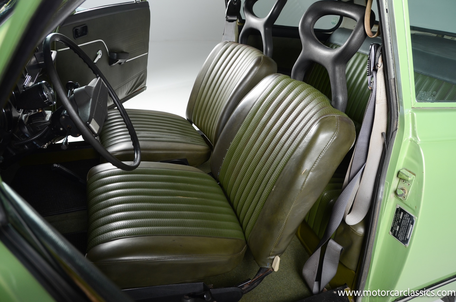 The silver-finished 15inch alloy wheels were added under last ownership, and they are mounted with 165/60 Nexen tires with approximately 1,600 miles. The front bucket seats and the rear bench are upholstered in green vinyl. Sound-deadening insulation has been installed below the green carpeting, and amenities include a heated driver?s-side seat, a lockable glovebox, and crank-operated windows. Cracks are present on the lower front seat cushions. and imperfections in the dash vinyl near the glove box