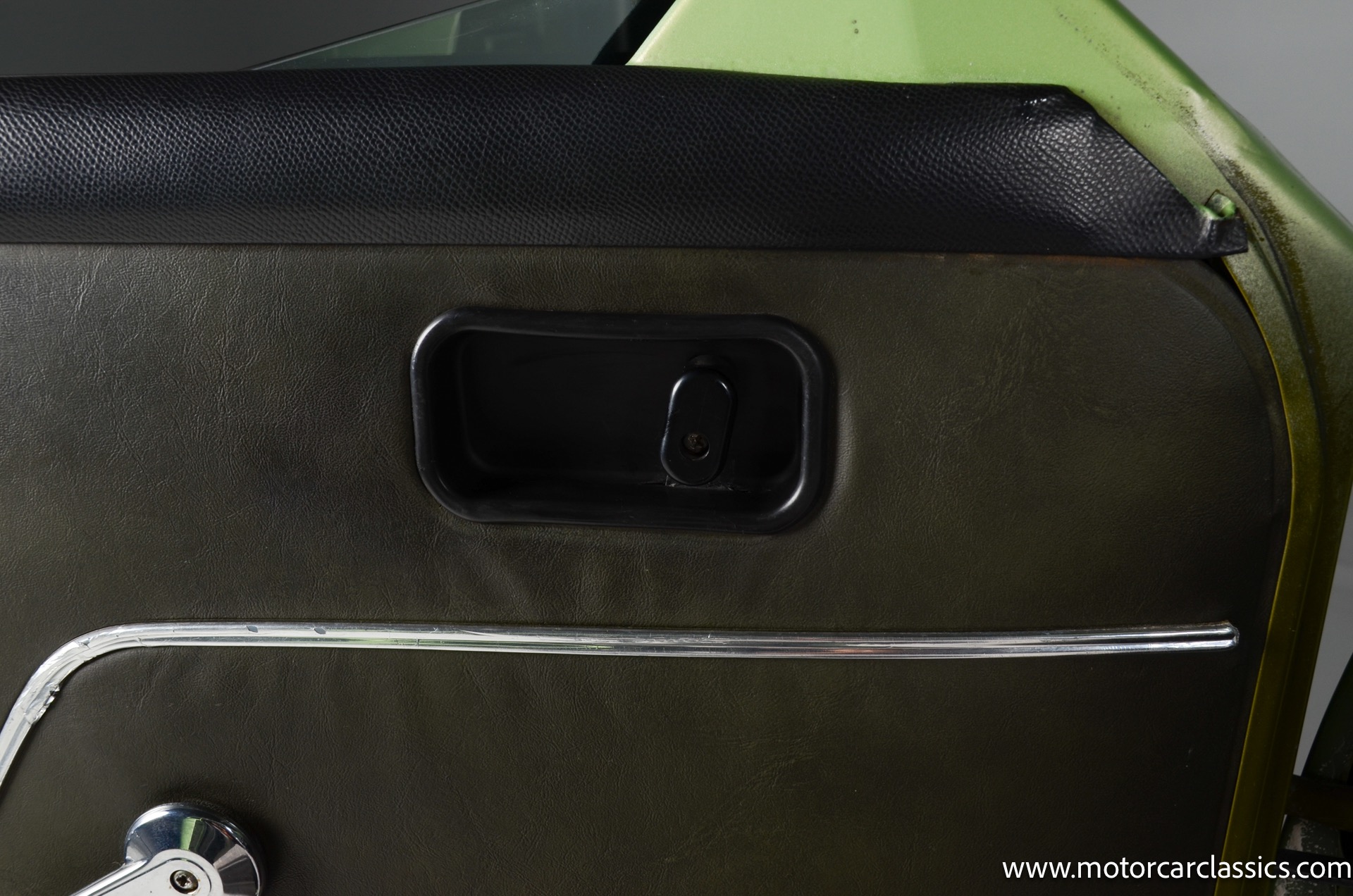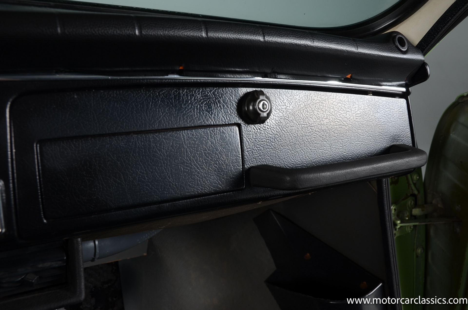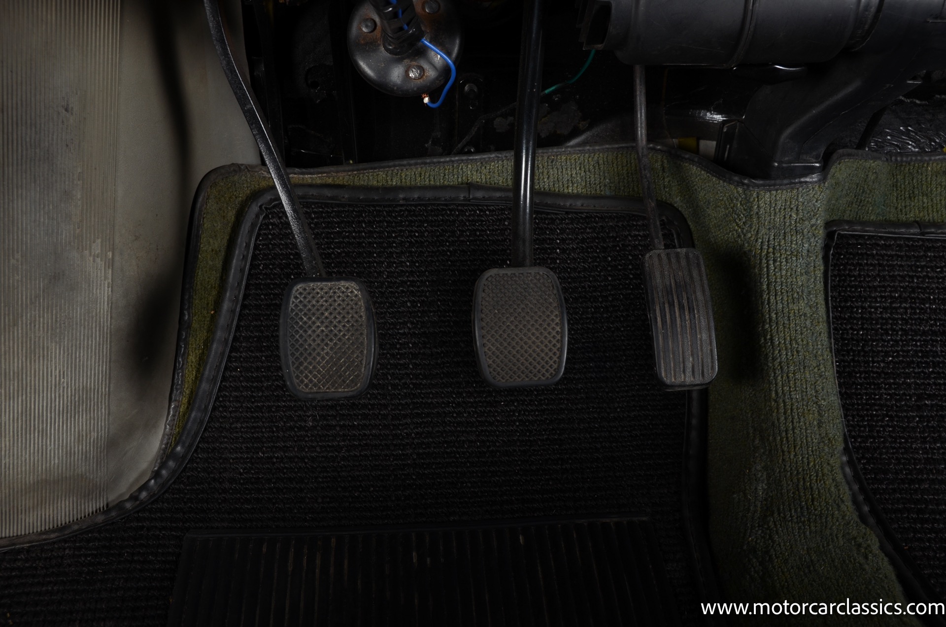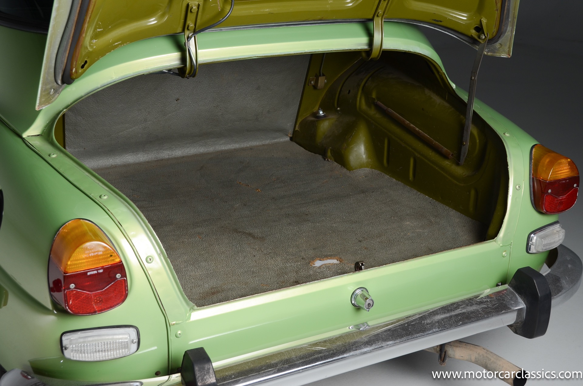 The silver-finished 15inch alloy wheels were added under last ownership, and they are mounted with 165/60 Nexen tires with approximately 1,600 miles. The front bucket seats and the rear bench are upholstered in green vinyl. Sound-deadening insulation has been installed below the green carpeting, and amenities include a heated driver?s-side seat, a lockable glovebox, and crank-operated windows. Cracks are present on the lower front seat cushions. and imperfections in the dash vinyl near the glove box