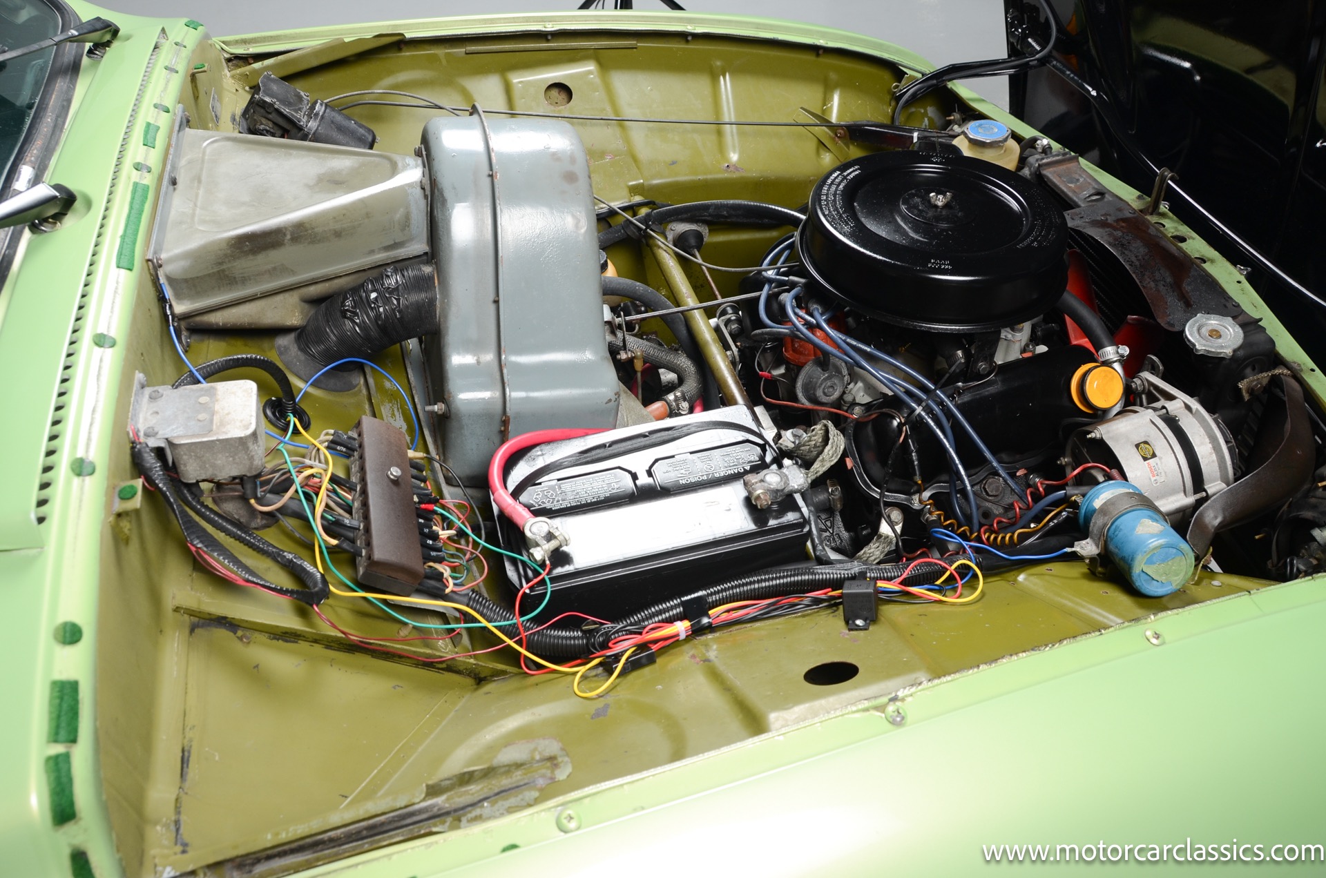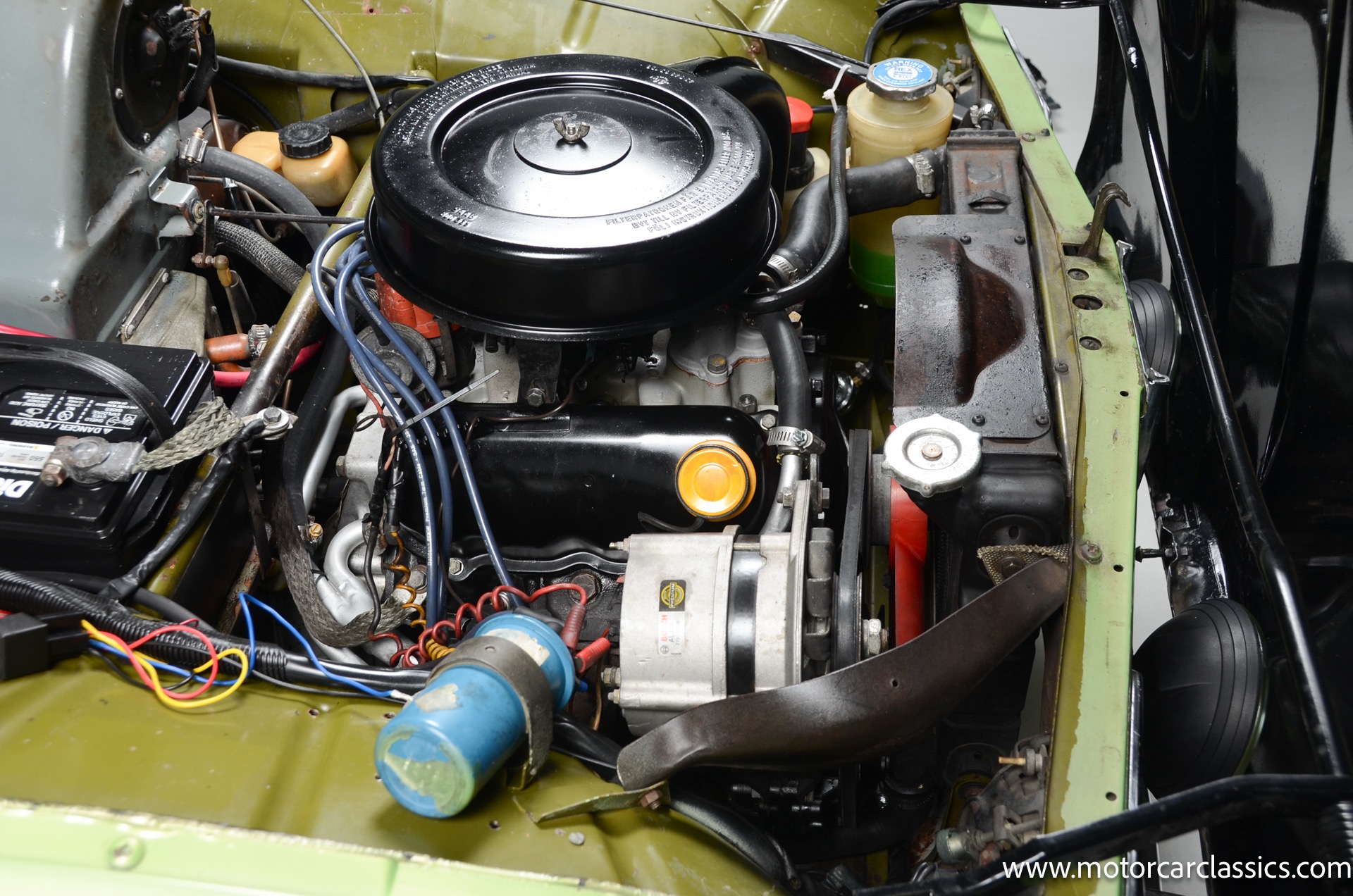 The two-spoke steering wheel is joined by a column-mounted shifter and VDO 8k-rpm tachometer, while instrumentation just ahead consists of a 100-mph speedometer and a combination gauge for coolant temperature and fuel level. The engine is equipped with Pertonix electronic ignition and a Weber carburetor. Power is sent to the front wheels through a four-speed manual transaxle with a freewheel. An aftermarket exhaust was installed under prior ownership. Your inspection is invited!