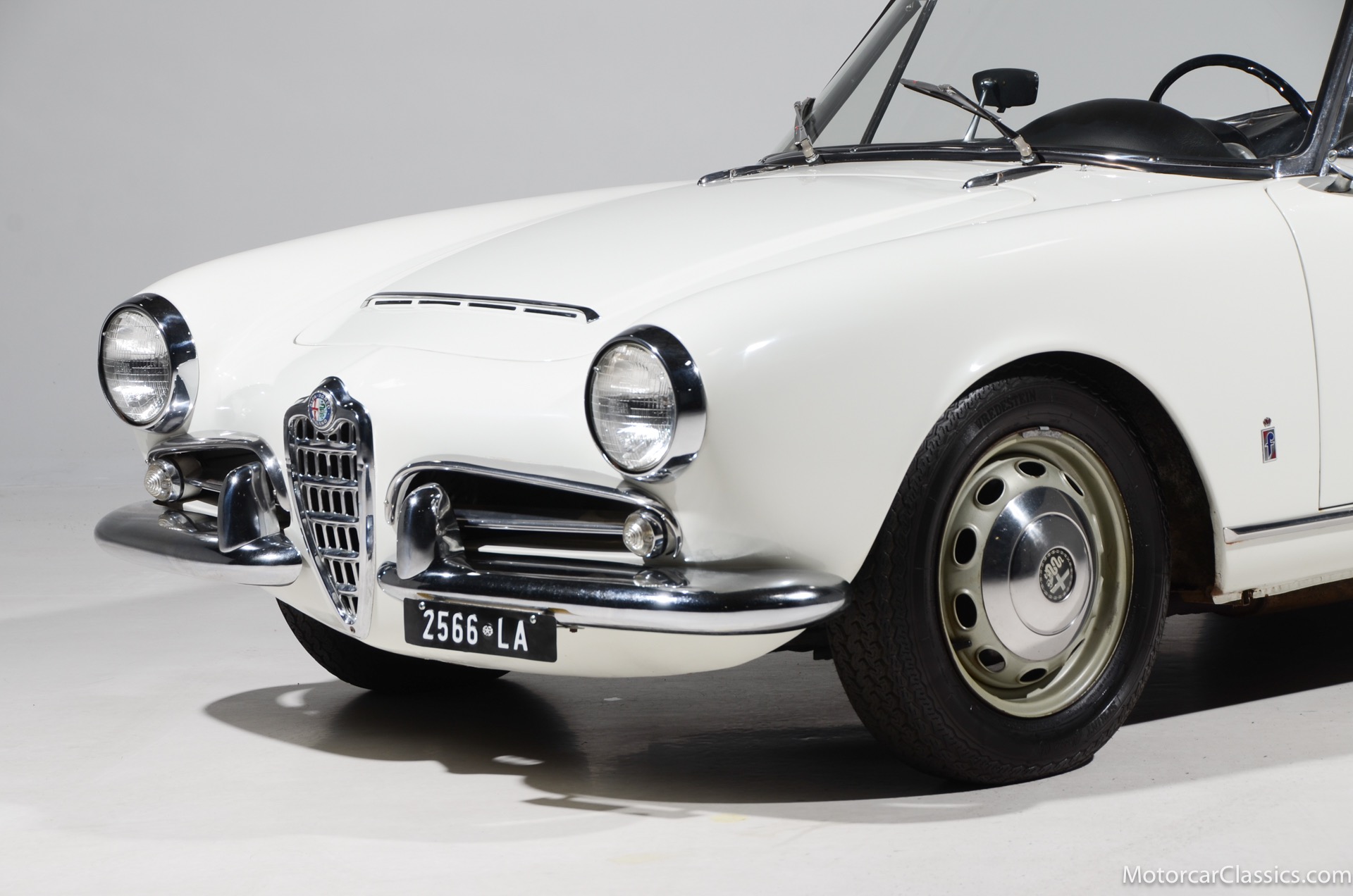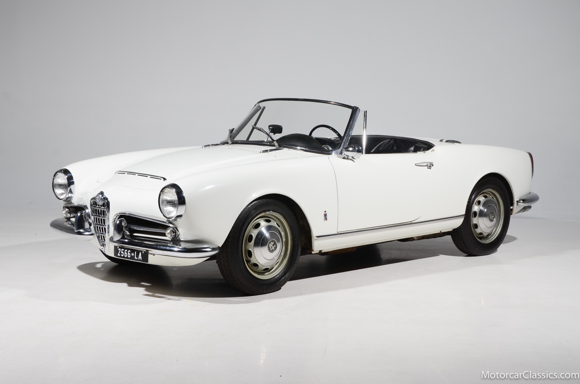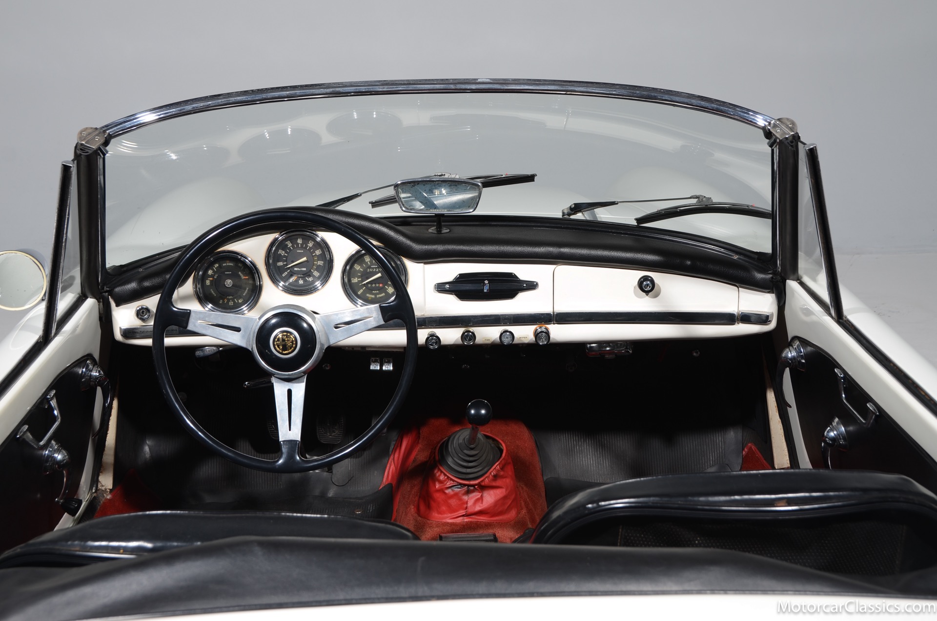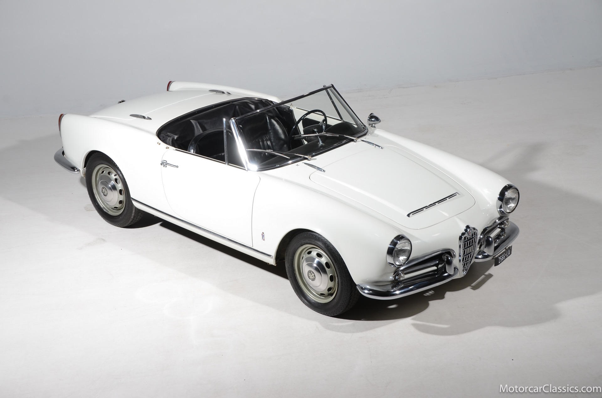 1964 Alfa Romeo Giulia 1600 Spider for sale! Motorcar Classics is proud to present this very original 1964 Alfa Romeo Giulia 1600 Spider. Finished in Correct Bianca White. The interior has correct Black leatherette seats with original Red carpets and Black convertible top.Vin number- 379673. The factory original 1600CC DOHC motor has the correct Solex carburetor and is mated to the 5 speed manual gearbox. The car is mechanically well-sorted. This is an older restoration, from about 25 years ago on a clean and rust free body. Vredestein 165/15 tires on all four wheels.It was ordered radio delete The car shows 30,320 miles. It has been owned by an experienced collector the past ten years, and we sold it to him out of another prominent collection where it resided over two decades.