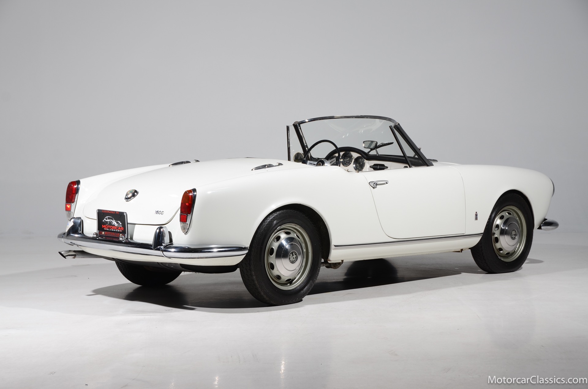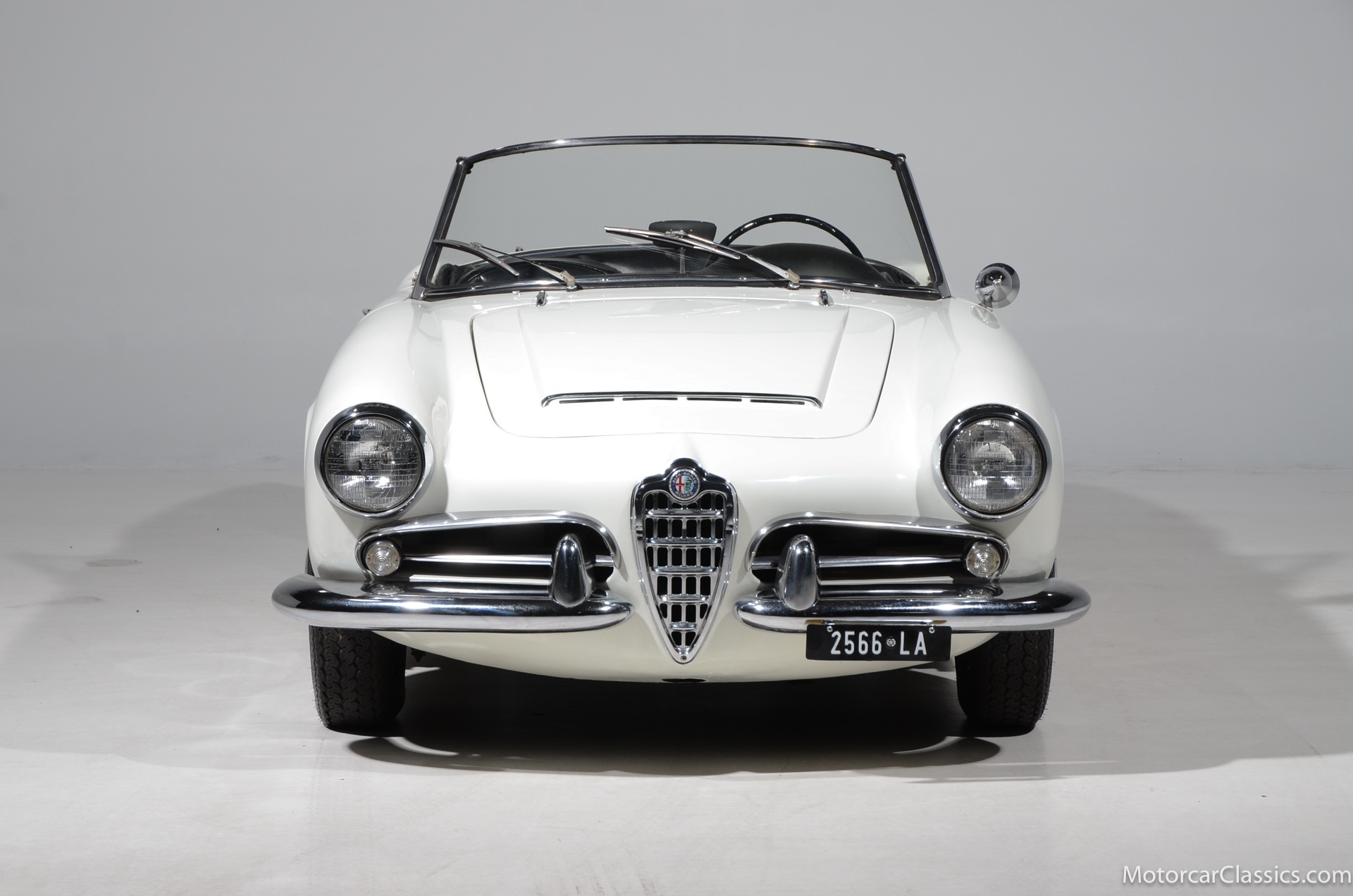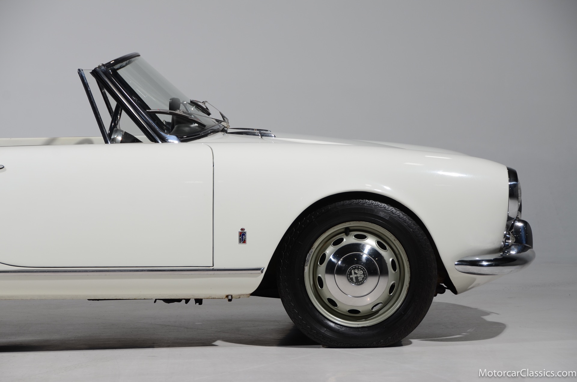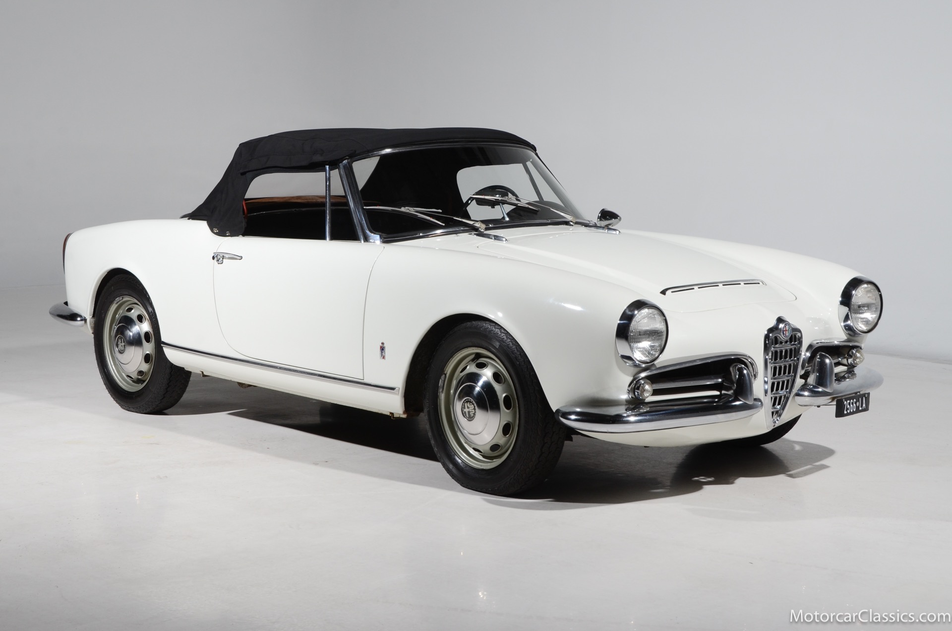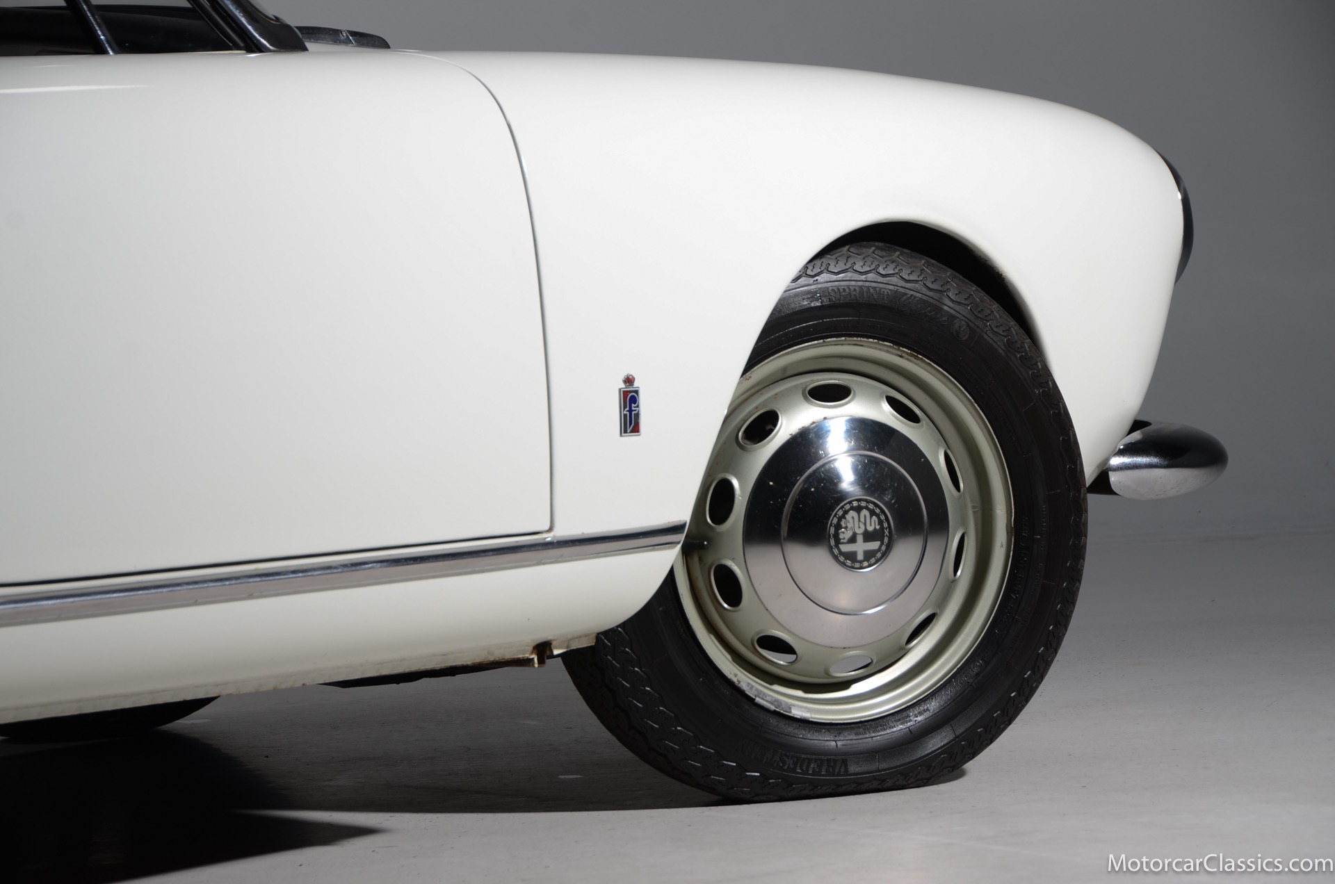 1964 Alfa Romeo Giulia 1600 Spider for sale! Motorcar Classics is proud to present this very original 1964 Alfa Romeo Giulia 1600 Spider. Finished in Correct Bianca White. The interior has correct Black leatherette seats with original Red carpets and Black convertible top.Vin number- 379673. The factory original 1600CC DOHC motor has the correct Solex carburetor and is mated to the 5 speed manual gearbox. The car is mechanically well-sorted. This is an older restoration, from about 25 years ago on a clean and rust free body. Vredestein 165/15 tires on all four wheels.It was ordered radio delete The car shows 30,320 miles. It has been owned by an experienced collector the past ten years, and we sold it to him out of another prominent collection where it resided over two decades.