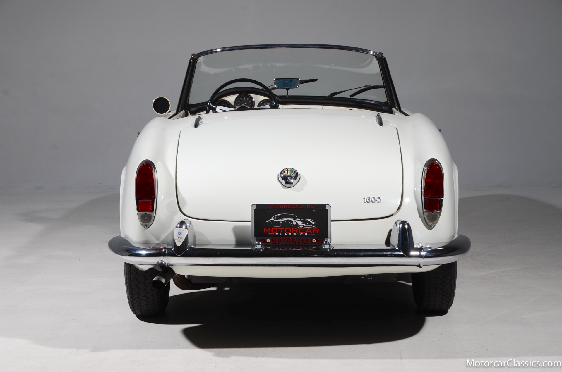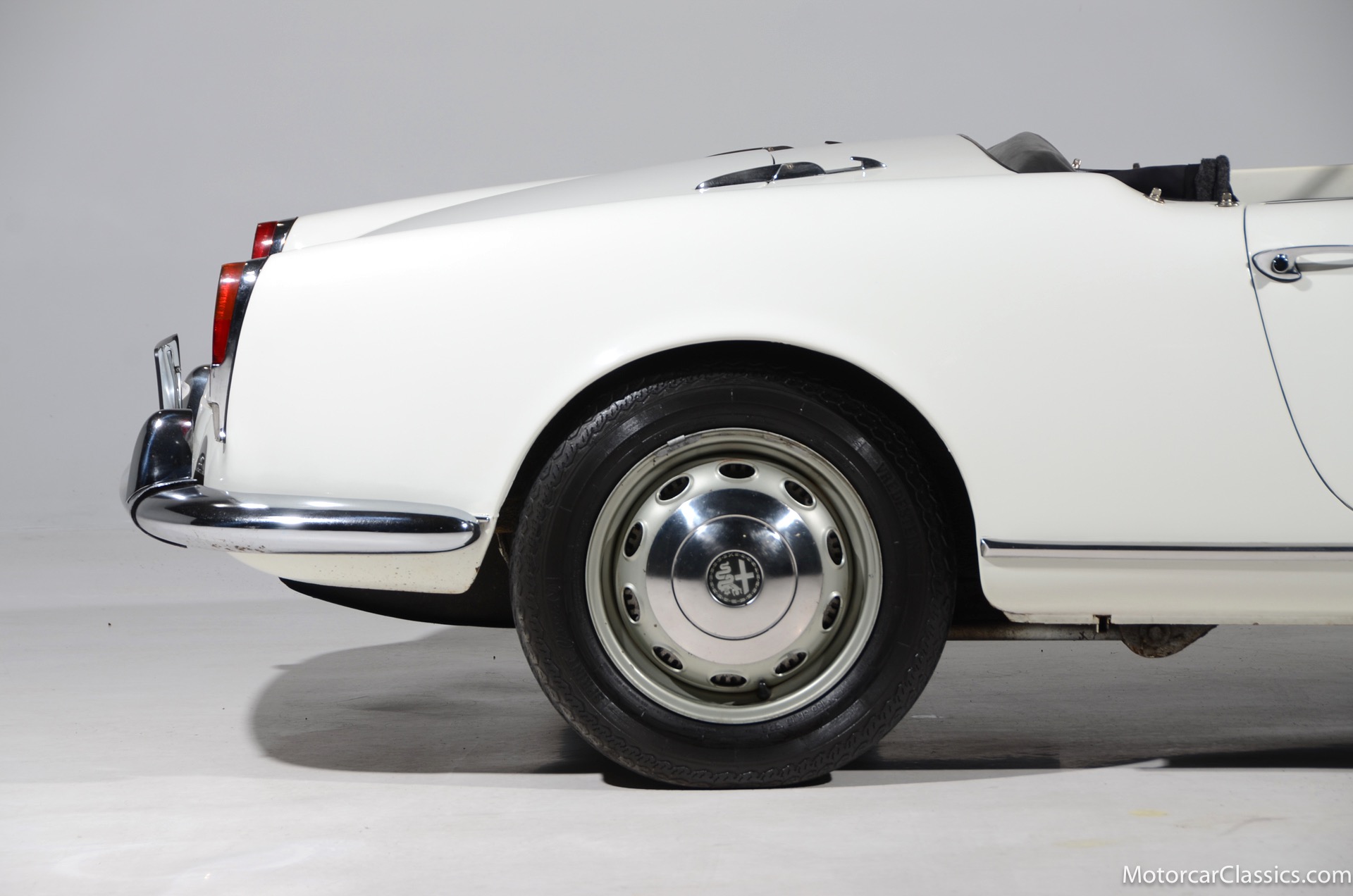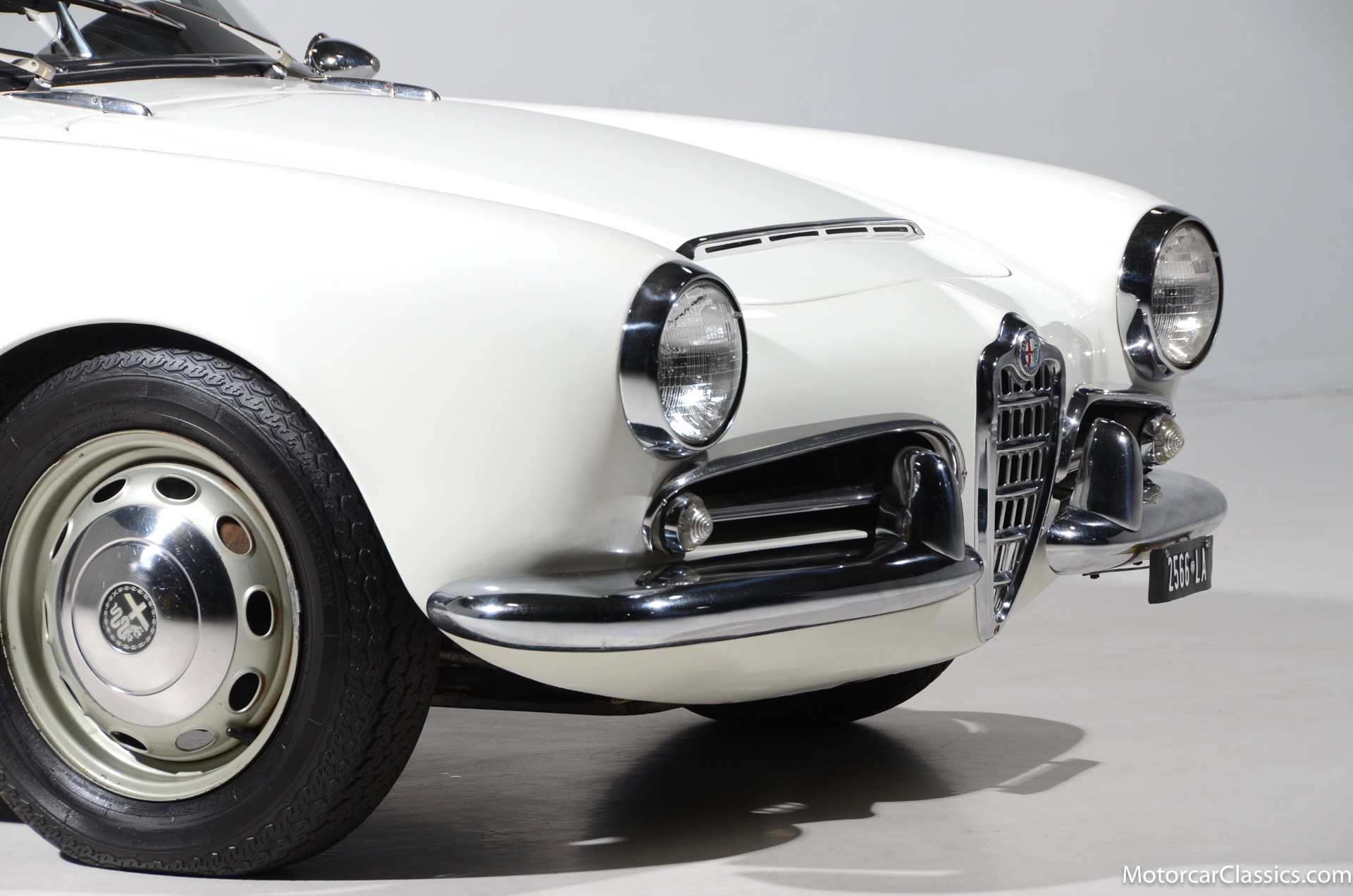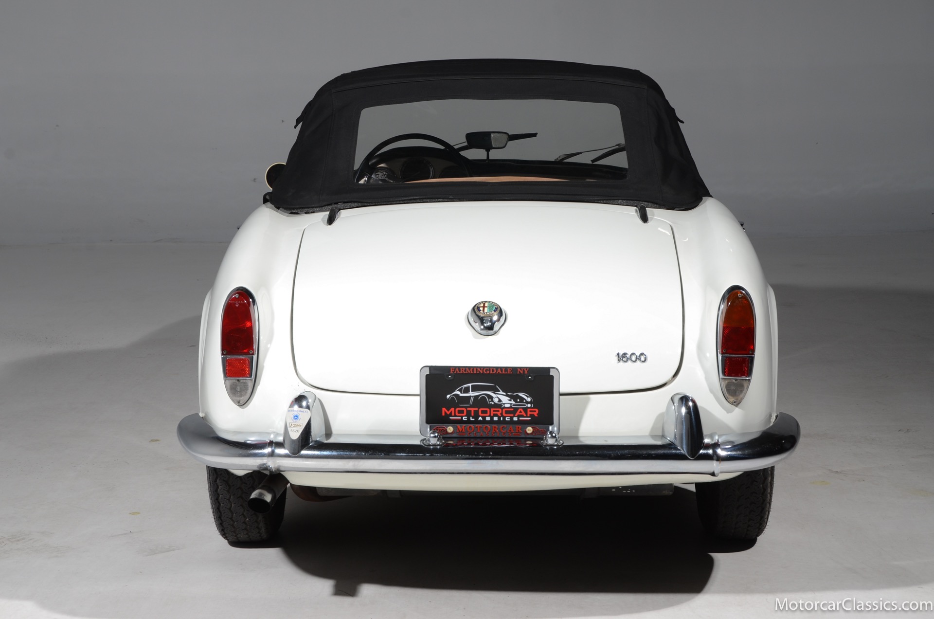 1964 Alfa Romeo Giulia 1600 Spider for sale! Motorcar Classics is proud to present this very original 1964 Alfa Romeo Giulia 1600 Spider. Finished in Correct Bianca White. The interior has correct Black leatherette seats with original Red carpets and Black convertible top.Vin number- 379673. The factory original 1600CC DOHC motor has the correct Solex carburetor and is mated to the 5 speed manual gearbox. The car is mechanically well-sorted. This is an older restoration, from about 25 years ago on a clean and rust free body. Vredestein 165/15 tires on all four wheels.It was ordered radio delete The car shows 30,320 miles. It has been owned by an experienced collector the past ten years, and we sold it to him out of another prominent collection where it resided over two decades.