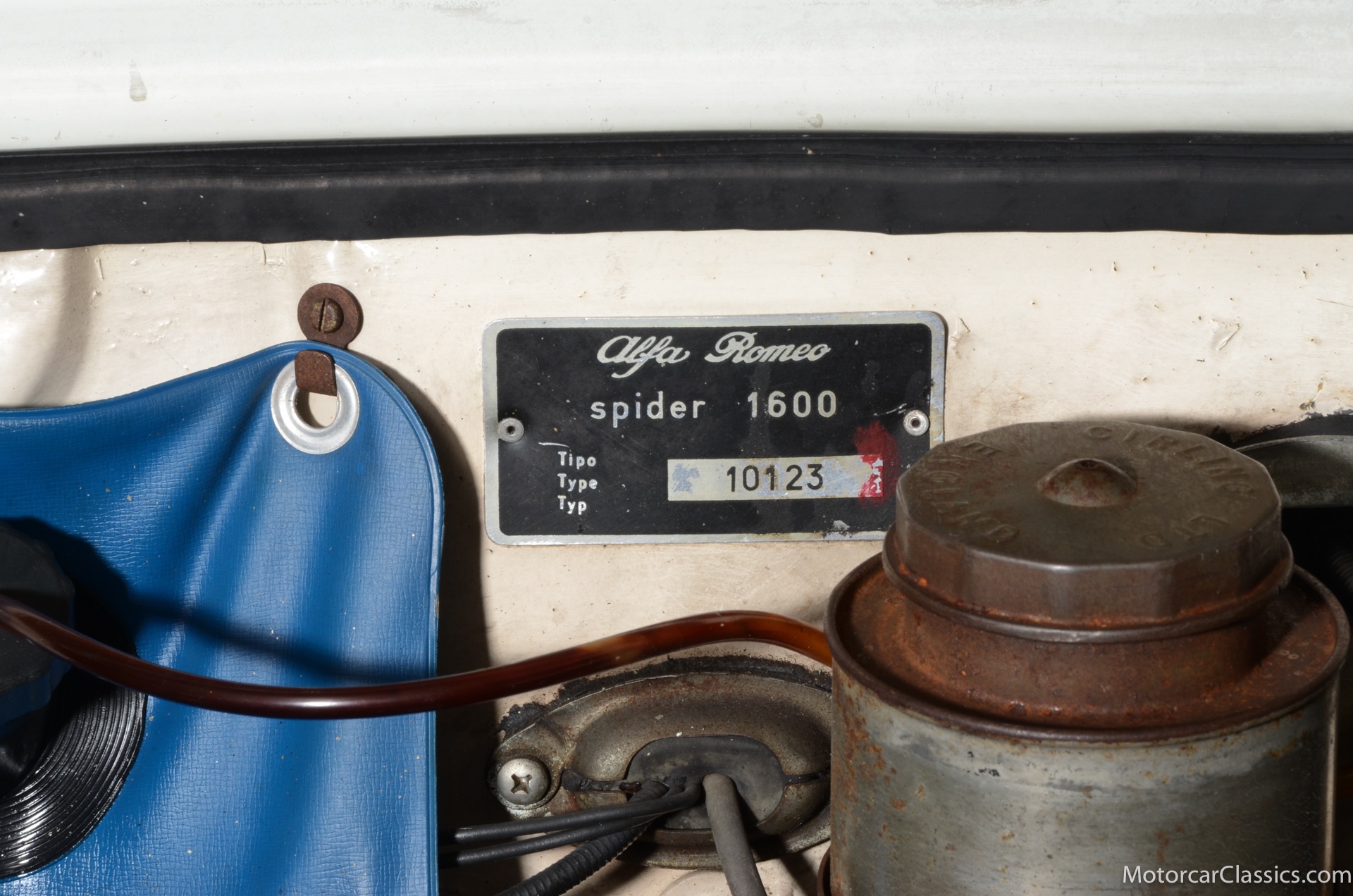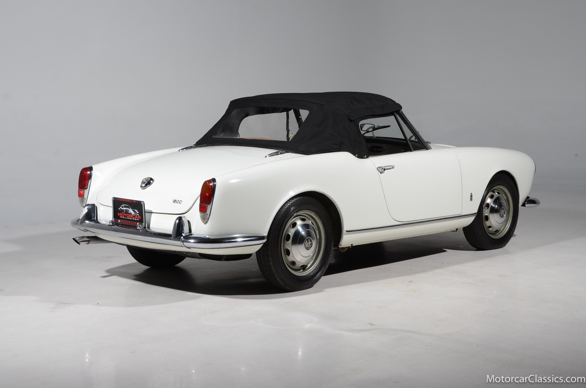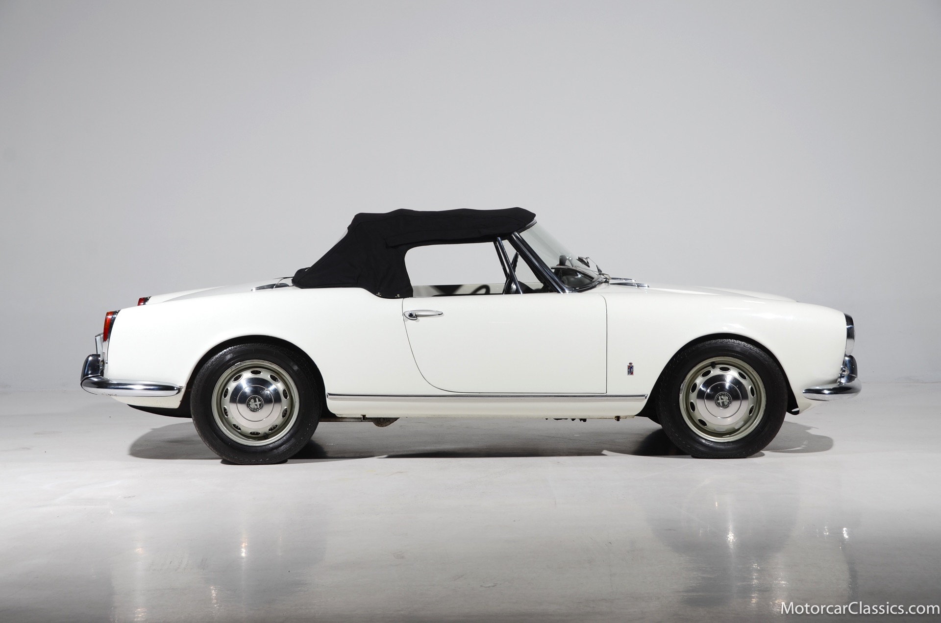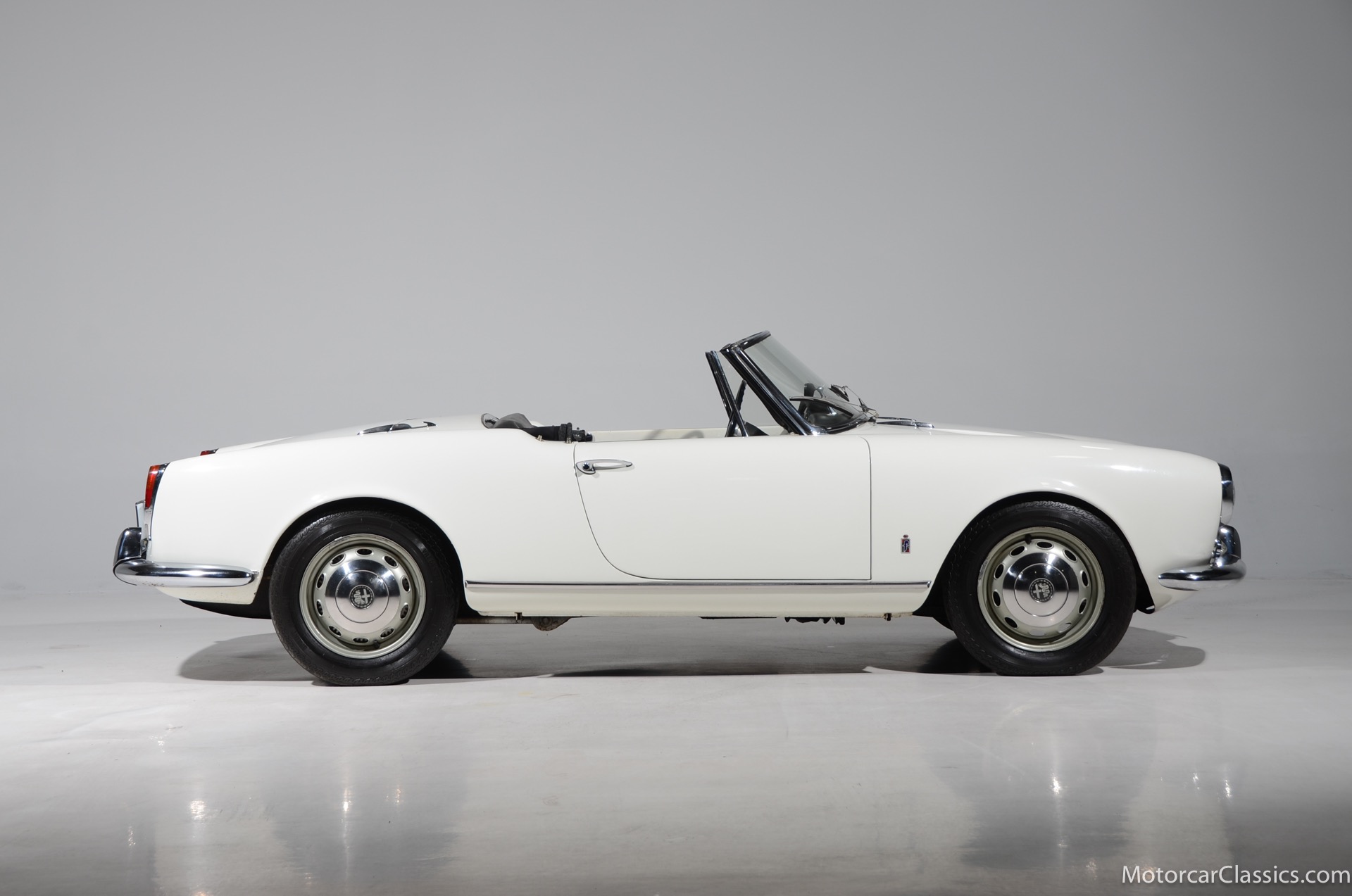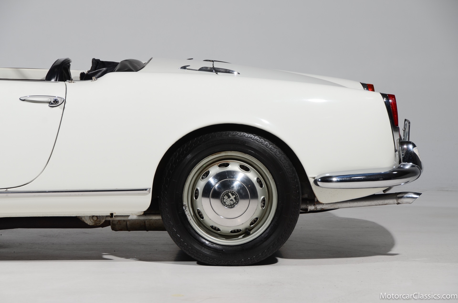1964 Alfa Romeo Giulia 1600 Spider for sale! Motorcar Classics is proud to present this very original 1964 Alfa Romeo Giulia 1600 Spider. Finished in Correct Bianca White. The interior has correct Black leatherette seats with original Red carpets and Black convertible top.Vin number- 379673. The factory original 1600CC DOHC motor has the correct Solex carburetor and is mated to the 5 speed manual gearbox. The car is mechanically well-sorted. This is an older restoration, from about 25 years ago on a clean and rust free body. Vredestein 165/15 tires on all four wheels.It was ordered radio delete The car shows 30,320 miles. It has been owned by an experienced collector the past ten years, and we sold it to him out of another prominent collection where it resided over two decades.