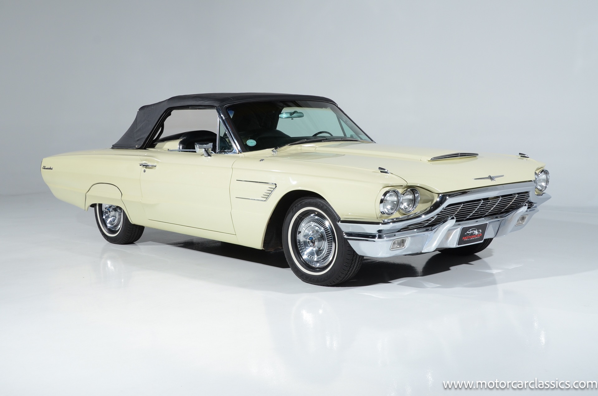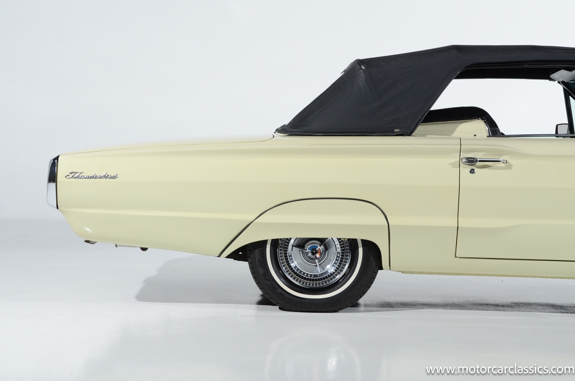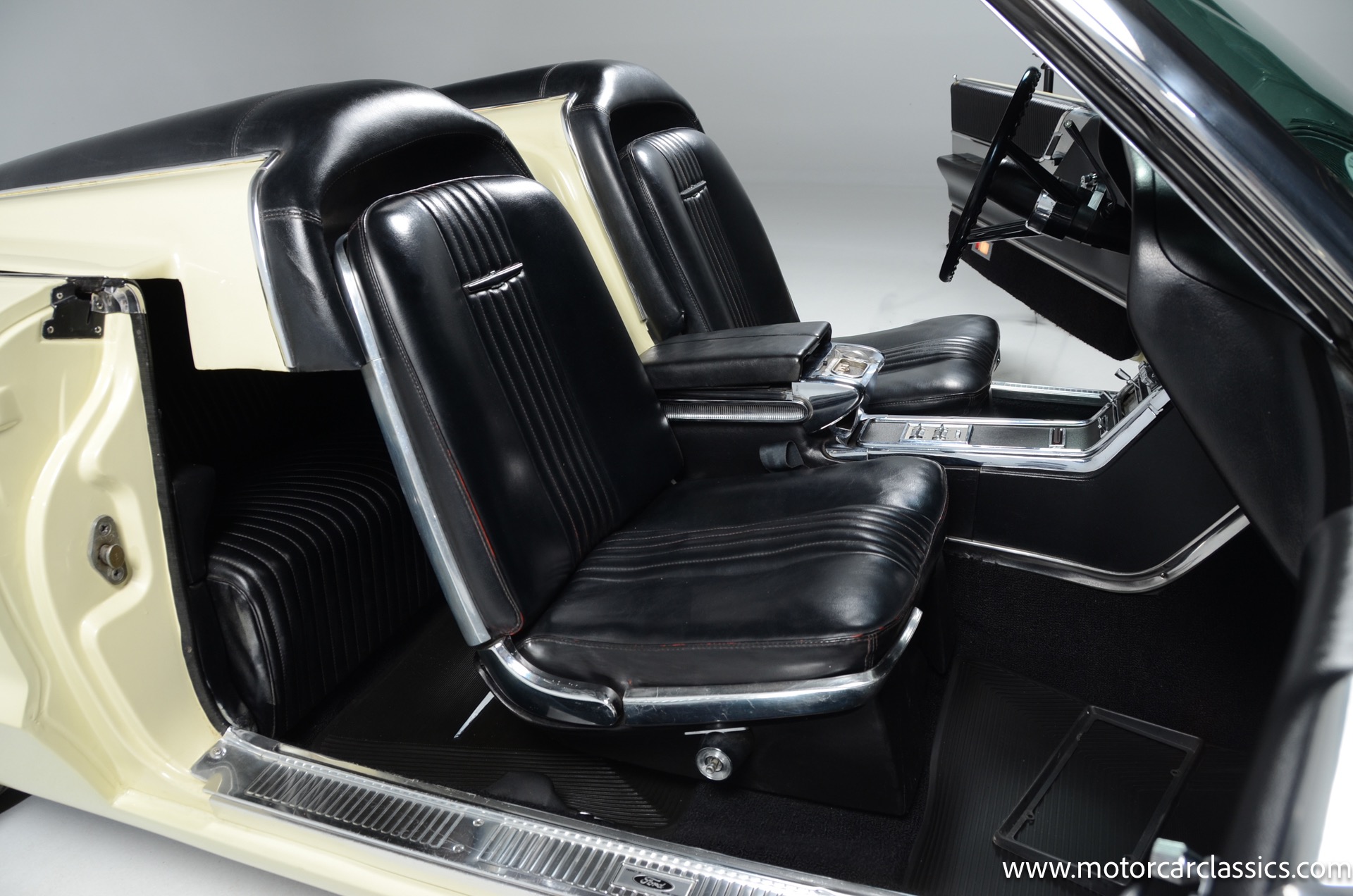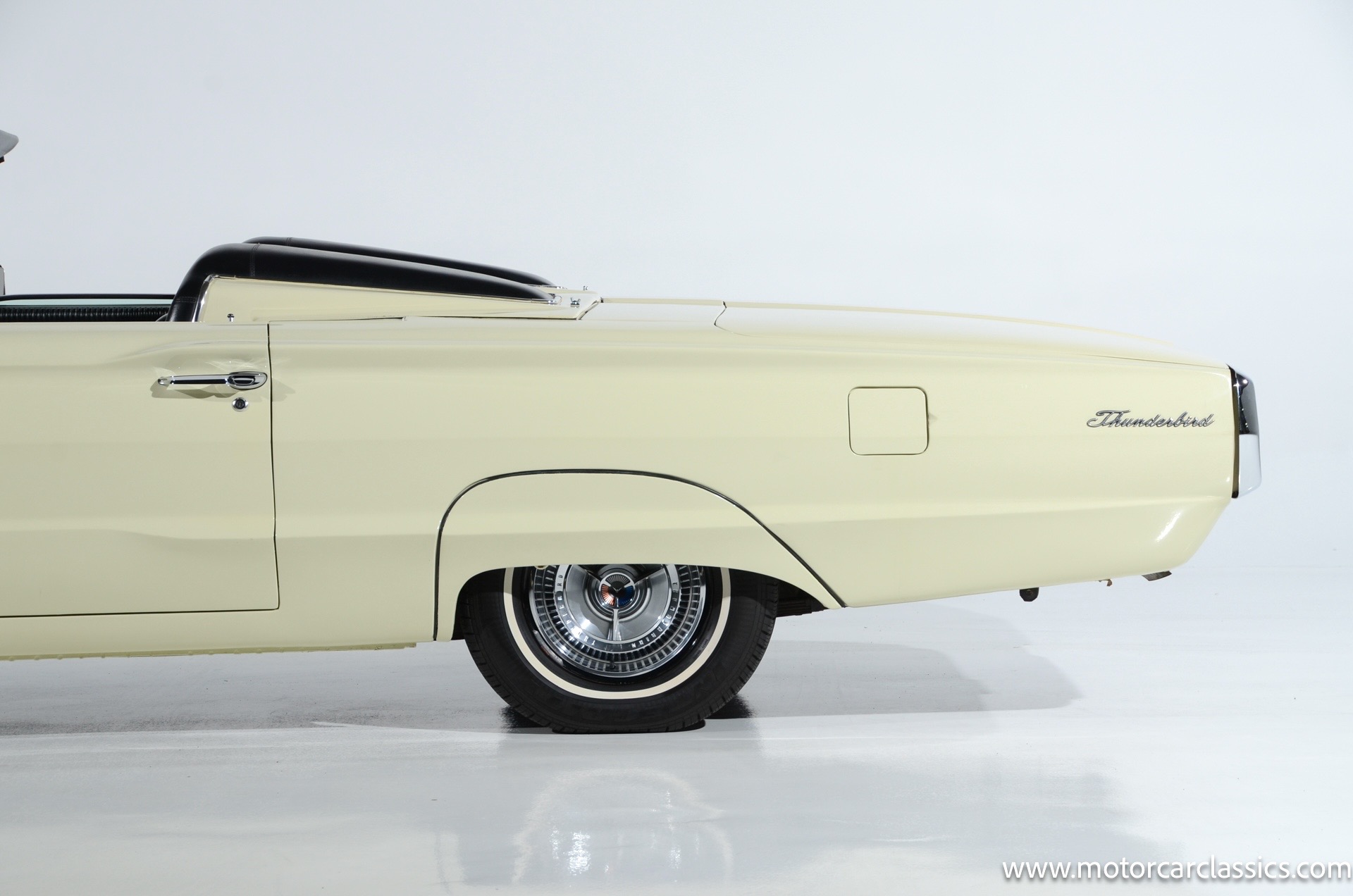 1965 Ford Thunderbird for sale! Motorcar classics is pleased to present a classic blend of American power and luxury - the 1965 Ford Thunderbird Convertible. This iconic machine is finished in a sophisticated pastel yellow exterior that beautifully complements the Black vinyl interior, making it an eye-catching expression of timeless elegance.