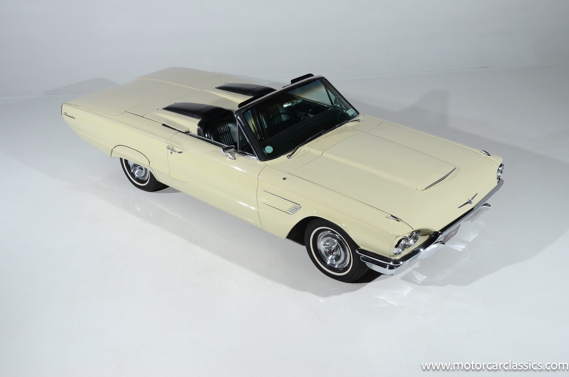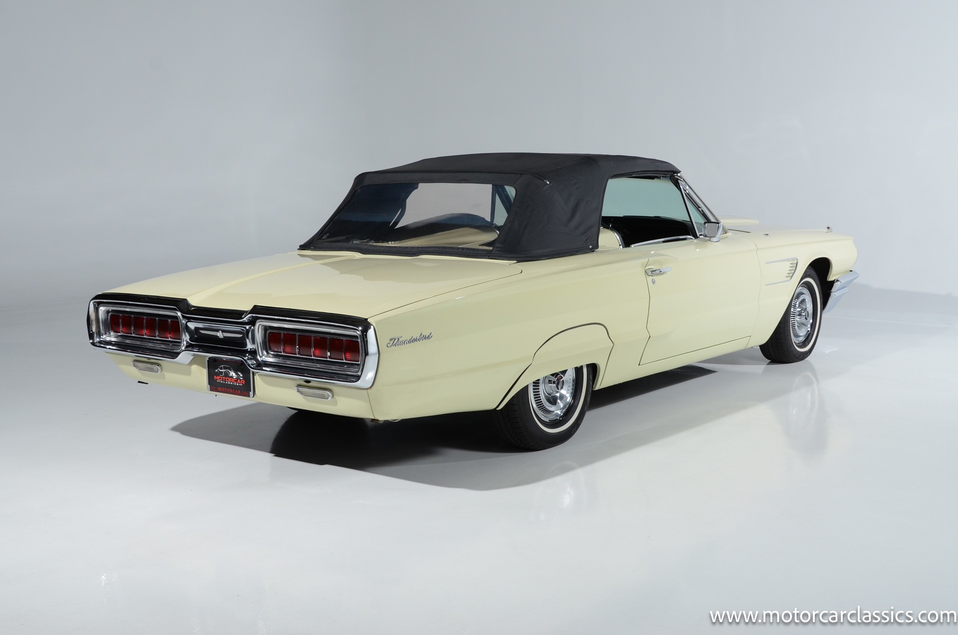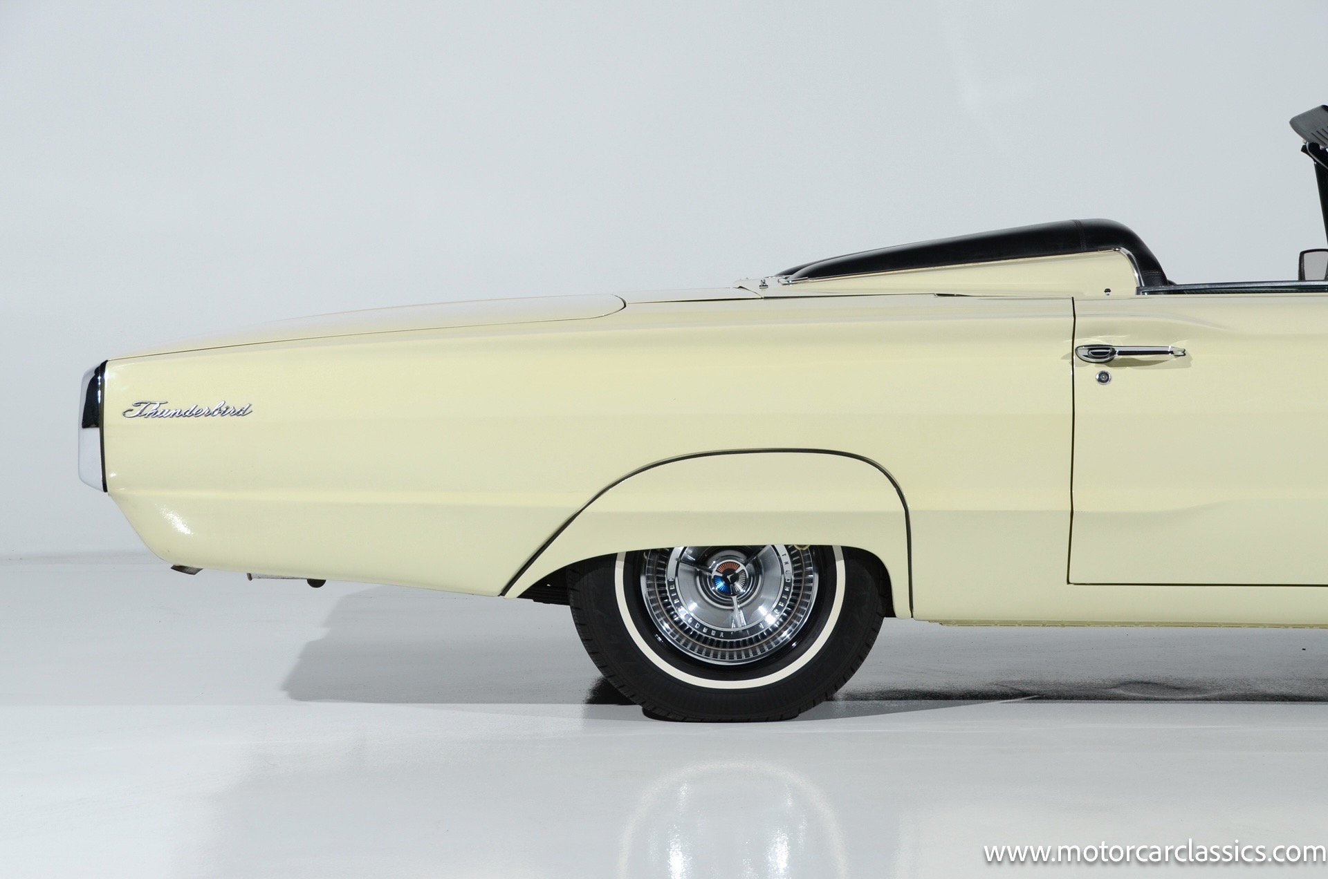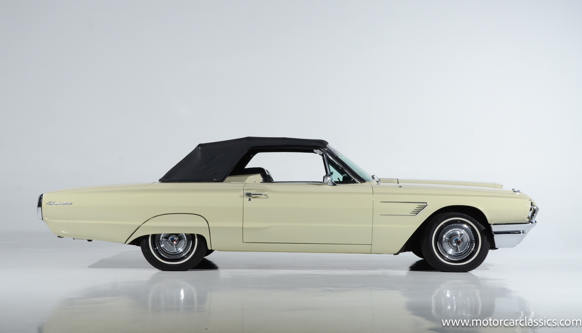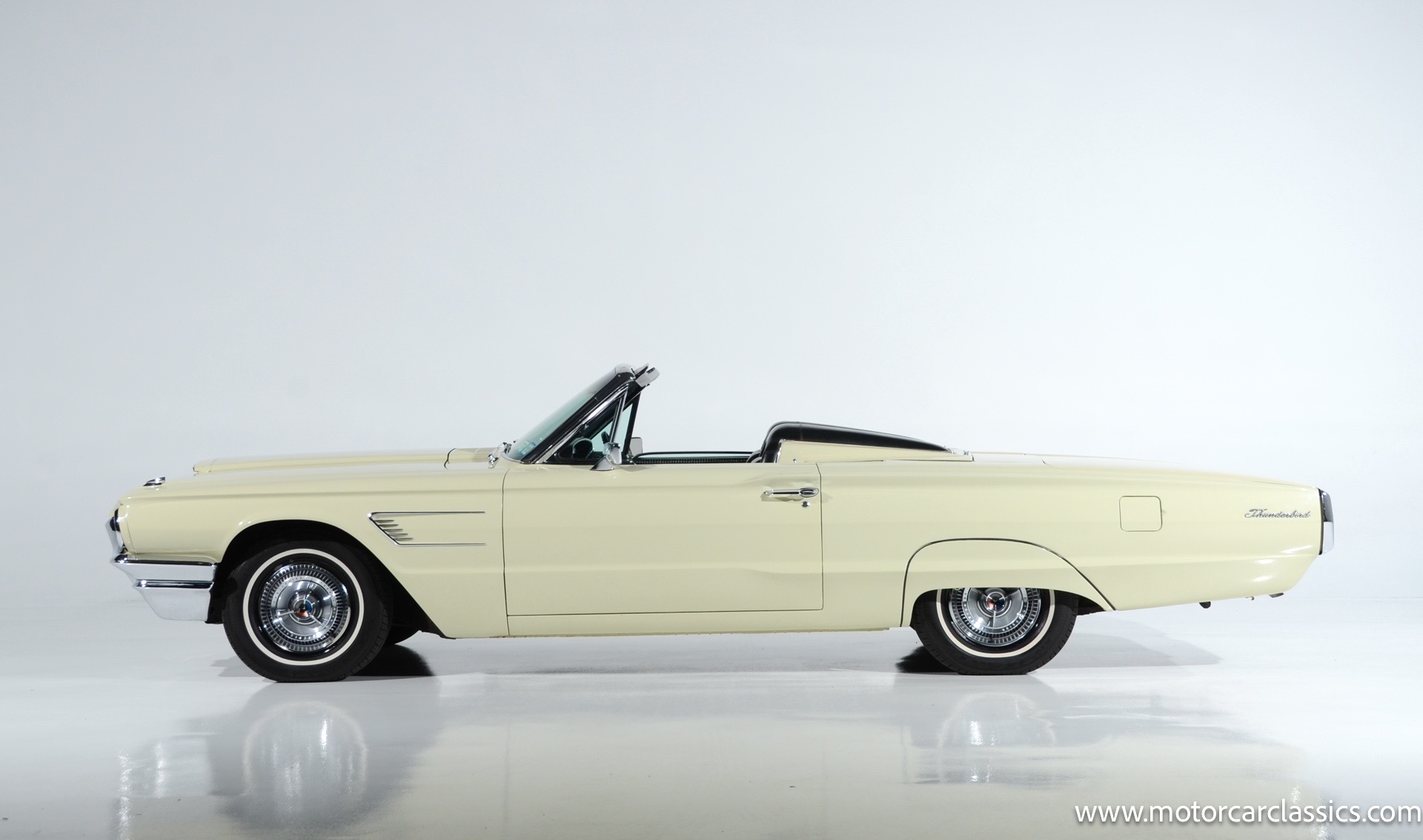 1965 Ford Thunderbird for sale! Motorcar classics is pleased to present a classic blend of American power and luxury - the 1965 Ford Thunderbird Convertible. This iconic machine is finished in a sophisticated pastel yellow exterior that beautifully complements the Black vinyl interior, making it an eye-catching expression of timeless elegance.