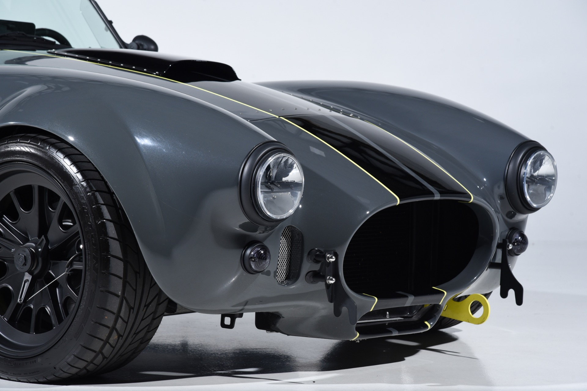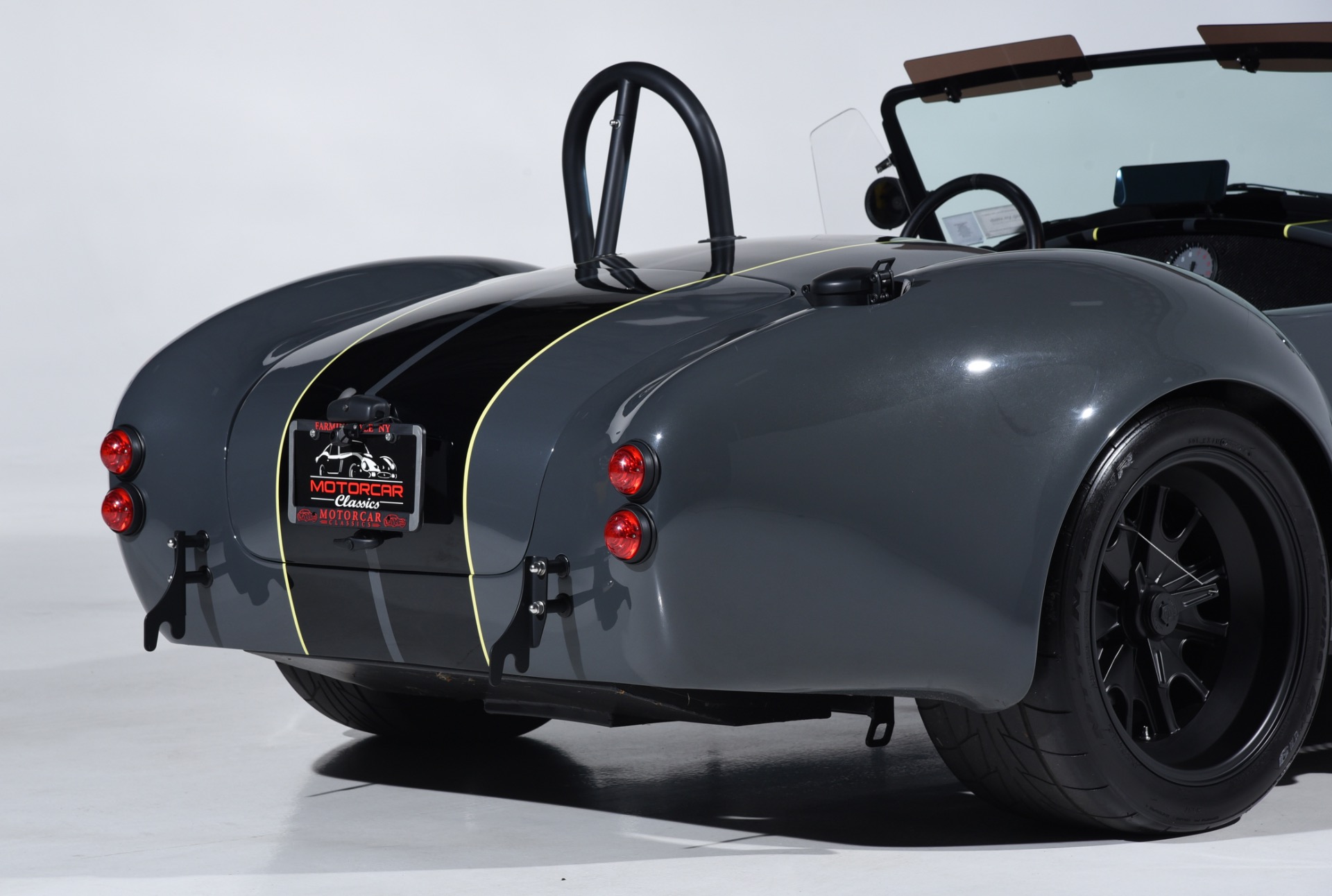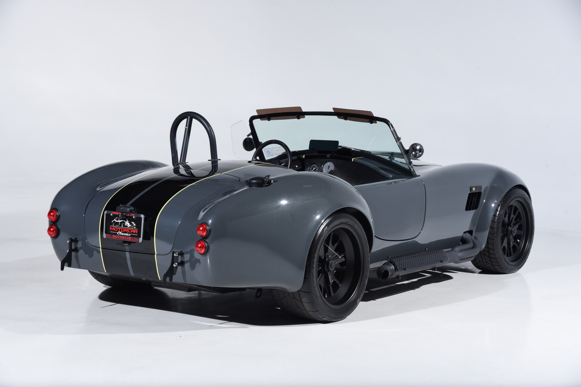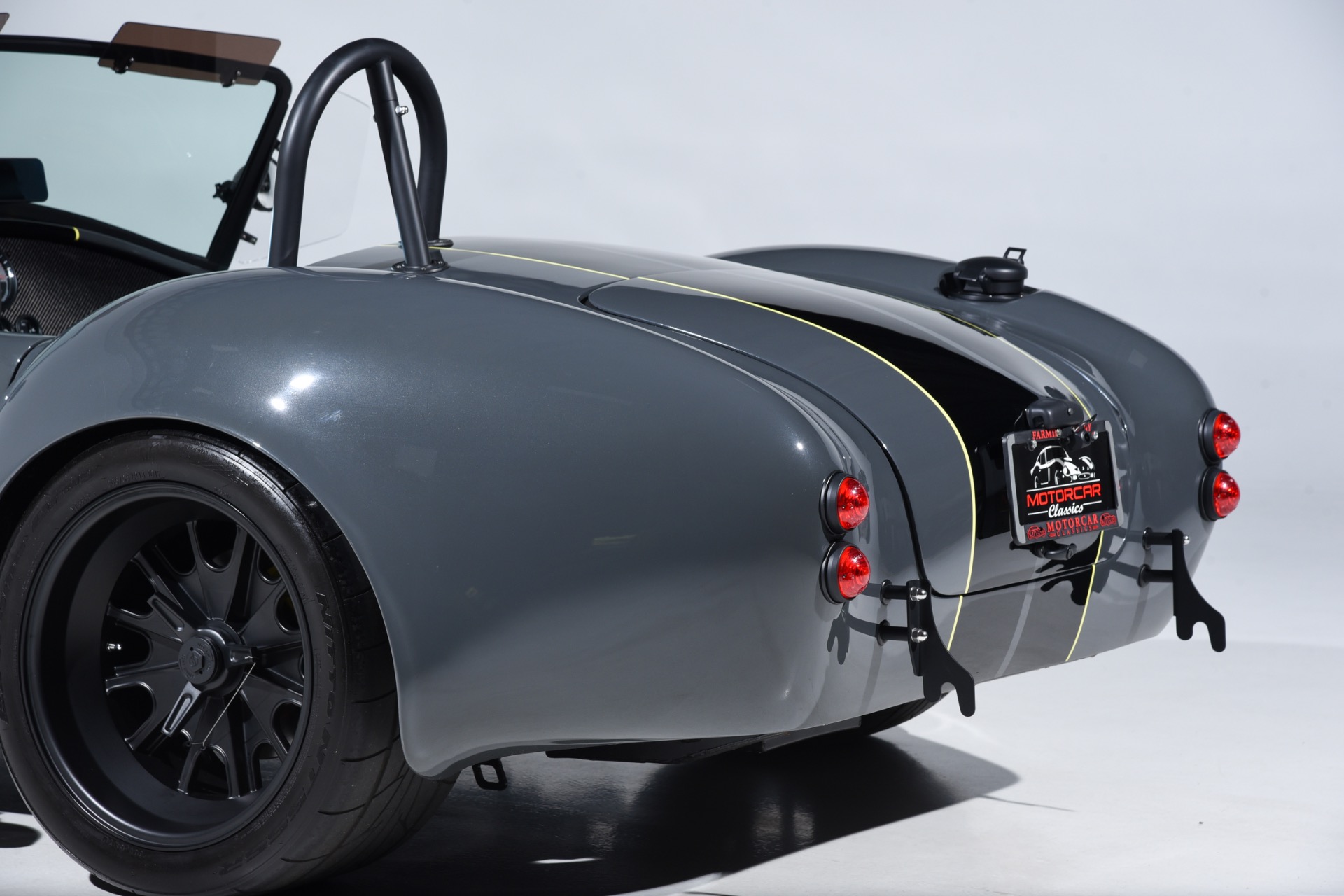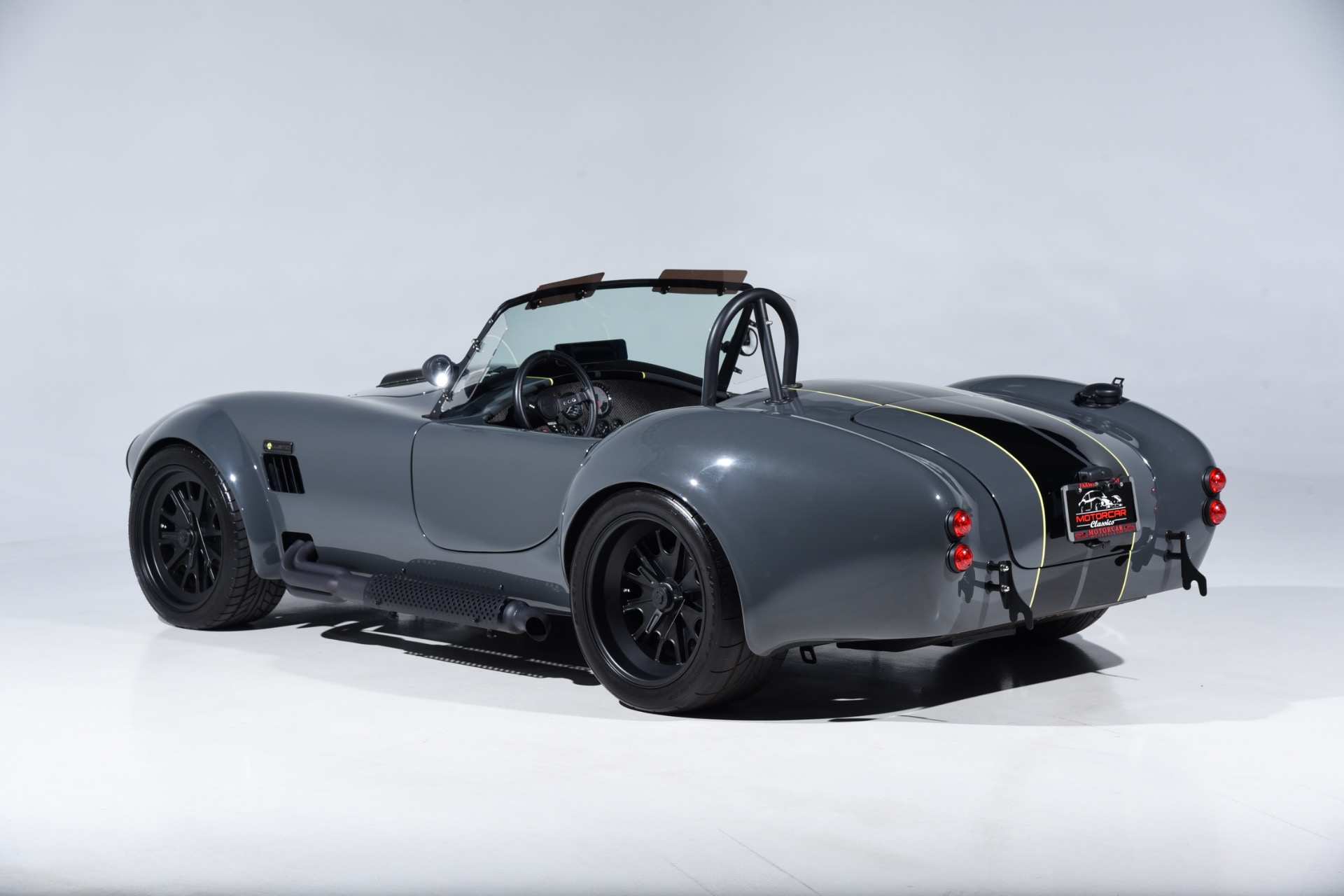 1965 Shelby Cobra Backdraft for sale! Motorcar Classics is proud to present this very special 1966 Shelby Cobra Backdraft for sale. Presented in nearly-new and excellent condition this Backdraft Cobra has only 1,727 miles. Presented in Grigio Telestro with black stripes and yellow outlines. VMS 427 crate engine with 525 HP. Tremec TKO-600 Transmission. Options include: Carbon fiber dash with yellow gauges, Sparco suede steering wheel, Richbrook start button, Suspension upgrade includes springs, billet perches, shocks and sway bar mounts, AFCO aluminum racing radiator upgrade, aluminum fuel tank with internal fuel pump for fuel injection, blacked out wheels, wheel strobe stripes in yellow, Hurst short shift handle with carbon fiber shift knob, yellow brake calipers, Stage 1 cross stitch interior includes transmission tunnel and door panels, Ray Dot mirror, LED projector headlights upgrade, Blackbird style 4 point cam lock harness set, ceramic coated headers, ceramic coated side pipes and heat shields, Backdraft racing solid aluminum motor mounts. In addition, the car has been upgraded with power steering and a backup camera for a more user-friendly driving experience. Your inspection is invited!
