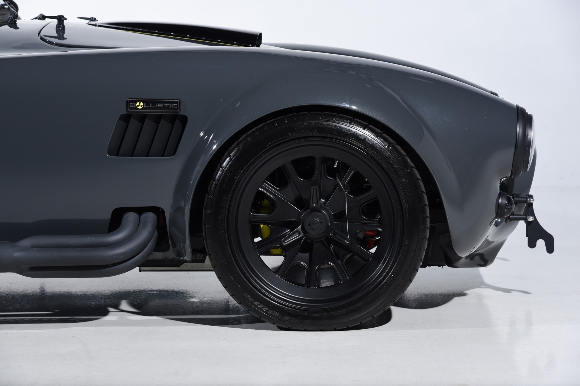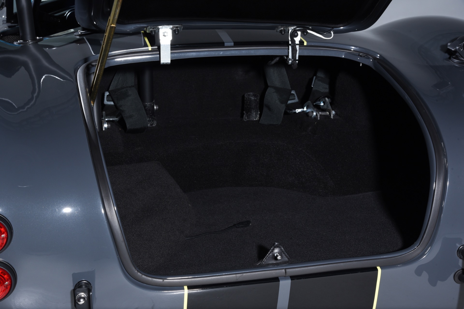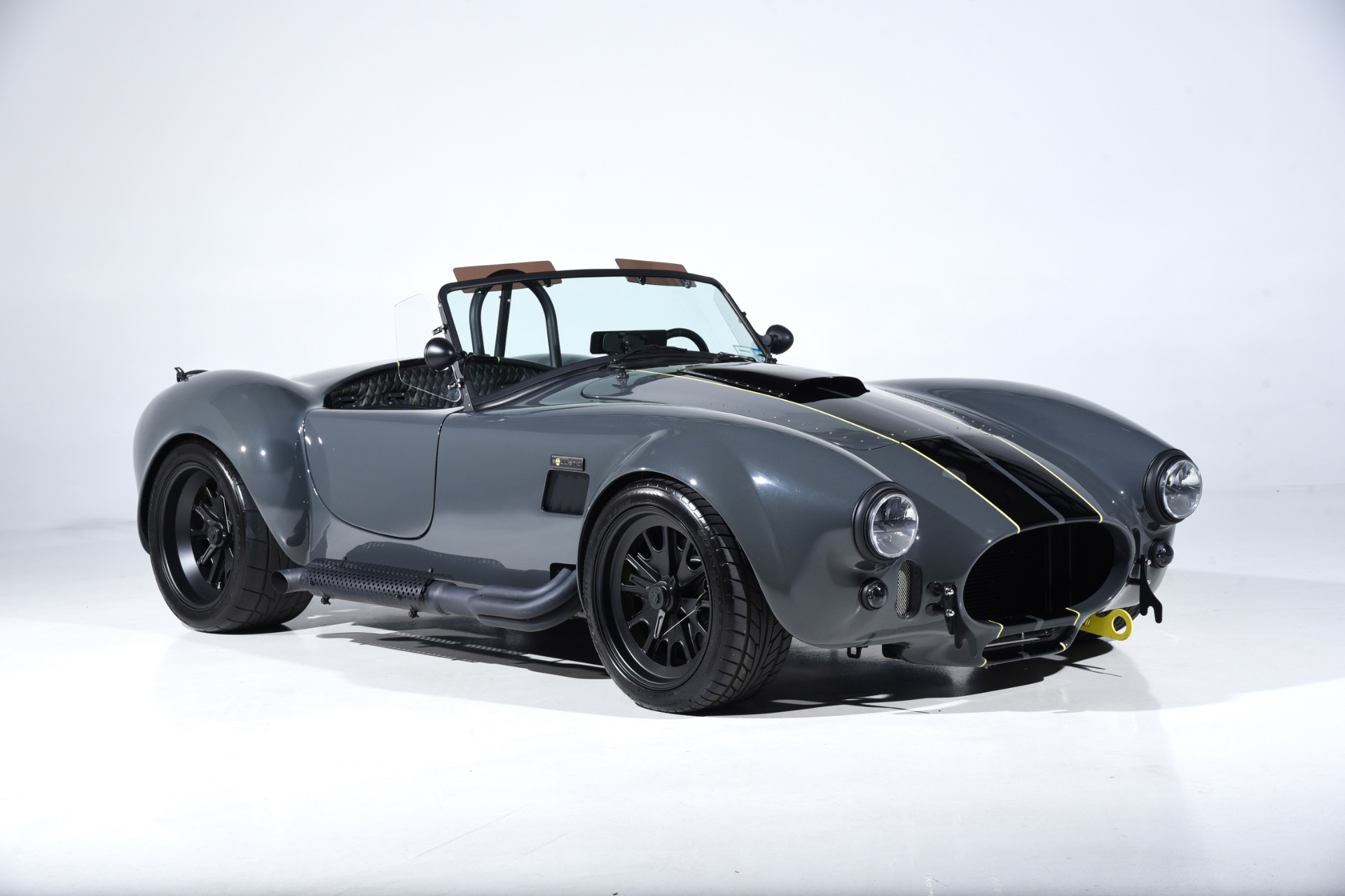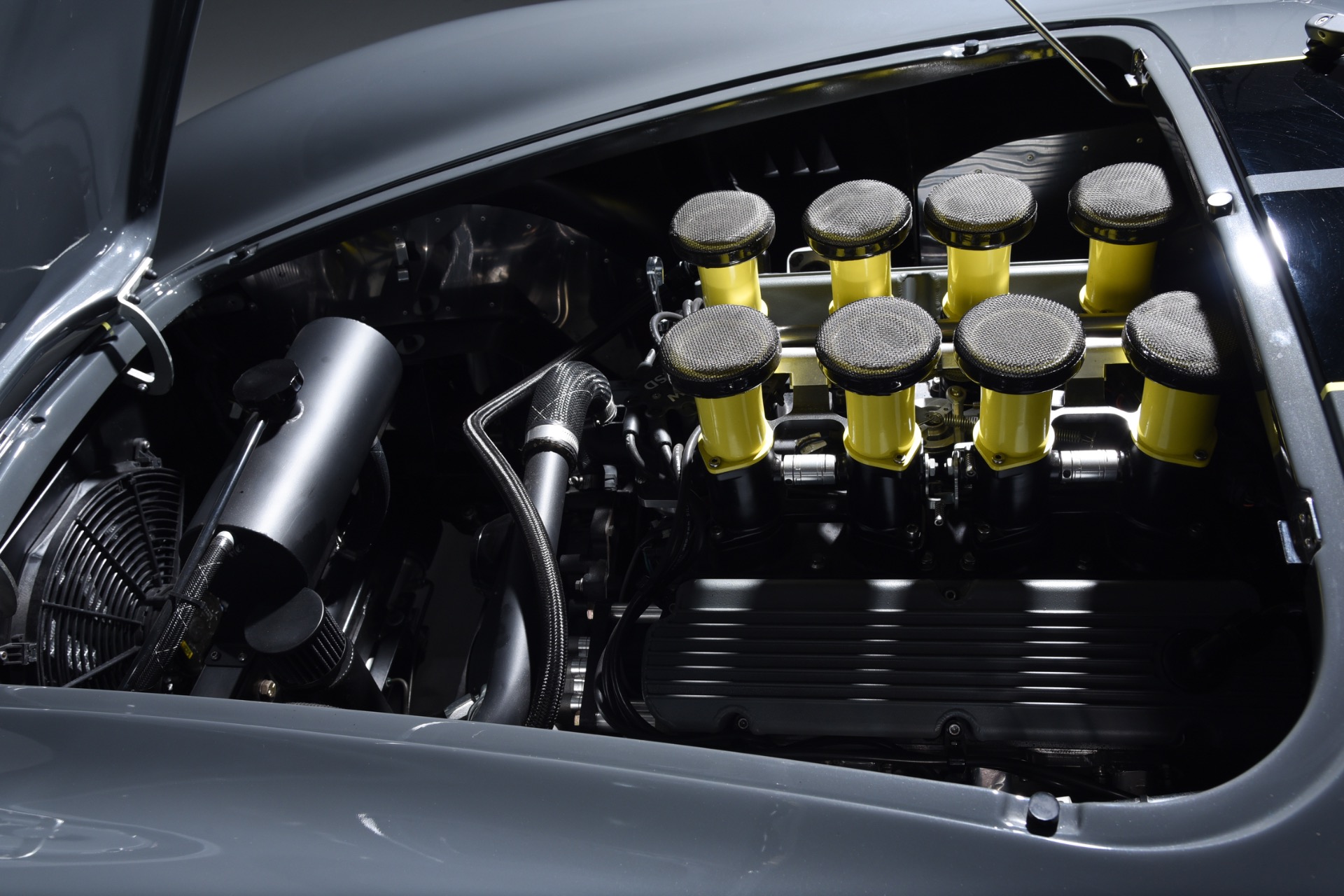 1965 Shelby Cobra Backdraft for sale! Motorcar Classics is proud to present this very special 1966 Shelby Cobra Backdraft for sale. Presented in nearly-new and excellent condition this Backdraft Cobra has only 1,727 miles. Presented in Grigio Telestro with black stripes and yellow outlines. VMS 427 crate engine with 525 HP. Tremec TKO-600 Transmission. Options include: Carbon fiber dash with yellow gauges, Sparco suede steering wheel, Richbrook start button, Suspension upgrade includes springs, billet perches, shocks and sway bar mounts, AFCO aluminum racing radiator upgrade, aluminum fuel tank with internal fuel pump for fuel injection, blacked out wheels, wheel strobe stripes in yellow, Hurst short shift handle with carbon fiber shift knob, yellow brake calipers, Stage 1 cross stitch interior includes transmission tunnel and door panels, Ray Dot mirror, LED projector headlights upgrade, Blackbird style 4 point cam lock harness set, ceramic coated headers, ceramic coated side pipes and heat shields, Backdraft racing solid aluminum motor mounts. In addition, the car has been upgraded with power steering and a backup camera for a more user-friendly driving experience. Your inspection is invited!