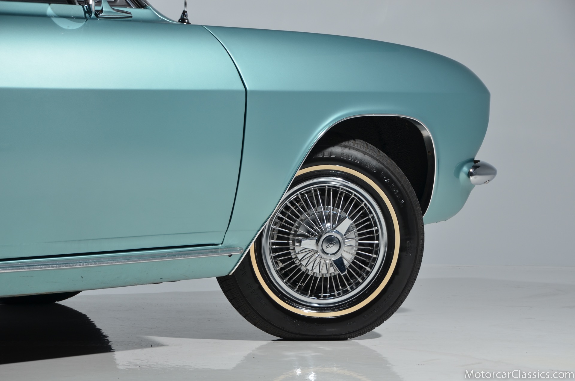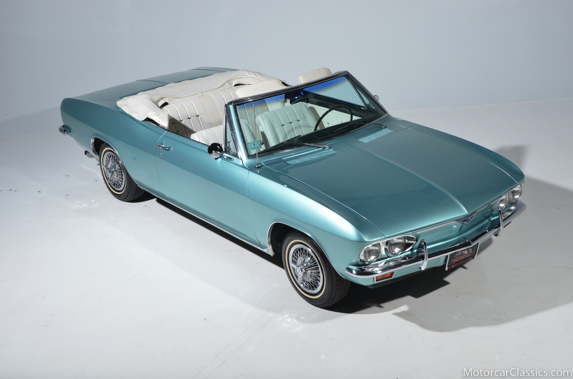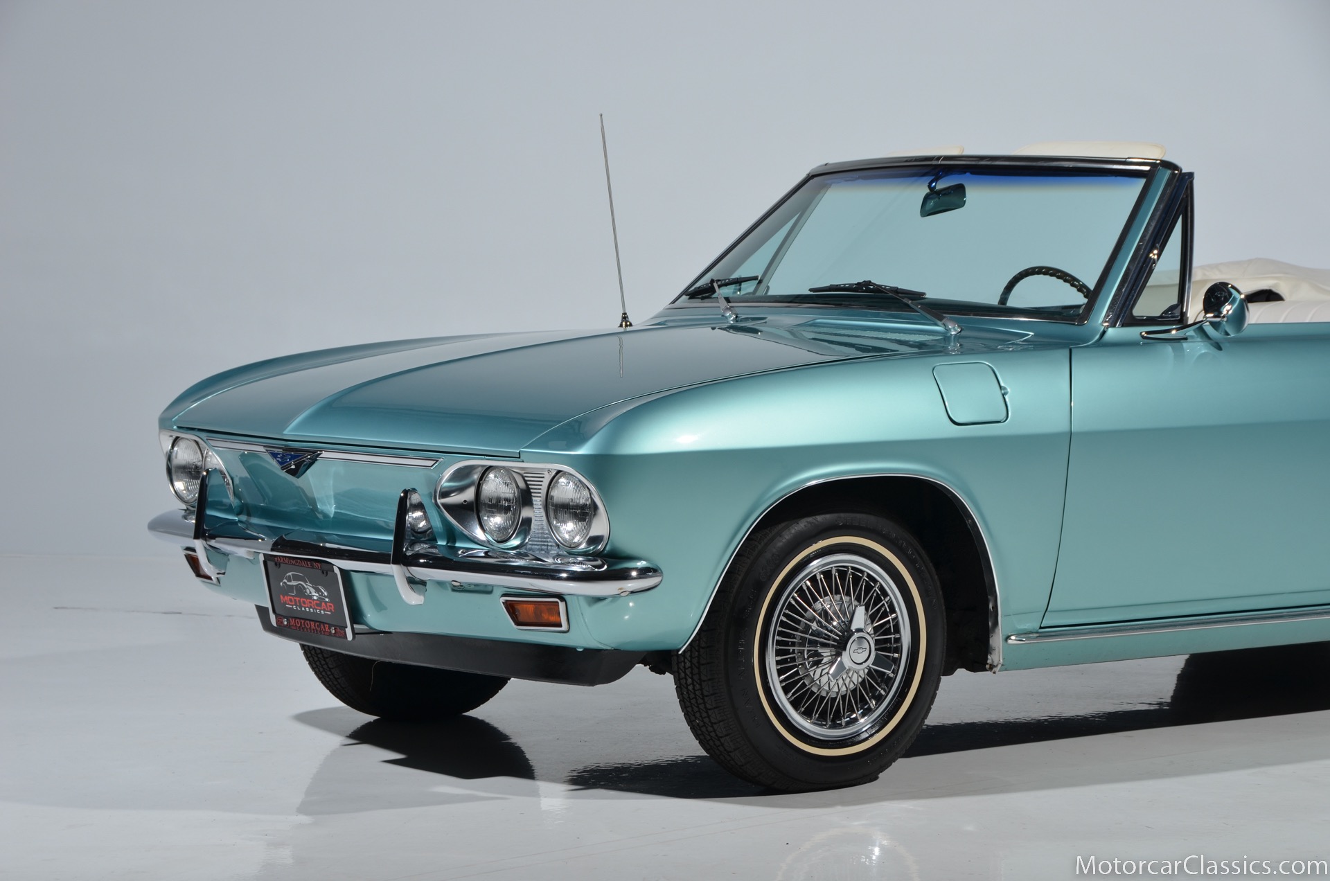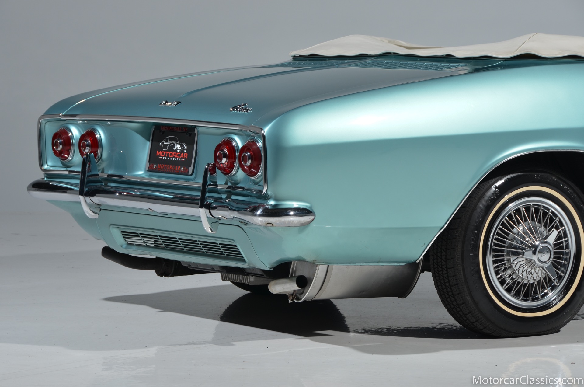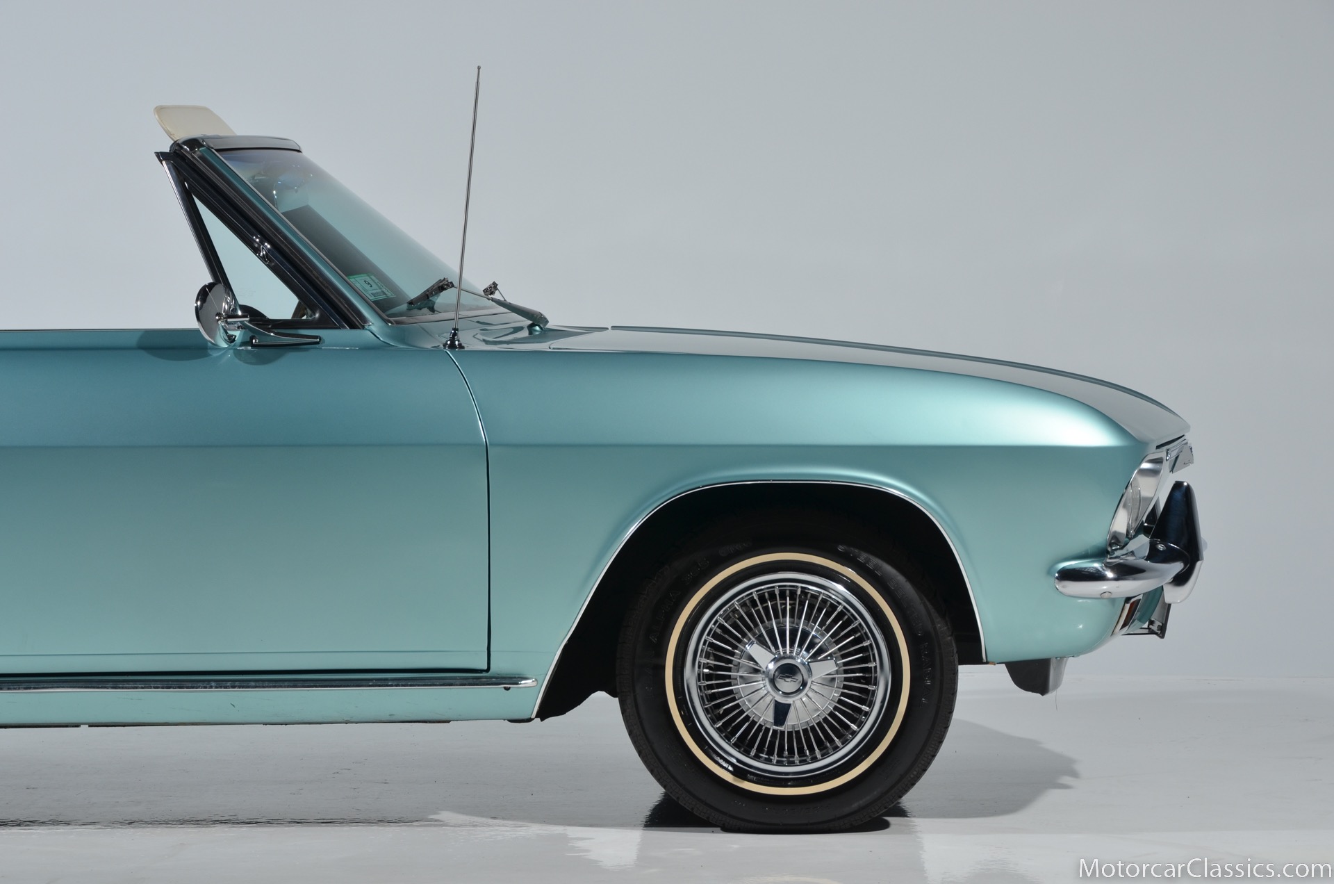 1966 Corvair Monza Convertible for sale! Motorcar Classics is proud to present this rare and stunning 1966 Chevrolet Corvair Monza convertible featured in Artesian Turquoise Metallic with white vinyl convertible top and matching white vinyl interior. This car has benefitted from a total restoration and it is reported that 36,050 miles shown are original. The Monza is the top of the Corvair range for 1966, with the highest rated 140HP, 2.4L, 4-carburetor flat 6-cylinder engine. Our car features the user-friendly Powerglide automatic transmission so everyone can enjoy driving it. As a collector car, the Corvair offers you a sporty convertible that can carry friends and family. Desirable options on this car include, Monza Wire Wheel Hubcaps, Electric Push button convertible top with boot, Original AM/FM Radio, and Twin Exhaust. Additional recent upgrades include: Kenwood KAC-M1824BTCompact 4-channel amplifier with Bluetooth connectivity, new passenger side exhaust pipes, muffler and hangers, new rear coil, springs and shock absorbers, new steel oil pan, white center console, front grill, and front and rear bumper guards from Clarks Corvair Parts. This is one of the nicest and best sorted Corvairs we have had the pleasure to offer. It is a delight to drive and you find few others that are its equal. Drive or show with pride.