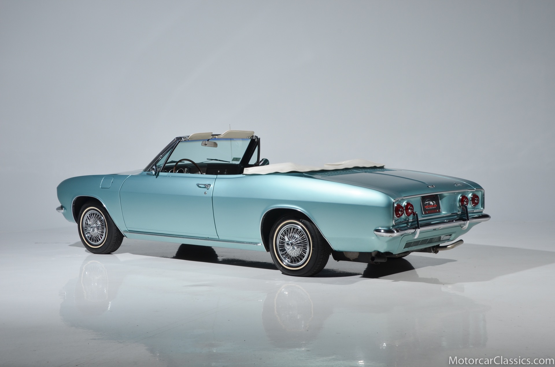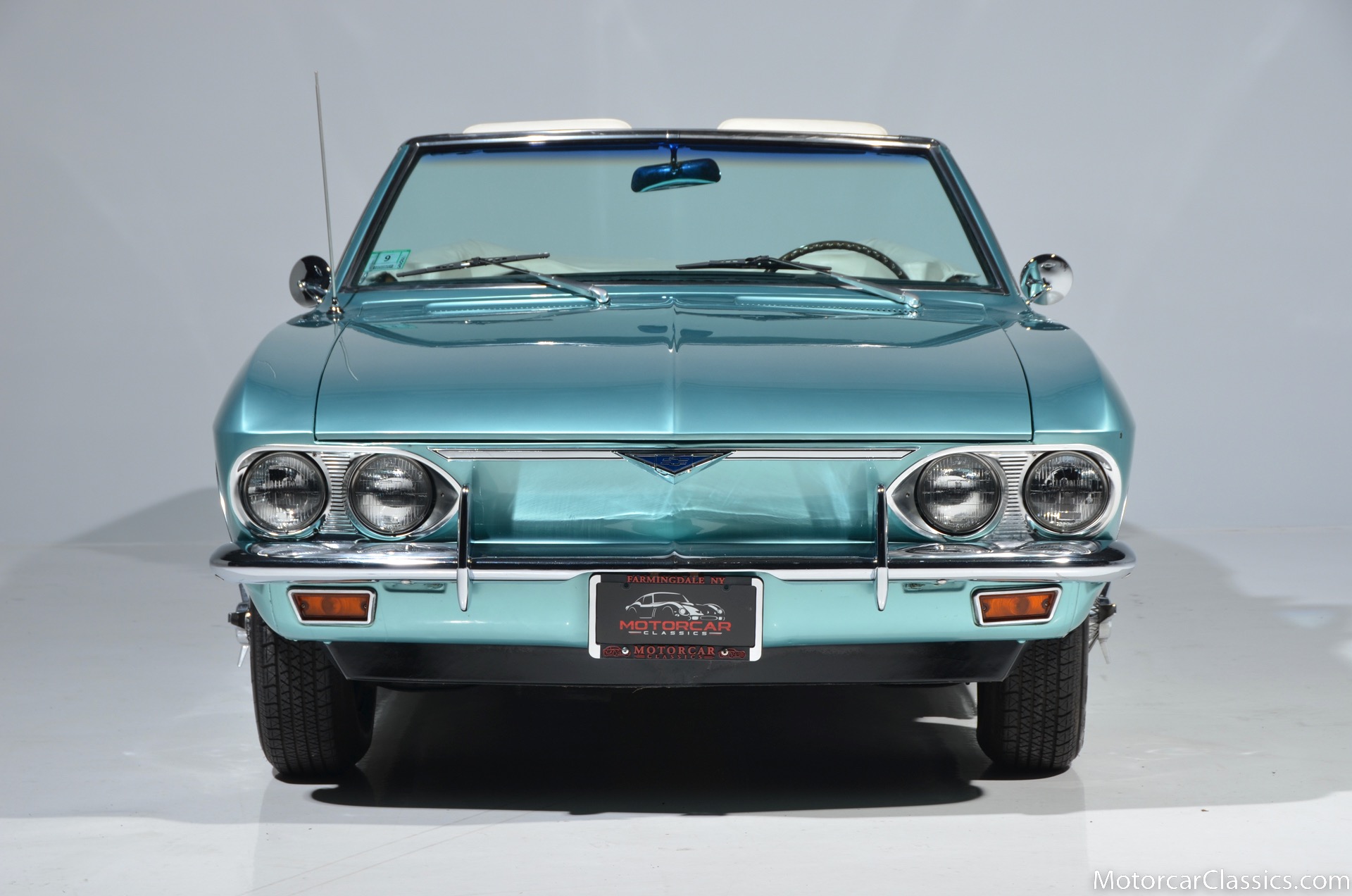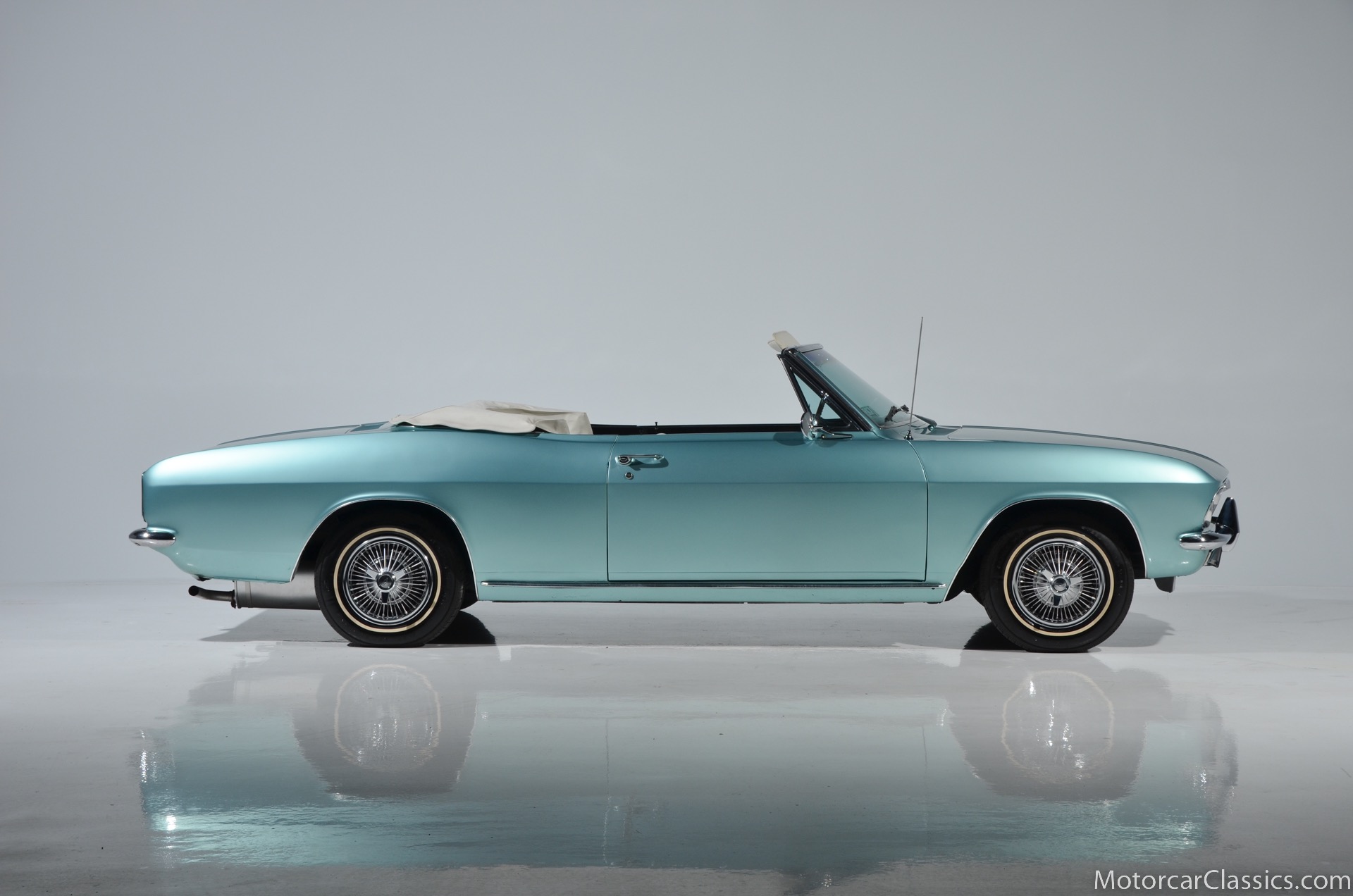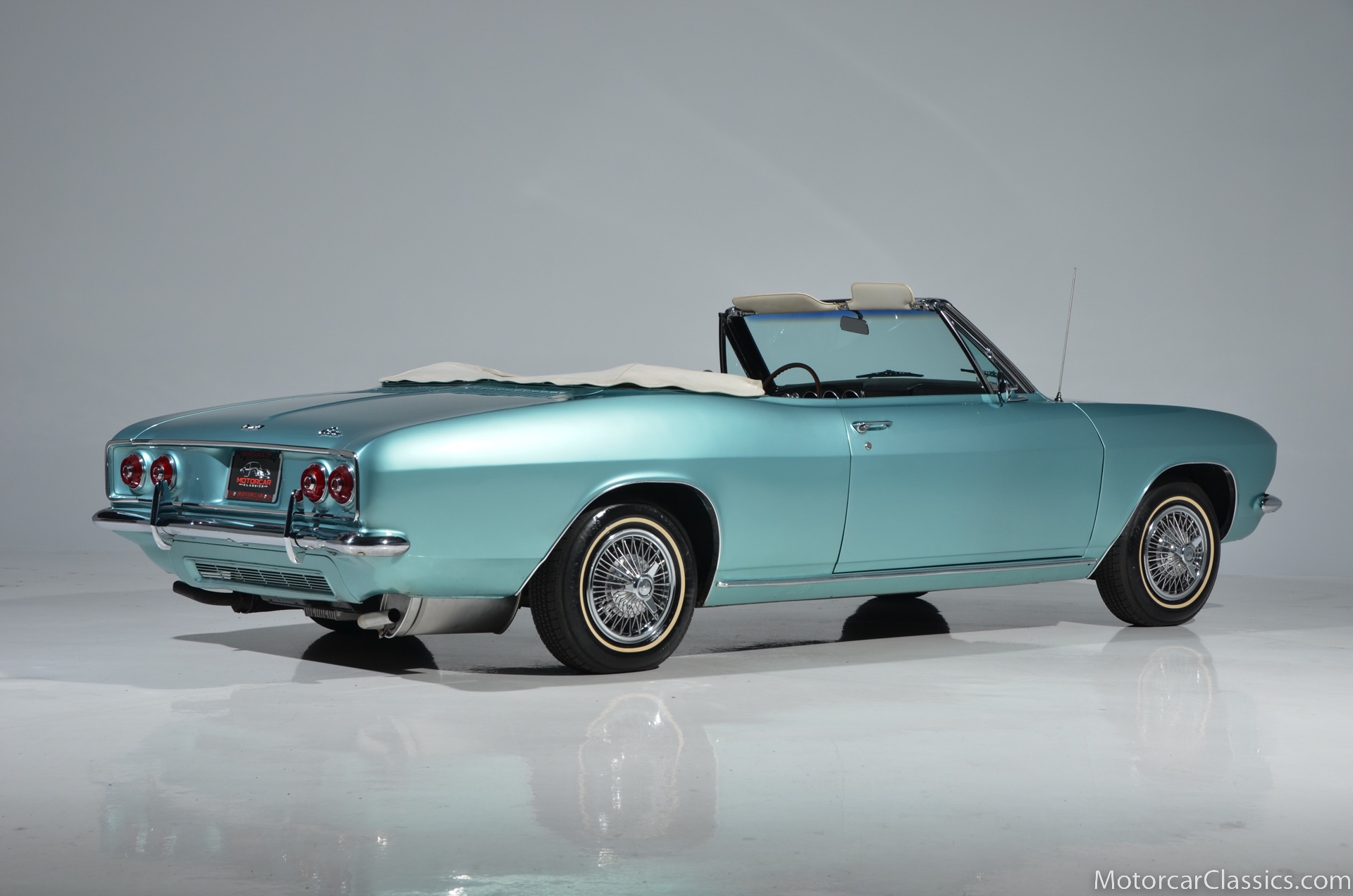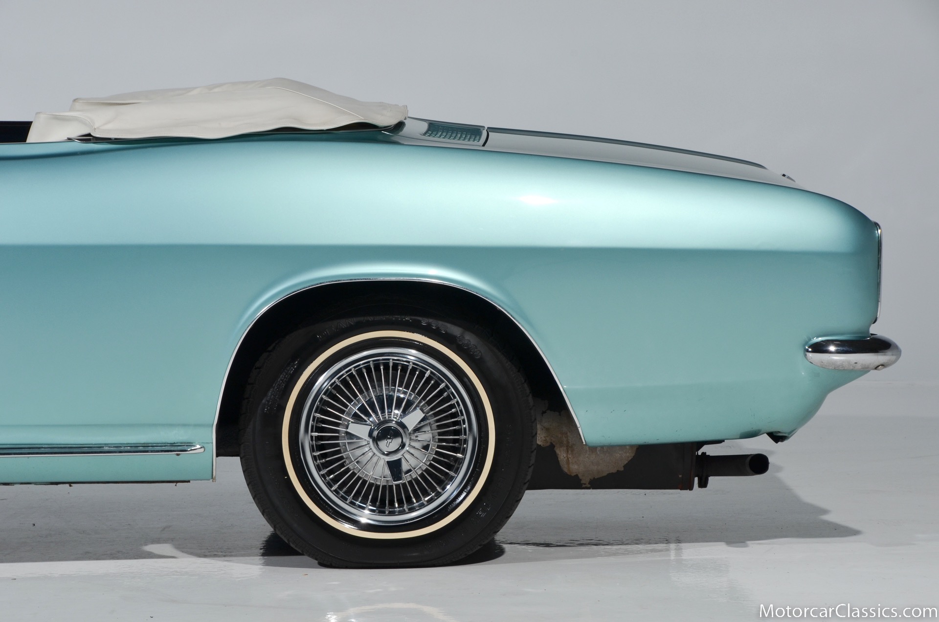 1966 Corvair Monza Convertible for sale! Motorcar Classics is proud to present this rare and stunning 1966 Chevrolet Corvair Monza convertible featured in Artesian Turquoise Metallic with white vinyl convertible top and matching white vinyl interior. This car has benefitted from a total restoration and it is reported that 36,050 miles shown are original. The Monza is the top of the Corvair range for 1966, with the highest rated 140HP, 2.4L, 4-carburetor flat 6-cylinder engine. Our car features the user-friendly Powerglide automatic transmission so everyone can enjoy driving it. As a collector car, the Corvair offers you a sporty convertible that can carry friends and family. Desirable options on this car include, Monza Wire Wheel Hubcaps, Electric Push button convertible top with boot, Original AM/FM Radio, and Twin Exhaust. Additional recent upgrades include: Kenwood KAC-M1824BTCompact 4-channel amplifier with Bluetooth connectivity, new passenger side exhaust pipes, muffler and hangers, new rear coil, springs and shock absorbers, new steel oil pan, white center console, front grill, and front and rear bumper guards from Clarks Corvair Parts. This is one of the nicest and best sorted Corvairs we have had the pleasure to offer. It is a delight to drive and you find few others that are its equal. Drive or show with pride.