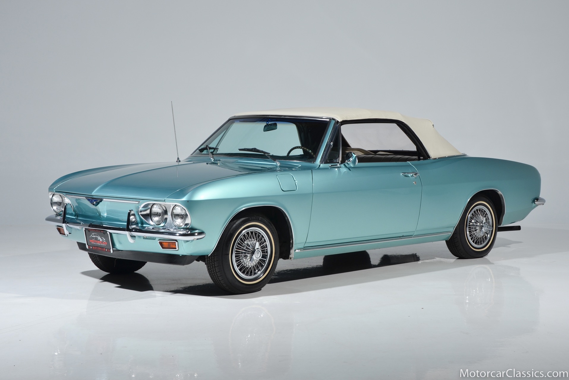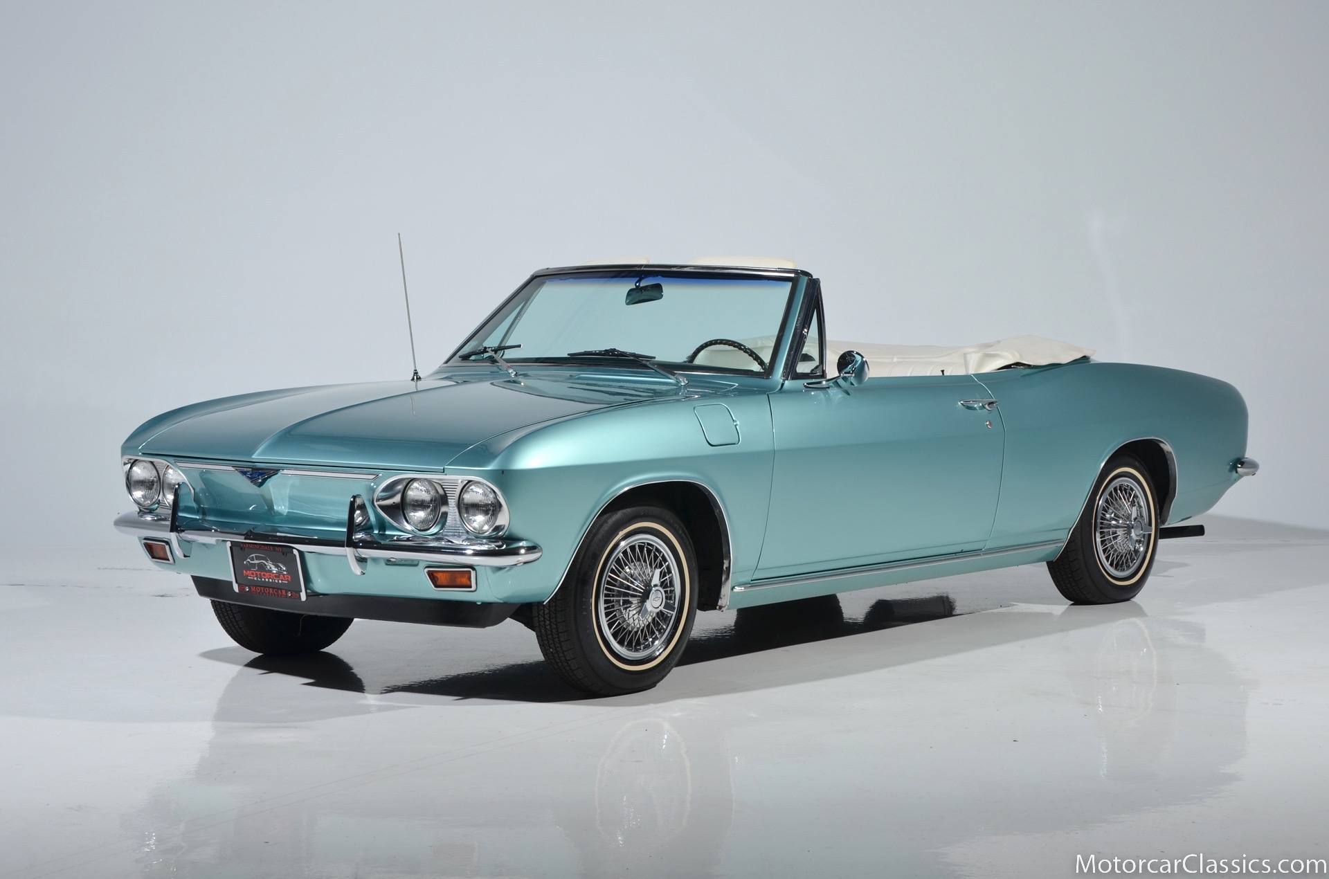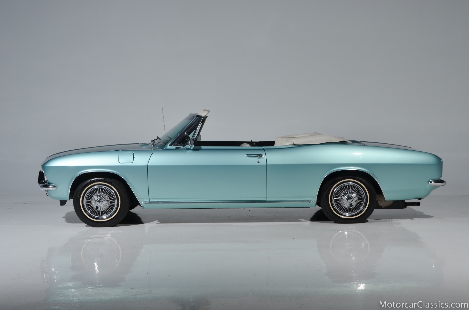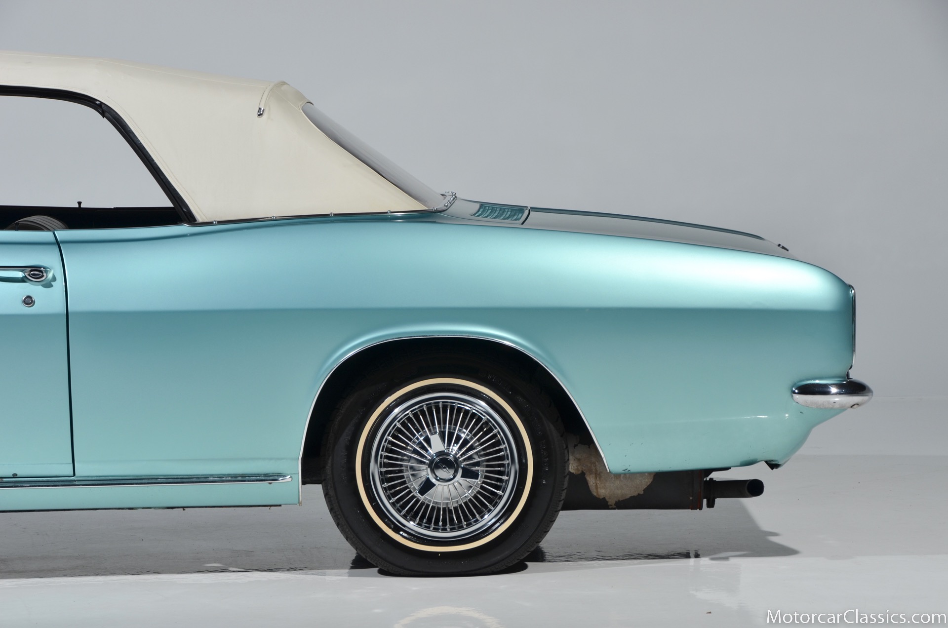 1966 Corvair Monza Convertible for sale! Motorcar Classics is proud to present this rare and stunning 1966 Chevrolet Corvair Monza convertible featured in Artesian Turquoise Metallic with white vinyl convertible top and matching white vinyl interior. This car has benefitted from a total restoration and it is reported that 36,050 miles shown are original. The Monza is the top of the Corvair range for 1966, with the highest rated 140HP, 2.4L, 4-carburetor flat 6-cylinder engine. Our car features the user-friendly Powerglide automatic transmission so everyone can enjoy driving it. As a collector car, the Corvair offers you a sporty convertible that can carry friends and family. Desirable options on this car include, Monza Wire Wheel Hubcaps, Electric Push button convertible top with boot, Original AM/FM Radio, and Twin Exhaust. Additional recent upgrades include: Kenwood KAC-M1824BTCompact 4-channel amplifier with Bluetooth connectivity, new passenger side exhaust pipes, muffler and hangers, new rear coil, springs and shock absorbers, new steel oil pan, white center console, front grill, and front and rear bumper guards from Clarks Corvair Parts. This is one of the nicest and best sorted Corvairs we have had the pleasure to offer. It is a delight to drive and you find few others that are its equal. Drive or show with pride.