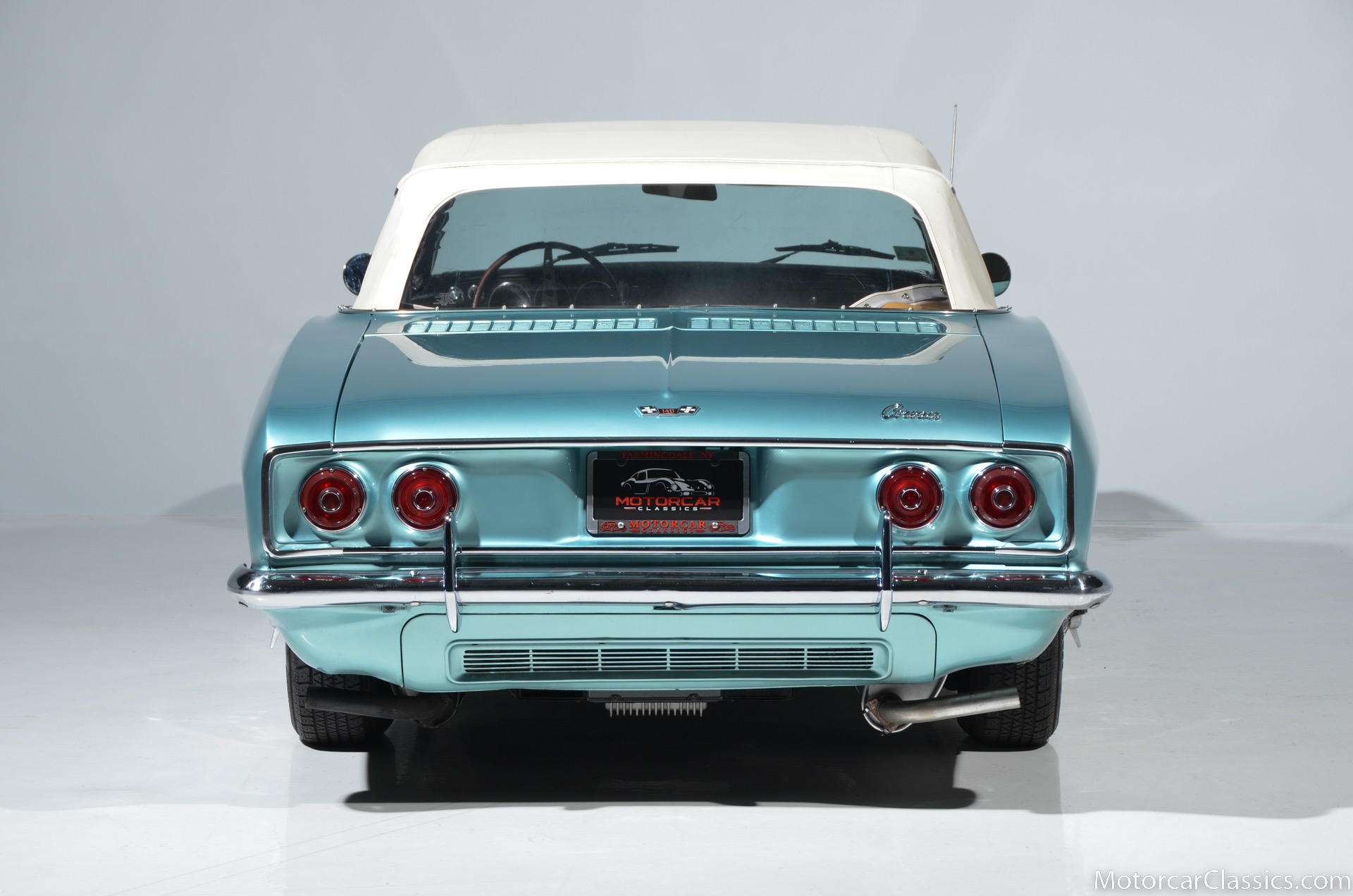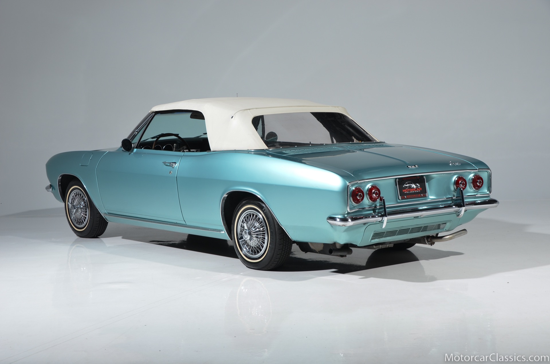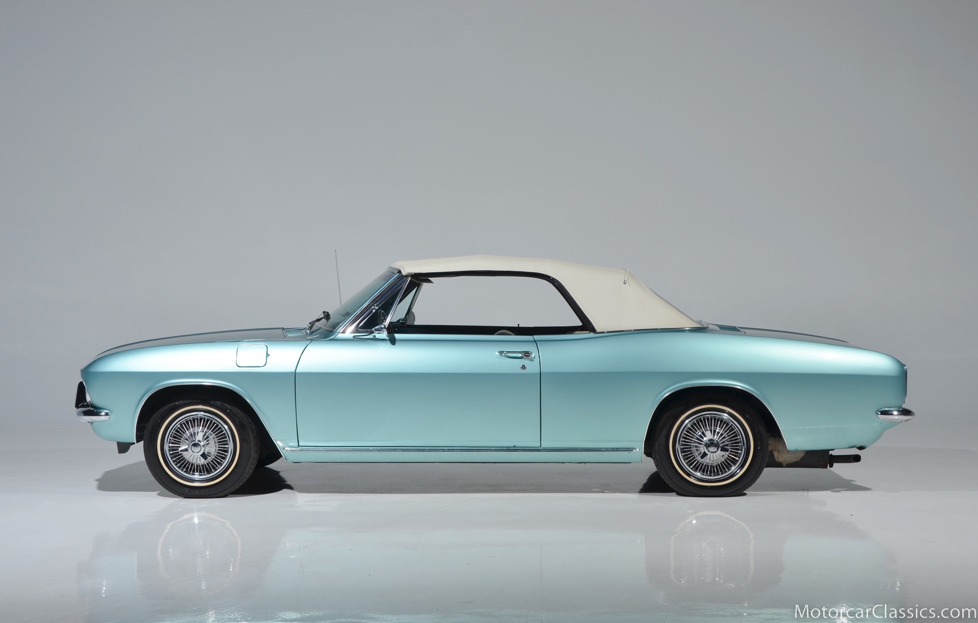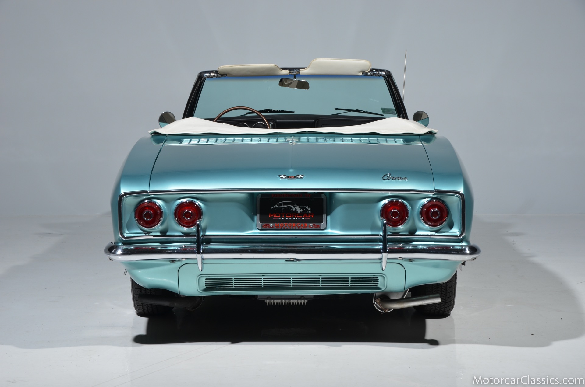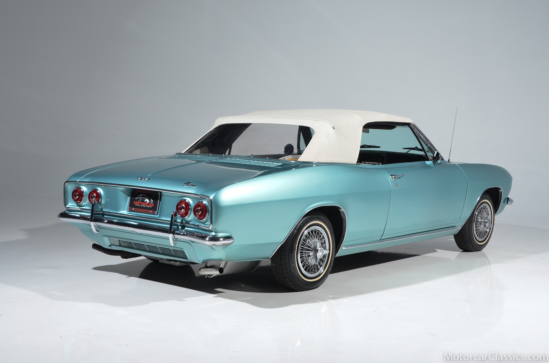 1966 Corvair Monza Convertible for sale! Motorcar Classics is proud to present this rare and stunning 1966 Chevrolet Corvair Monza convertible featured in Artesian Turquoise Metallic with white vinyl convertible top and matching white vinyl interior. This car has benefitted from a total restoration and it is reported that 36,050 miles shown are original. The Monza is the top of the Corvair range for 1966, with the highest rated 140HP, 2.4L, 4-carburetor flat 6-cylinder engine. Our car features the user-friendly Powerglide automatic transmission so everyone can enjoy driving it. As a collector car, the Corvair offers you a sporty convertible that can carry friends and family. Desirable options on this car include, Monza Wire Wheel Hubcaps, Electric Push button convertible top with boot, Original AM/FM Radio, and Twin Exhaust. Additional recent upgrades include: Kenwood KAC-M1824BTCompact 4-channel amplifier with Bluetooth connectivity, new passenger side exhaust pipes, muffler and hangers, new rear coil, springs and shock absorbers, new steel oil pan, white center console, front grill, and front and rear bumper guards from Clarks Corvair Parts. This is one of the nicest and best sorted Corvairs we have had the pleasure to offer. It is a delight to drive and you find few others that are its equal. Drive or show with pride.