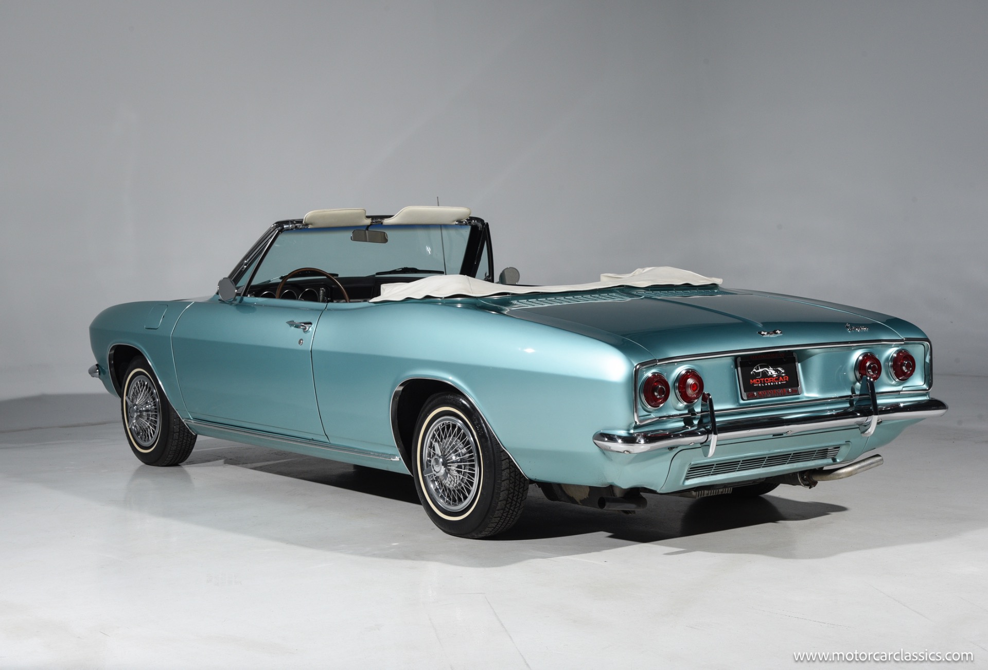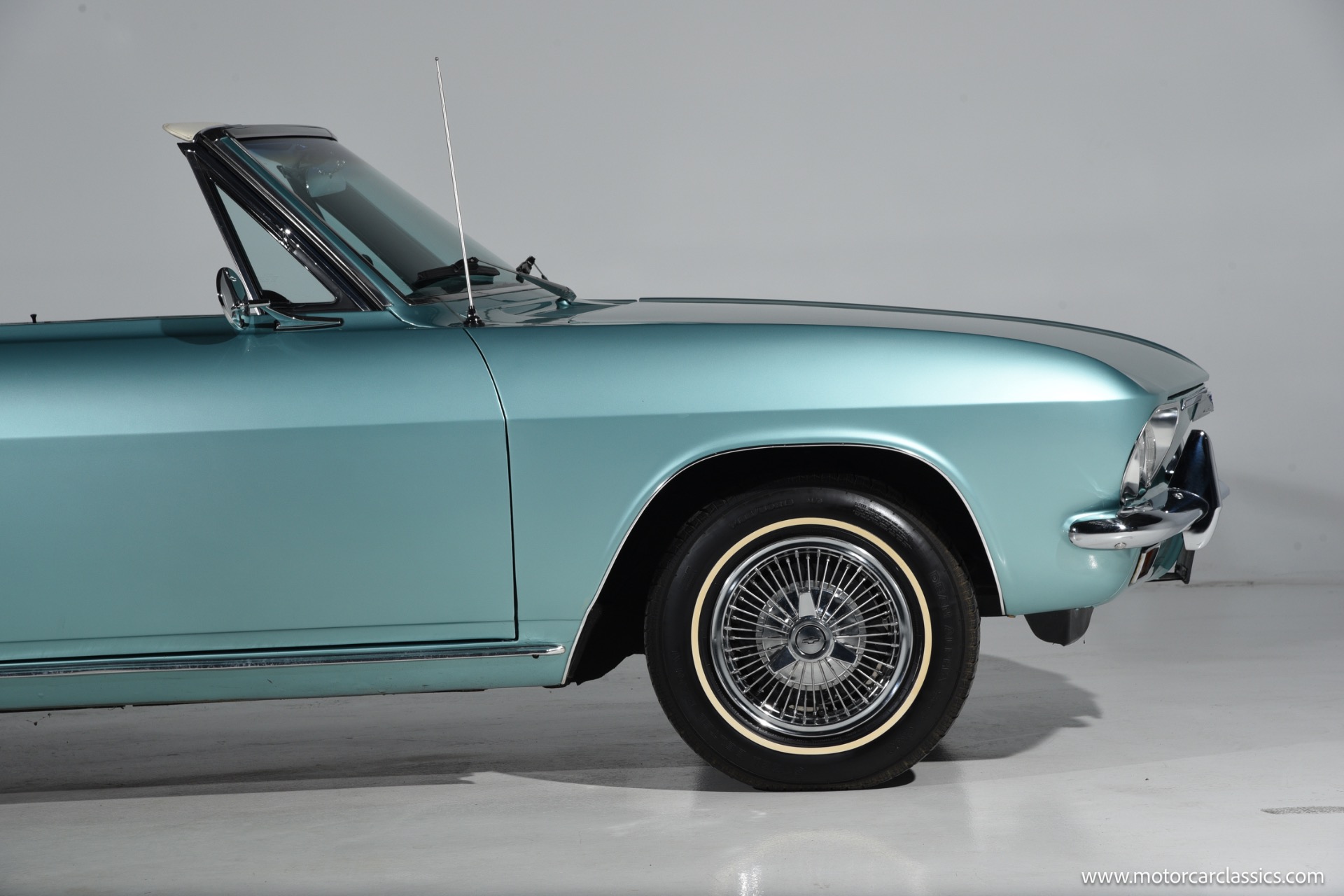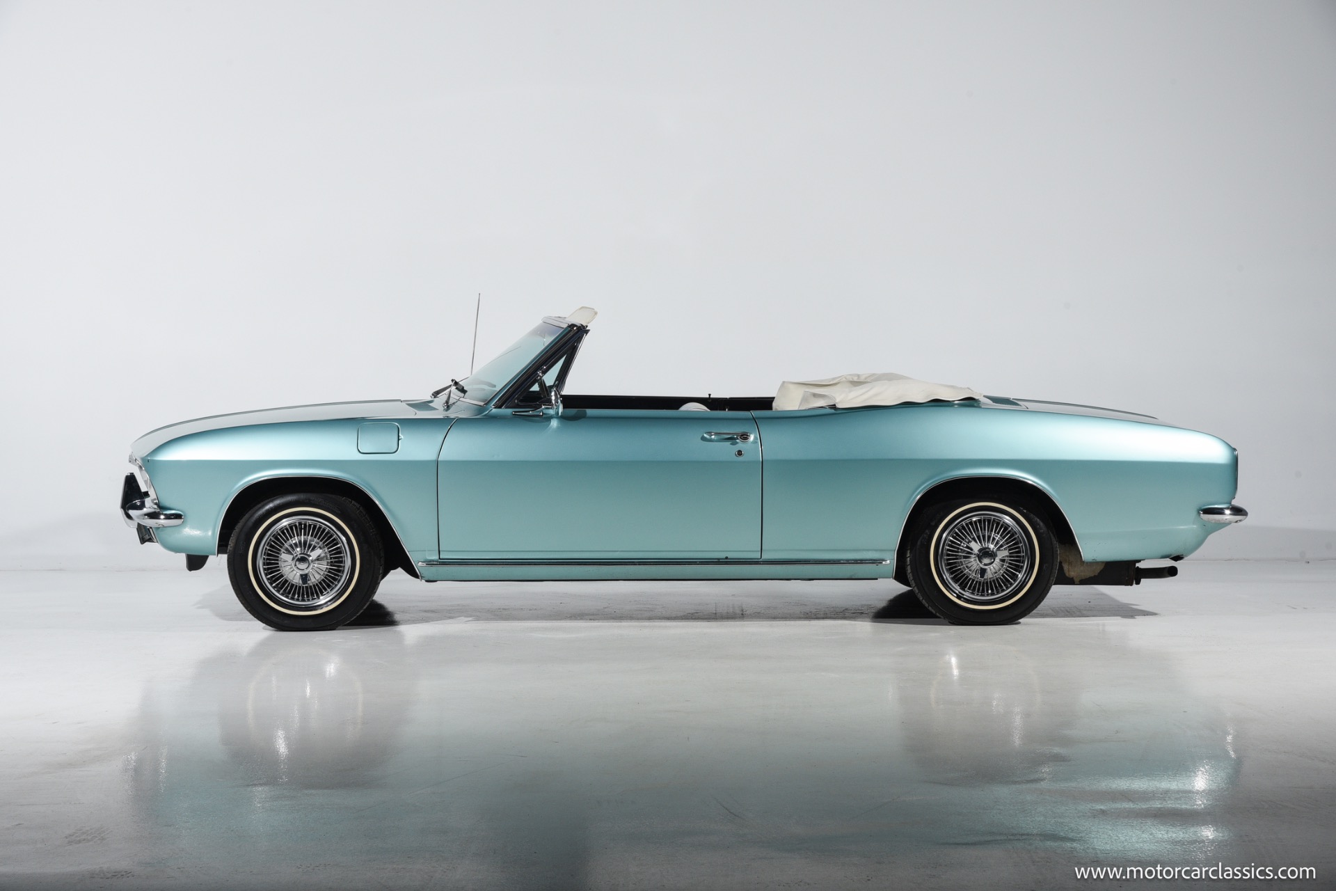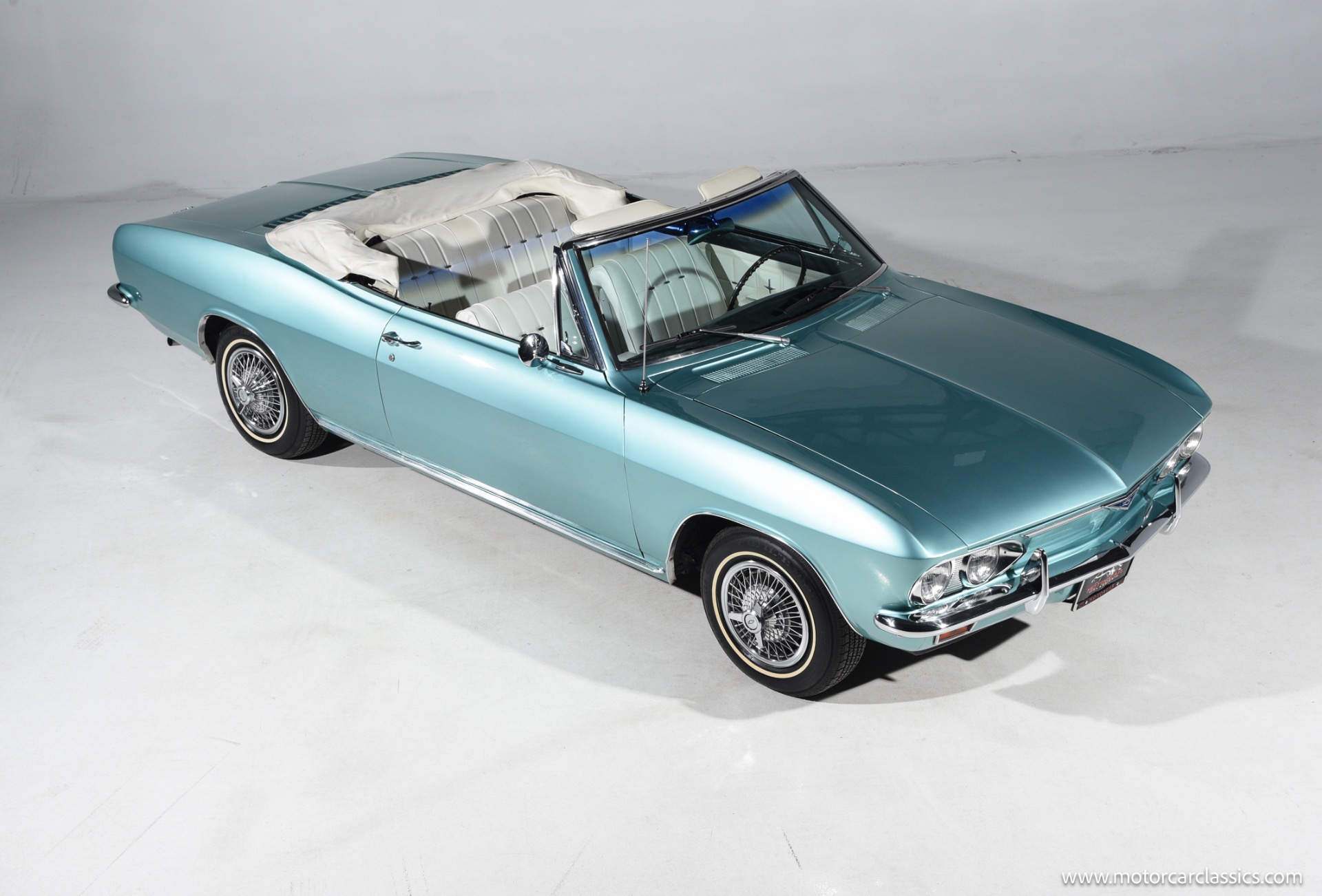 1966 Corvair Monza Convertible for sale! Motorcar Classics is proud to present this rare and stunning 1966 Chevrolet Corvair Monza convertible featured in Artesian Turquoise Metallic with white vinyl convertible top and matching white vinyl interior. This car has benefitted from a total restoration and it is reported that 36,087 miles shown are original. The Monza is the top of the Corvair range for 1966, with the highest rated 140HP, 2.4L, 4-carburetor flat 6-cylinder engine. Our car features the user-friendly Powerglide automatic transmission so everyone can enjoy driving it. As a collector car, the Corvair offers you a sporty convertible that can carry friends and family. Desirable options on this car include, Monza Wire Wheel Hubcaps, Electric Push button convertible top with boot, Original AM/FM Radio, and Twin Exhaust. Additional recent upgrades include: Kenwood KAC-M1824BTCompact 4-channel amplifier with Bluetooth connectivity, new passenger side exhaust pipes, muffler and hangers, new rear coil, springs and shock absorbers, new steel oil pan, white center console, front grill, and front and rear bumper guards from Clark?s Corvair Parts. This is one of the nicest and best sorted Corvairs we have had the pleasure to offer. It is a delight to drive and you find few others that are its equal. Drive or show with pride.