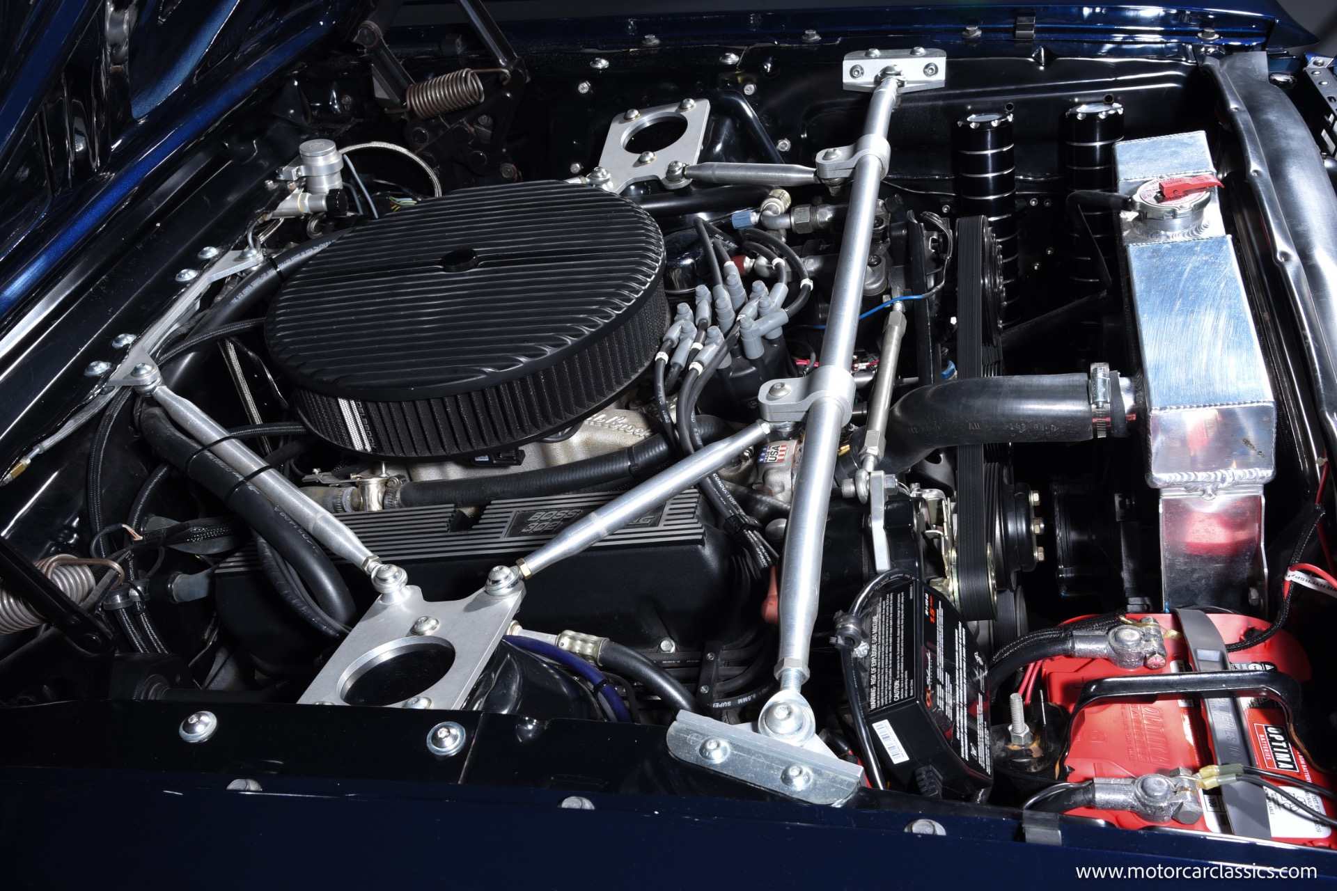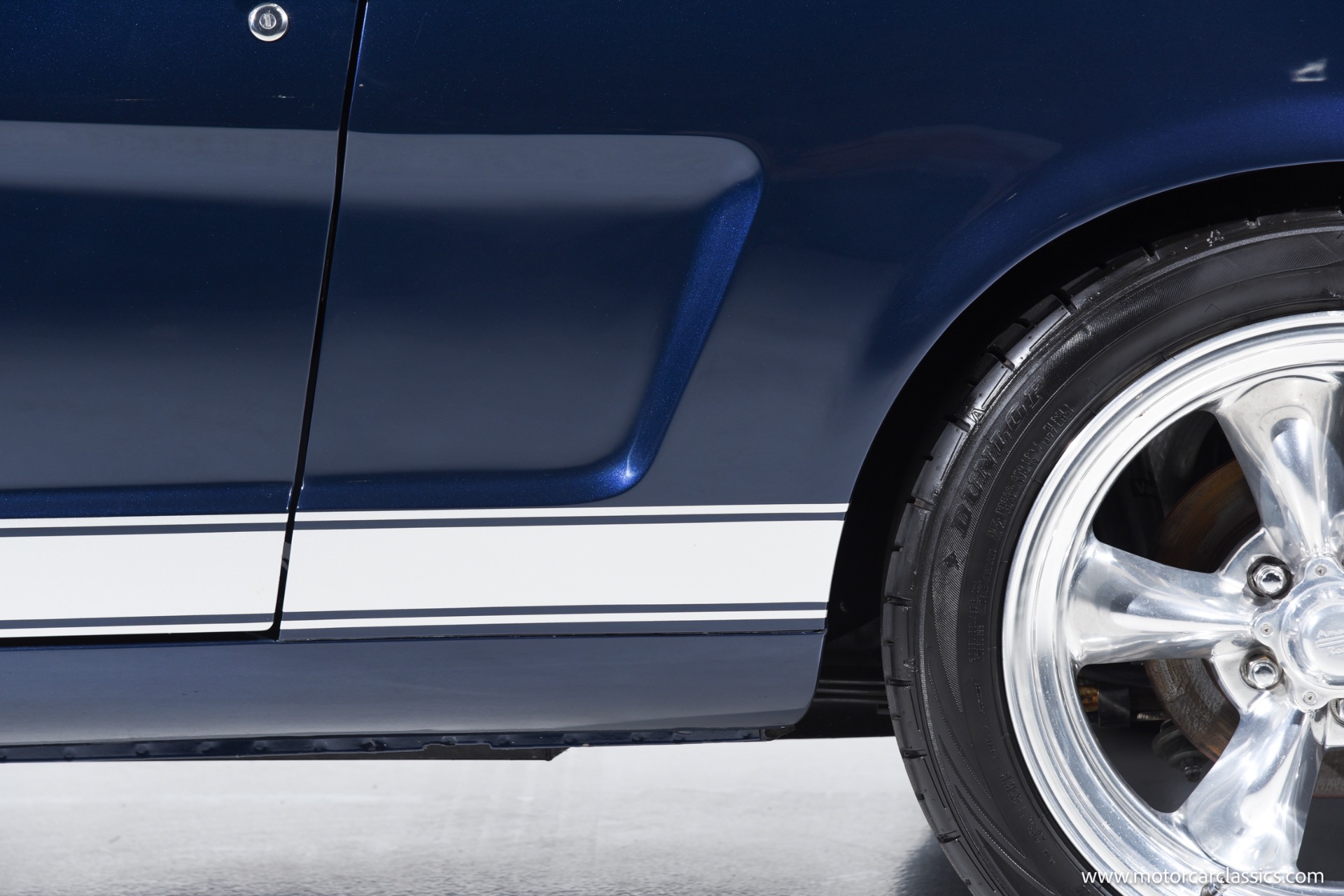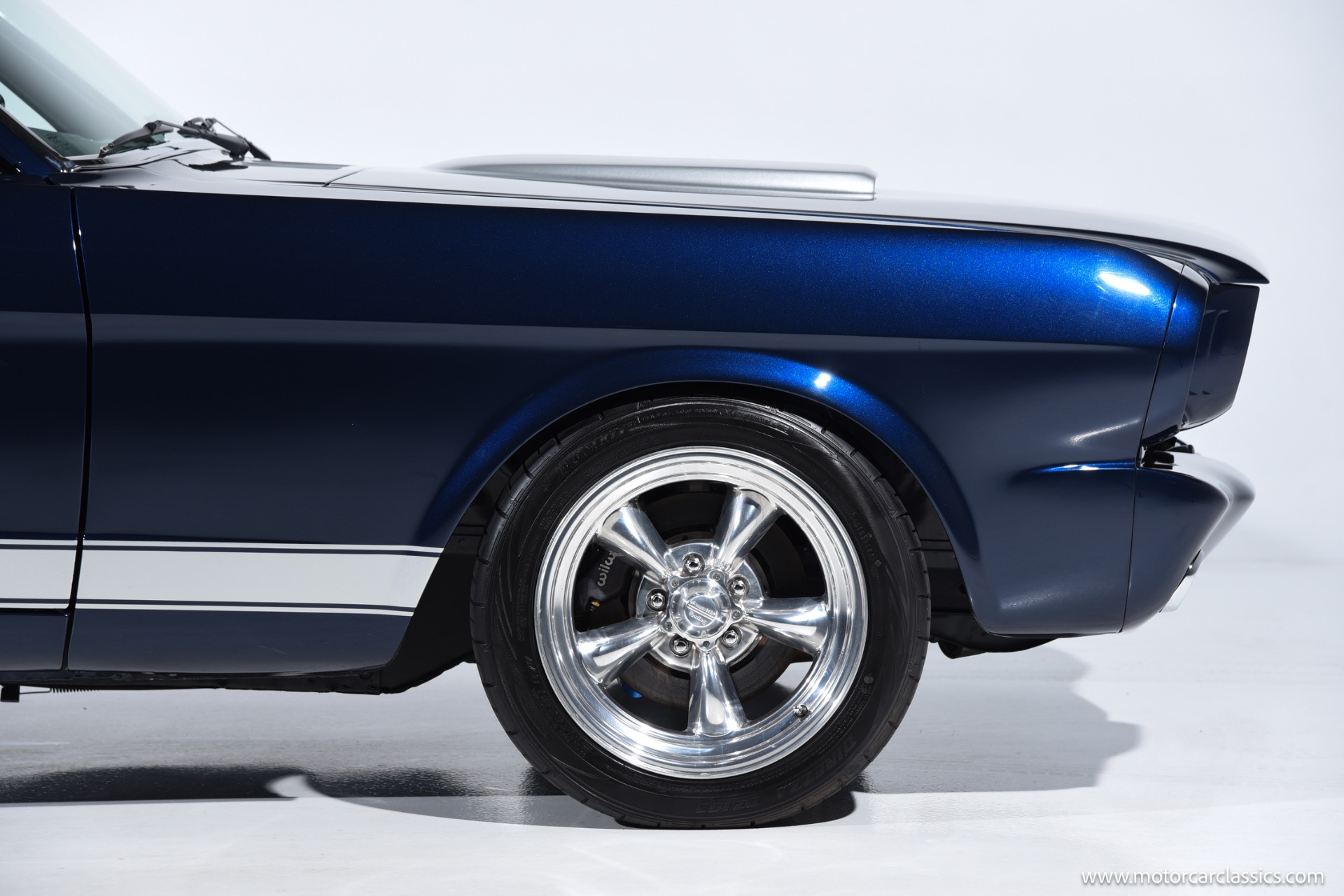 1966 Ford Mustang Resto Mod for sale! Motorcar Classics is pleased to present this 1966 Ford Mustang Coupe Resto Mod is finished in a stunning Midnight Blue Metallic with bold silver stripes, expertly blending classic Mustang style with modern performance and comfort. Under the hood is a Ford Racing Performance 5.0L/302 GT-40 aluminum head crate engine producing 340 horsepower, paired with Holley Sniper electronic fuel injection, a Holley Sniper fuel tank, dual cooling electric fans, a new aluminum radiator, JBA ceramic-coated headers, and an aluminized exhaust system with Flowmaster 50's Delta mufflers. Power is delivered through a Tremec TKO600 5-speed transmission with Modern Driveline hydraulic clutch, billet flywheel, and an 8.8 limited-slip rear axle with 3.73 gears, while reliability is enhanced with a Milodon 7-quart oil pan, Powermaster starter, and 145-amp alternator.