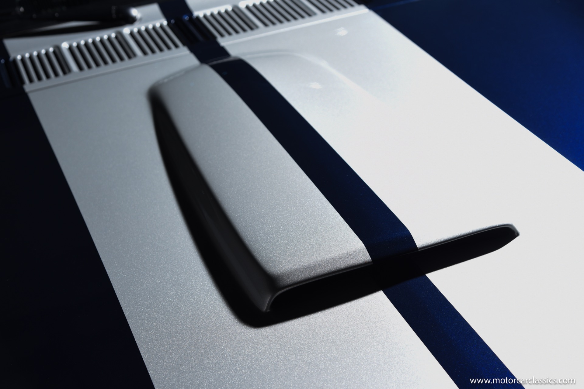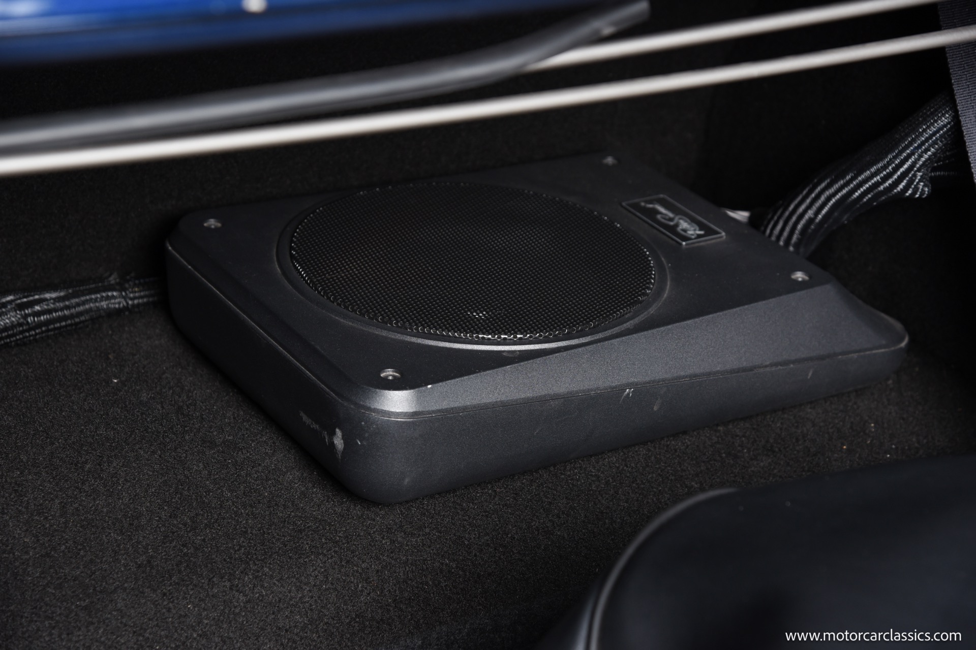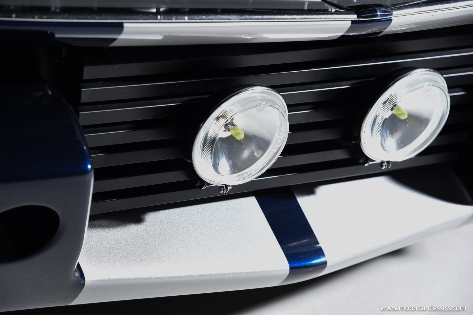 The Midnight Blue body with silver stripes is accentuated by a fiberglass front bumper and Shelby GT 350 styled fiberglass hood, DOT-legal Vision-X 7 VXLED headlights, and exceptionally tidy engine bay with hidden wiring and stainless-steel bracket supports. Interior comfort matches exterior performance, featuring Procar Elite Series bucket seats, TMI suede headliner, Corso Feroce 14 black leather Shelby GT-350 steering wheel, Flaming River tilt column, Lokar pedals, JME cluster with Auto Meter Phantom gauges, and Vintage A/C. A modern Kenwood media receiver with Bluetooth/Sirius tuner, Pioneer 2000-watt amp, subwoofer, and premium speakers provide outstanding audio, and safety is upgraded with 3-point seatbelts for both front and rear passengers.