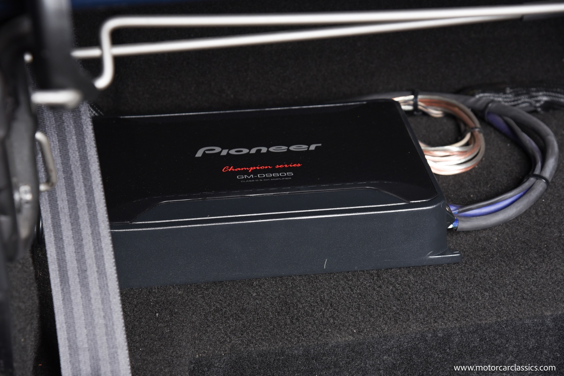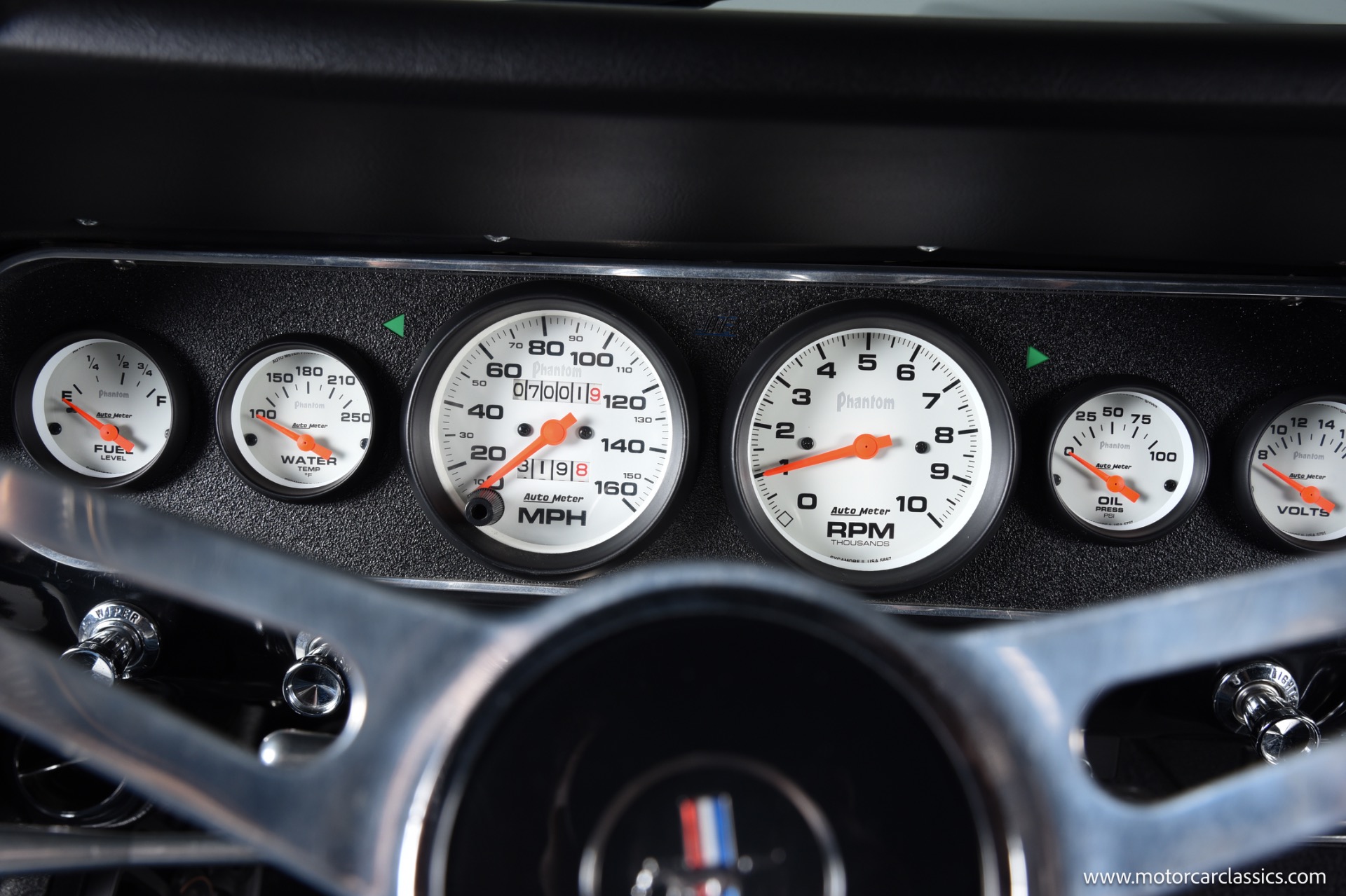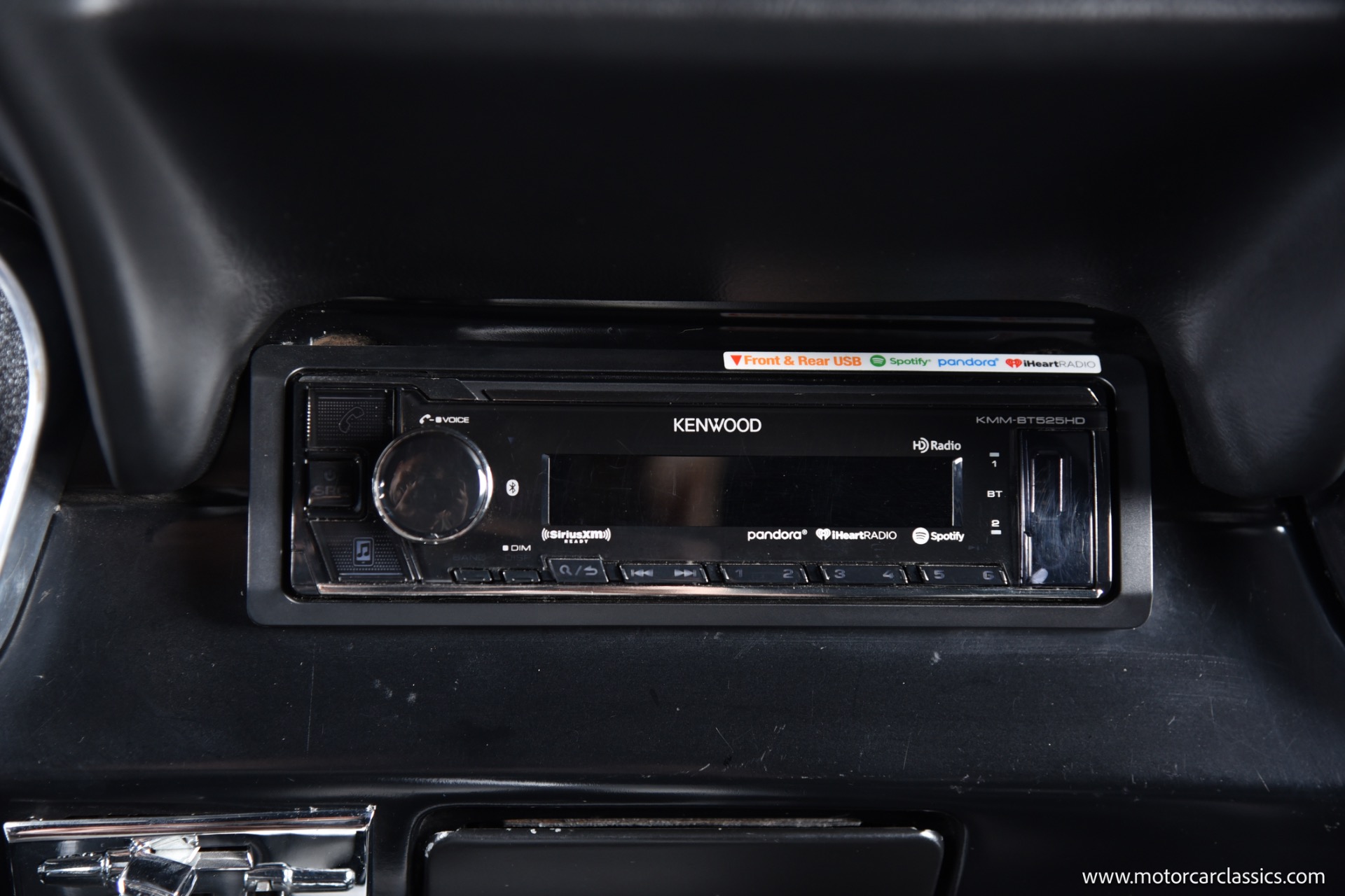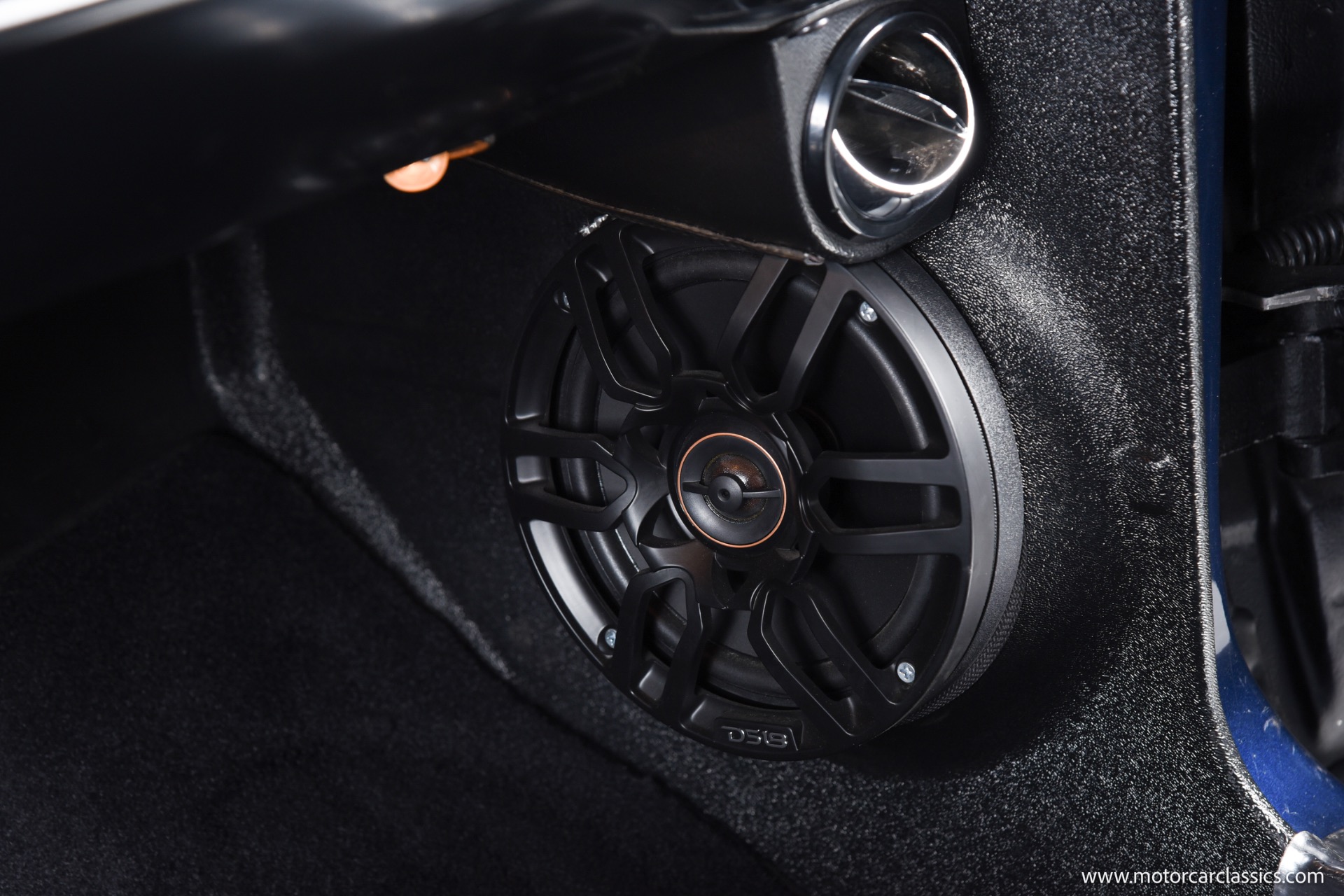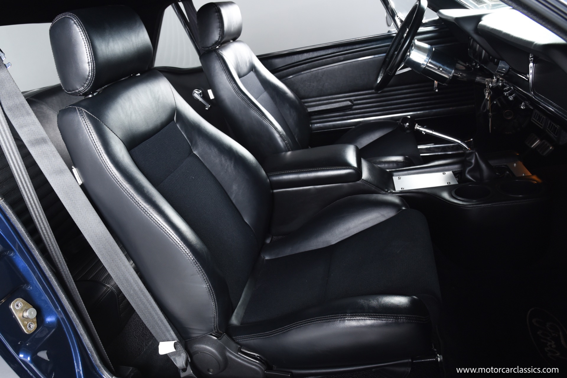 The Midnight Blue body with silver stripes is accentuated by a fiberglass front bumper and Shelby GT 350 styled fiberglass hood, DOT-legal Vision-X 7 VXLED headlights, and exceptionally tidy engine bay with hidden wiring and stainless-steel bracket supports. Interior comfort matches exterior performance, featuring Procar Elite Series bucket seats, TMI suede headliner, Corso Feroce 14 black leather Shelby GT-350 steering wheel, Flaming River tilt column, Lokar pedals, JME cluster with Auto Meter Phantom gauges, and Vintage A/C. A modern Kenwood media receiver with Bluetooth/Sirius tuner, Pioneer 2000-watt amp, subwoofer, and premium speakers provide outstanding audio, and safety is upgraded with 3-point seatbelts for both front and rear passengers.