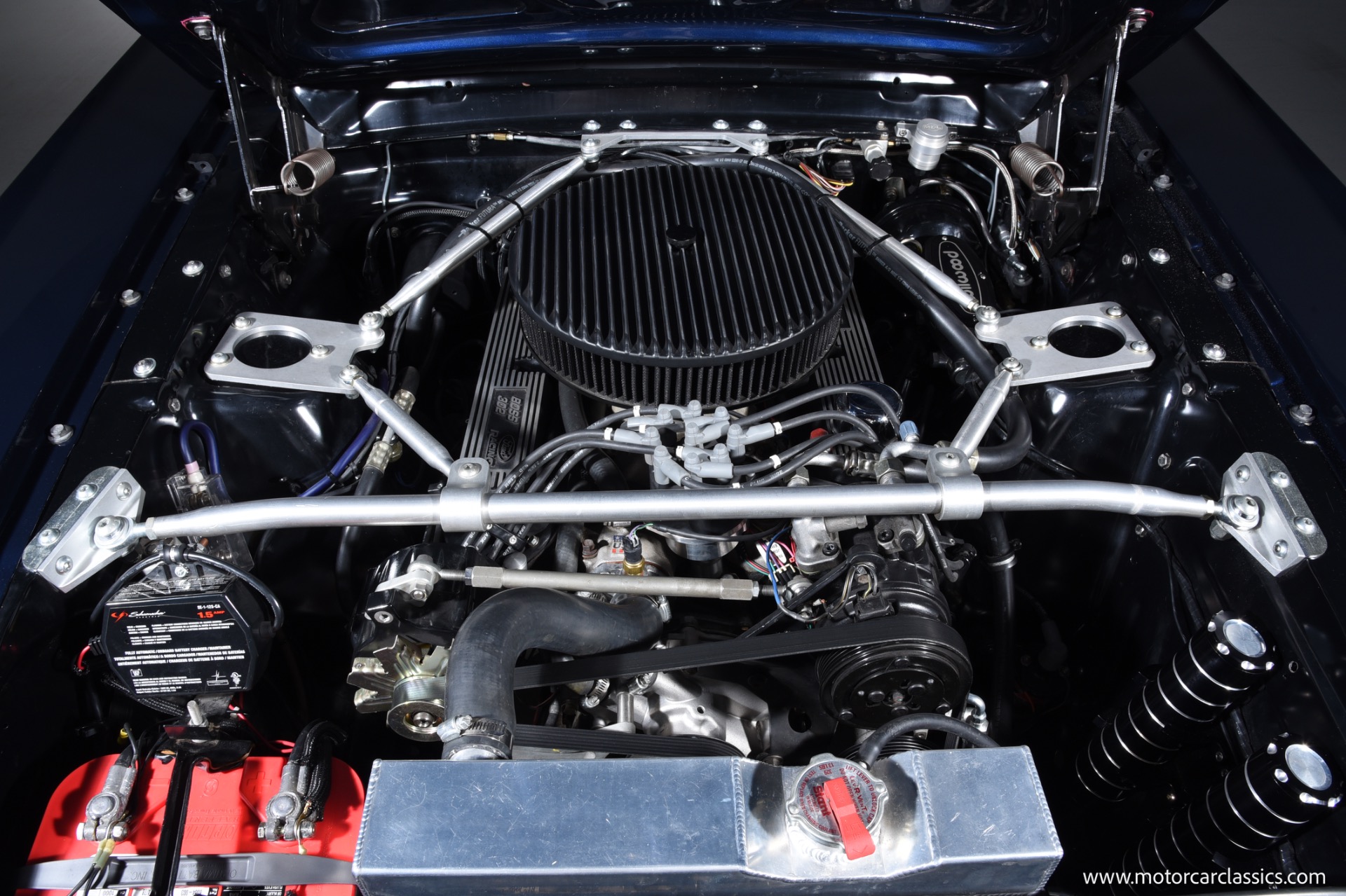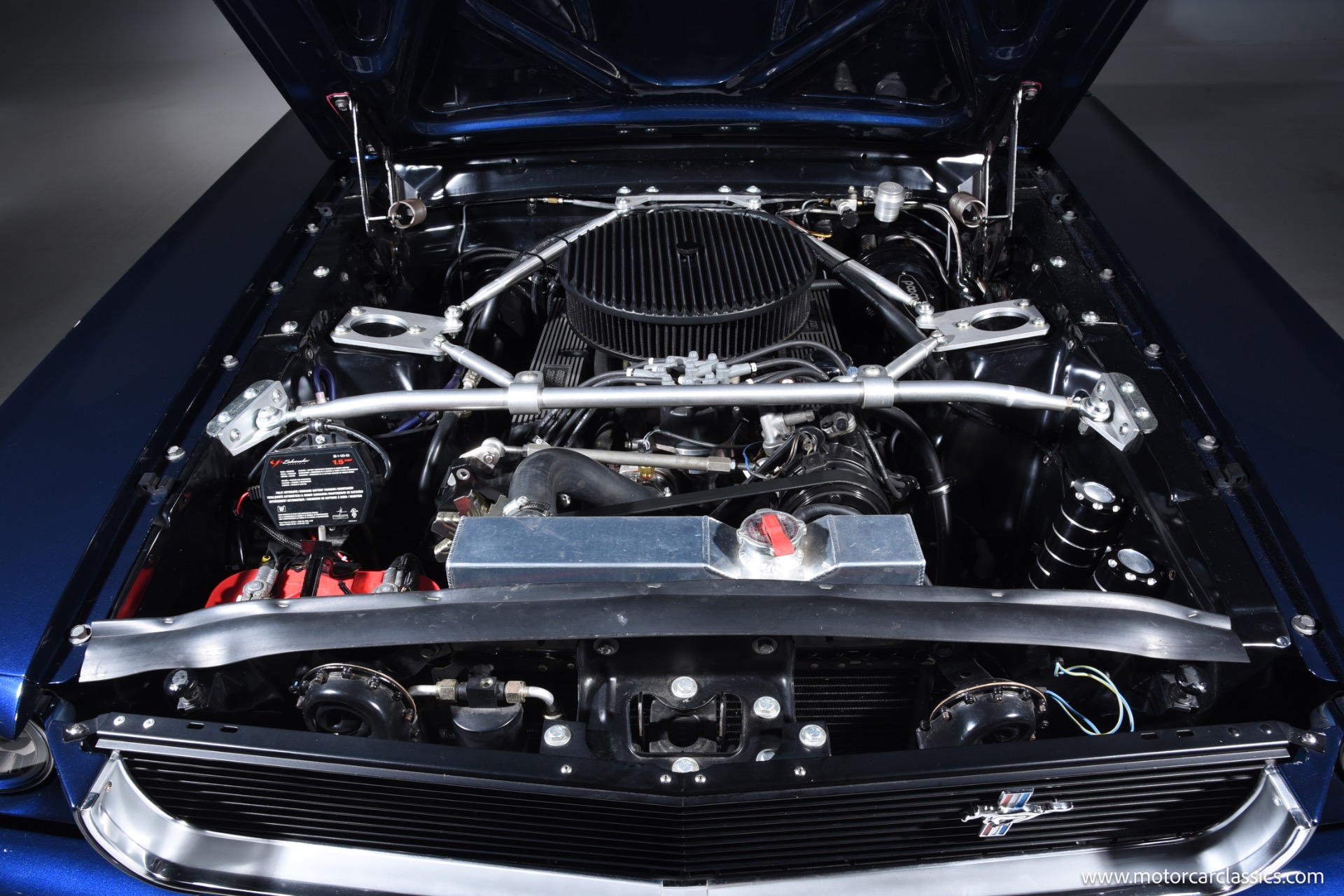 1966 Ford Mustang Resto Mod for sale! Motorcar Classics is pleased to present this 1966 Ford Mustang Coupe Resto Mod is finished in a stunning Midnight Blue Metallic with bold silver stripes, expertly blending classic Mustang style with modern performance and comfort. Under the hood is a Ford Racing Performance 5.0L/302 GT-40 aluminum head crate engine producing 340 horsepower, paired with Holley Sniper electronic fuel injection, a Holley Sniper fuel tank, dual cooling electric fans, a new aluminum radiator, JBA ceramic-coated headers, and an aluminized exhaust system with Flowmaster 50's Delta mufflers. Power is delivered through a Tremec TKO600 5-speed transmission with Modern Driveline hydraulic clutch, billet flywheel, and an 8.8 limited-slip rear axle with 3.73 gears, while reliability is enhanced with a Milodon 7-quart oil pan, Powermaster starter, and 145-amp alternator.