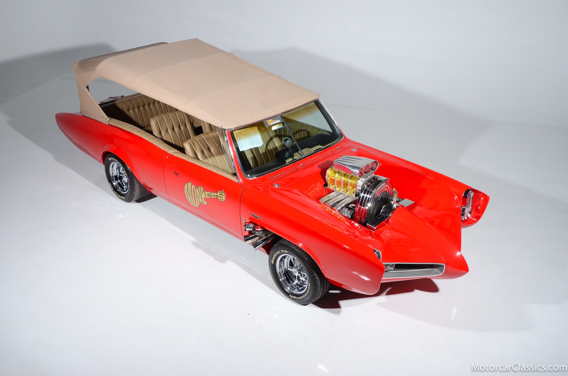 Monkees Mobile for sale! Motorcar Classics is pleased to offer this one-of-a-kind Monkees Mobile/Monkeemobile. There is no doubt which is the most famous Pontiac GTO in the world. Though many of us Pontiac fans might look at the original '64 Royal Bobcat or perhaps one of Arnie "The Farmer" Beswick's racecars, the truth is there is one even more well-knownone that has woven itself into the fabric of American pop culture. The ironic thing is that most people don't realize the Monkeemobile was actually a '66 GTO. This vehicle was the number 3 vehicle used on the television show The Monkees. The car was restored by a representative of renowned car builder George Barris on the East Coast. The car was later used to travel in and out of the country as one of George Barriss promotional vehicles and part of his star collection. This vehicle is as it was in the TV series, The Monkees and no alterations to the actual design features have been made, with the exception of the alterations to the frame and suspension and the removable roof, which is now made to be removed more easily, and was licensed by George Barris and Rhino Pictures. This car has been used by all of the members of The Monkees and has done appearances on many occasions as a feature vehicle on TV shows and used as a feature vehicle at the New York Worlds Fair Anniversary. The car is a modified 1966 Pontiac GTO. George Barris has often said that this was the number one vehicle. Your inspection is invited!