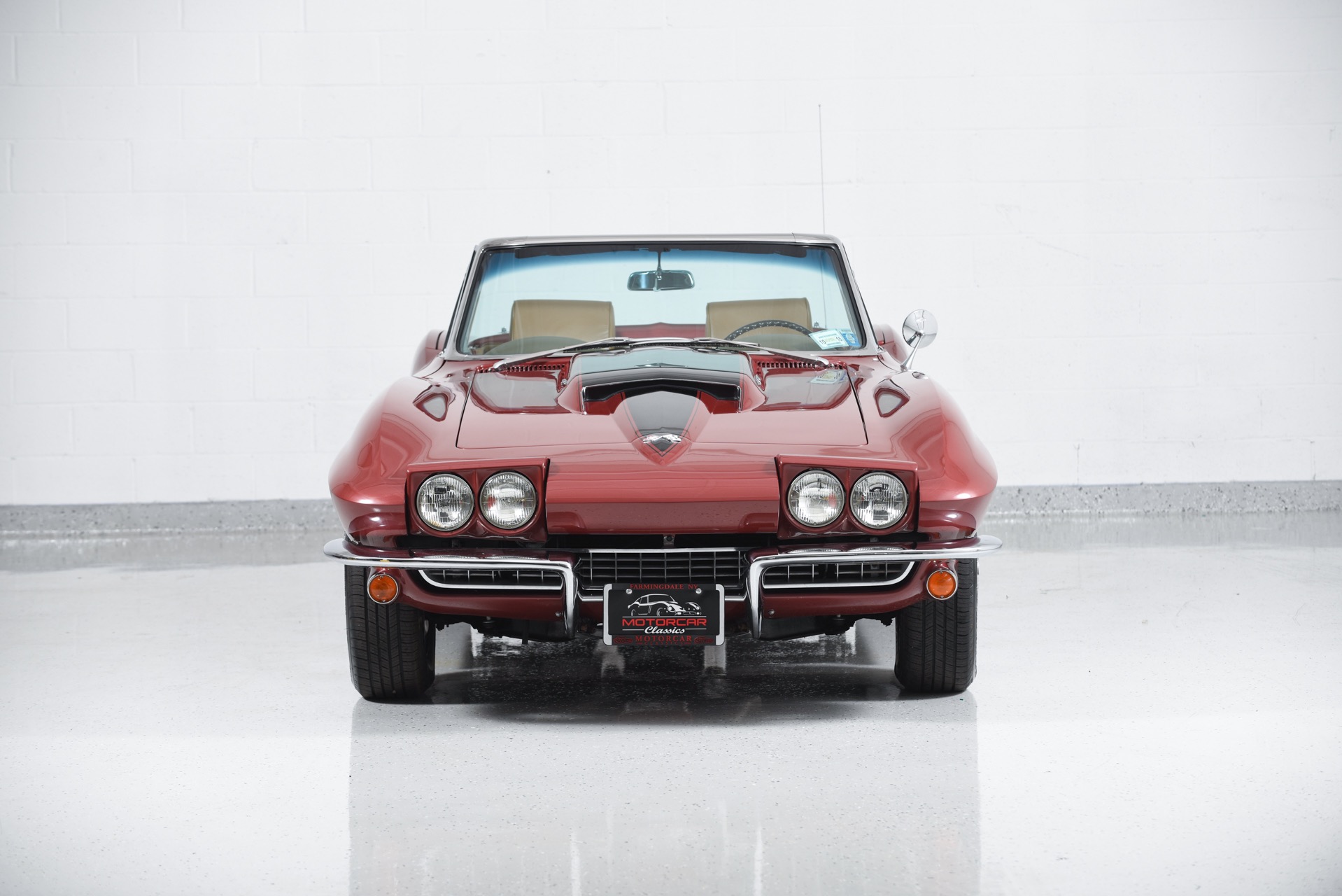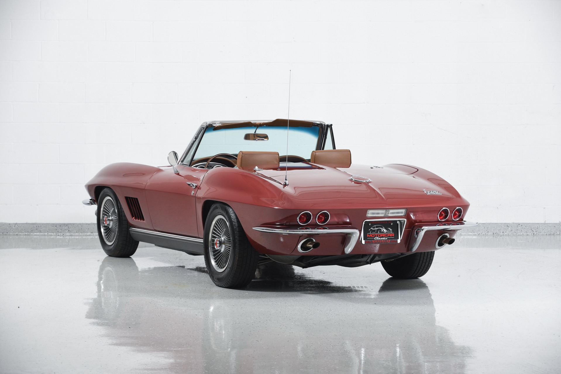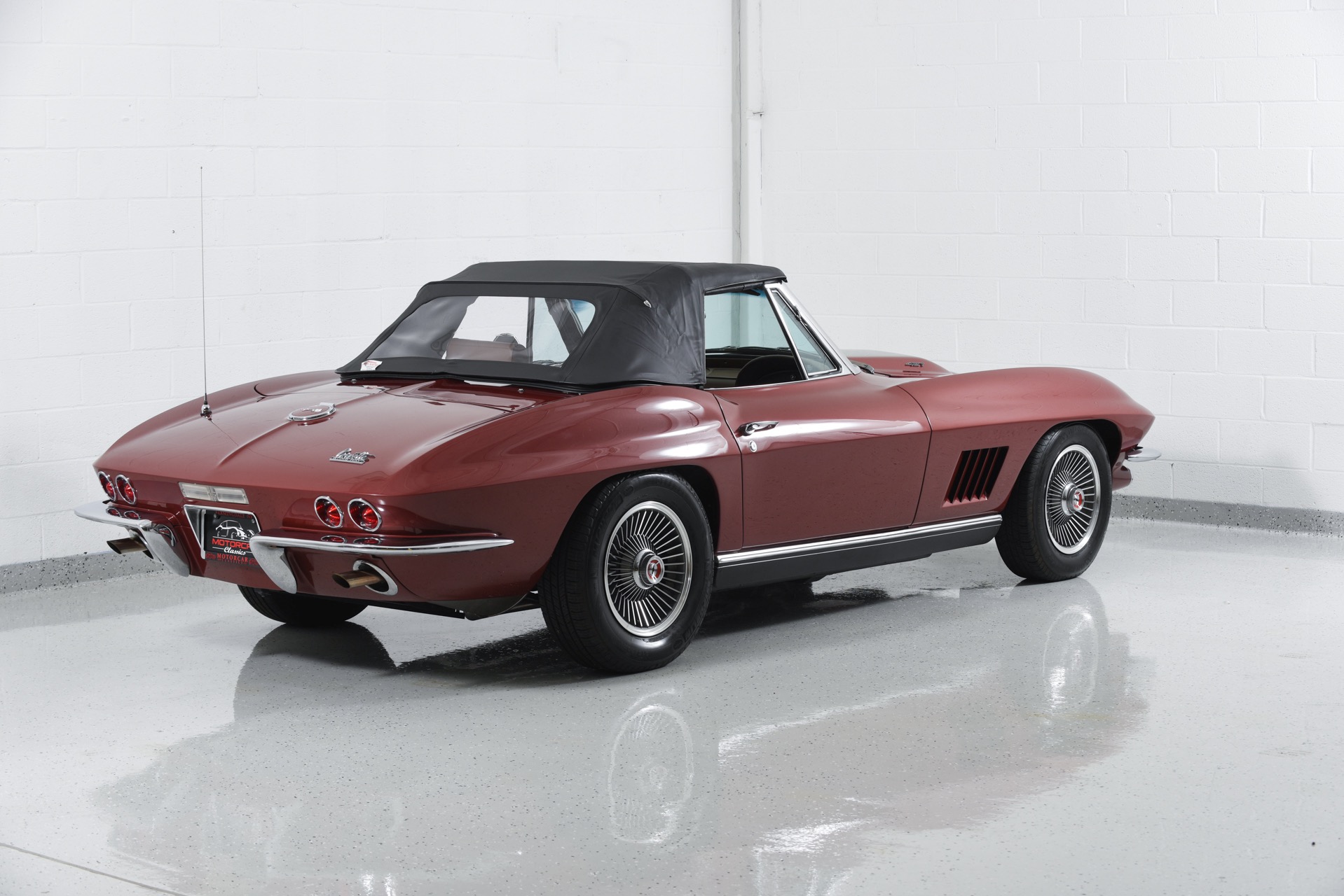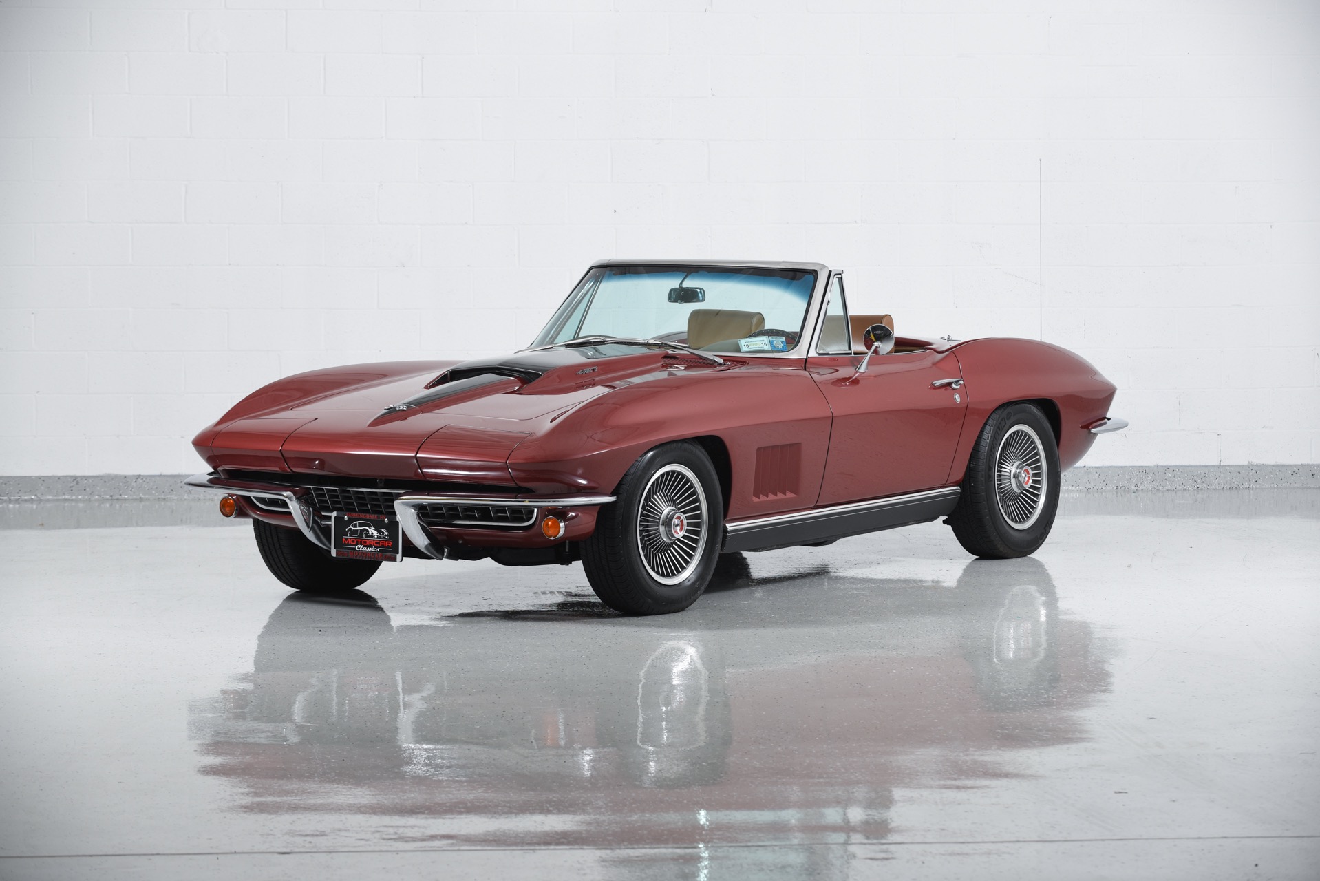 1967 CHEVROLET CORVETTE ROADSTER for sale. Motorcar Classics is proud to present this magnificent 1967 Chevrolet Corvette Roadster featured in Marlboro maroon with Saddle interior. This car has a meticulous nut & bolt frame-off restoration. It is powered by the L71 427CI/435HP V8 with 4-speed manual gearbox. Options include leather seats, cast aluminum bolt-on wheels, AM/FM RADIO and rare headrests. It has a Black convertible top and Black stinger hood. This is a matching numbers car with all original mechanical components and a body that has never been hit or damaged. It is a superb big-block example from arguably the most desirable model year.