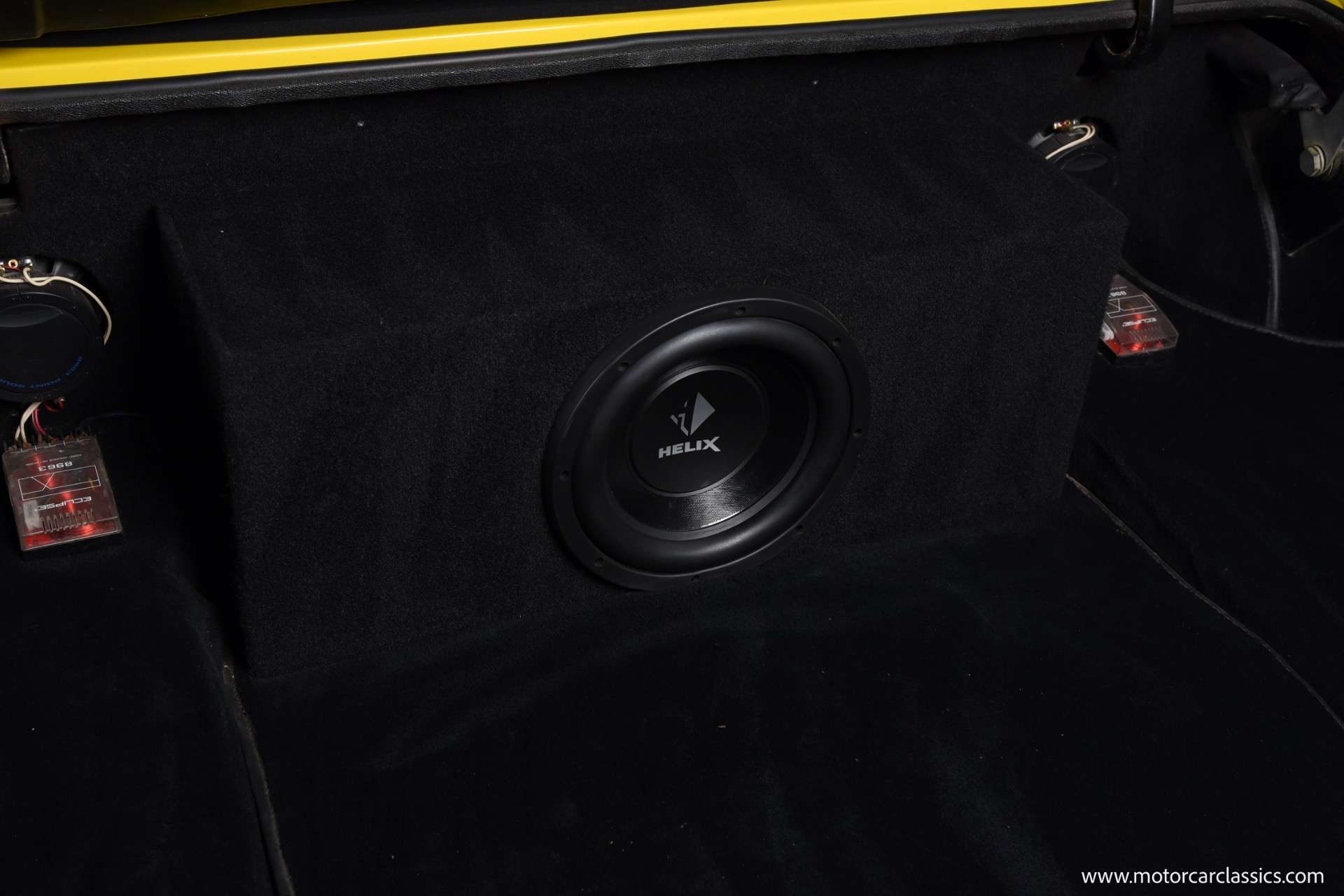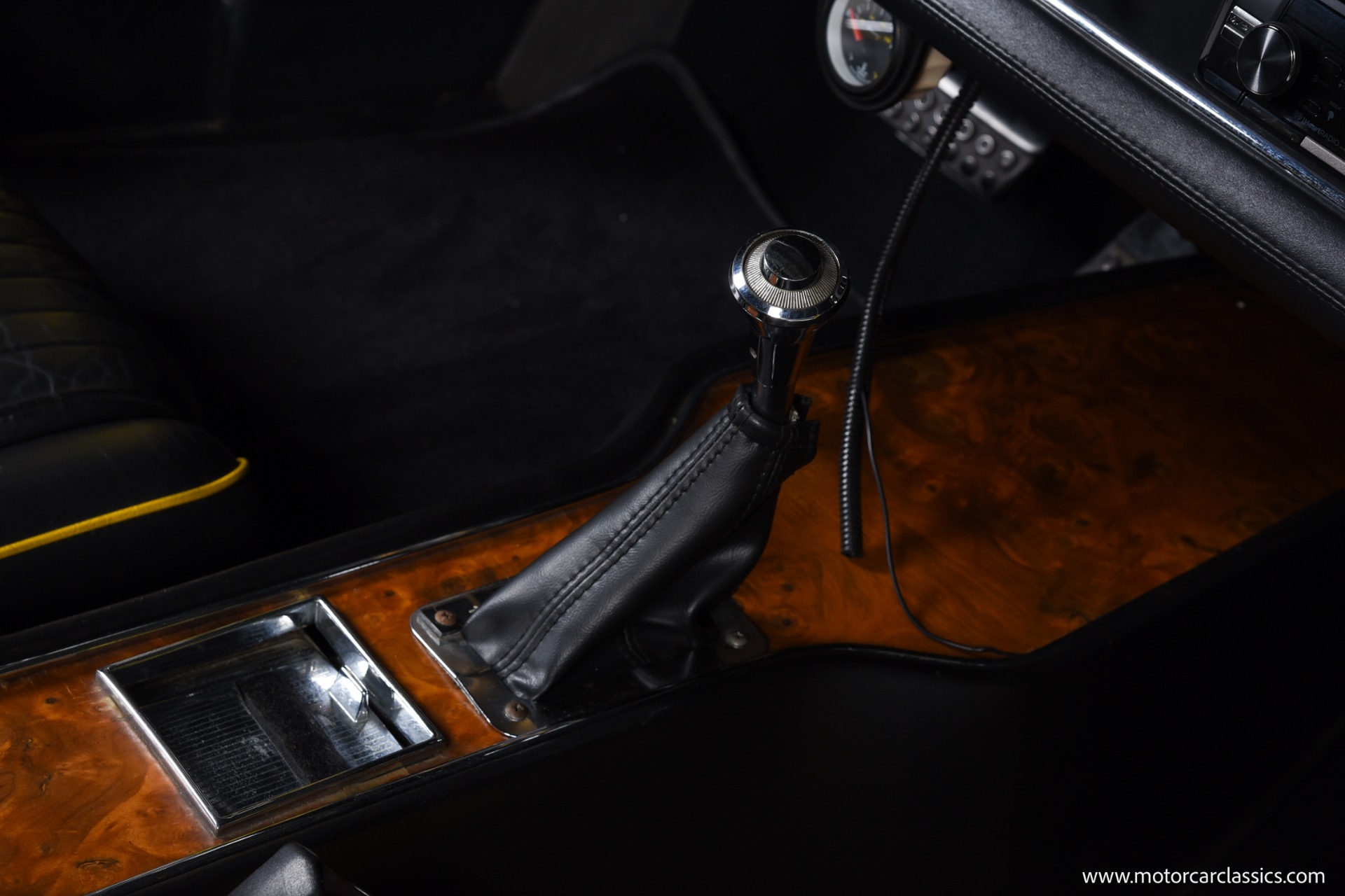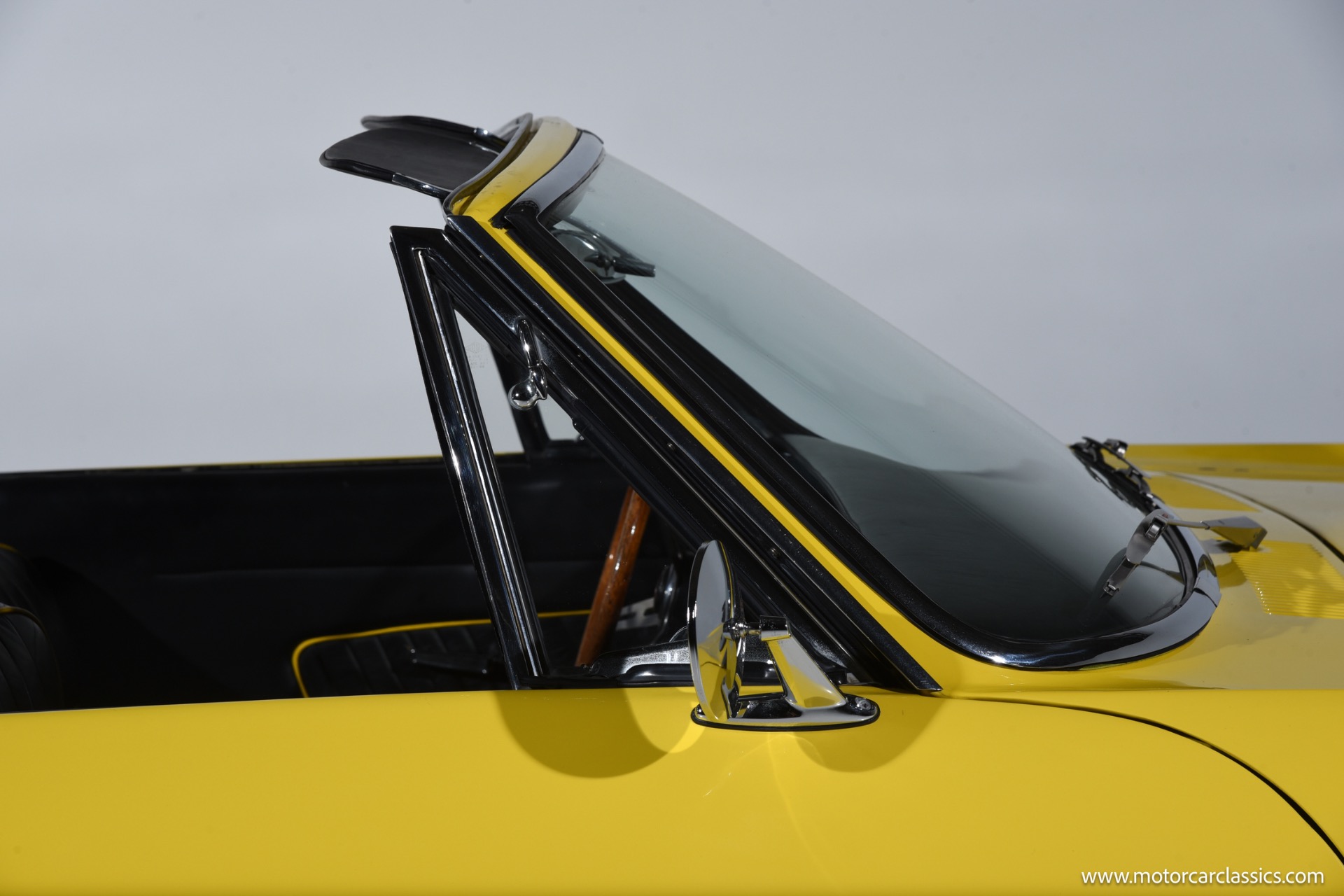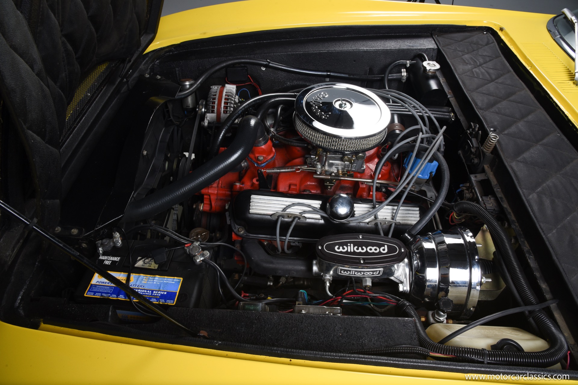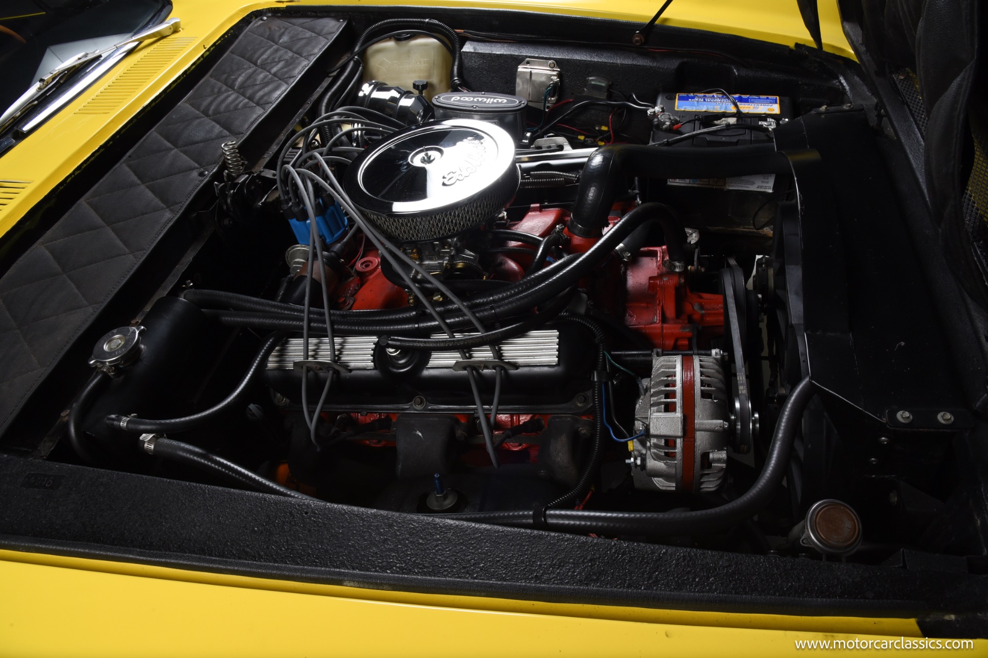 Cosmetically, the car benefits from a high-quality repaint in its original yellow, a fully re-trimmed black interior with matching yellow piping, rebuilt factory instruments with distinctive copper Ghia bezels, new carpeting, and a tidy engine bay housing the Edelbrock-carbureted Commando V8 and neatly routed dual-exhaust plumbing. The manually operated black soft top, unique exterior push-button door handles, wood-rimmed Ferrero steering wheel, and factory-style Borrani wires present cleanly and function as intended, while a Kenwood AM/FM/Bluetooth stereo with added door and trunk speakers and an auxiliary under-dash temperature gauge subtly modernize usability without distracting from the period ambiance.