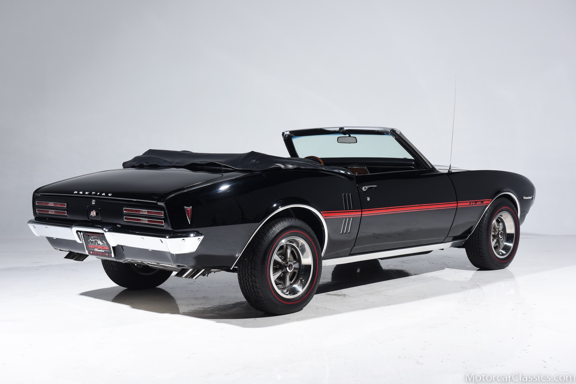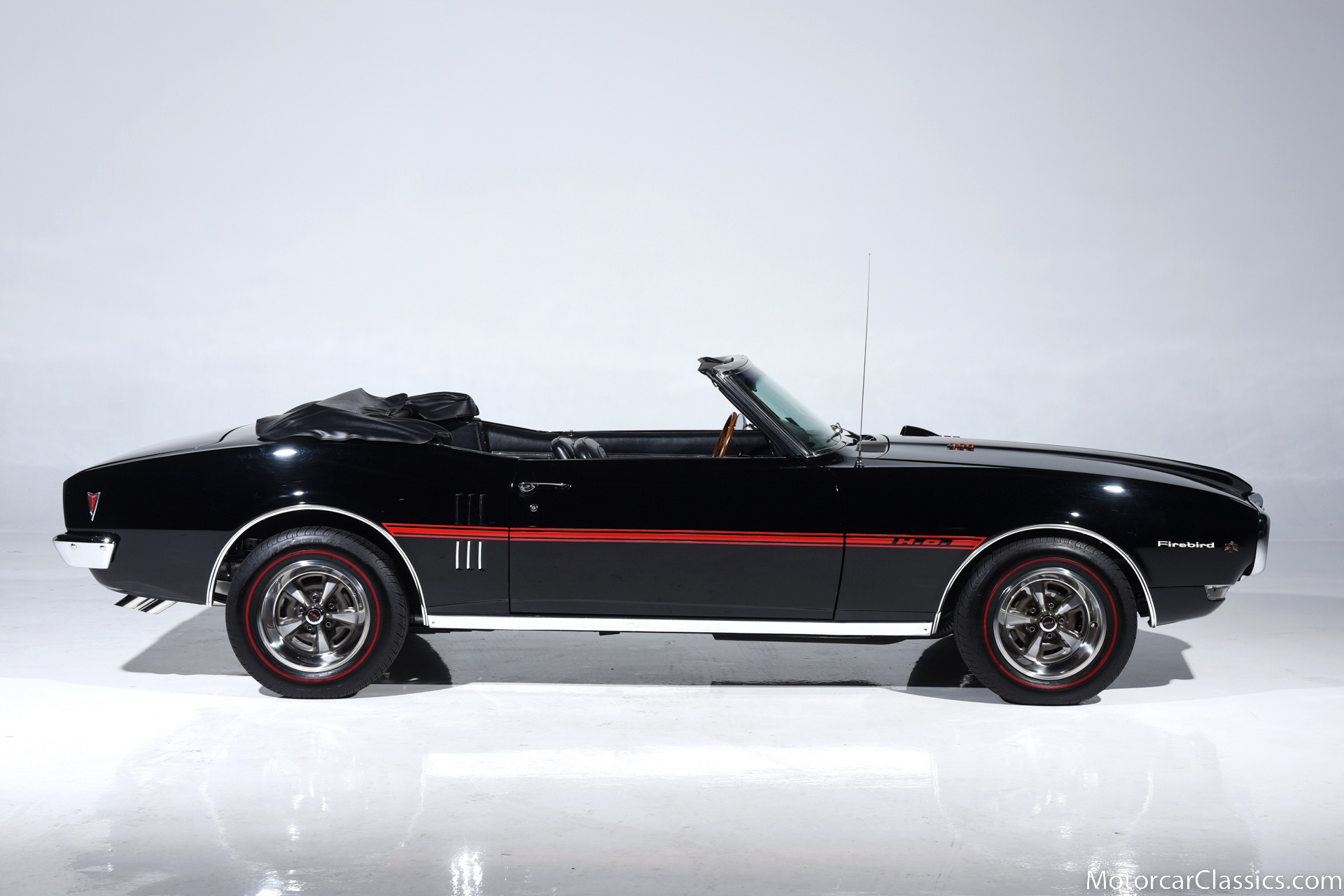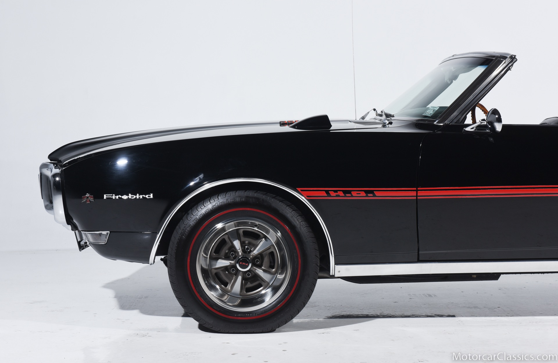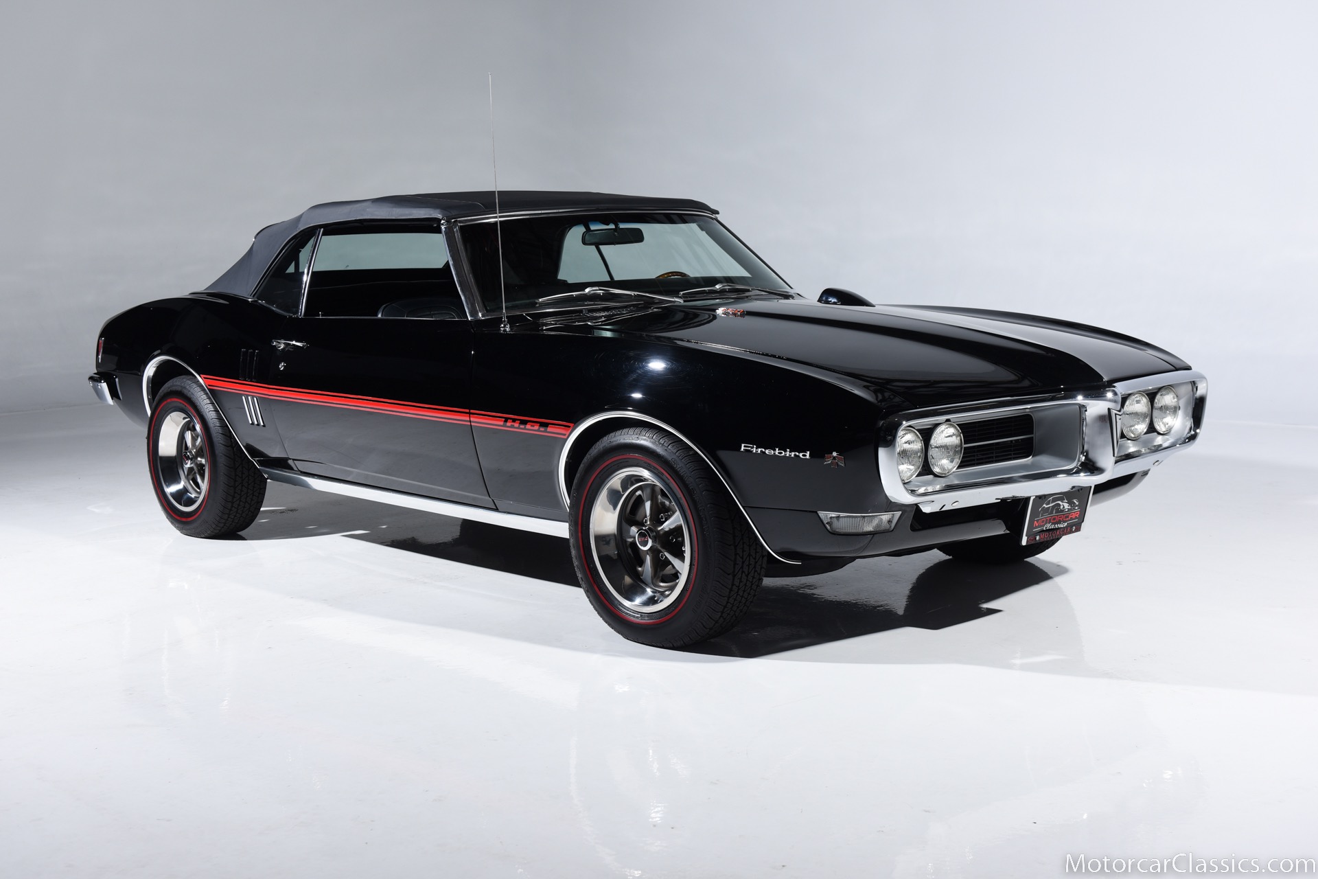 1968 Pontiac Firebird HO for sale! Motorcar Classics is proud to present this rare, triple-black 1968 Pontiac Firebird 350 HO convertible. This handsome Firebird has been the subject of a nut & bolt rotisserie restoration to its original and authentic configuration with the original motor and transmission. The car includes PHS Documentation and the window sticker. This car features the 350 CI engine rated at 320 HP mated to a 4-speed manual transmission. Fewer than 500 Firebird 350 HO convertibles were built in 1968, and fewer than 200 had the 4-speed manual. With the similarly rare triple-black color combination, you will find very few others like this. Additional factory options include: power front disc brakes, power steering. hood mounted tachometer, and HO side stripes, and more. Restoration upgrades include stainless steel brake and fuel lines, gas tank and dual stainless steel exhaust system. The car is beautifully detailed and the stance is just right. This is a rare Firebird that you can drive or show with pride.