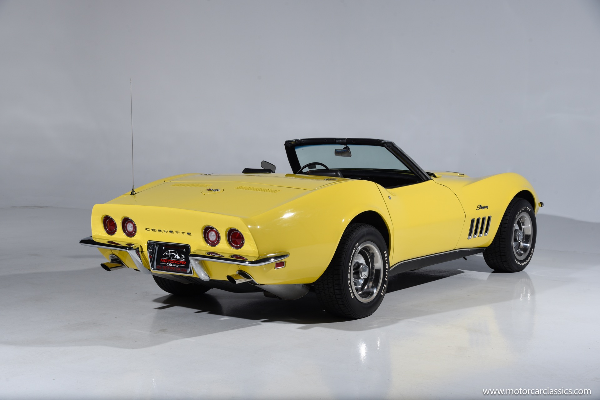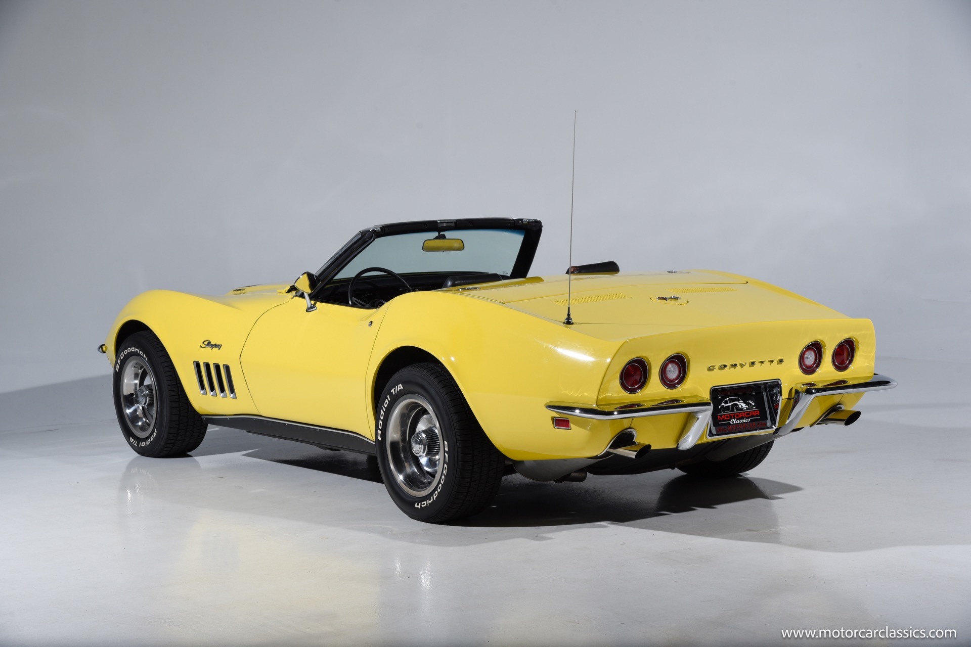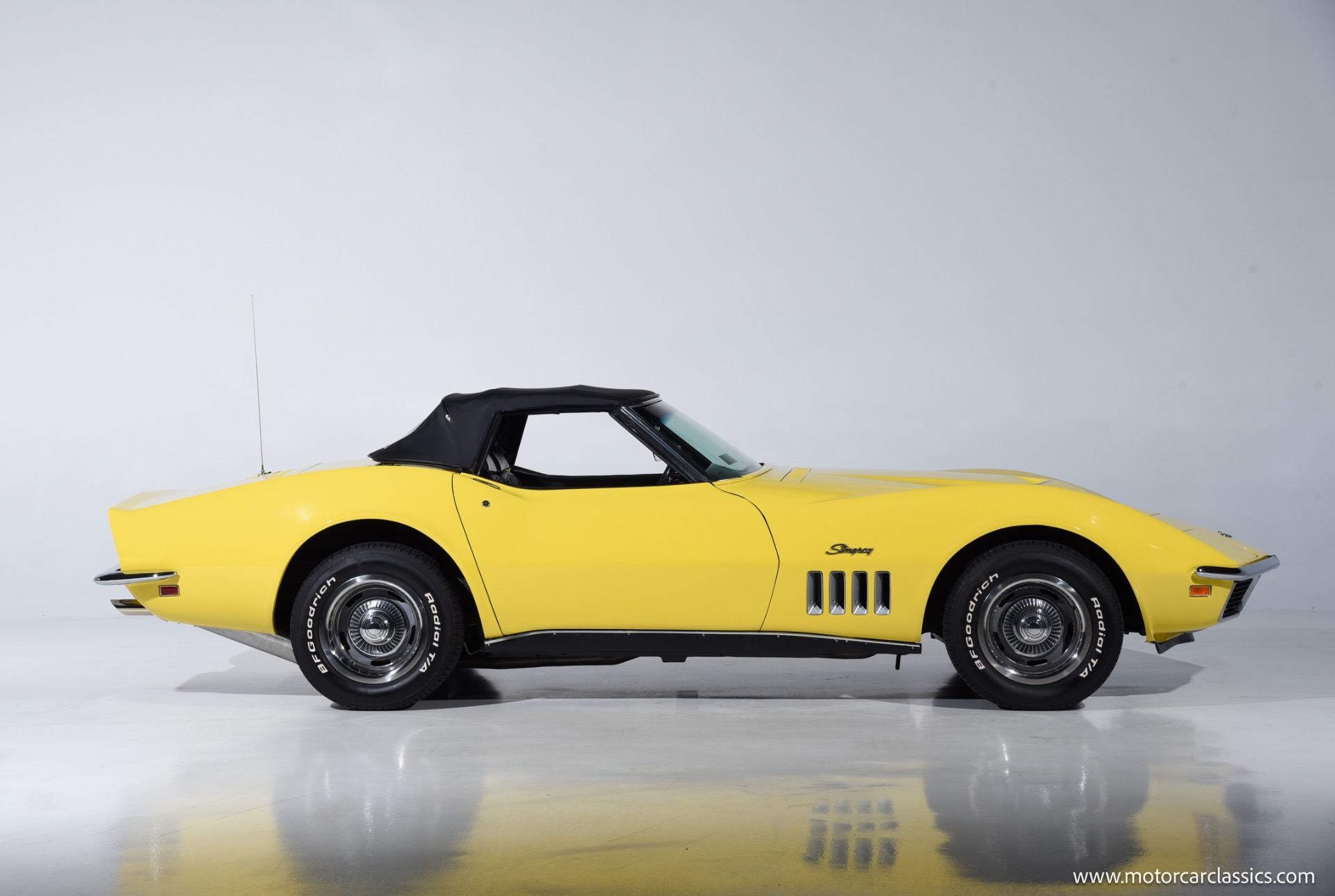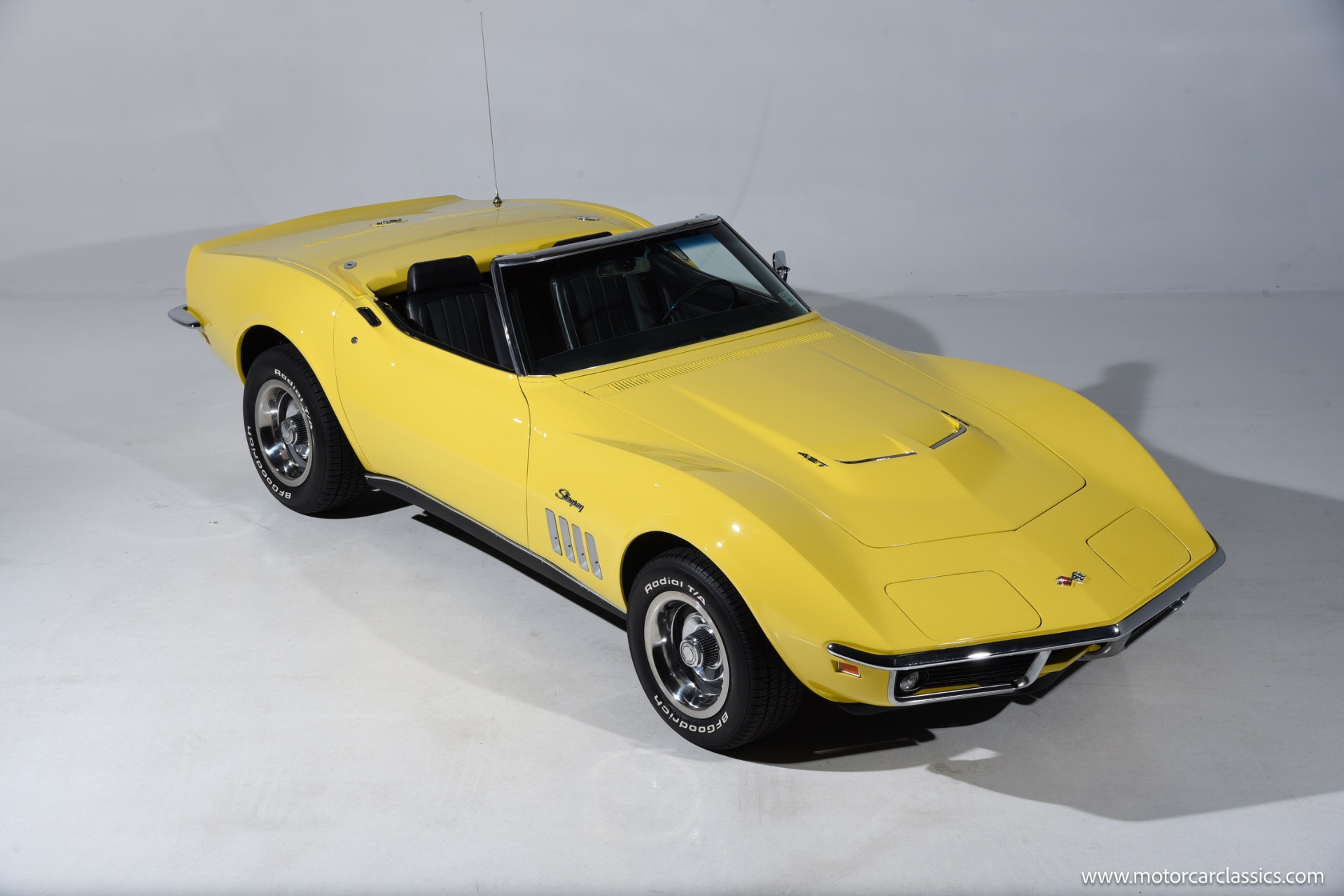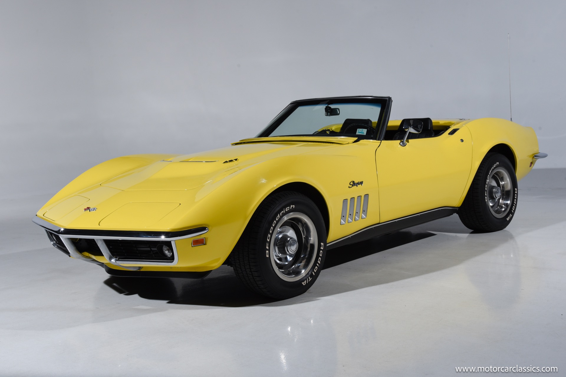 1969 Corvette 427 for sale! Motorcar Classics is pleased to present this restored 1969 Chevrolet Corvette convertible combining classic styling with big-block power, featuring a 427 CI engine rated at 390 horsepower paired with a 4-speed transmission for an authentic muscle car driving experience. While not a numbers matching engine, this Corvette retains its appeal with strong performance and desirable options including power brakes. Finished in bold Daytona Yellow with a contrasting black interior and black convertible top, it captures the true late-'60s Corvette look. A striking example of Chevrolet's iconic big-block convertible, ready to be driven and enjoyed. Your inspection is invited!