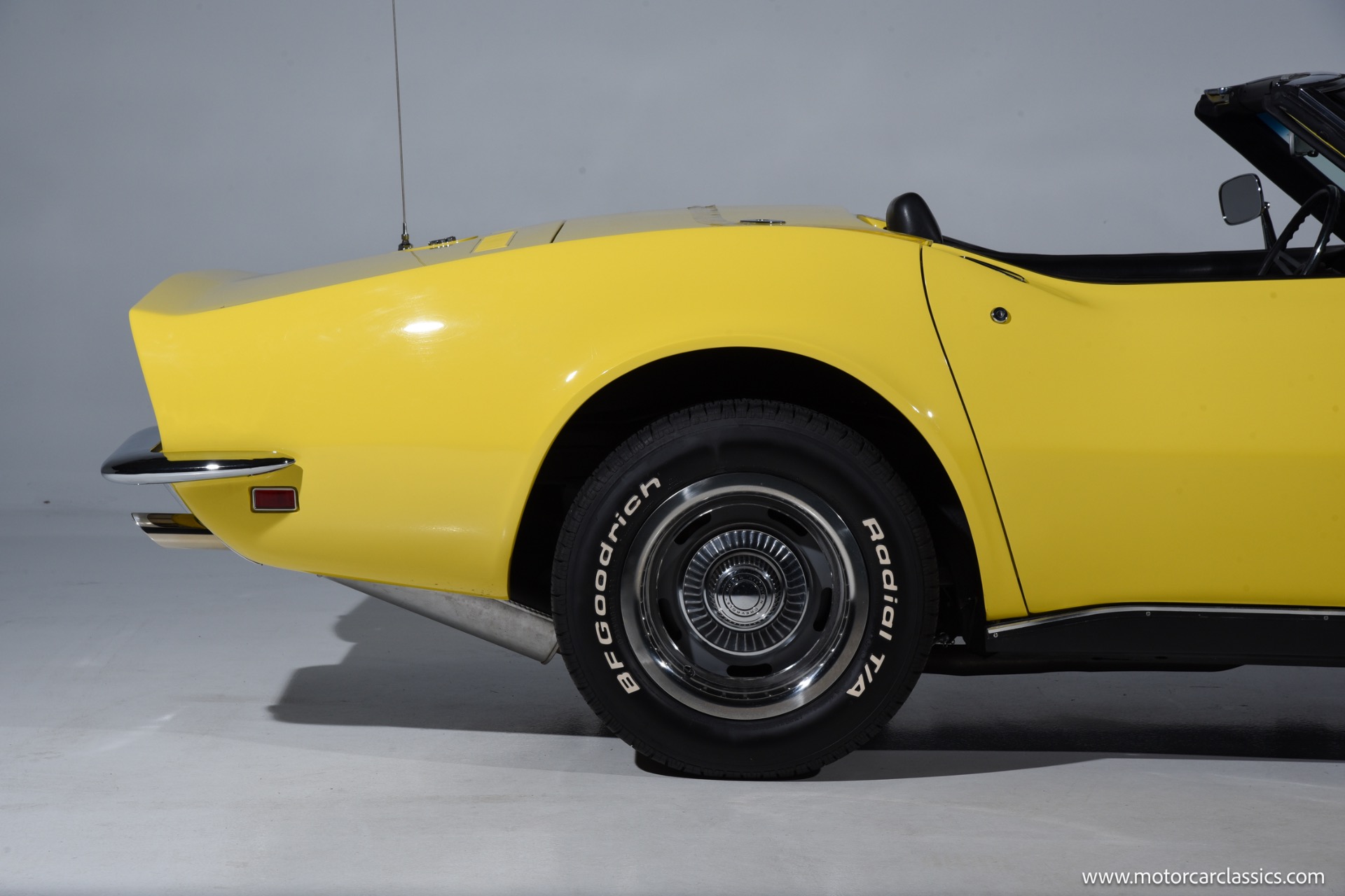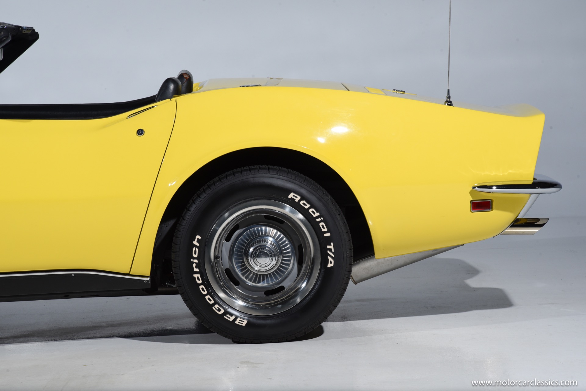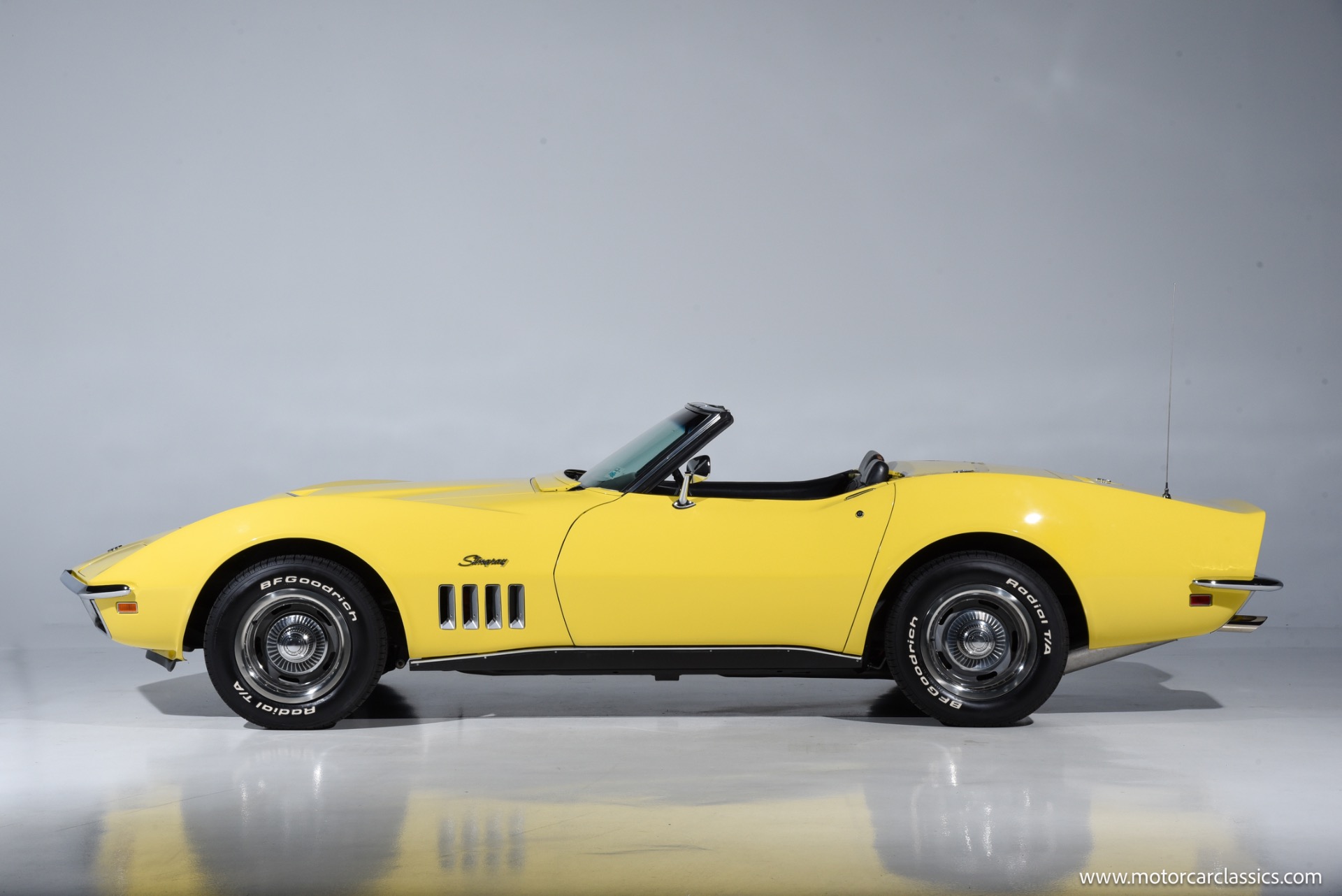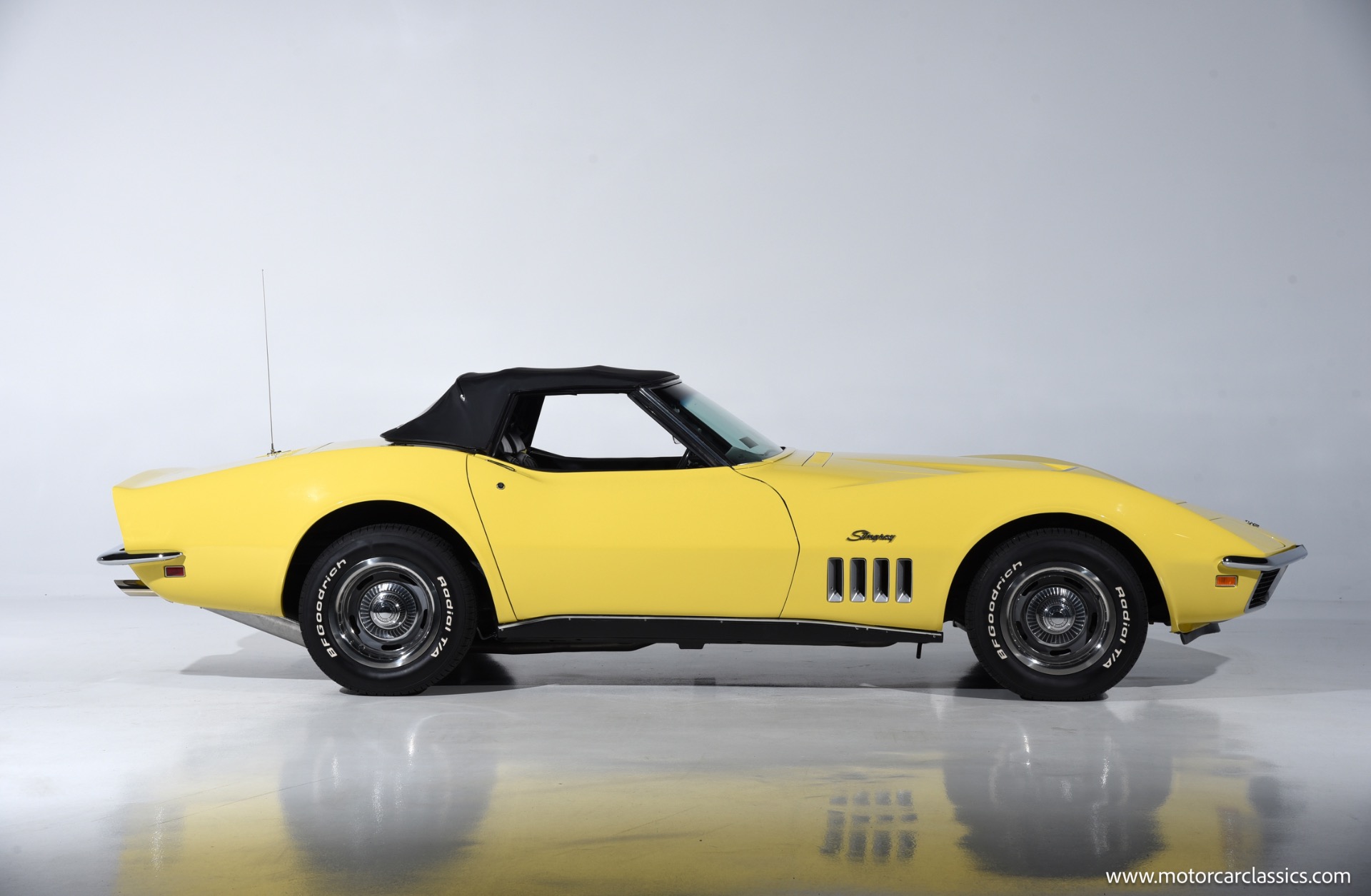 1969 Corvette 427 for sale! Motorcar Classics is pleased to present this restored 1969 Chevrolet Corvette convertible combining classic styling with big-block power, featuring a 427 CI engine rated at 390 horsepower paired with a 4-speed transmission for an authentic muscle car driving experience. While not a numbers matching engine, this Corvette retains its appeal with strong performance and desirable options including power brakes. Finished in bold Daytona Yellow with a contrasting black interior and black convertible top, it captures the true late-'60s Corvette look. A striking example of Chevrolet's iconic big-block convertible, ready to be driven and enjoyed. Your inspection is invited!