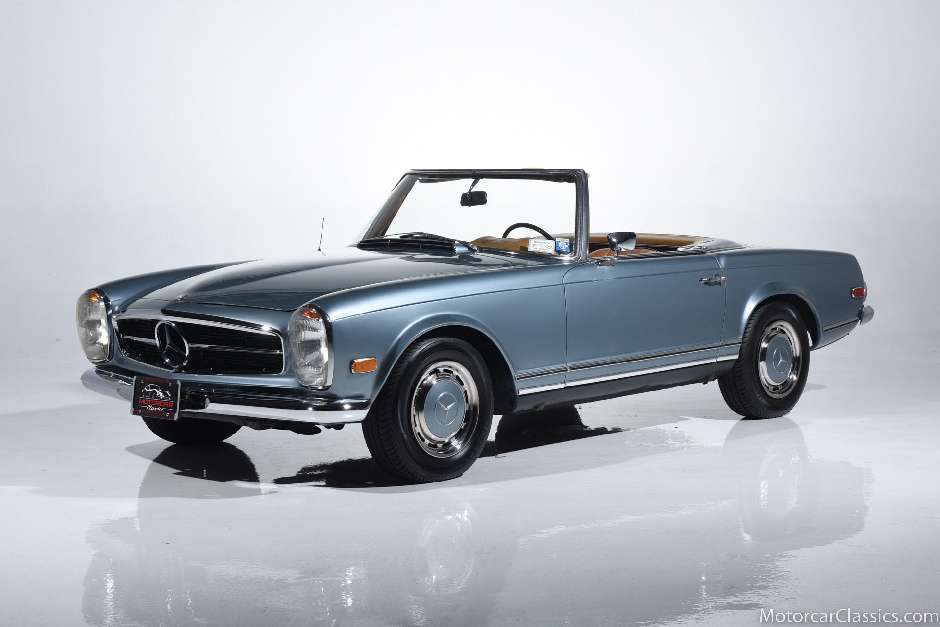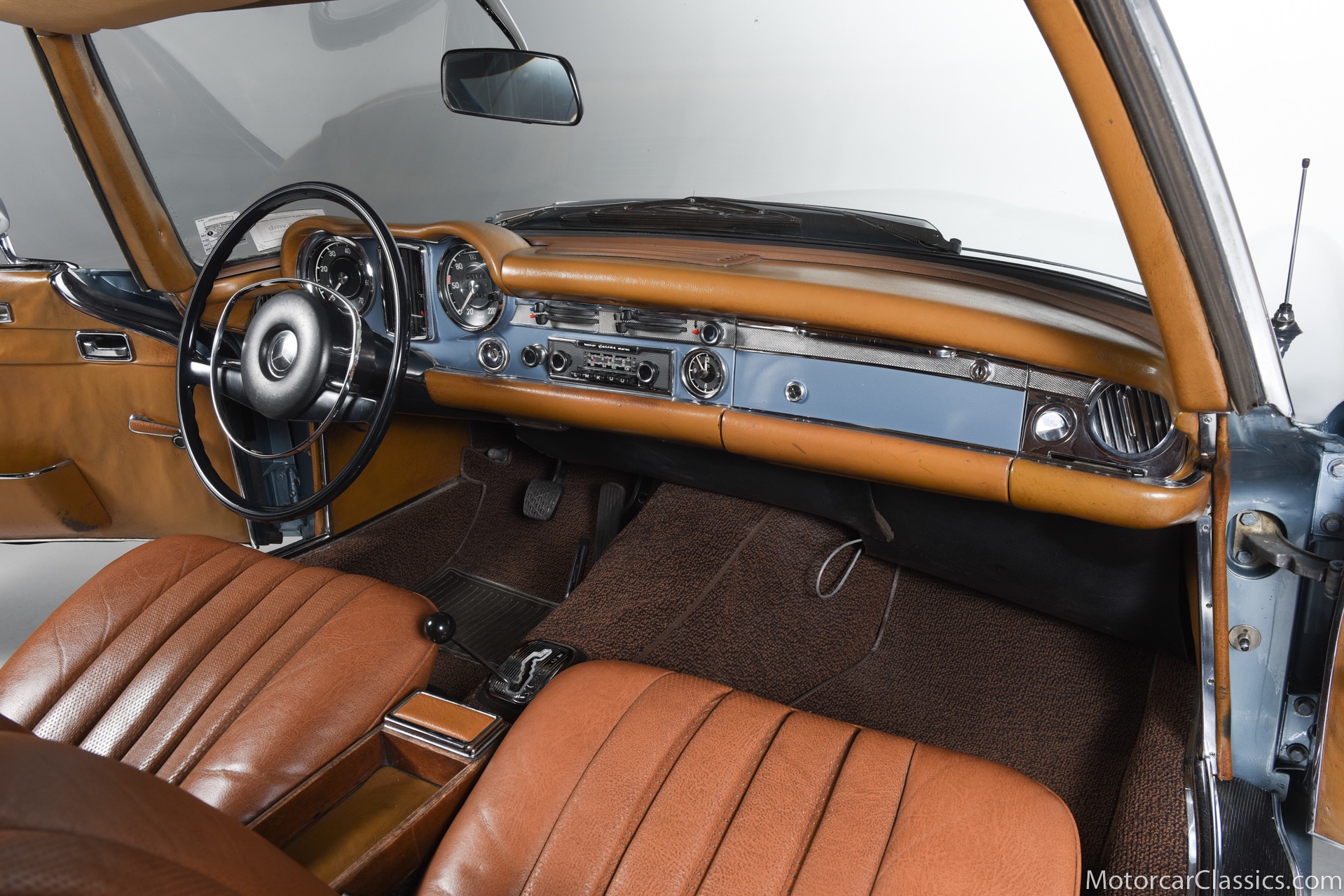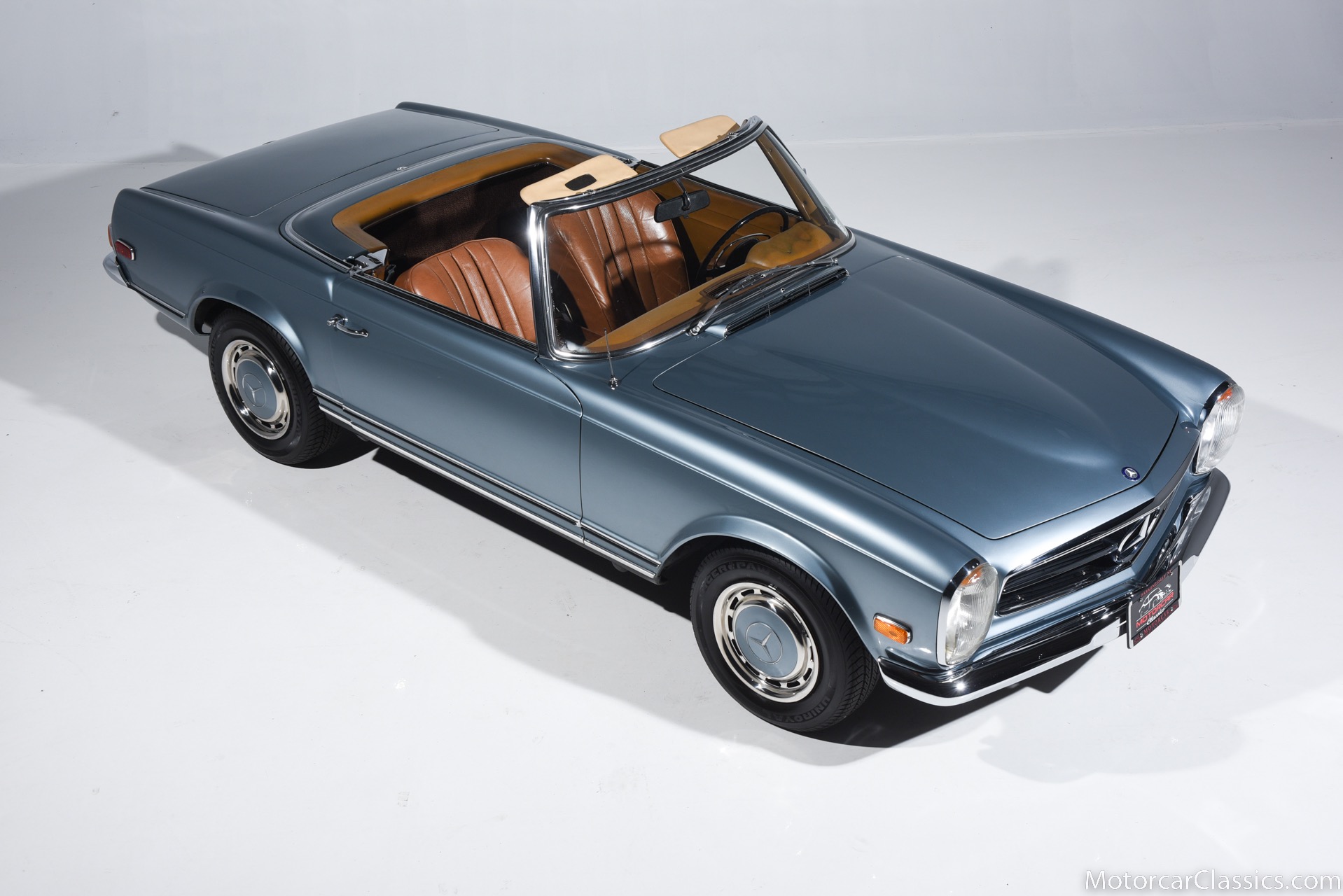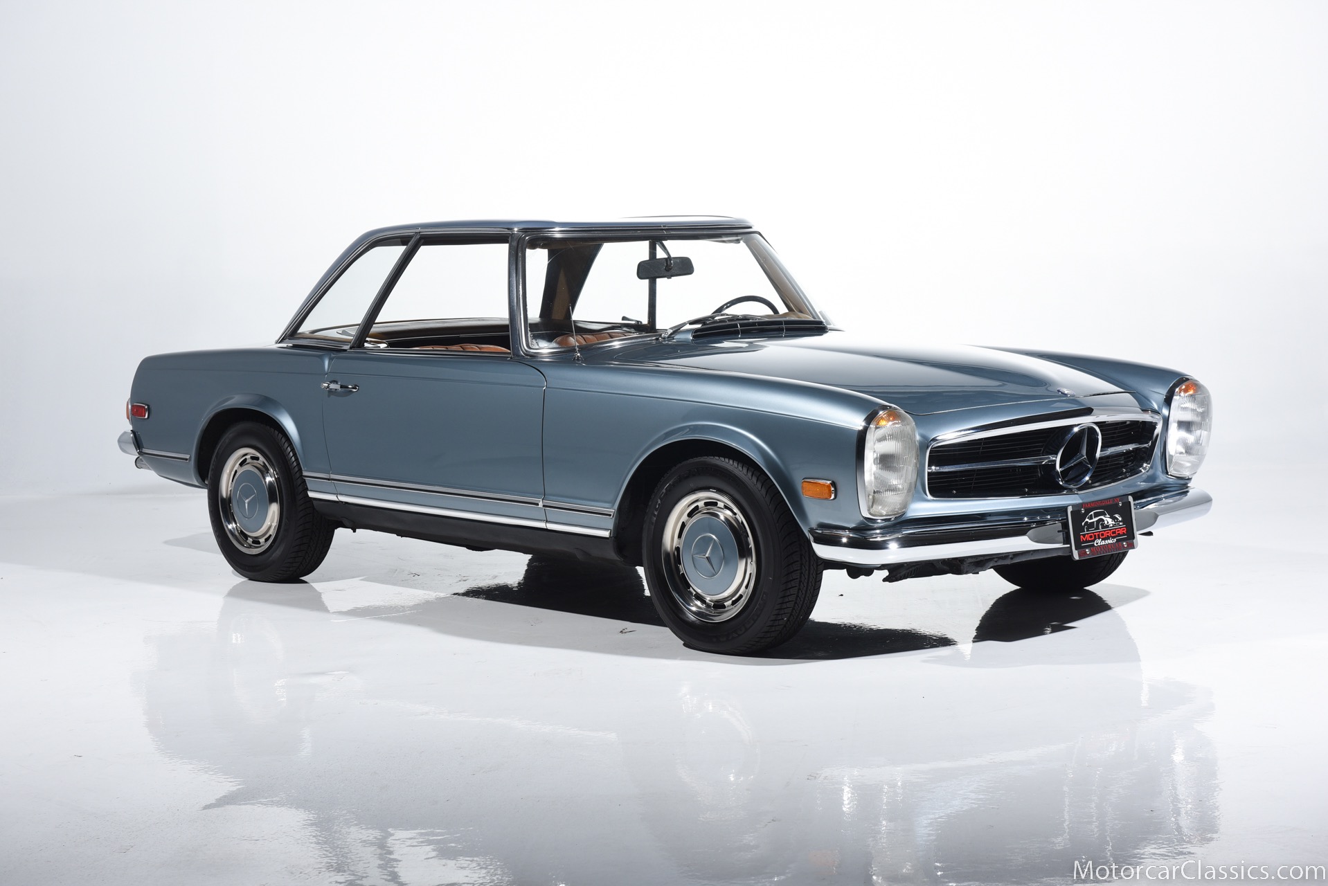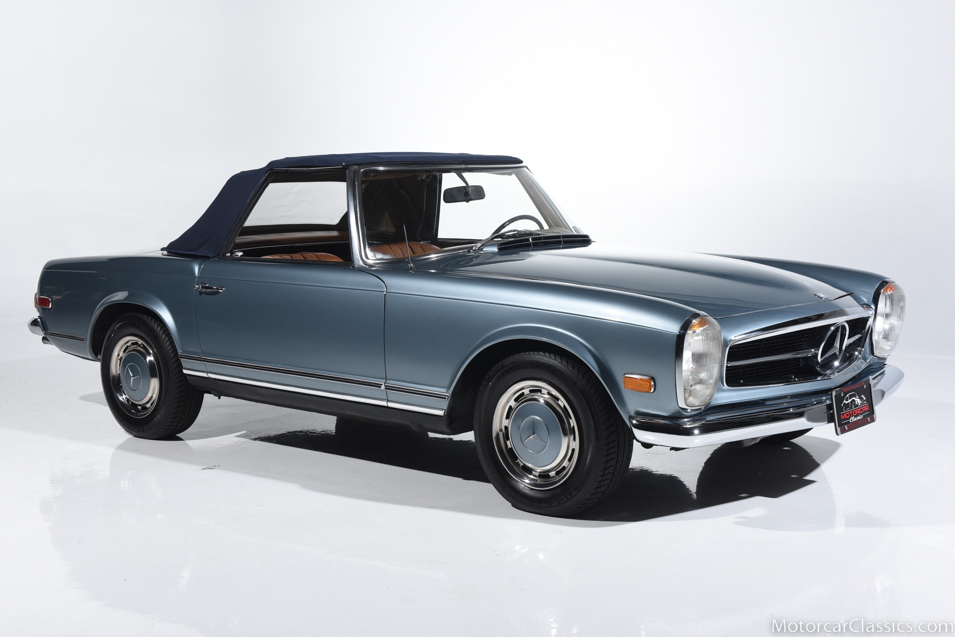 1969 MERCEDES-BENZ 280SL for sale. Motorcar Classics is proud to present this 1969 Mercedes 280SL featured in Metallic Grey Blue (#906) with Tan MB Tex and Navy Blue convertible top. This car includes a matching Grey Blue hardtop. The car has one high-quality respray. The interior is original. The original engine is rebuilt with all OEM Mercedes parts. The factory Becker Europa radio is still in place. Our 280SL is in great cosmetic and mechanical condition and a delight to drive with Mercedes 4-speed automatic gearbox. True mileage is believed to be 109,587. This fine 280SL was purchased new in 1969 in Paris, France. The second owner purchased it in the early 1980s and imported it to the US, where it resided in his hands until entering our inventory. The car retains its valuable and desirable European headlamps. This is a car you can drive or show with pride.