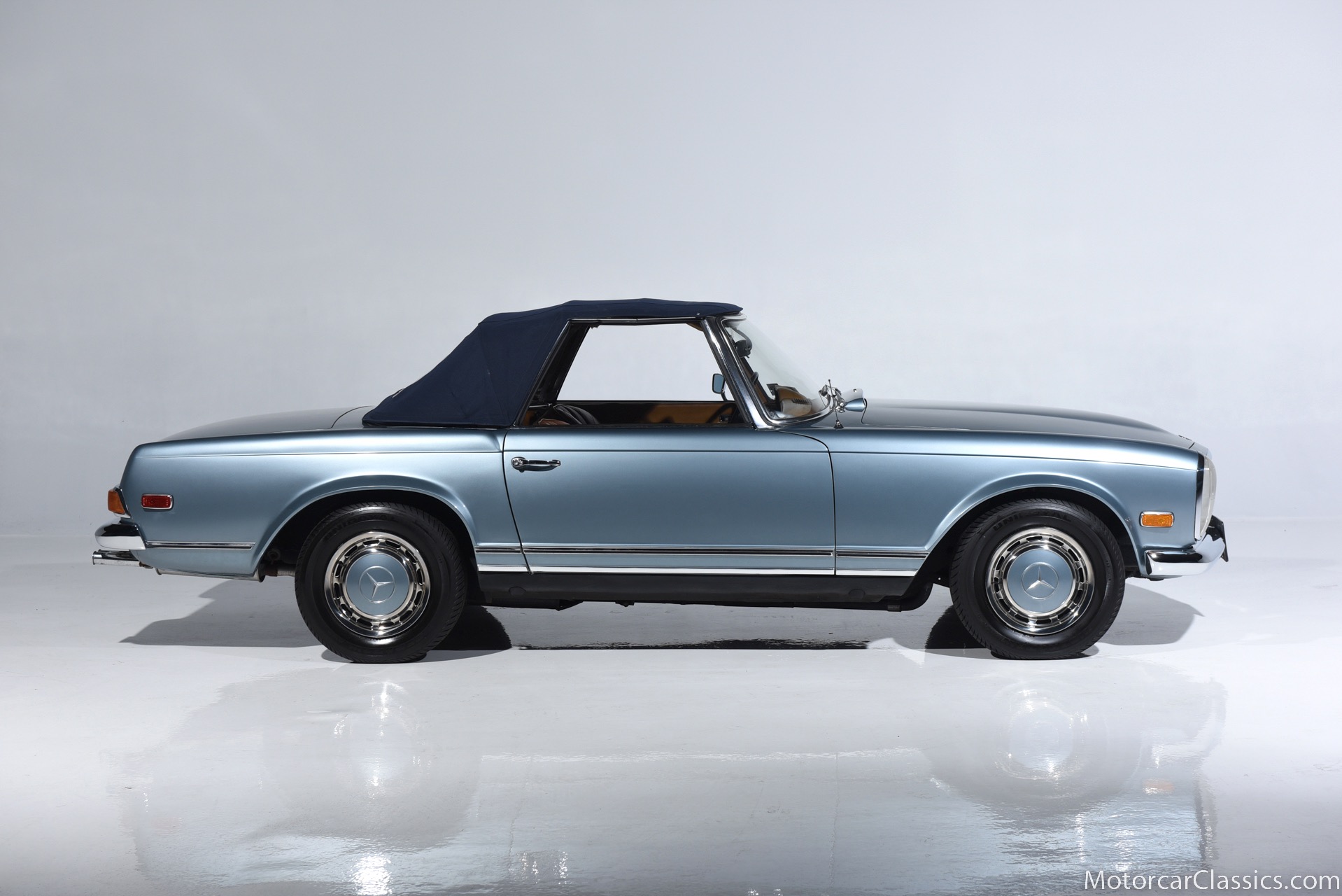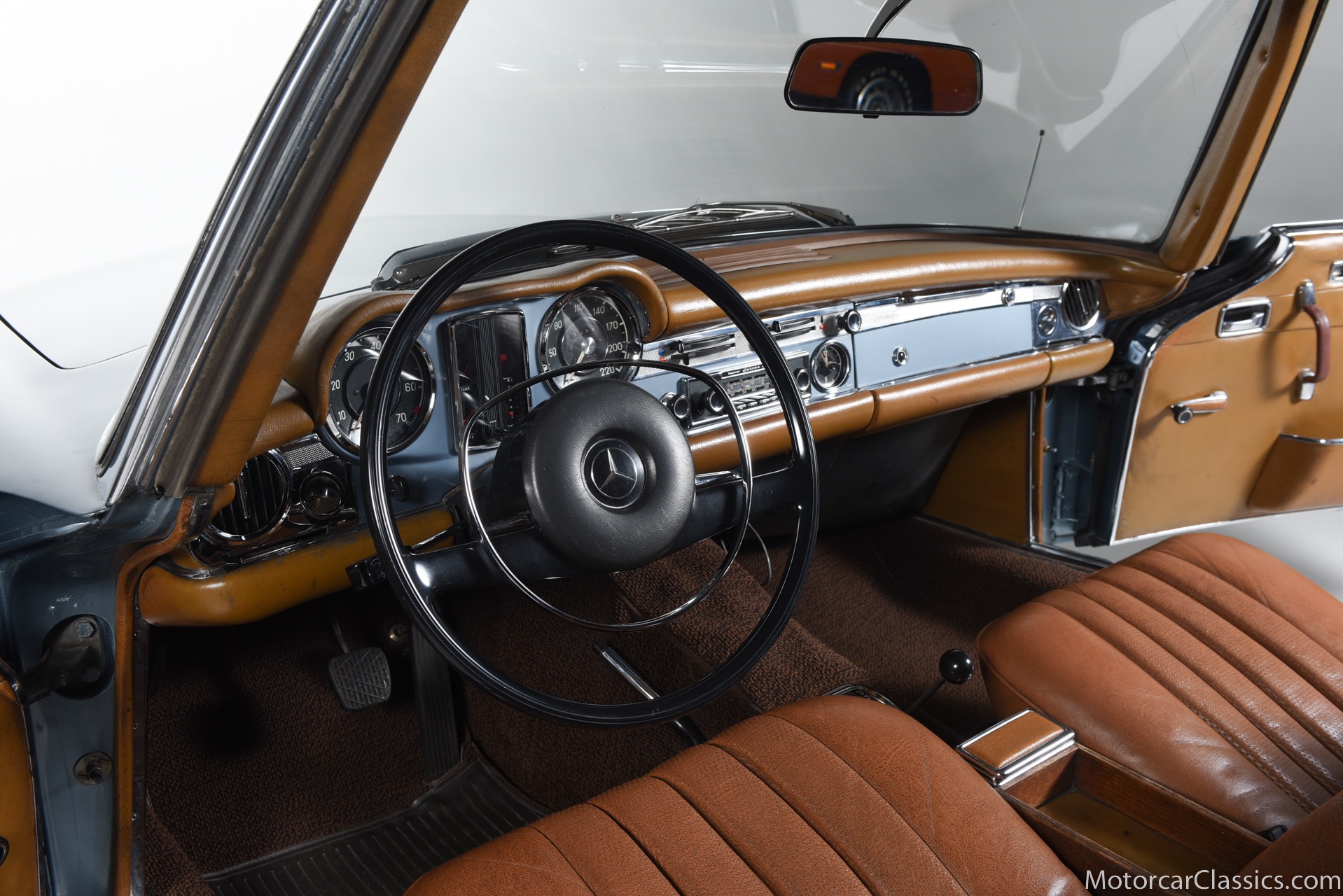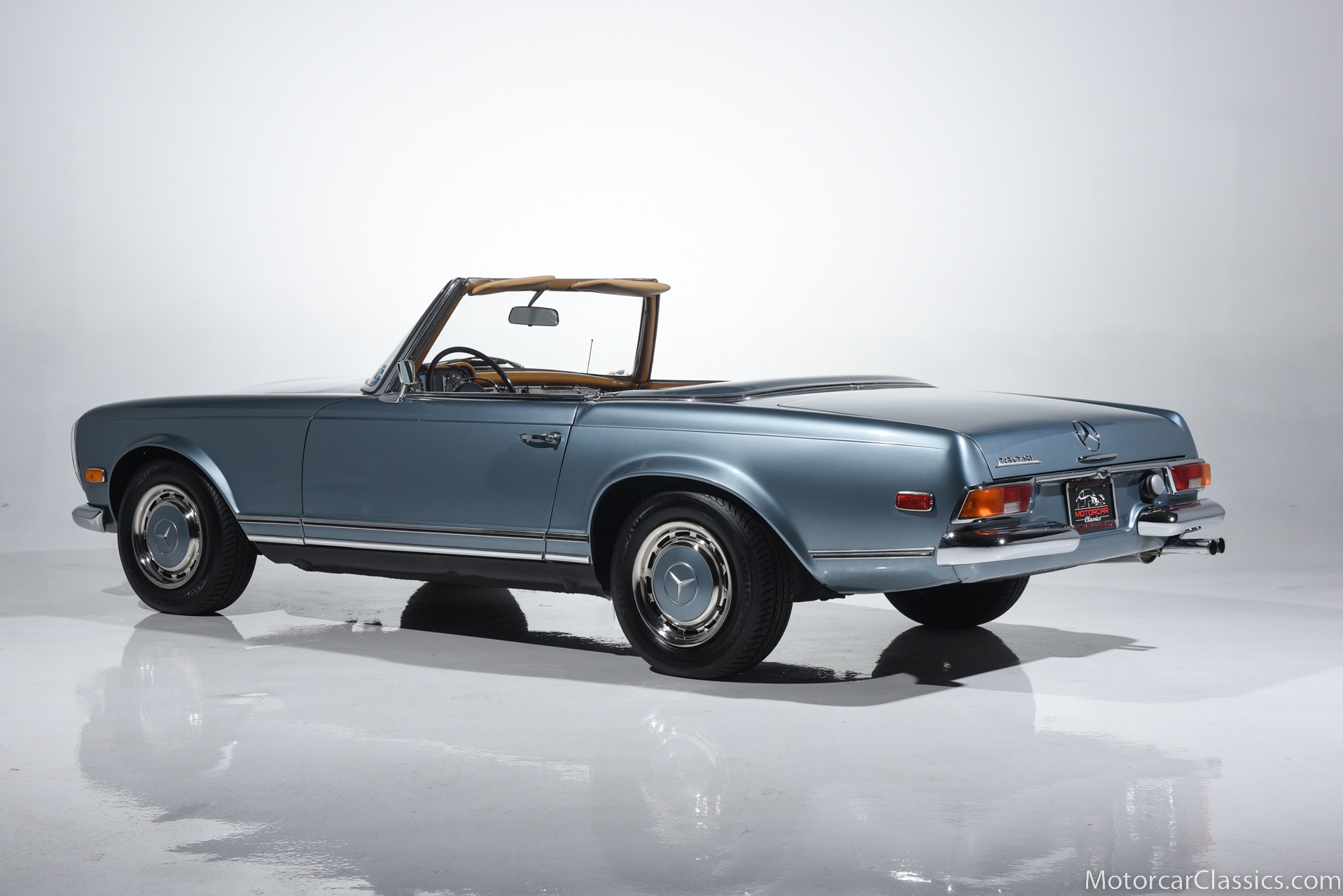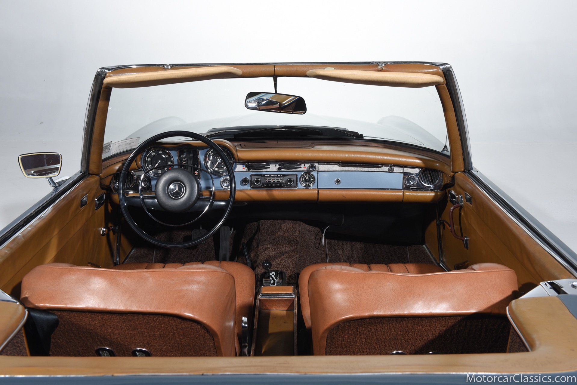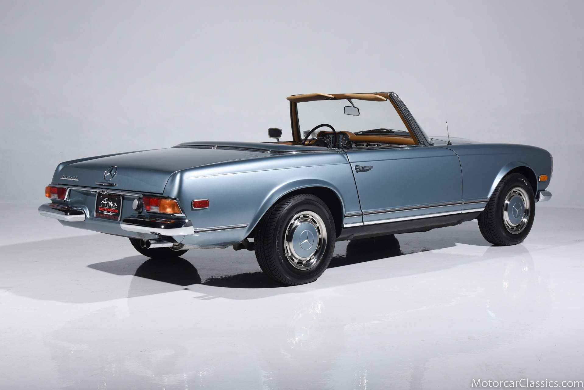1969 MERCEDES-BENZ 280SL for sale. Motorcar Classics is proud to present this 1969 Mercedes 280SL featured in Metallic Grey Blue (#906) with Tan MB Tex and Navy Blue convertible top. This car includes a matching Grey Blue hardtop. The car has one high-quality respray. The interior is original. The original engine is rebuilt with all OEM Mercedes parts. The factory Becker Europa radio is still in place. Our 280SL is in great cosmetic and mechanical condition and a delight to drive with Mercedes 4-speed automatic gearbox. True mileage is believed to be 109,587. This fine 280SL was purchased new in 1969 in Paris, France. The second owner purchased it in the early 1980s and imported it to the US, where it resided in his hands until entering our inventory. The car retains its valuable and desirable European headlamps. This is a car you can drive or show with pride.