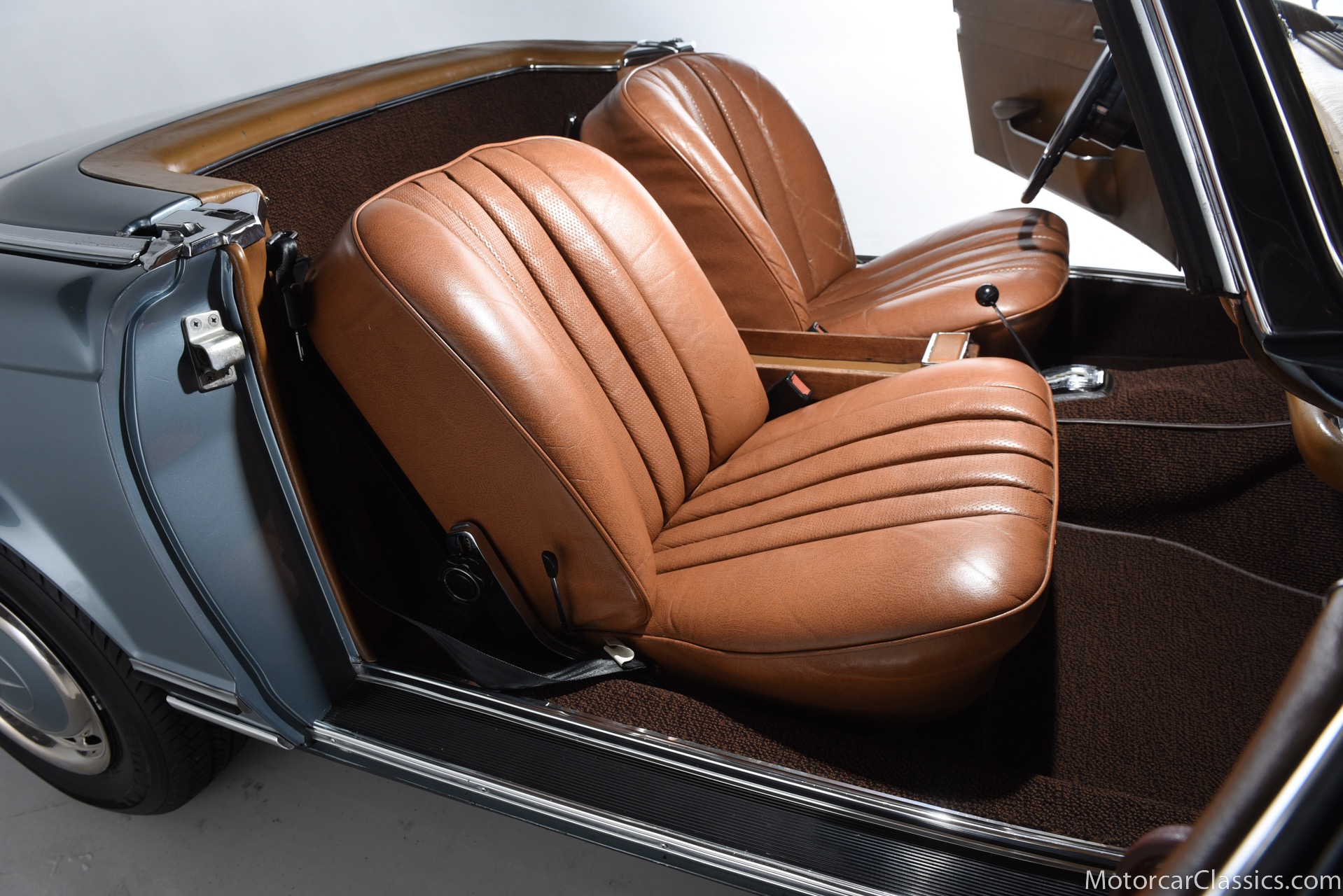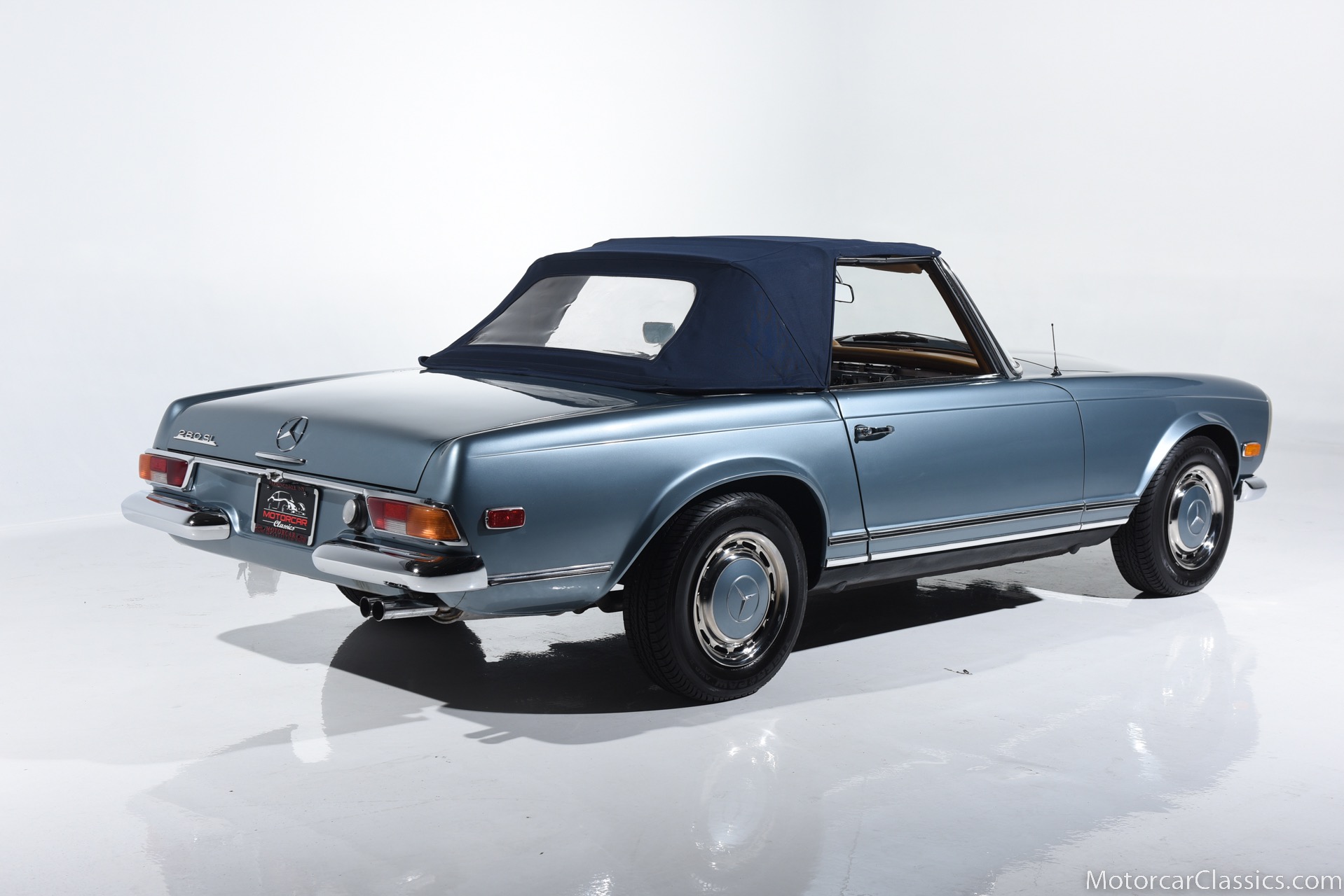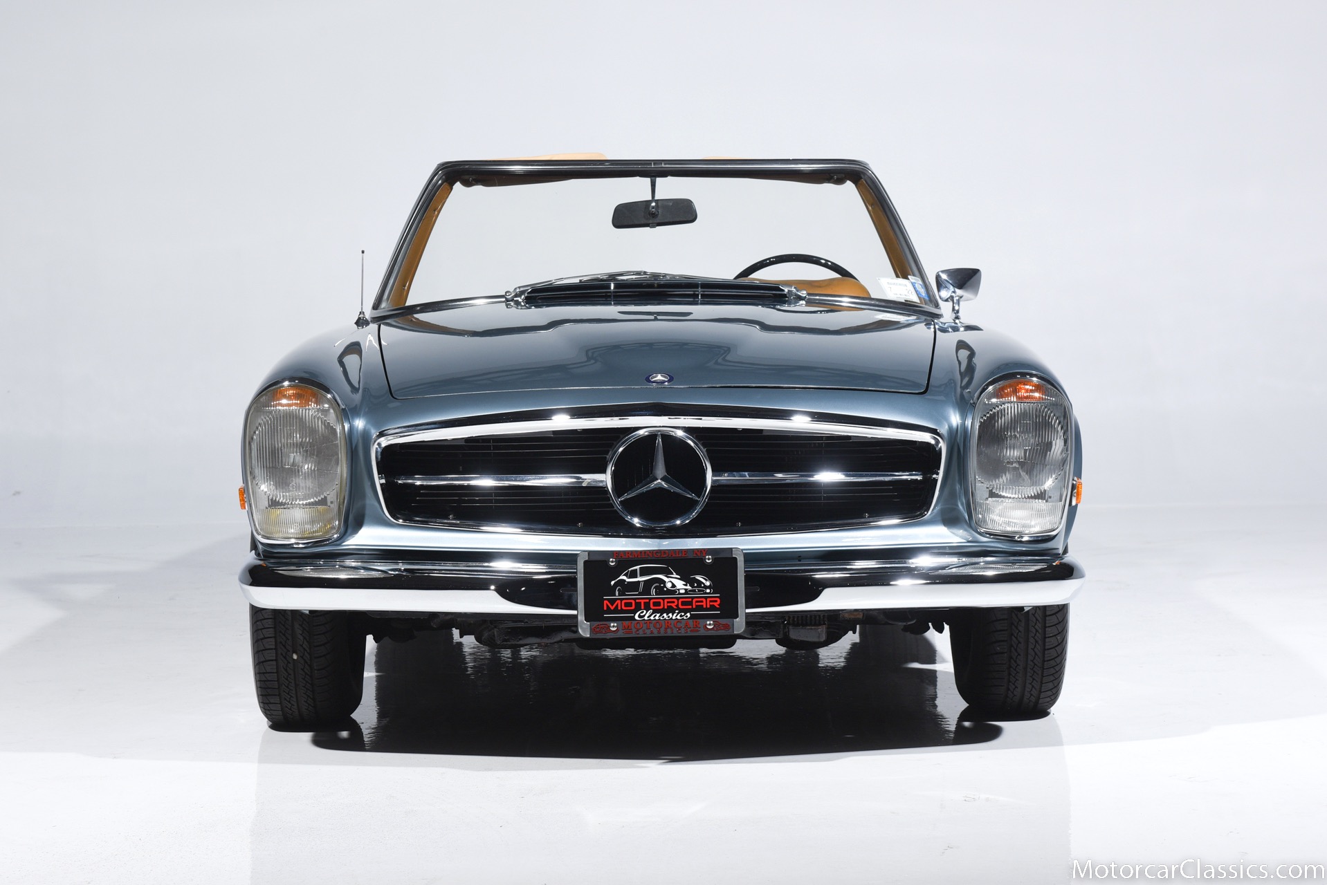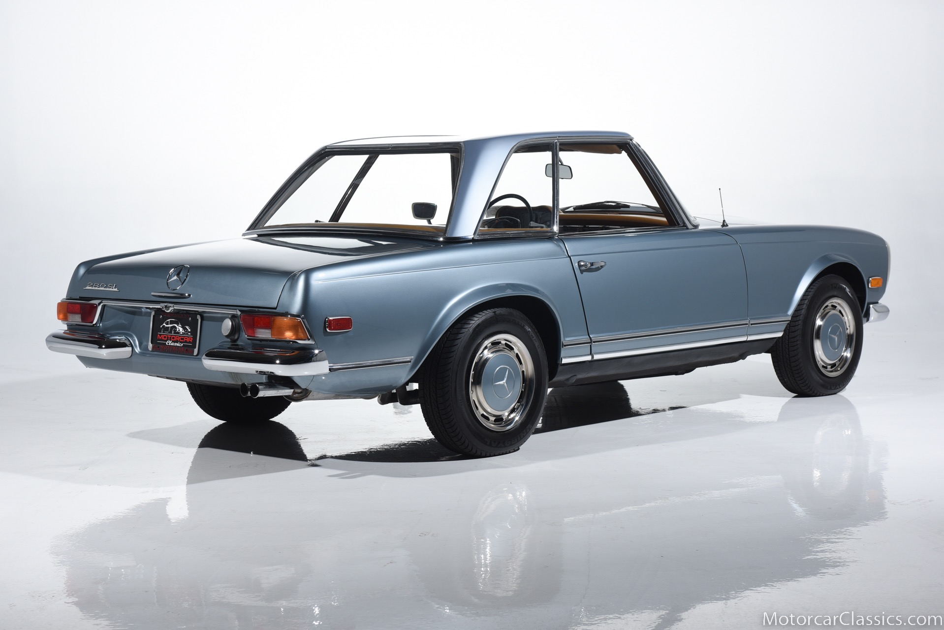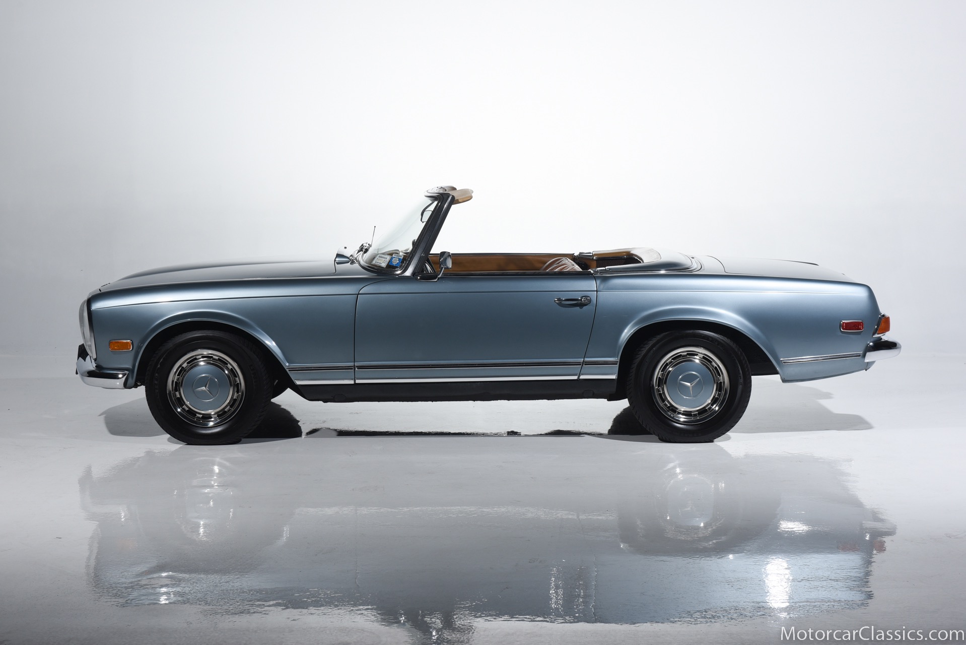 1969 MERCEDES-BENZ 280SL for sale. Motorcar Classics is proud to present this 1969 Mercedes 280SL featured in Metallic Grey Blue (#906) with Tan MB Tex and Navy Blue convertible top. This car includes a matching Grey Blue hardtop. The car has one high-quality respray. The interior is original. The original engine is rebuilt with all OEM Mercedes parts. The factory Becker Europa radio is still in place. Our 280SL is in great cosmetic and mechanical condition and a delight to drive with Mercedes 4-speed automatic gearbox. True mileage is believed to be 109,587. This fine 280SL was purchased new in 1969 in Paris, France. The second owner purchased it in the early 1980s and imported it to the US, where it resided in his hands until entering our inventory. The car retains its valuable and desirable European headlamps. This is a car you can drive or show with pride.