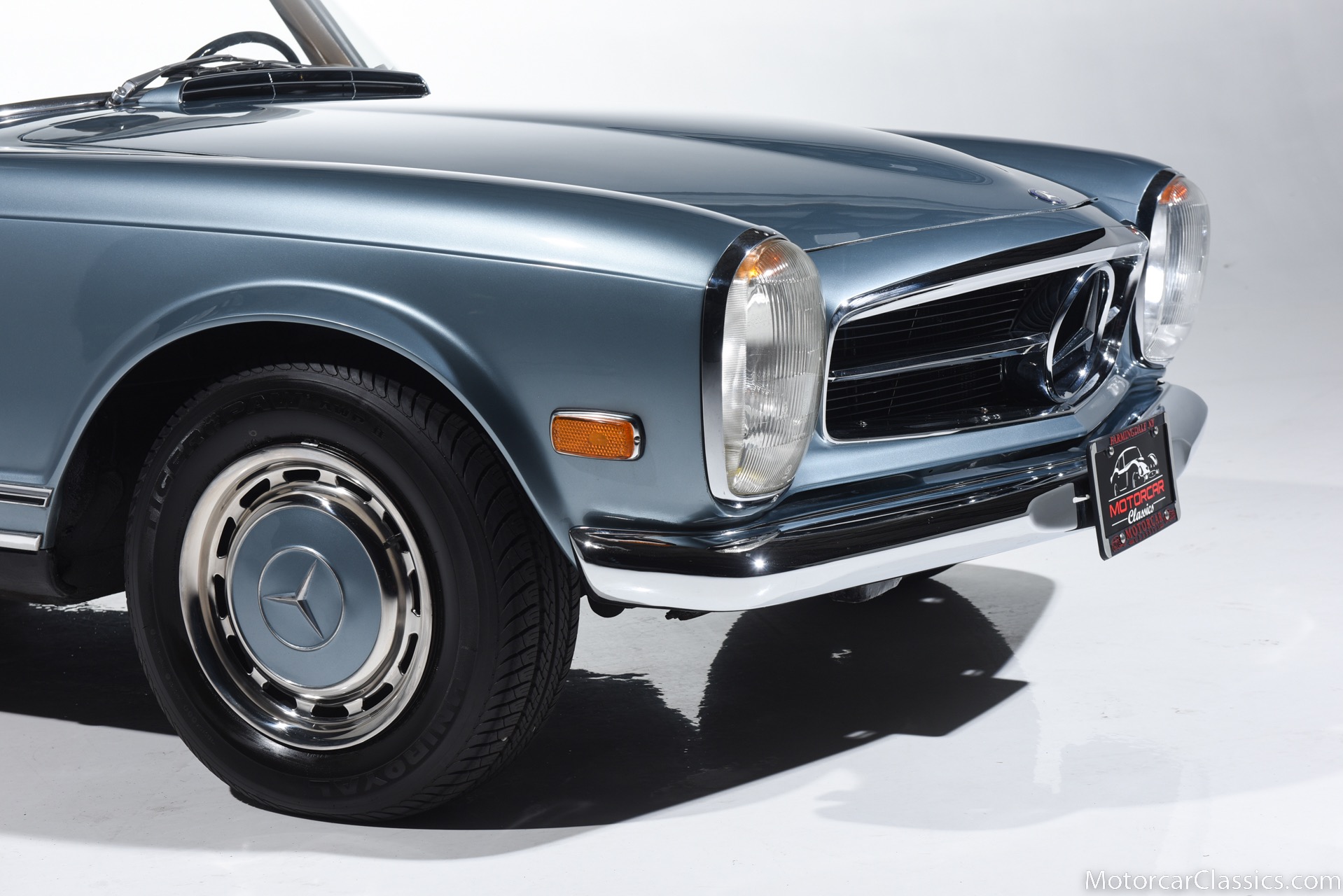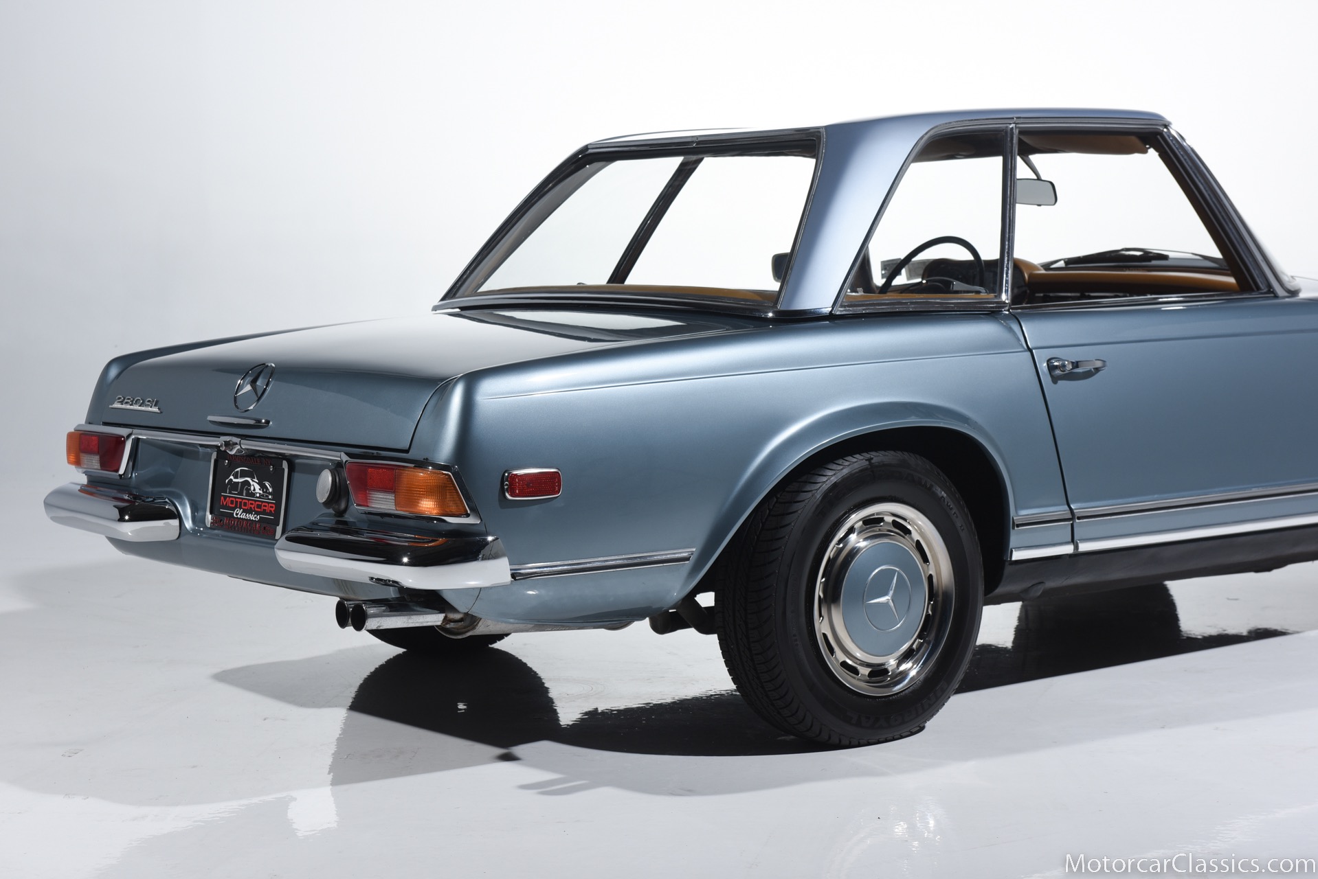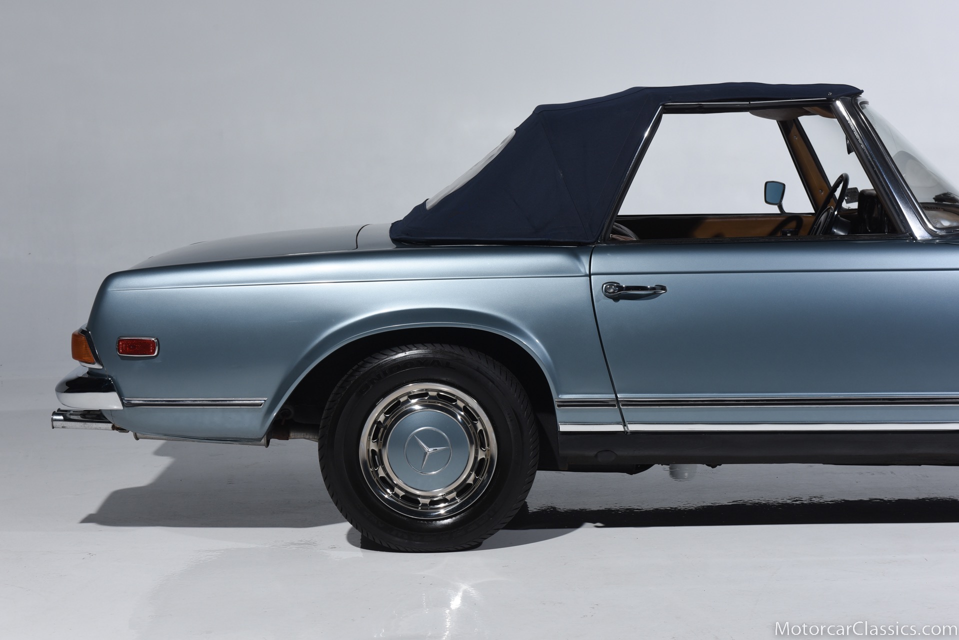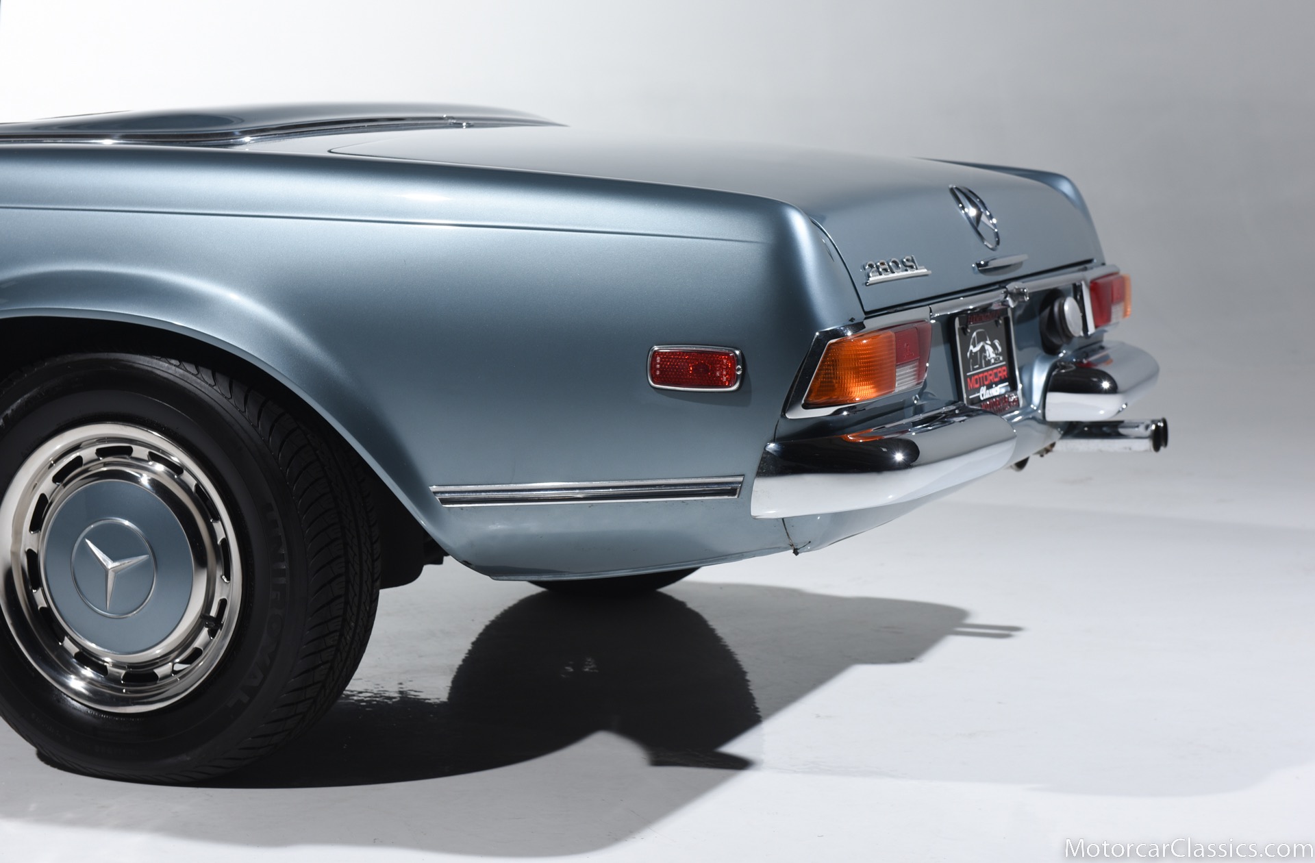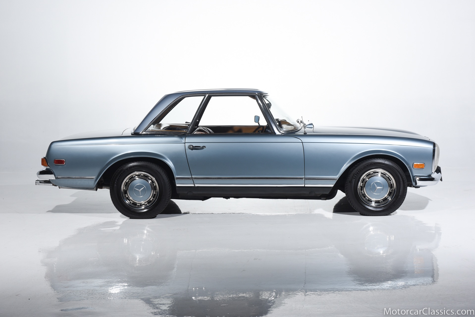 1969 MERCEDES-BENZ 280SL for sale. Motorcar Classics is proud to present this 1969 Mercedes 280SL featured in Metallic Grey Blue (#906) with Tan MB Tex and Navy Blue convertible top. This car includes a matching Grey Blue hardtop. The car has one high-quality respray. The interior is original. The original engine is rebuilt with all OEM Mercedes parts. The factory Becker Europa radio is still in place. Our 280SL is in great cosmetic and mechanical condition and a delight to drive with Mercedes 4-speed automatic gearbox. True mileage is believed to be 109,587. This fine 280SL was purchased new in 1969 in Paris, France. The second owner purchased it in the early 1980s and imported it to the US, where it resided in his hands until entering our inventory. The car retains its valuable and desirable European headlamps. This is a car you can drive or show with pride.